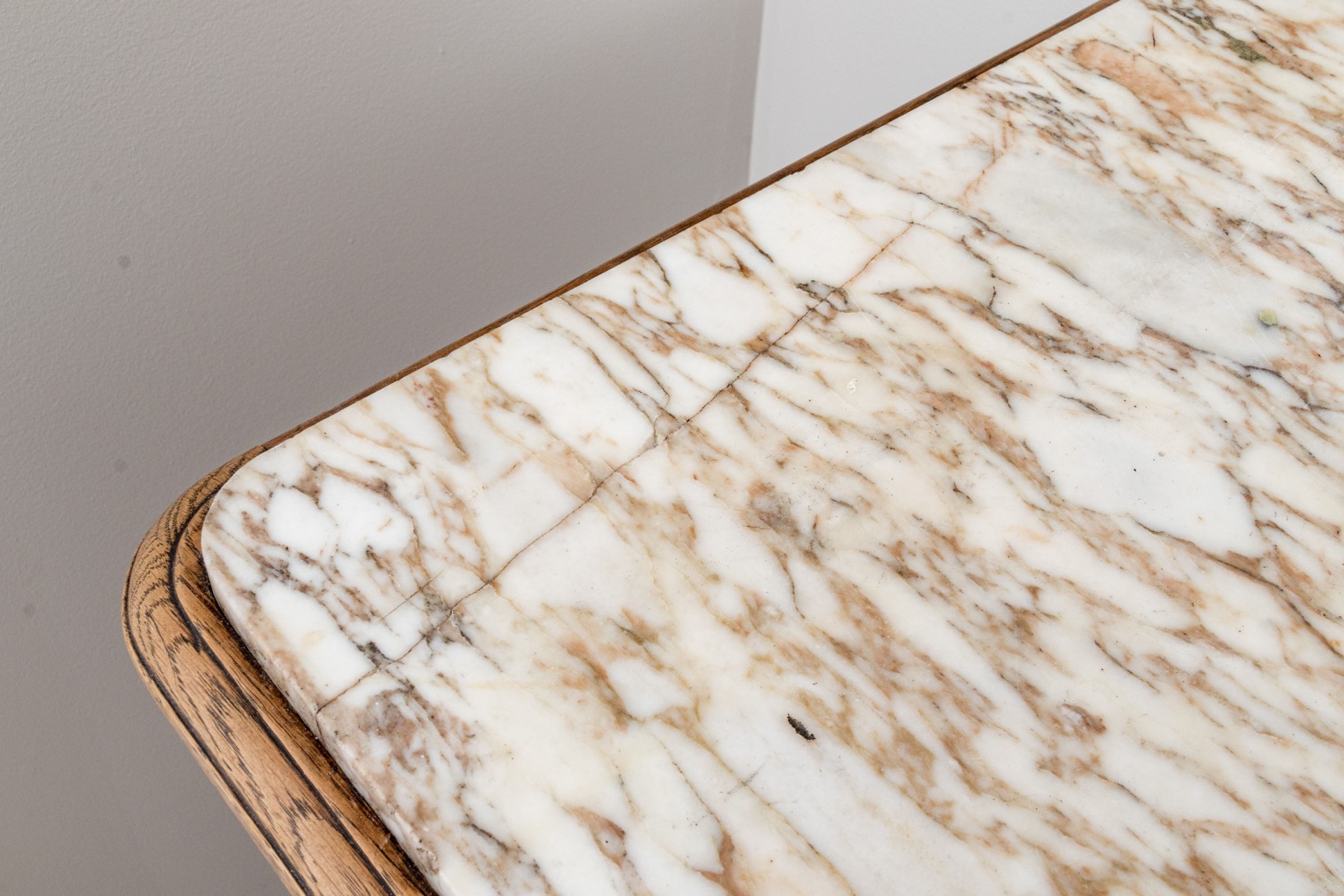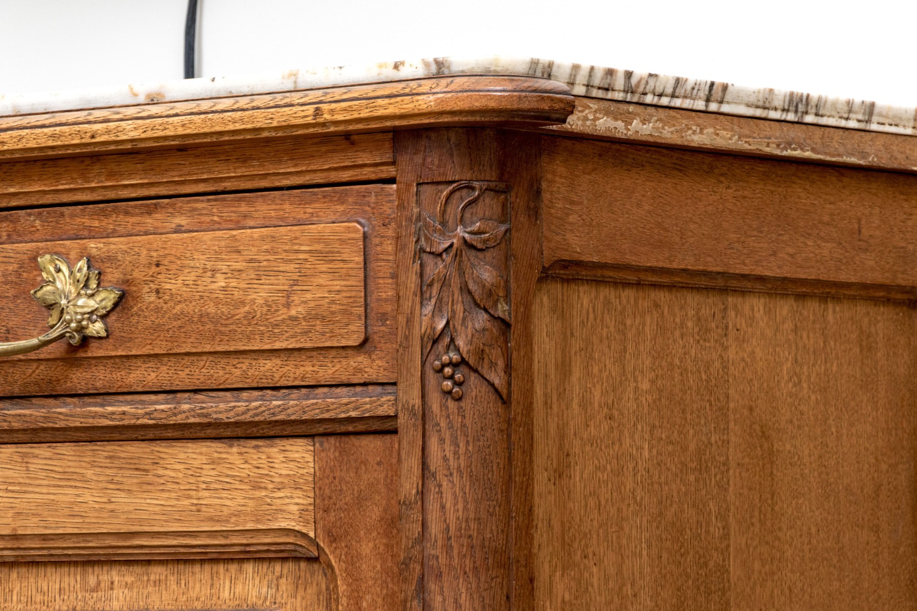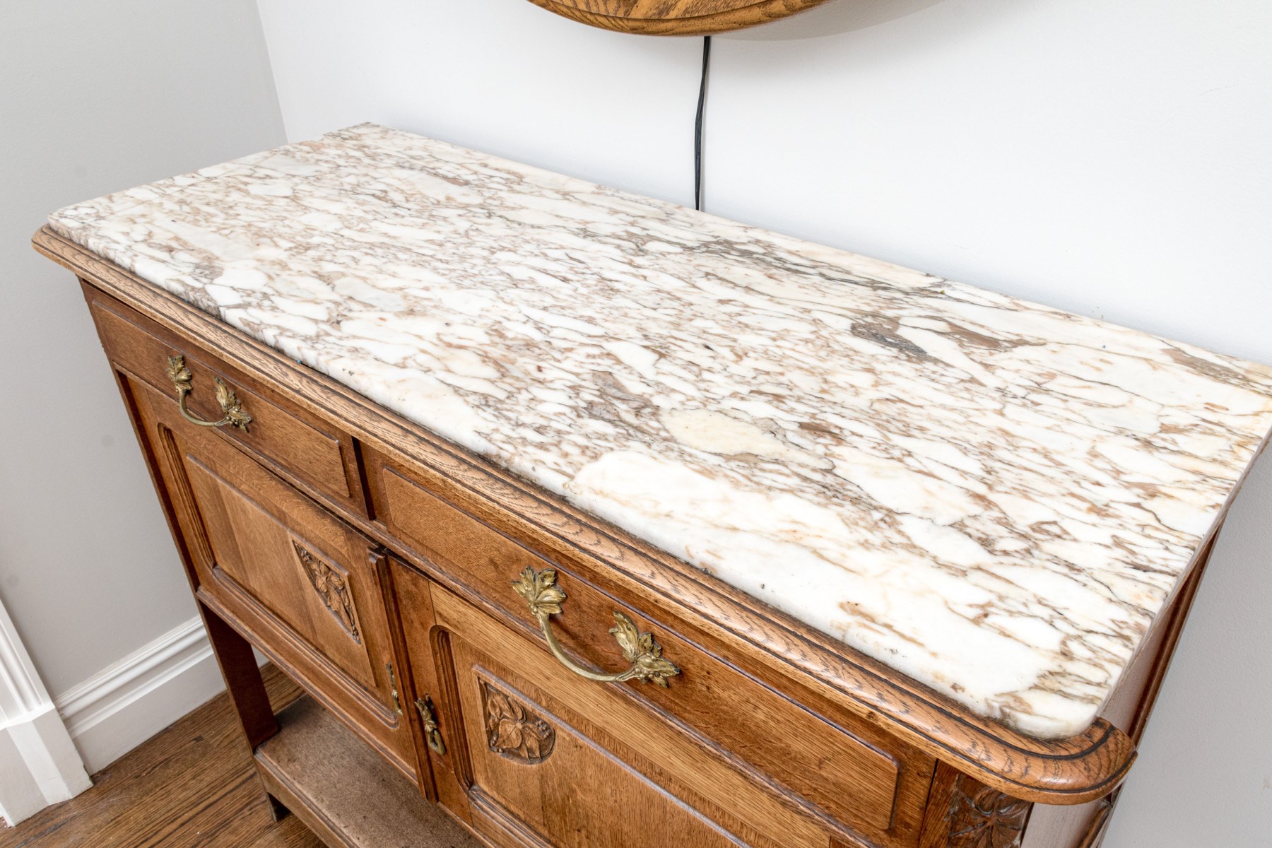 A 19th century French sideboard displaying a white and brown marble top with rounded corners overhanging two dovetail drawers with brass pulls and two cabinet doors over an open lower shelf.