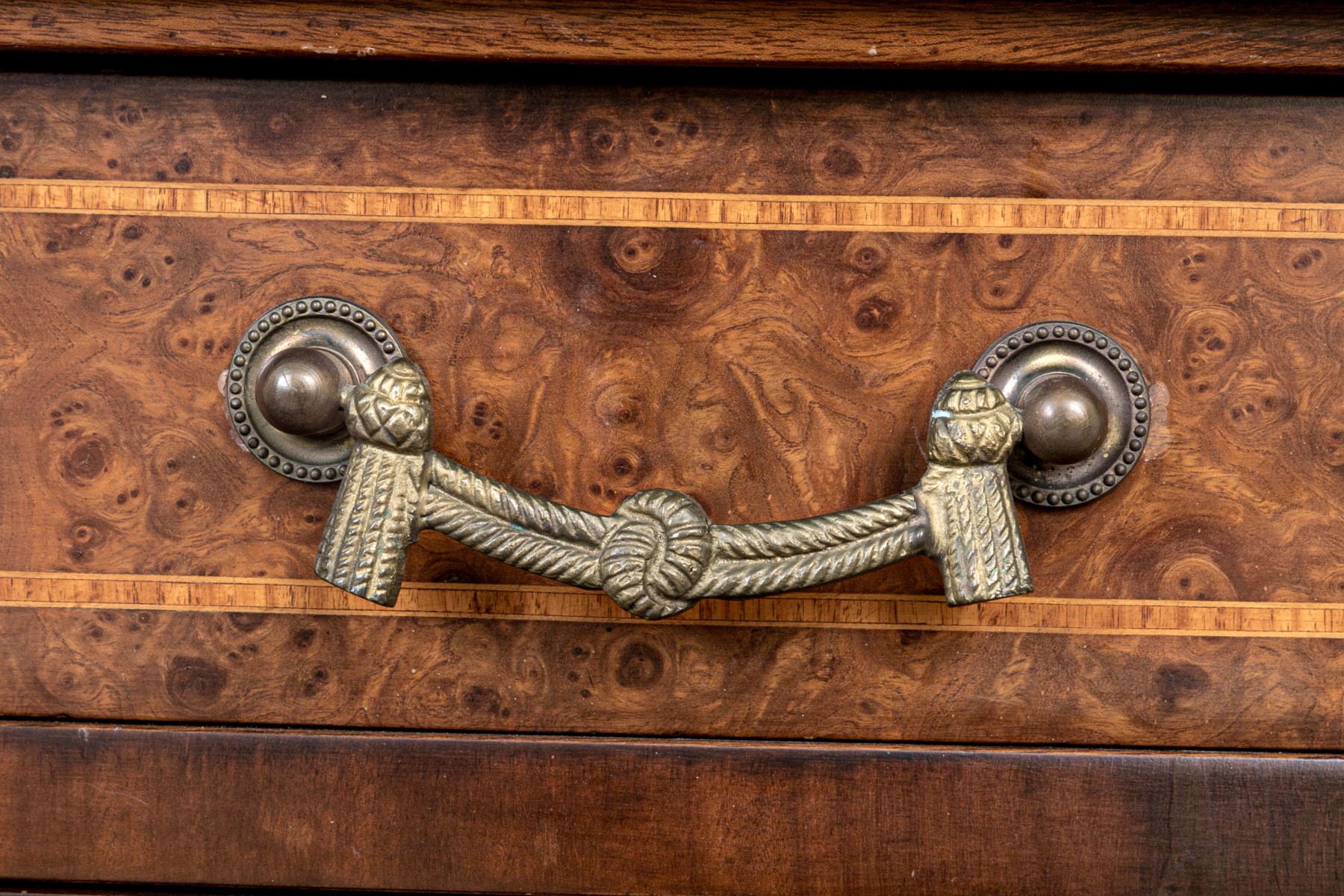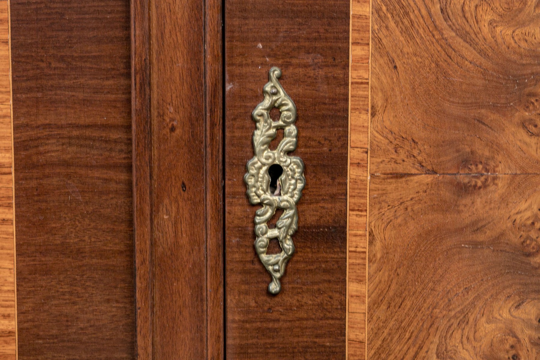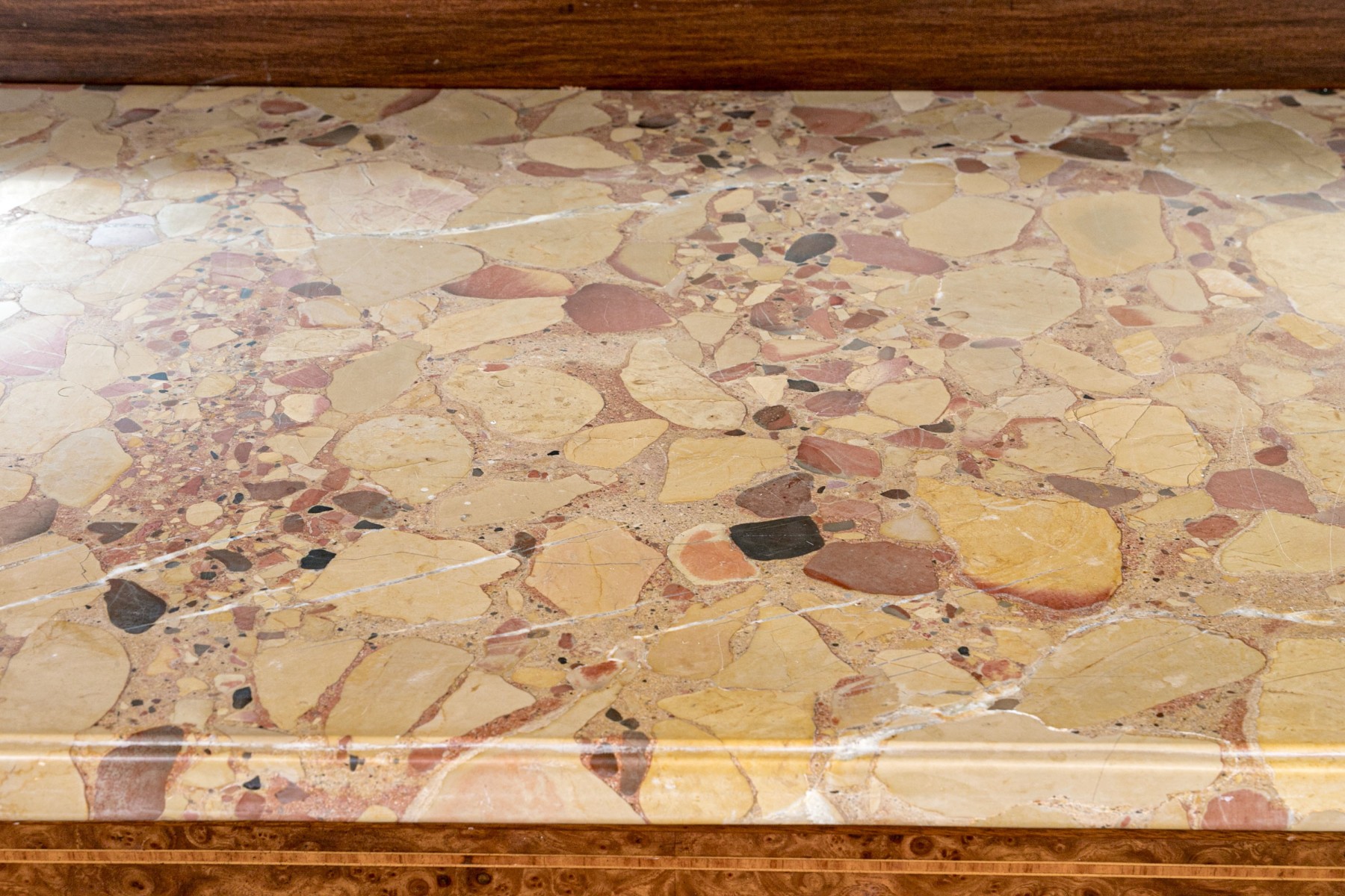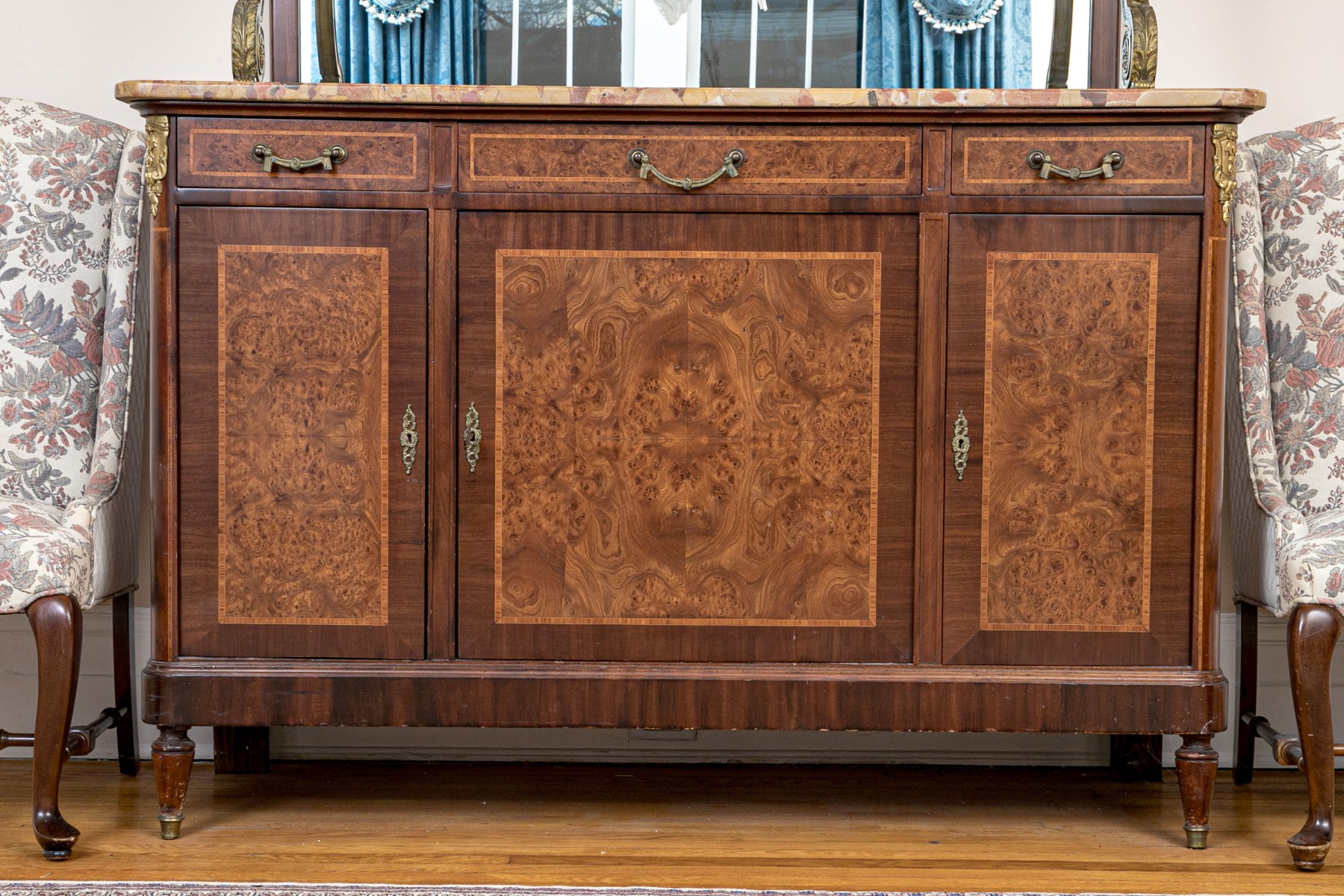 French walnut with burl-wood panels, rosewood banded inlay covered with wall cast bronze hardware and a beautiful specimen polished marble-top. Upper portion comes apart for ease of transportation. Purchased in 1998 for $6,000