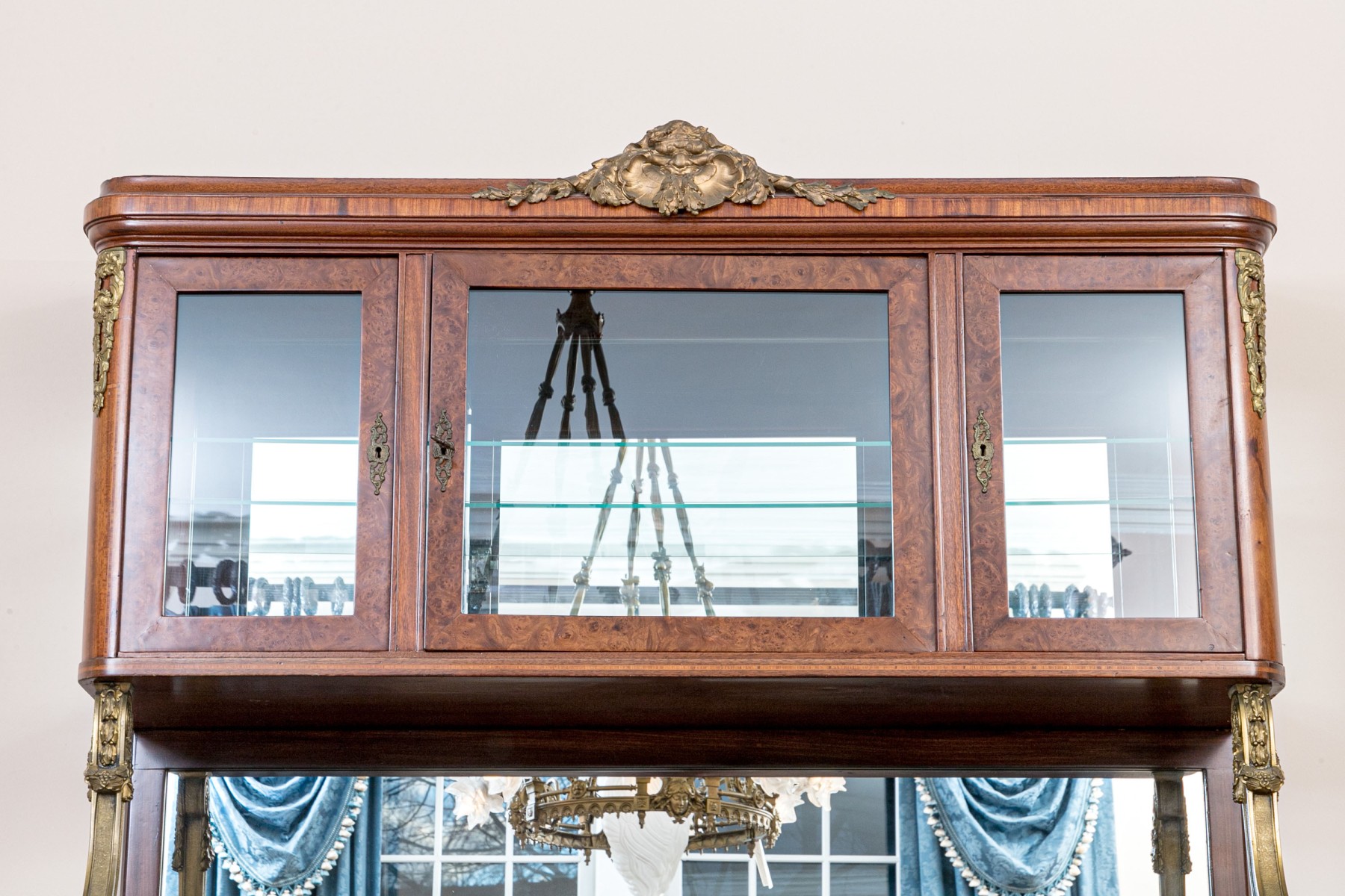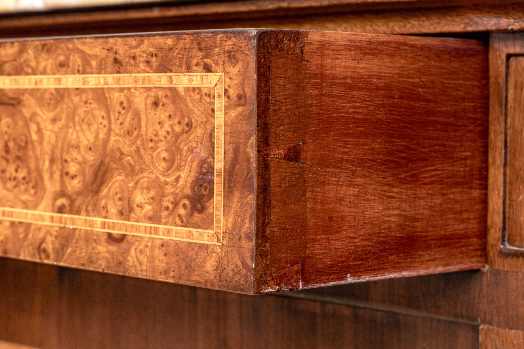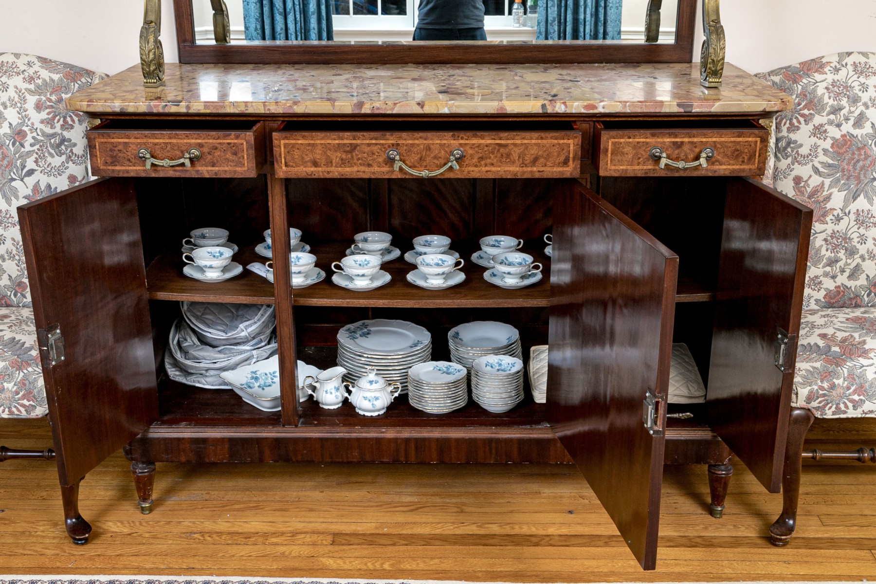 French walnut with burl-wood panels, rosewood banded inlay covered with wall cast bronze hardware and a beautiful specimen polished marble-top. Upper portion comes apart for ease of transportation. Purchased in 1998 for $6,000