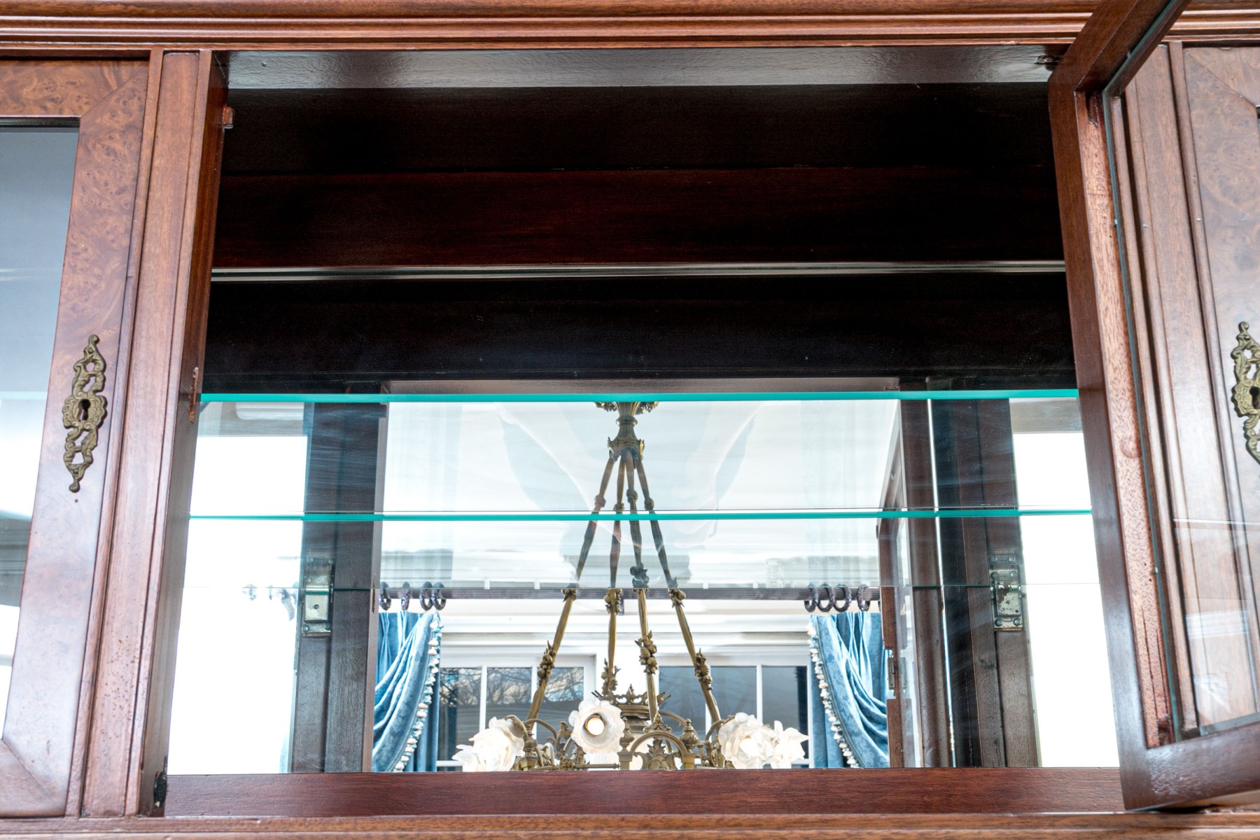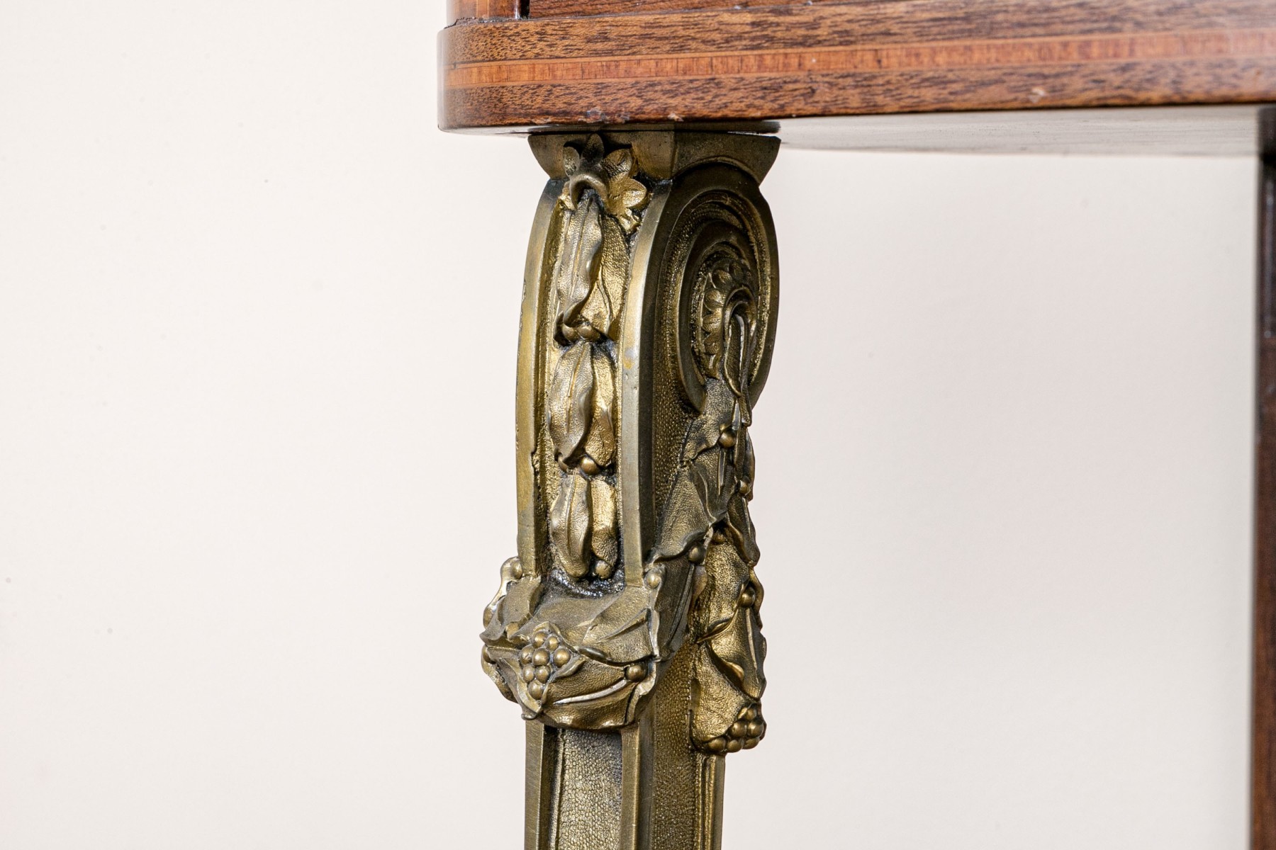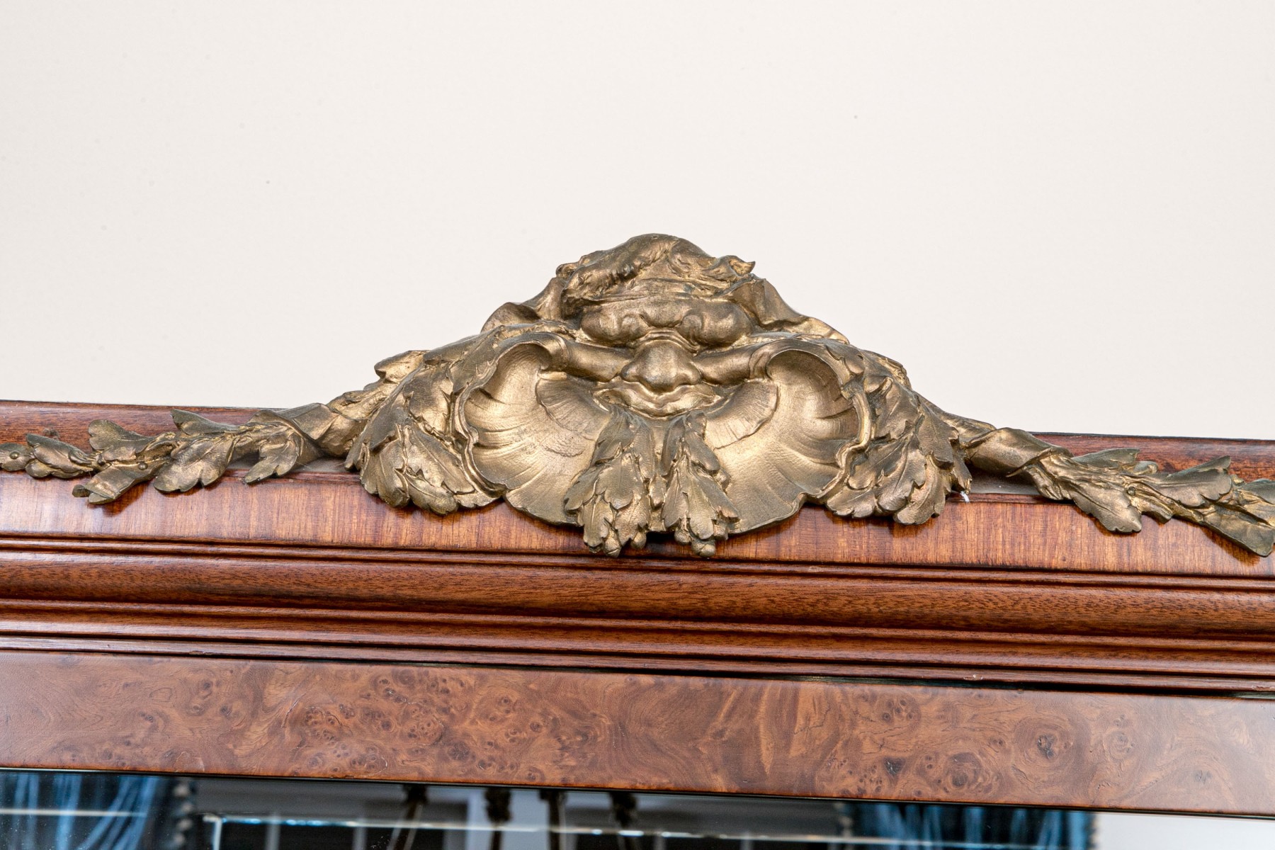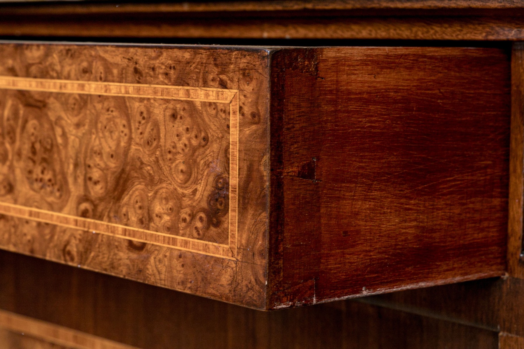 French walnut with burl-wood panels, rosewood banded inlay covered with wall cast bronze hardware and a beautiful specimen polished marble-top. Upper portion comes apart for ease of transportation. Purchased in 1998 for $6,000