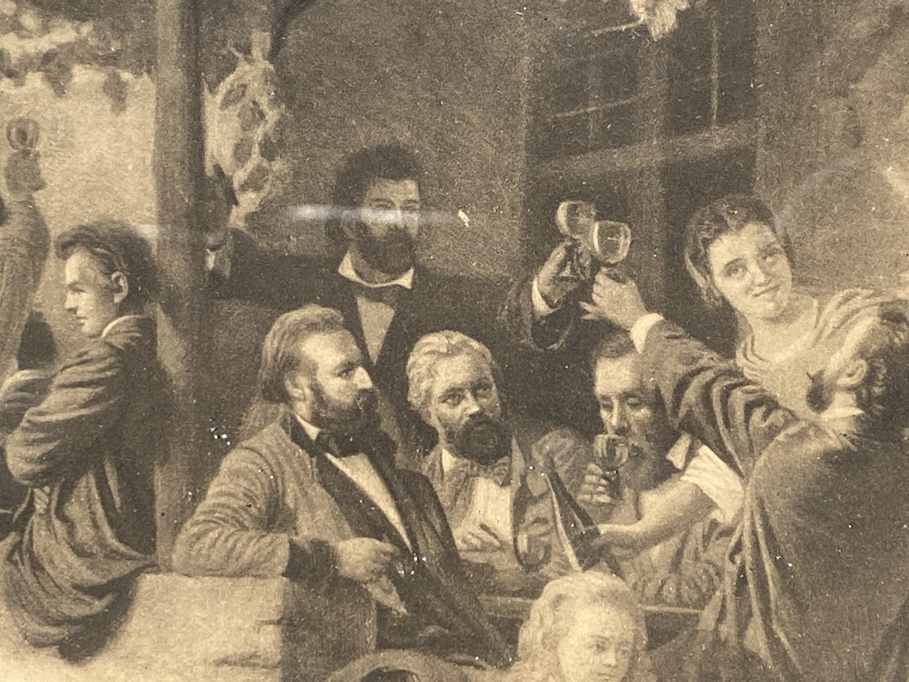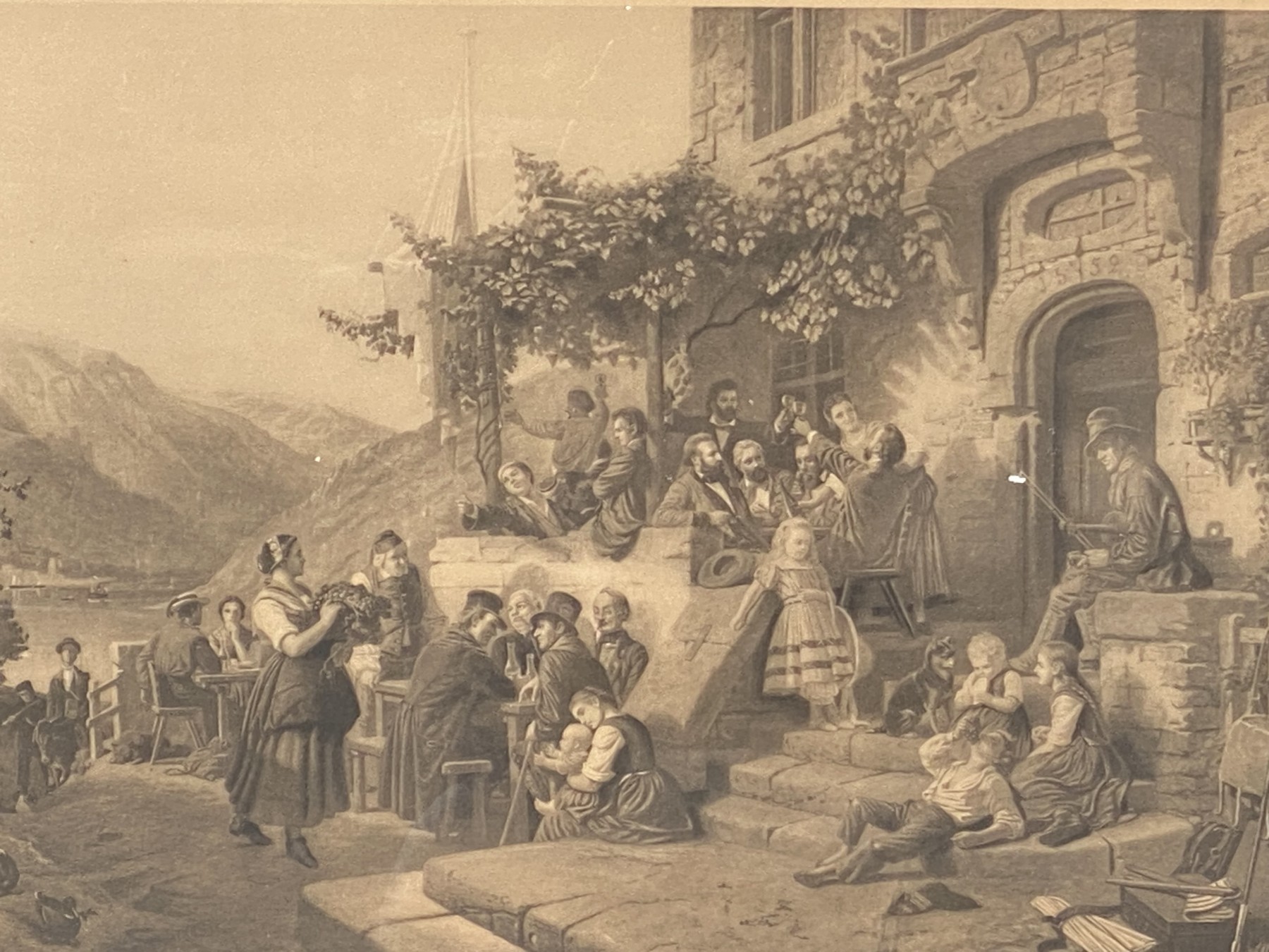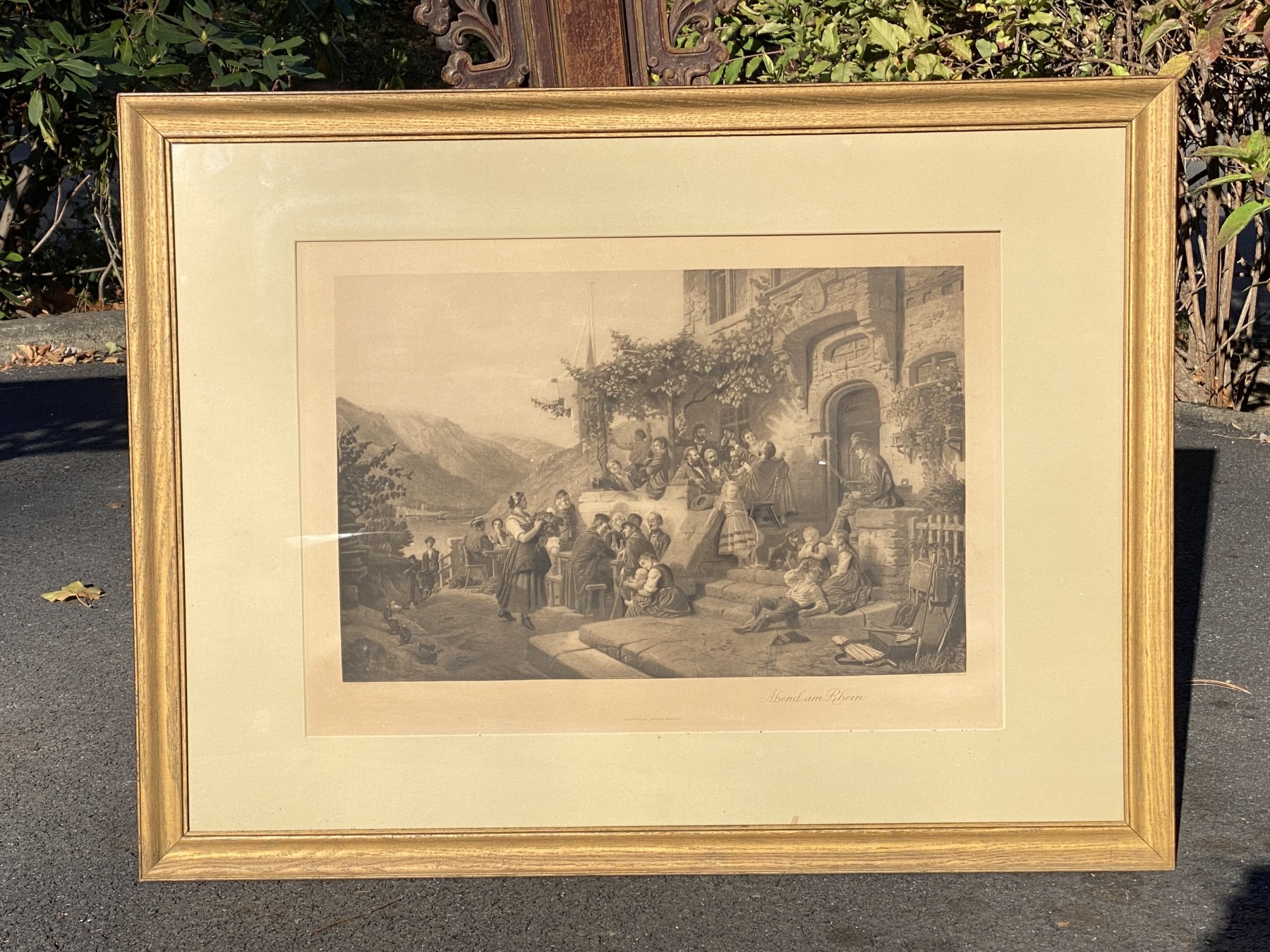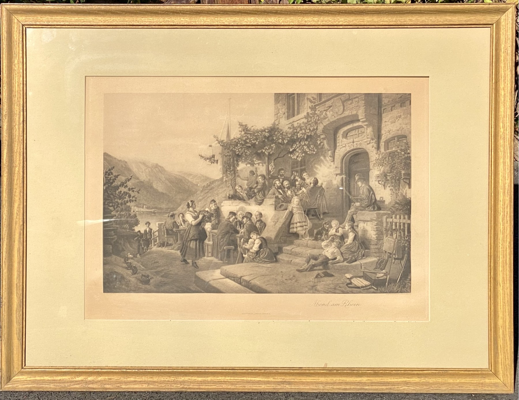 Engraved by Wilhelm Lindner (1885-1965) after a painting. A charming scene of a group of families at a house enjoying an evening on the Rhine River. Presented in a gilt frame with glass.