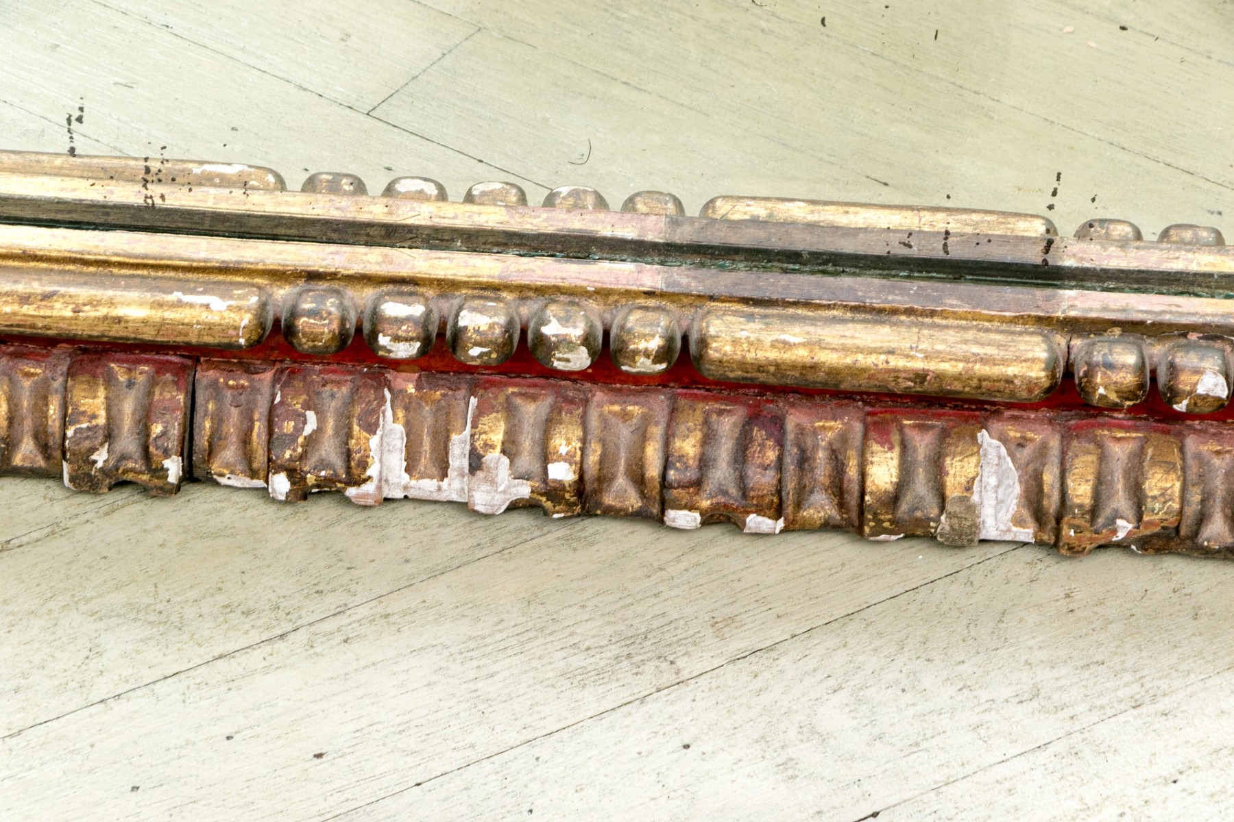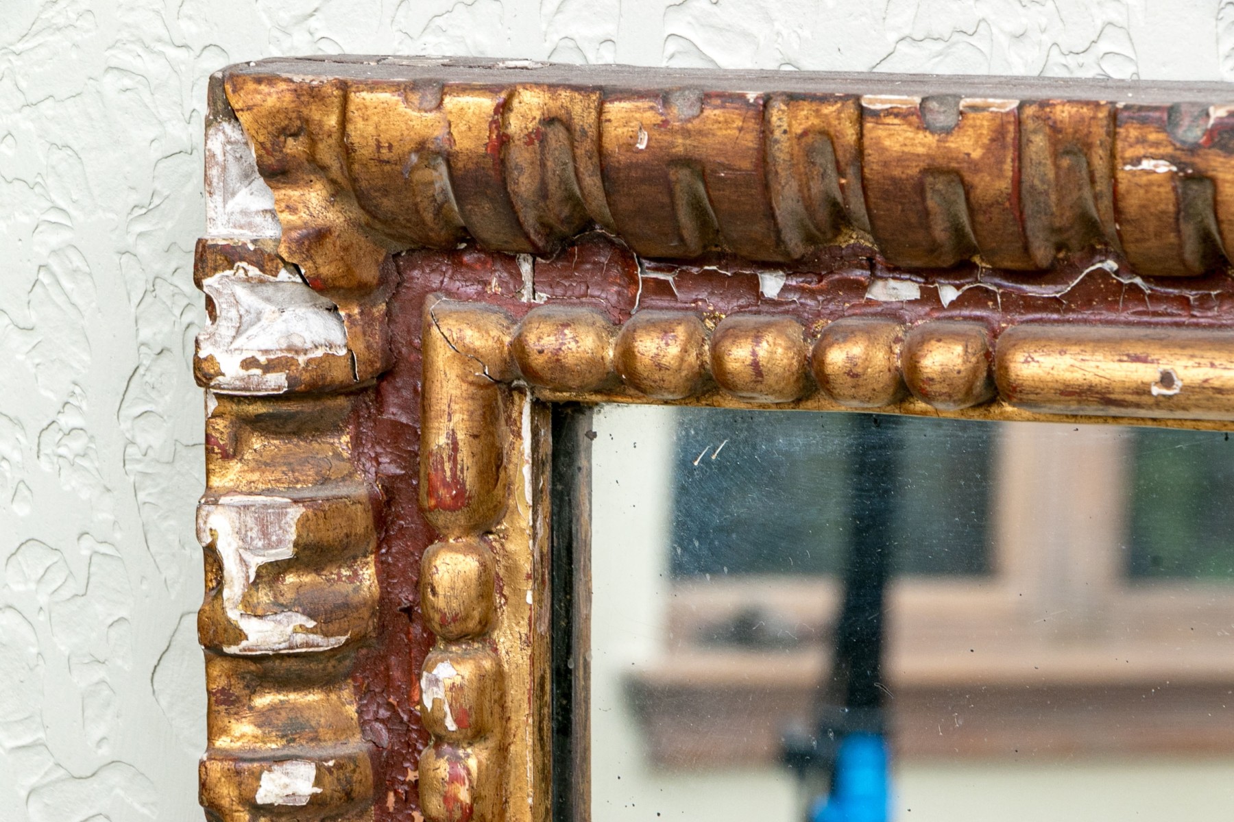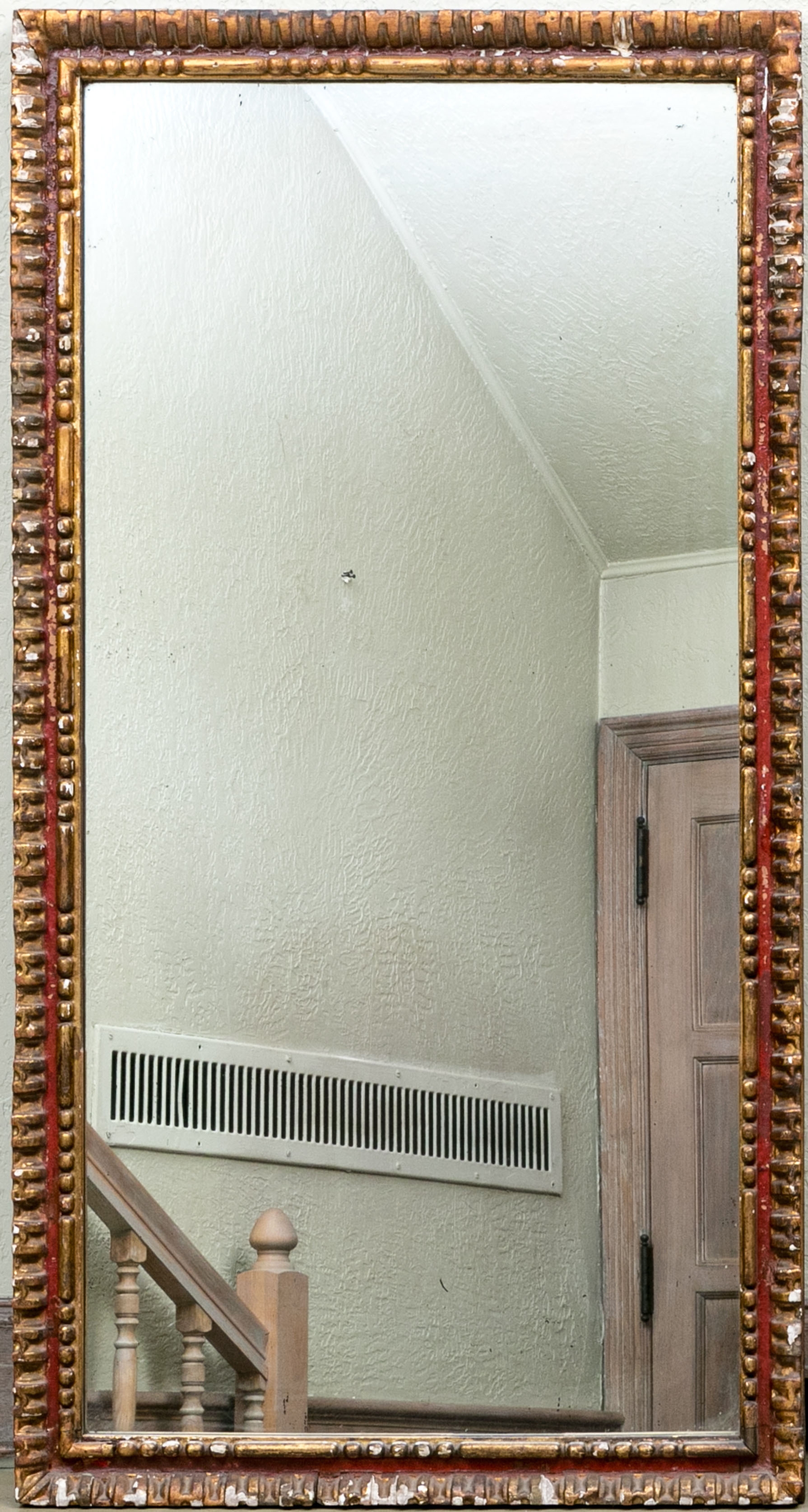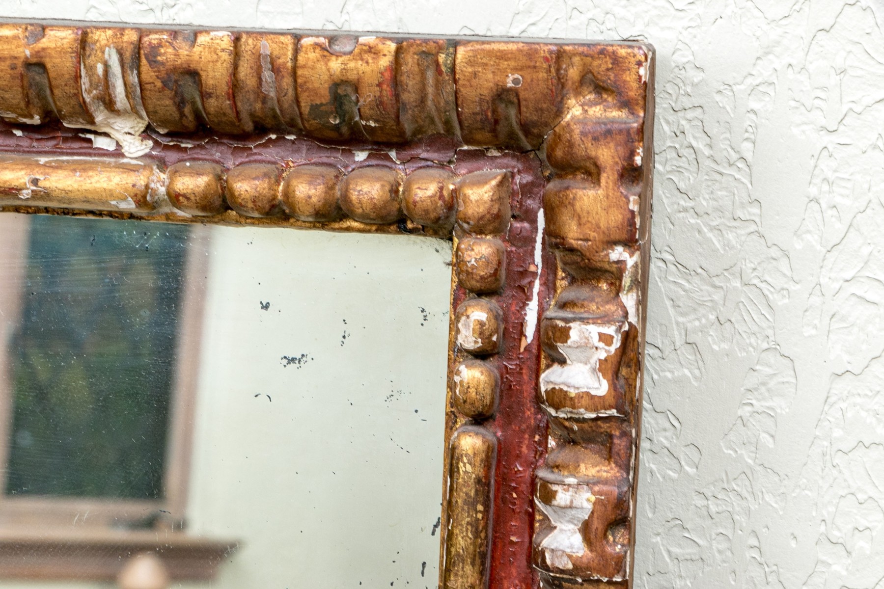 A wonderful rectangular mirror in an antique gilt gesso and wood frame showcasing stippled and fluted relief with a red inner border.