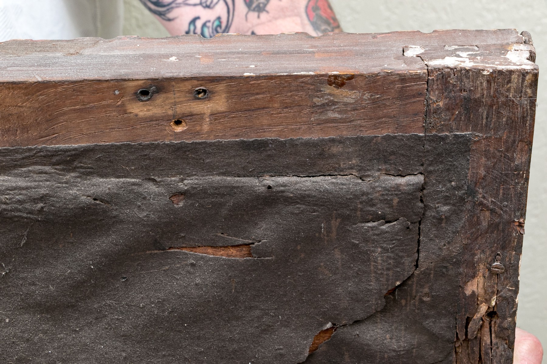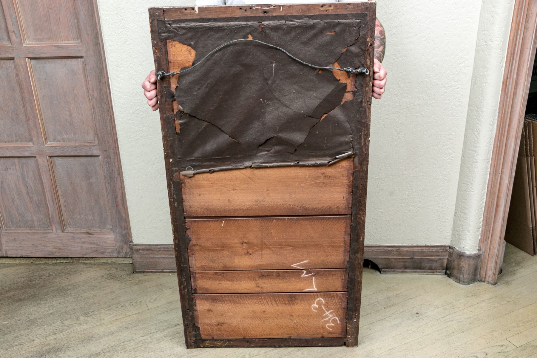 Presents well overall with wear commensurate with age including losses and finish wear to the frame, and some scattered spots of desilvering to the mirror surface.