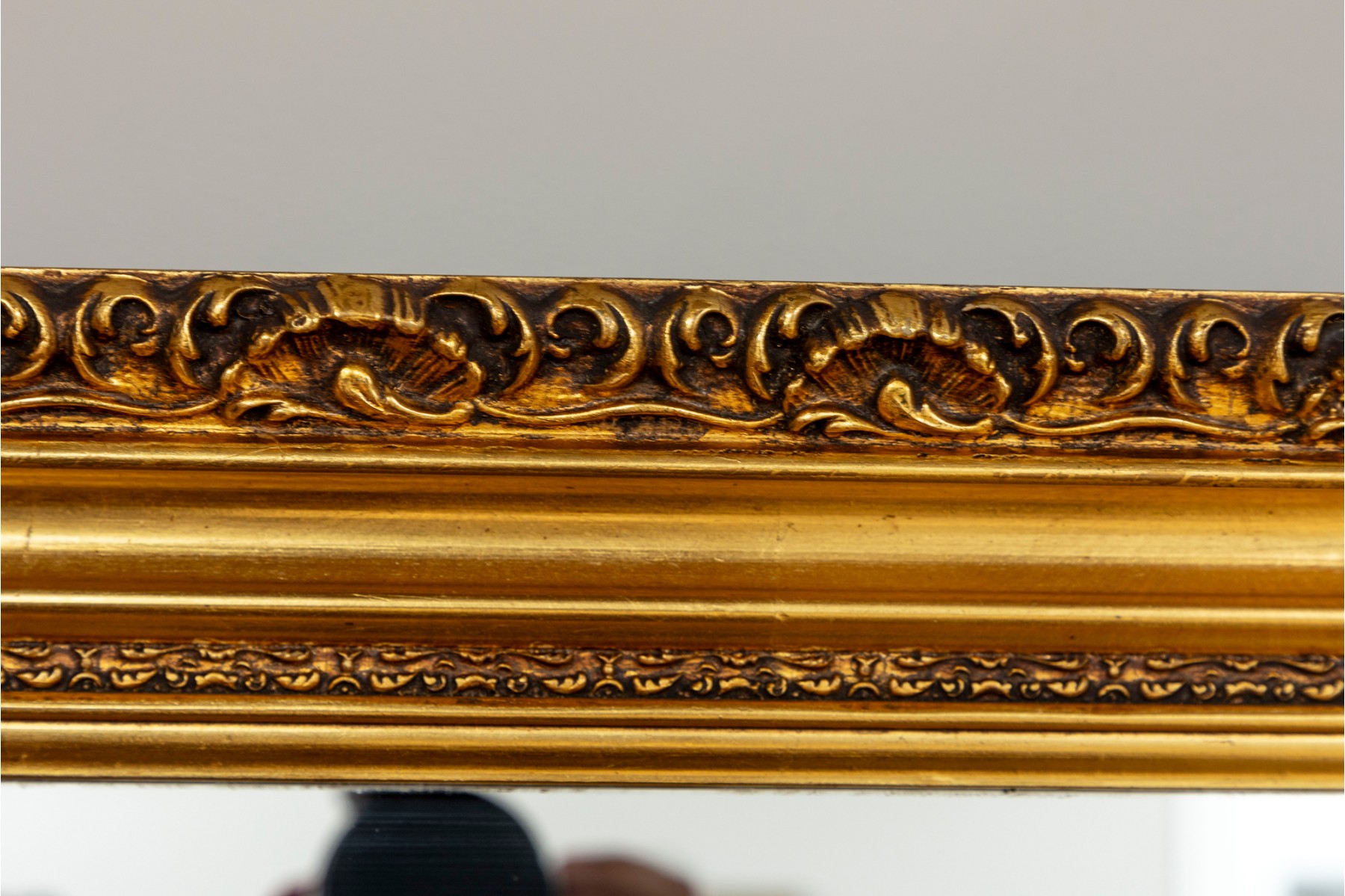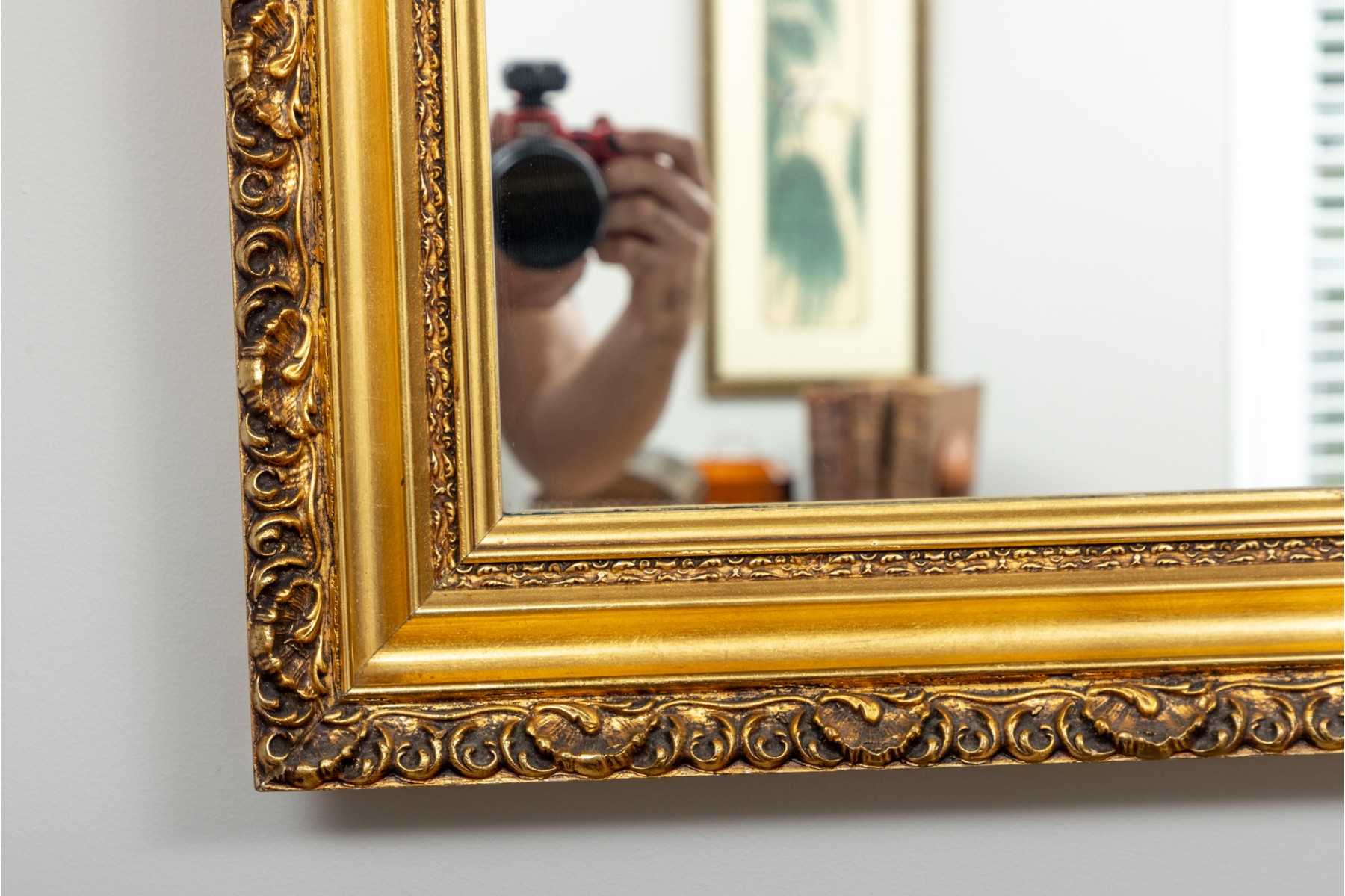 An antique strike glass wall mirror, flat with no bevel and displayed in a gilt-wood frame rich with carved foliate details.