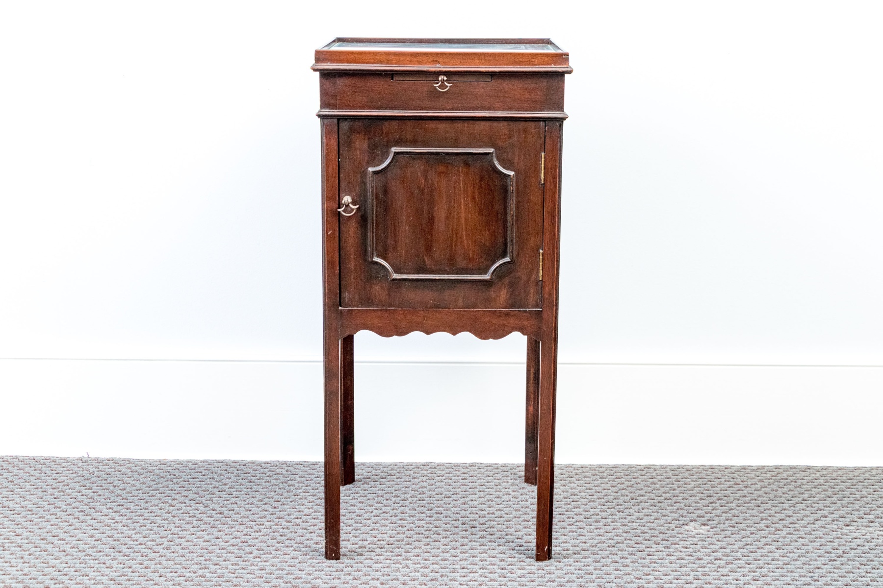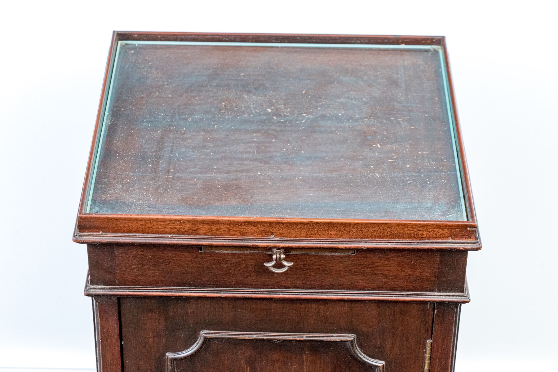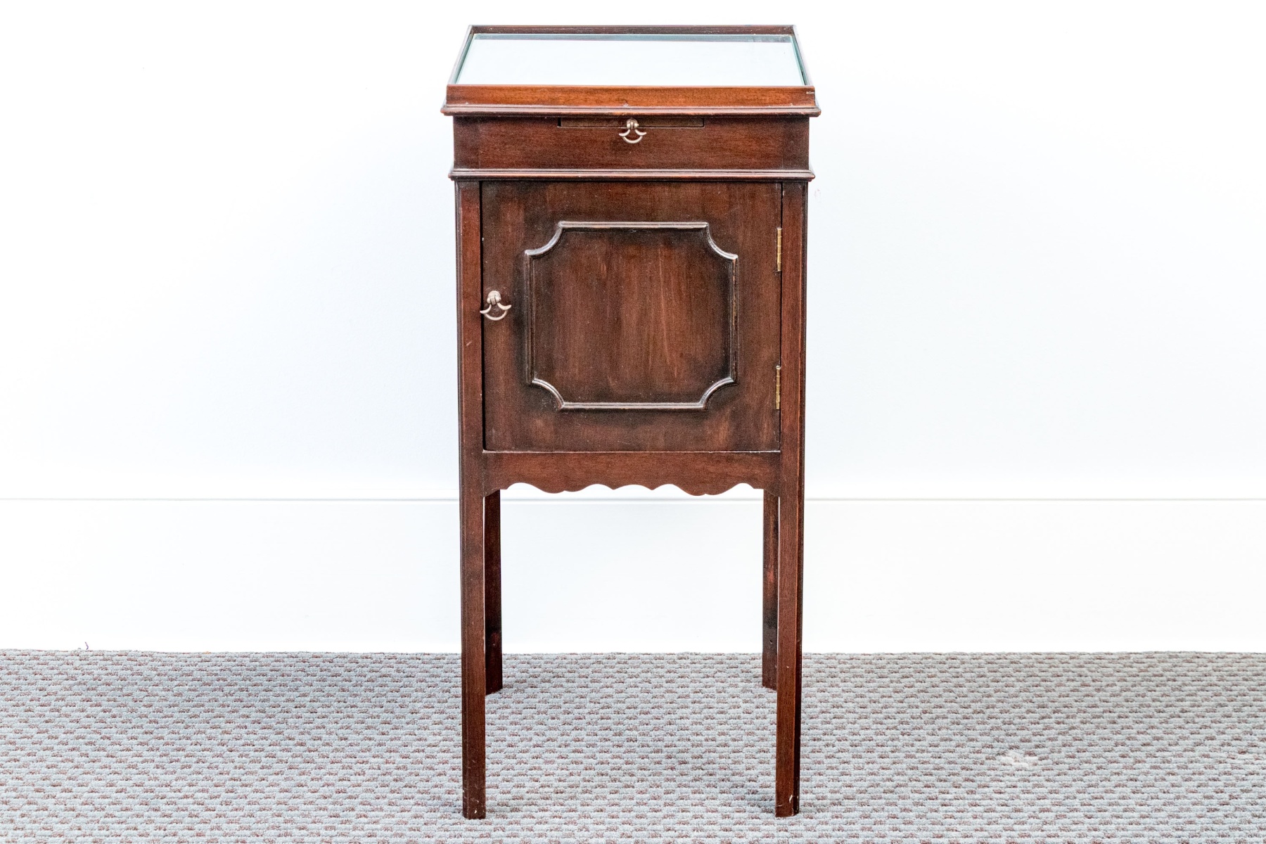 A charming antique little end table raised on four legs with hinged door to the central case with quatrefoil moulded decoration to the door panel and brass pull. Above is a small, recessed shelf with brass pull. The table top is finished with a short gallery surrounding a fitted glass panel top.