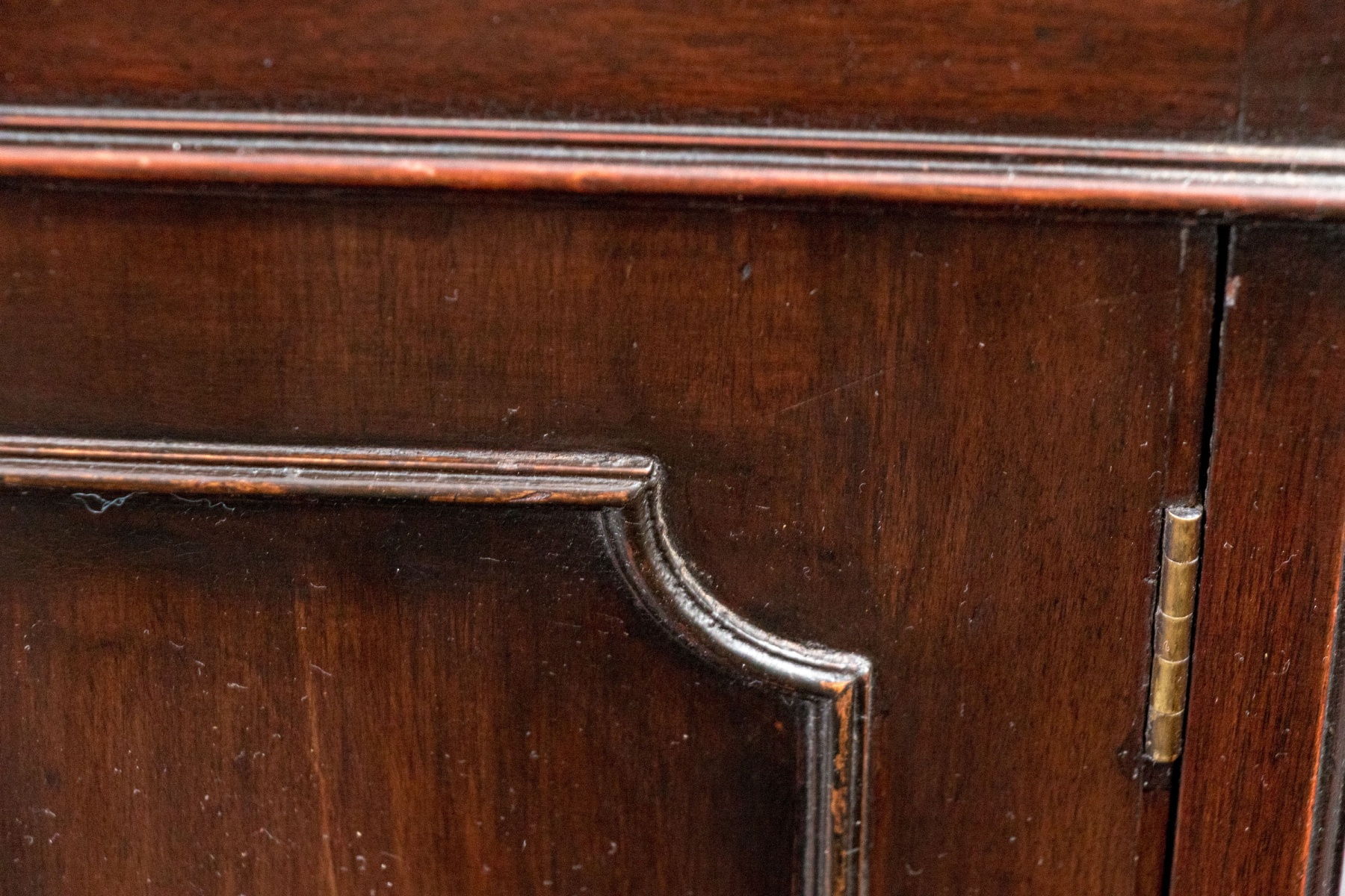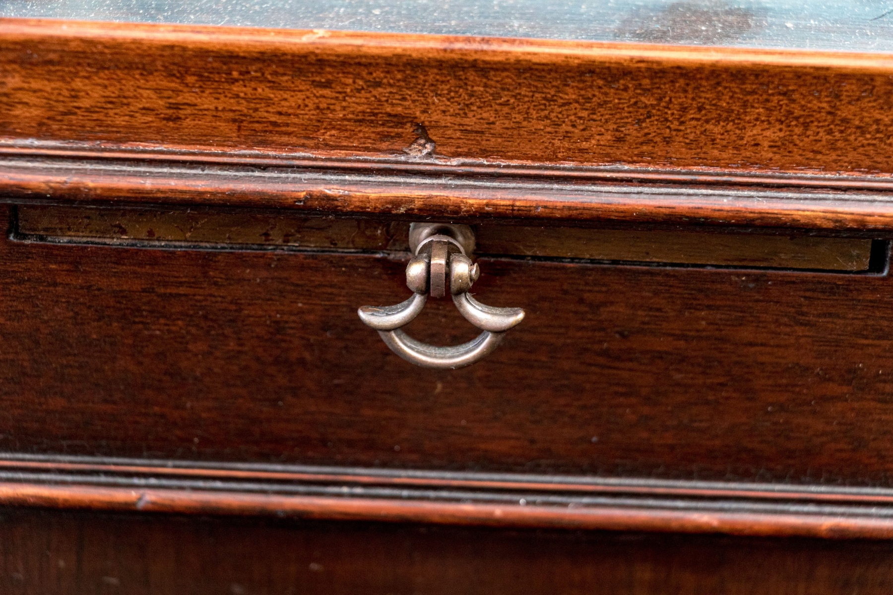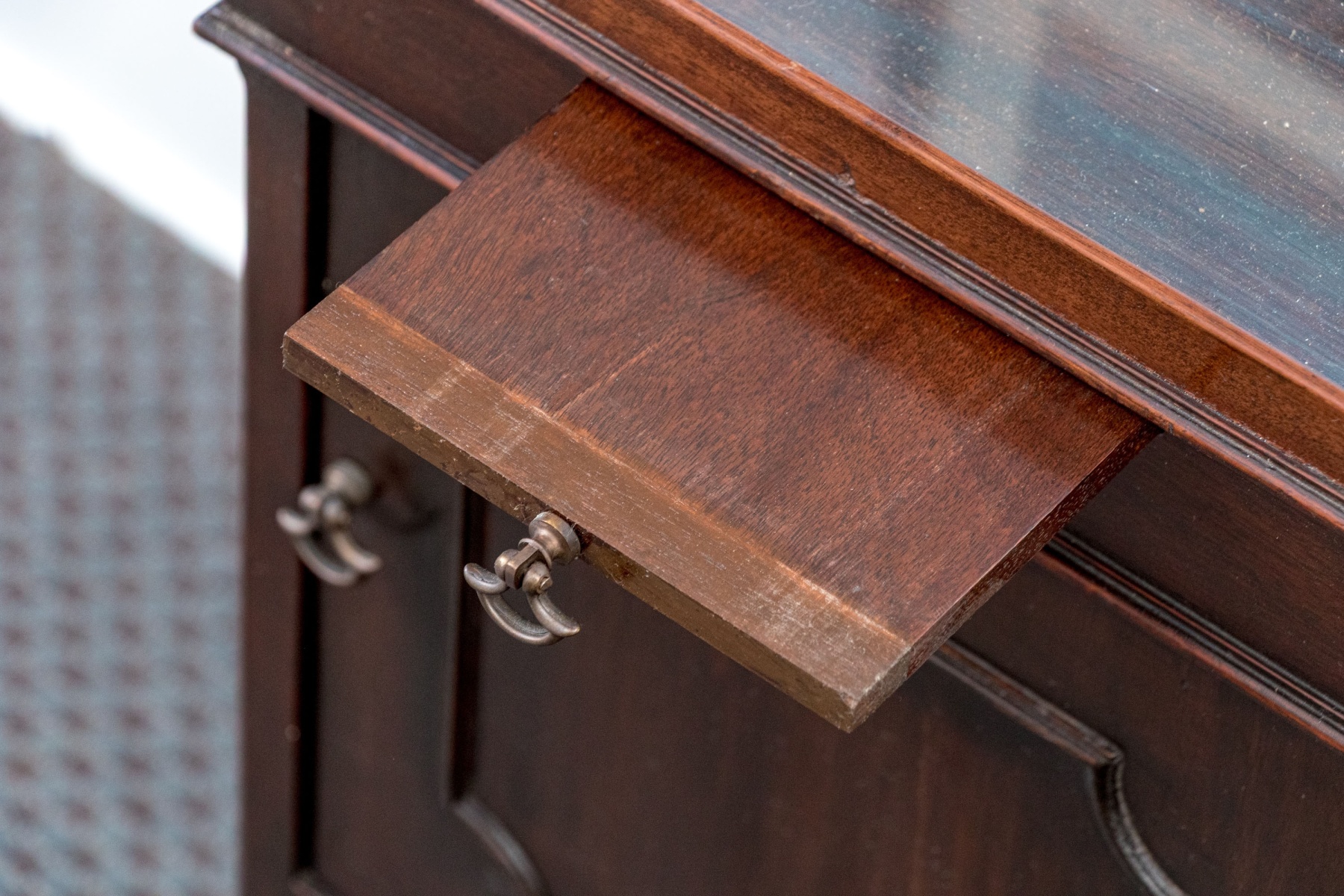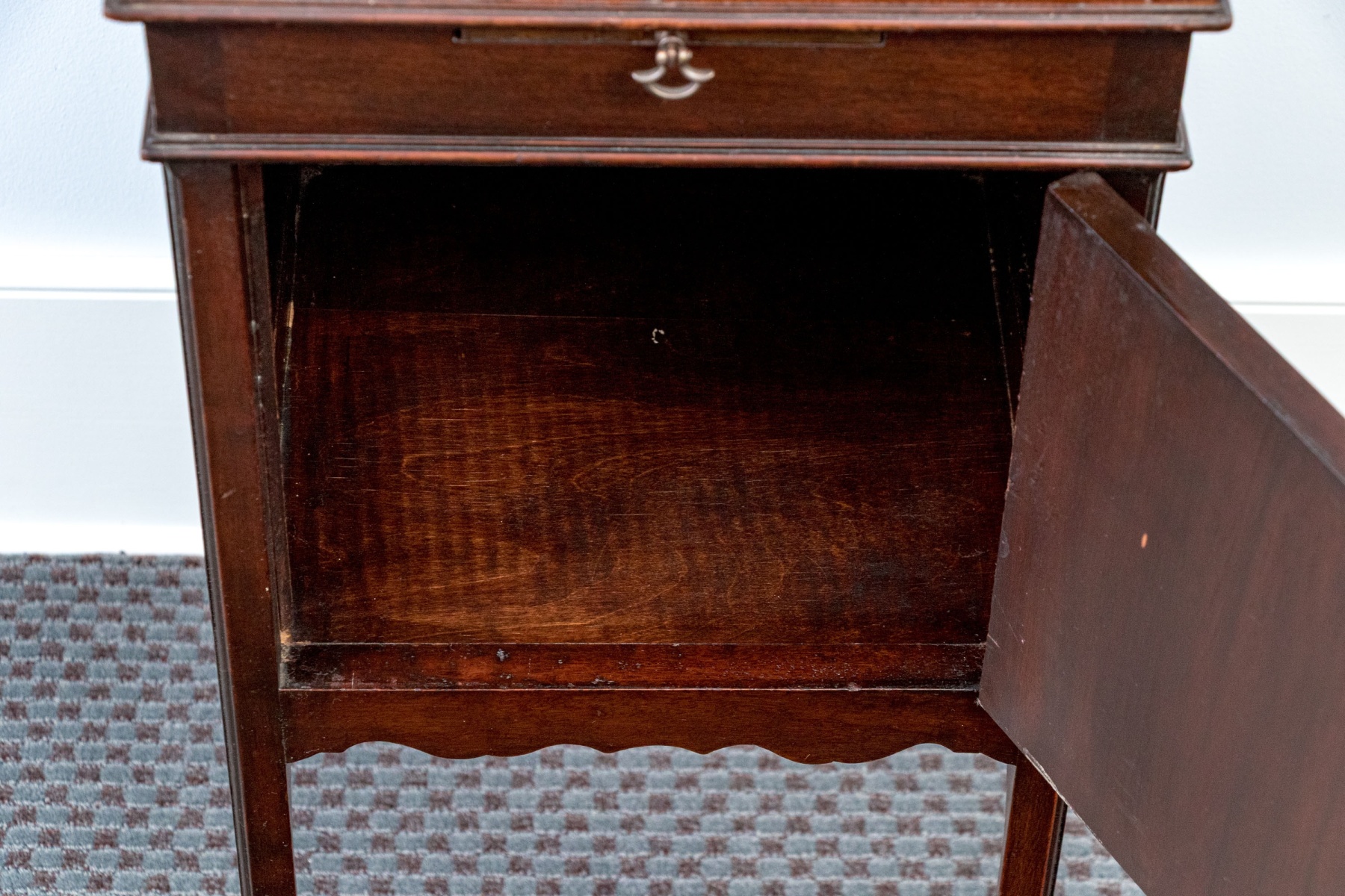 A charming antique little end table raised on four legs with hinged door to the central case with quatrefoil moulded decoration to the door panel and brass pull. Above is a small, recessed shelf with brass pull. The table top is finished with a short gallery surrounding a fitted glass panel top.