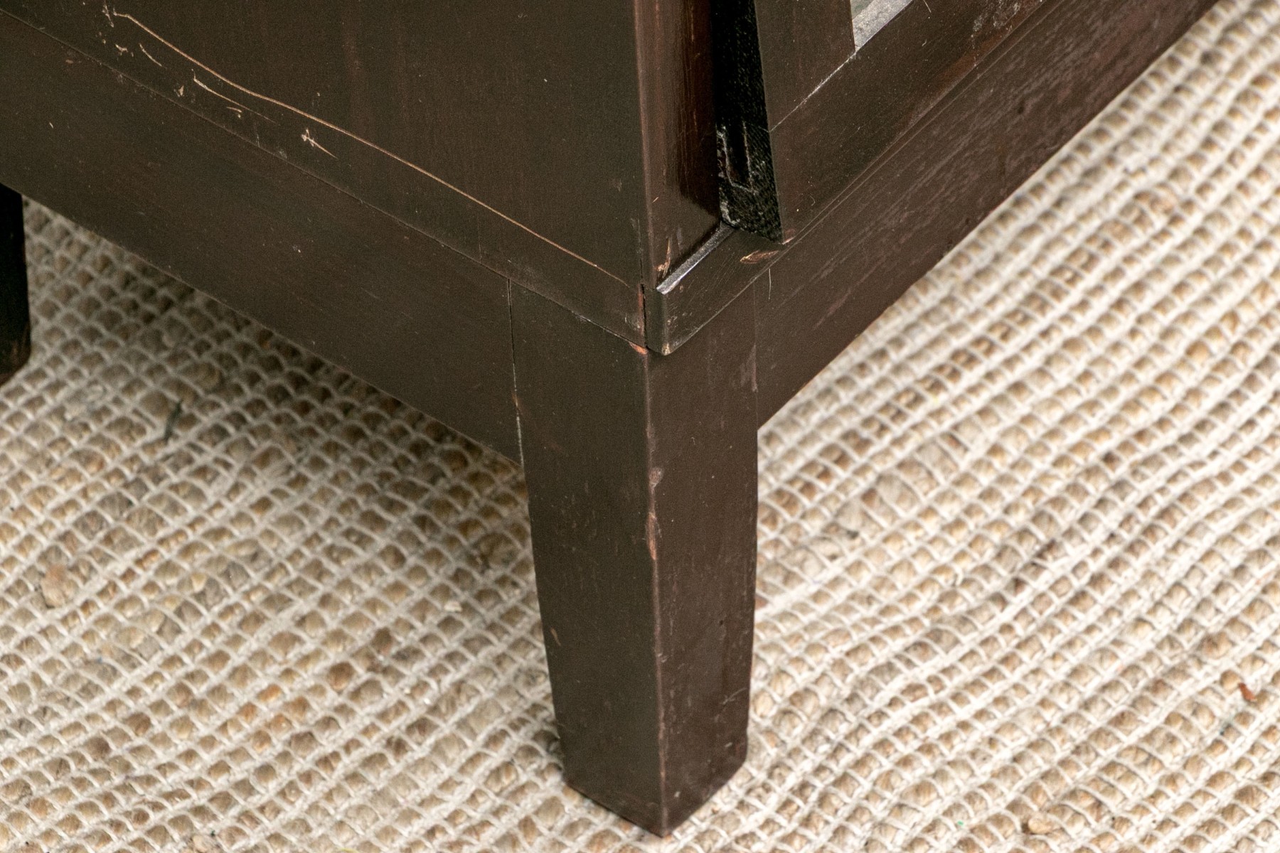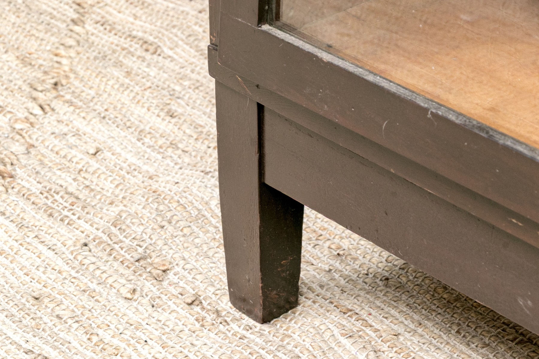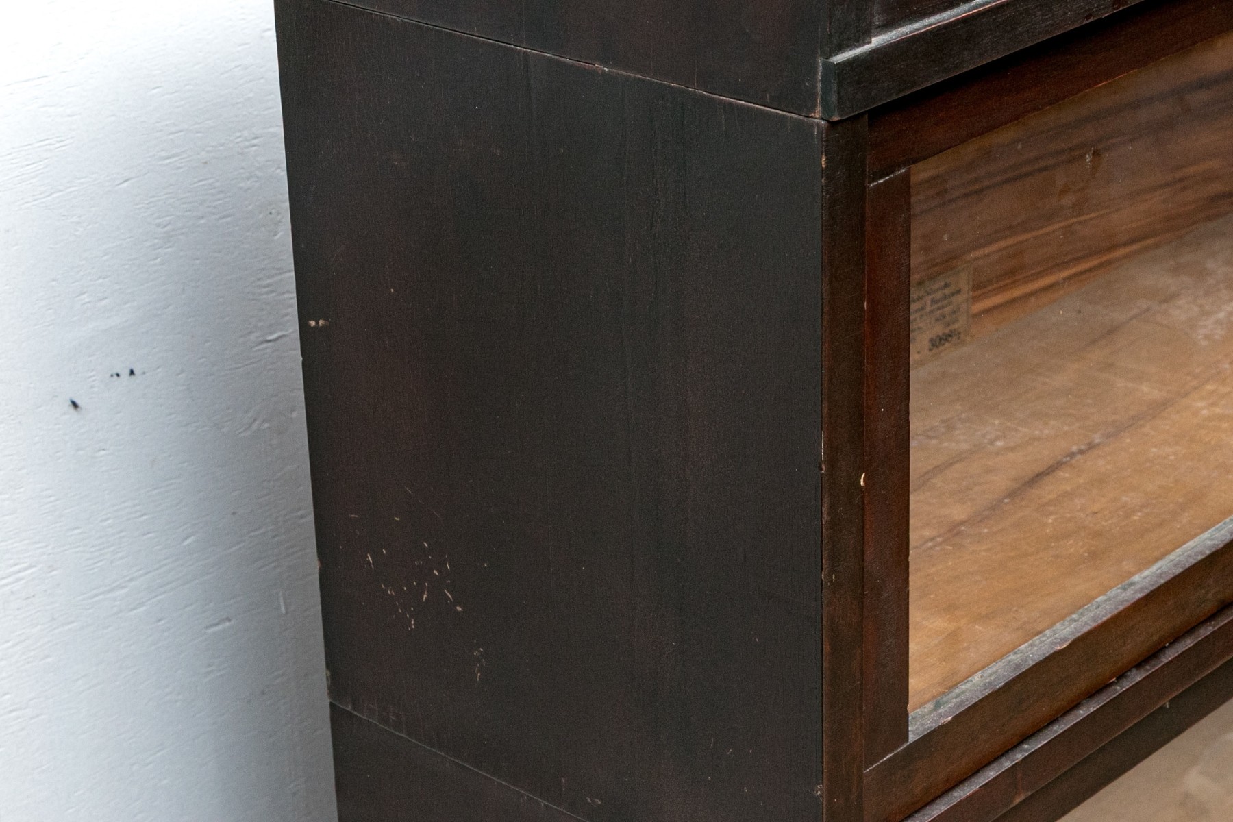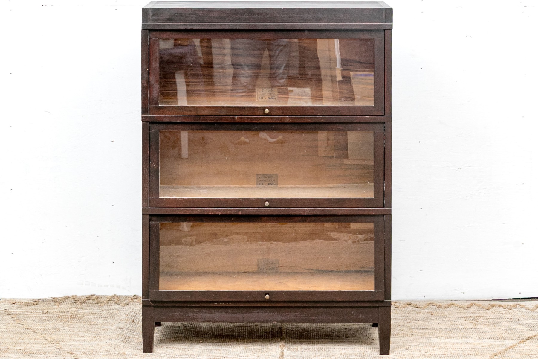The barrister style bookcase has three shelves with hinged glass paneled fronts that hinge up and can be recessed into the case to access the interior shelf.