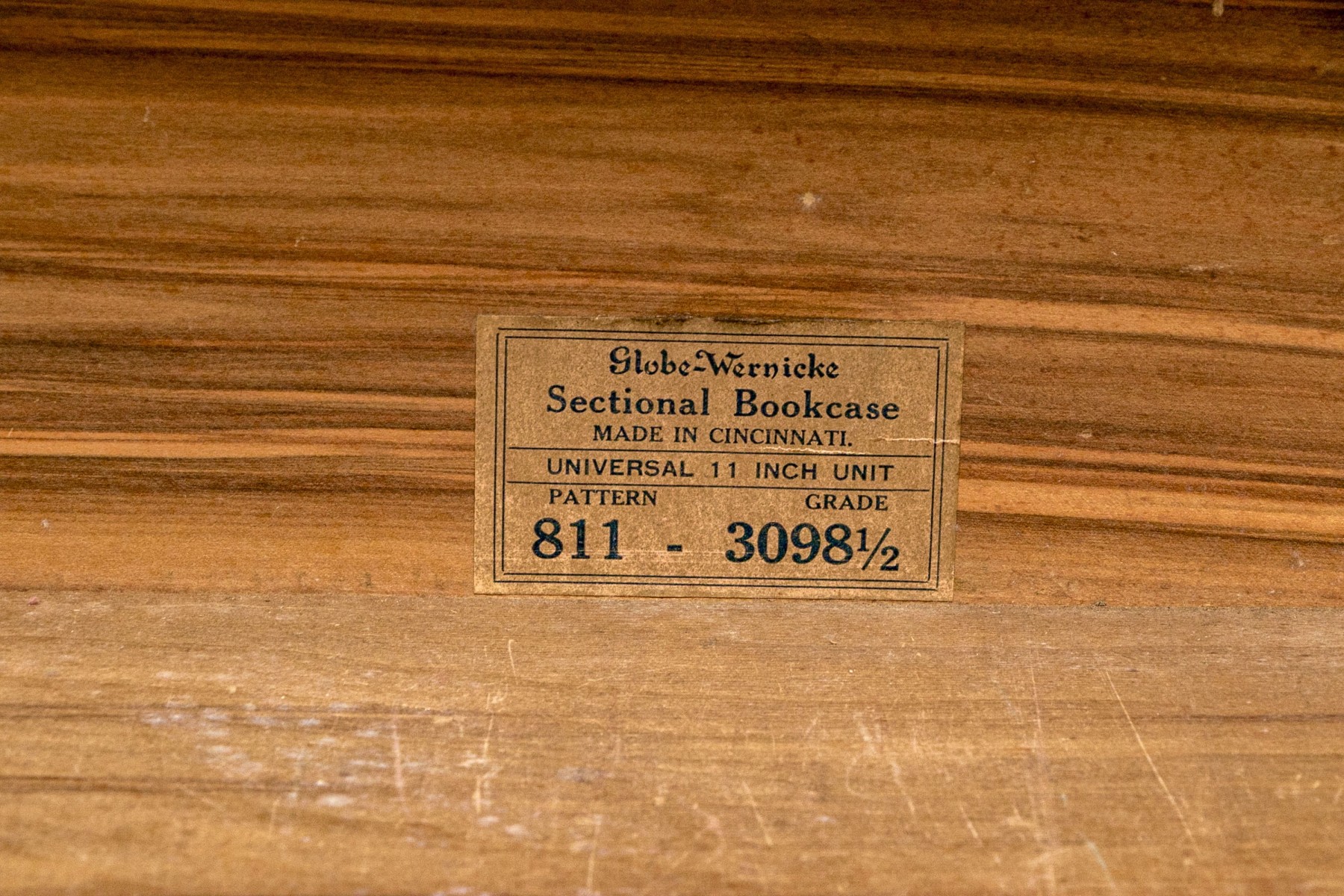 Each shelf is labeled: "Globe-Wernicke Sectional Bookcase Made in Cincinnati. Universal 11 Inch Unit. Pattern 811 - Grade 3098 1/2".