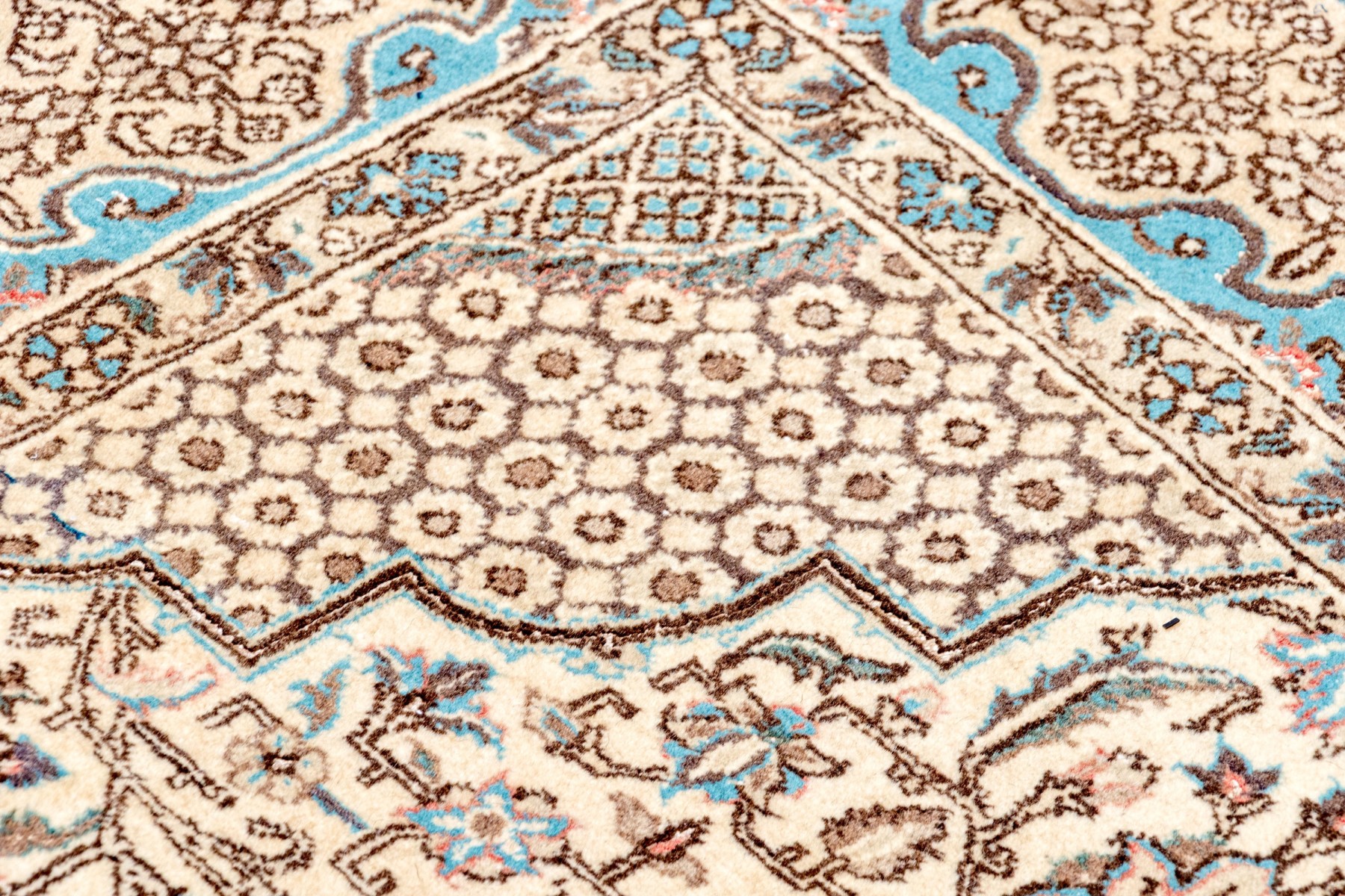 A lovely antique hand-knotted wool area rug designed with a vibrant sky blue main border flanked by floral cream guard borders around a cream field. The field is detailed with a repeating composition of large, scalloped and bracketed medallions with circular lattice patterns within, surrounded by a lush arrangement of vining florals.