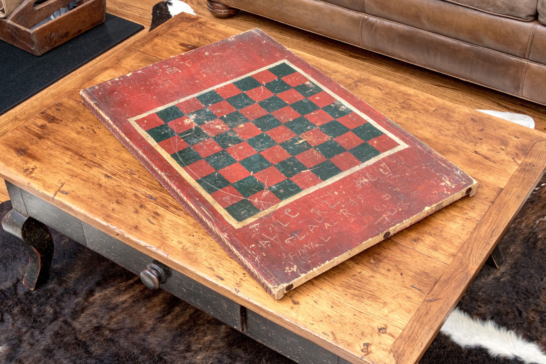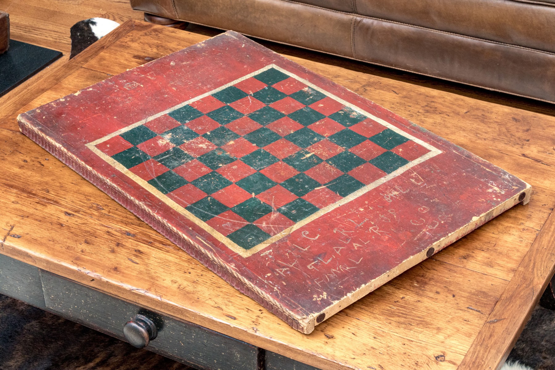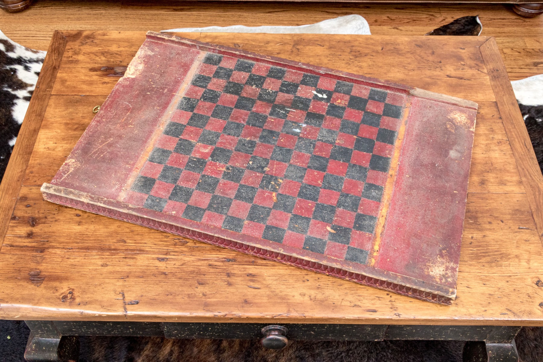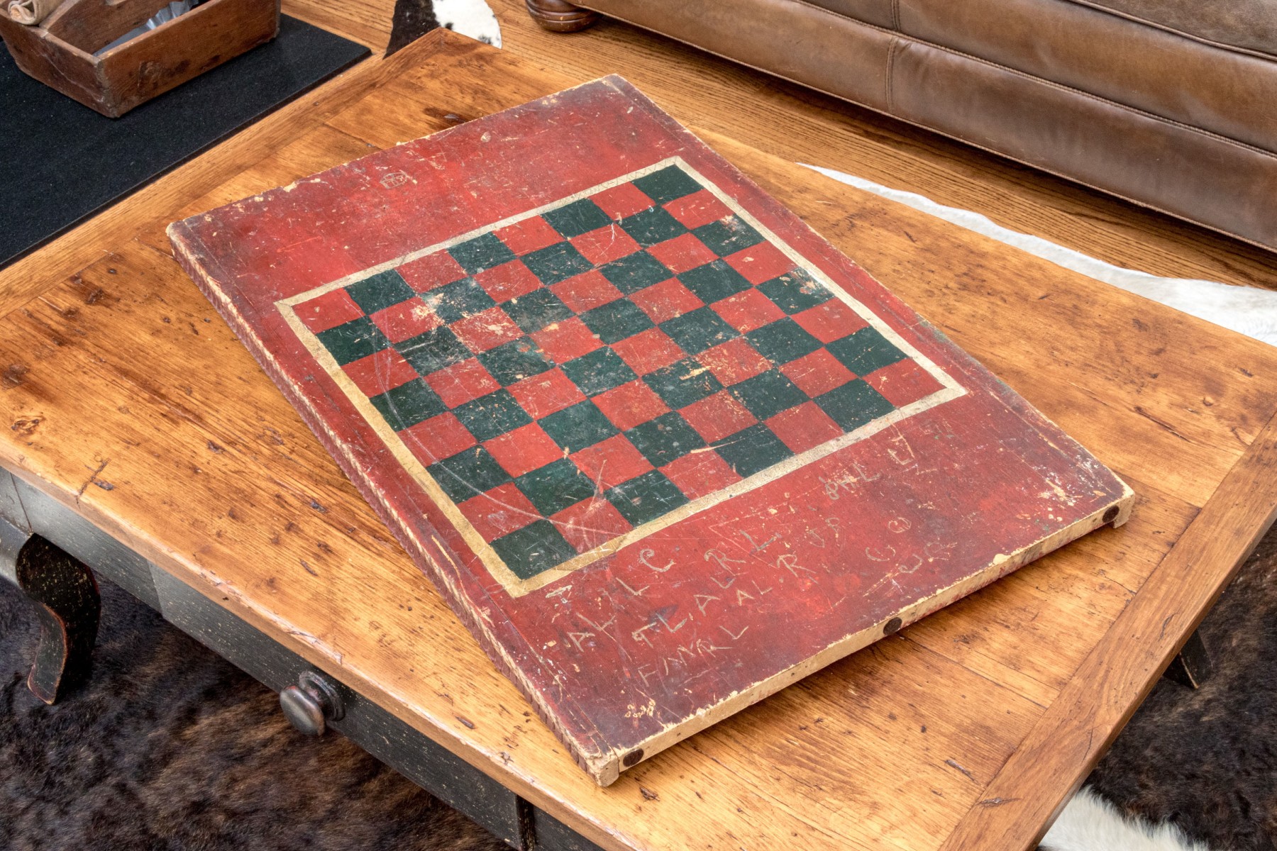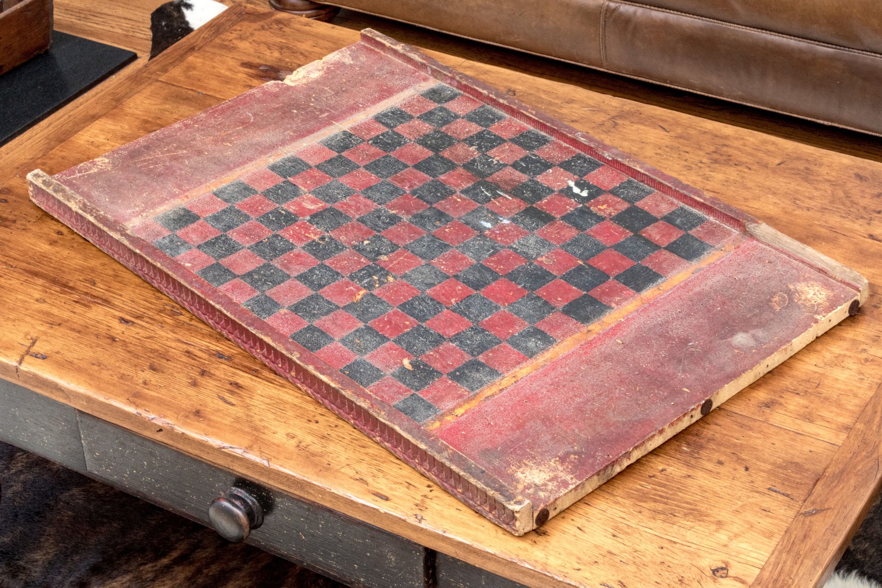 A wonderfully rustic antique game board featuring a rectangular wood panel flanked by gently raised sides, hand-painted on both sides. Features a brass loop for hanging and display.
