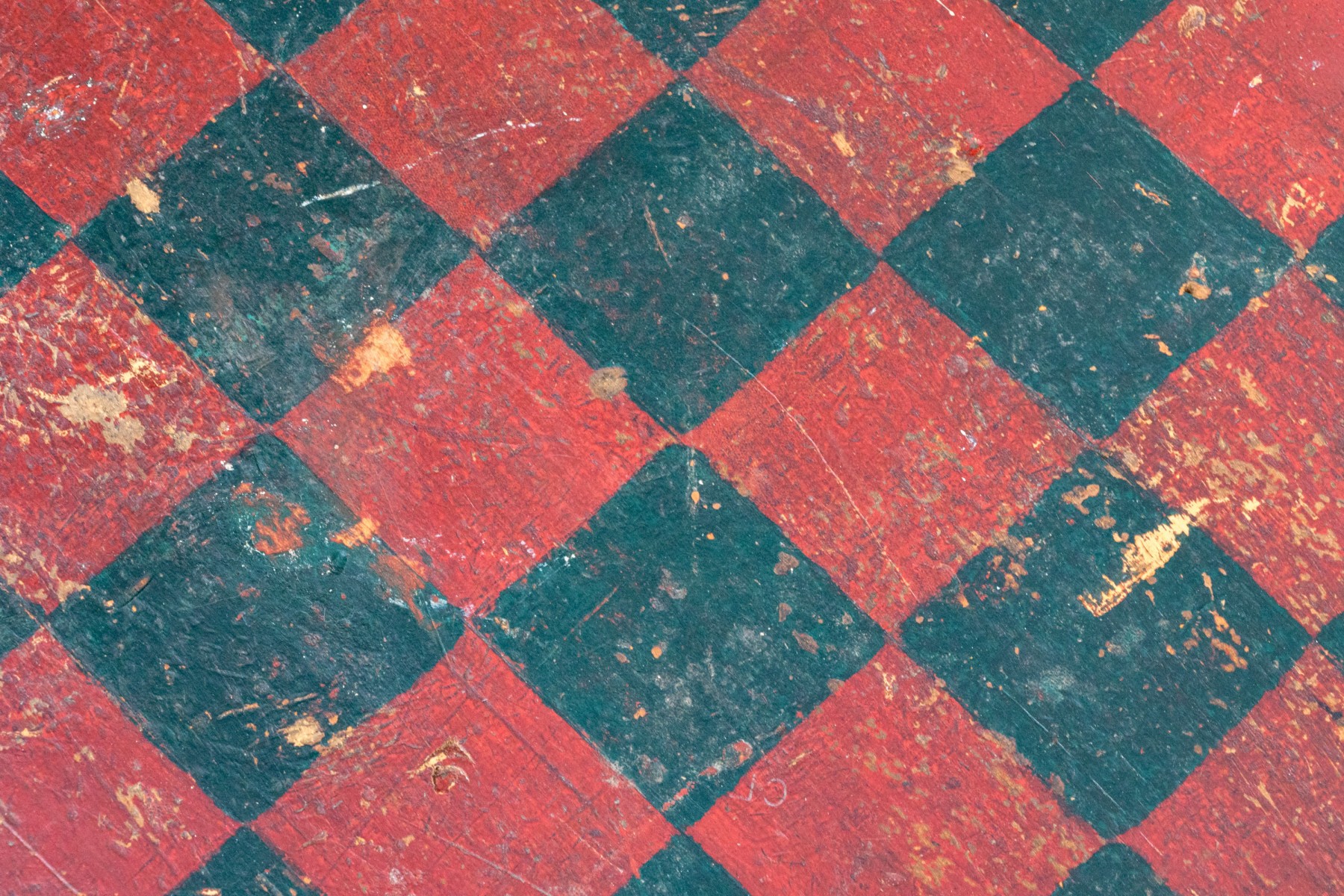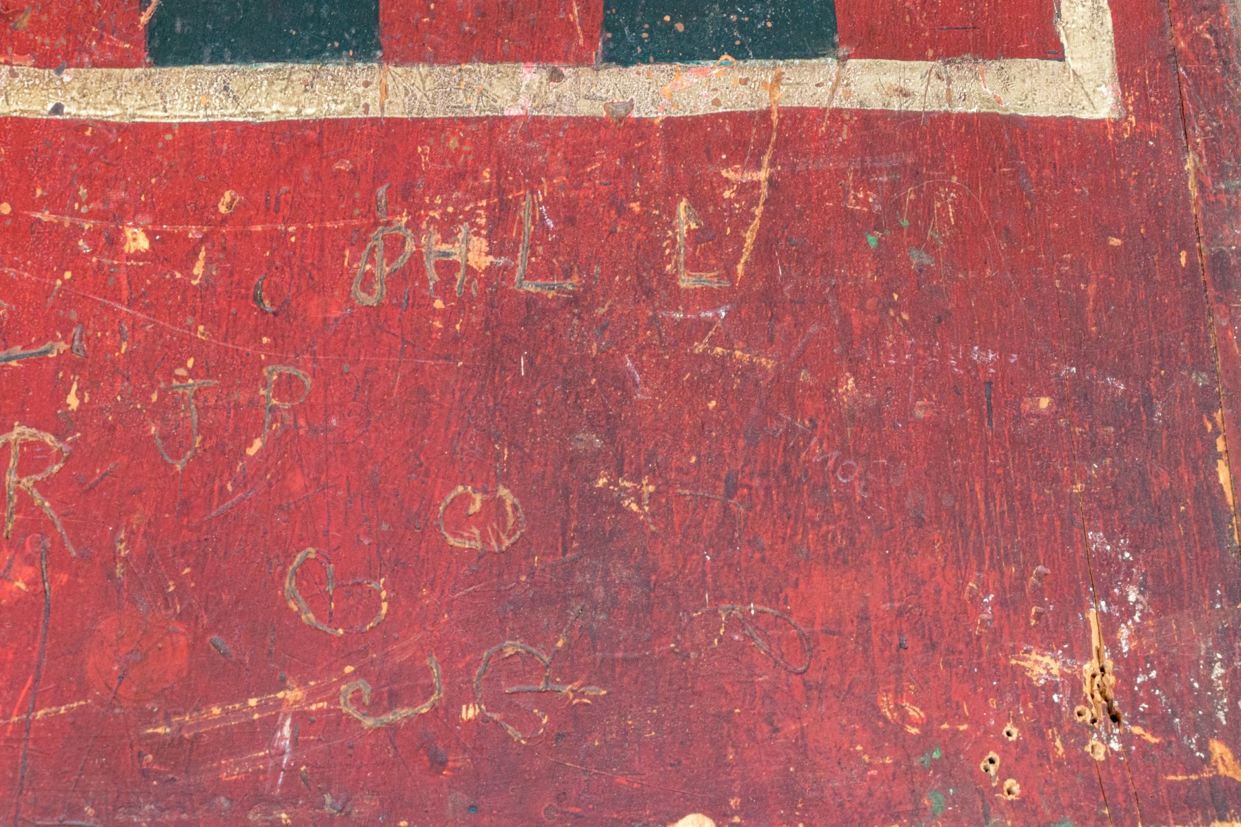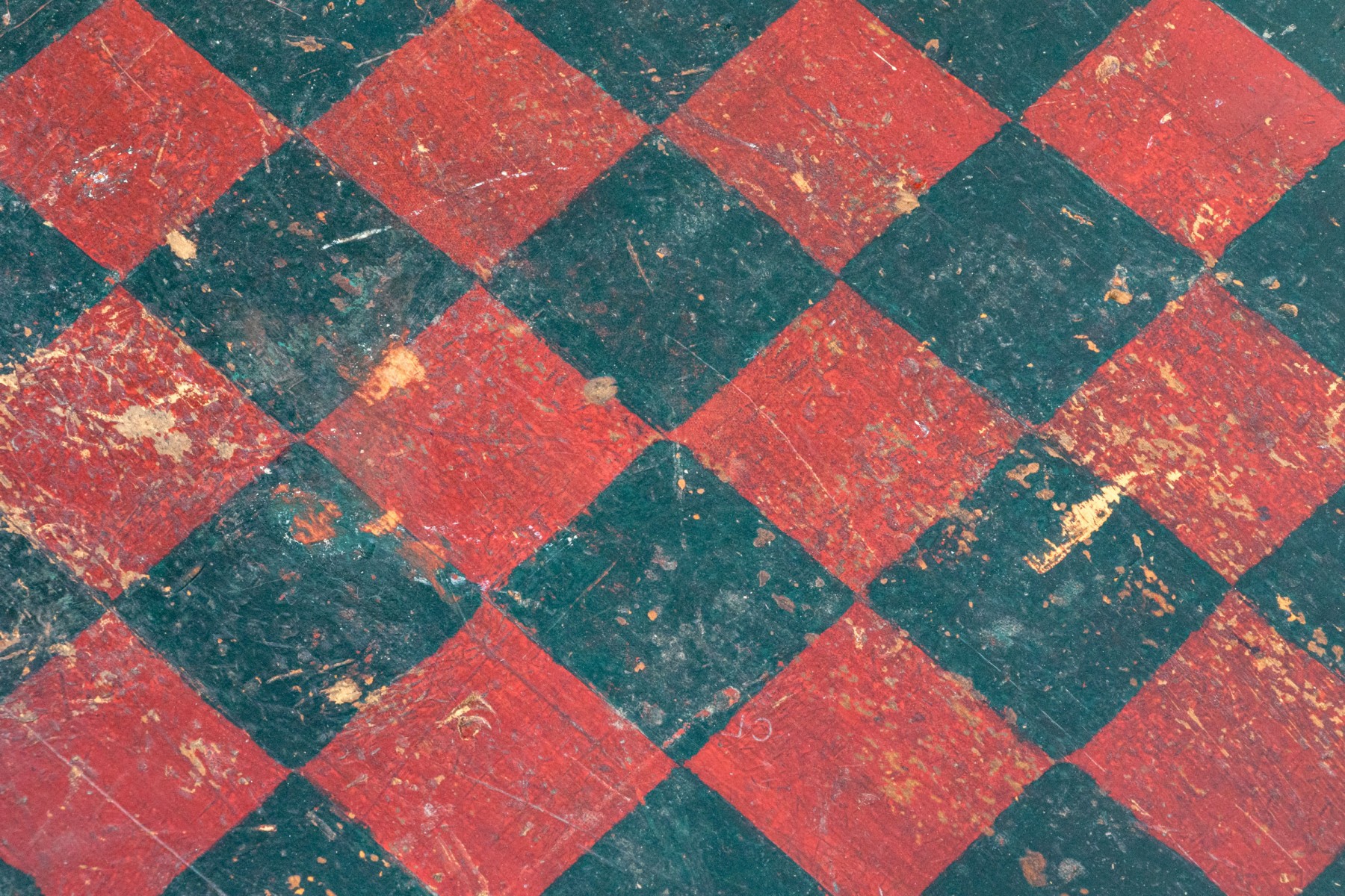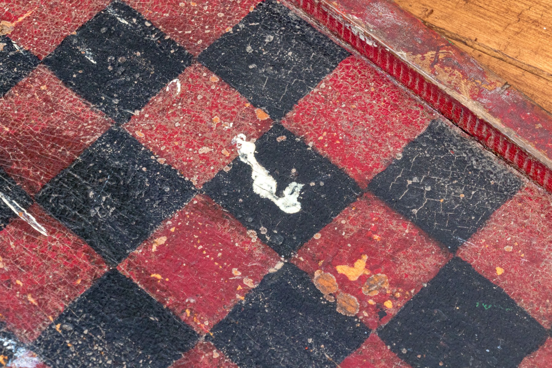 A wonderfully rustic antique game board featuring a rectangular wood panel flanked by gently raised sides, hand-painted on both sides. Features a brass loop for hanging and display.
