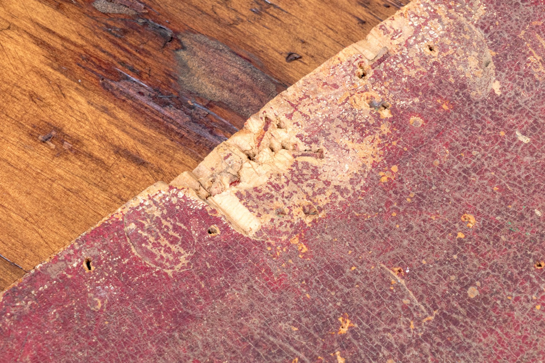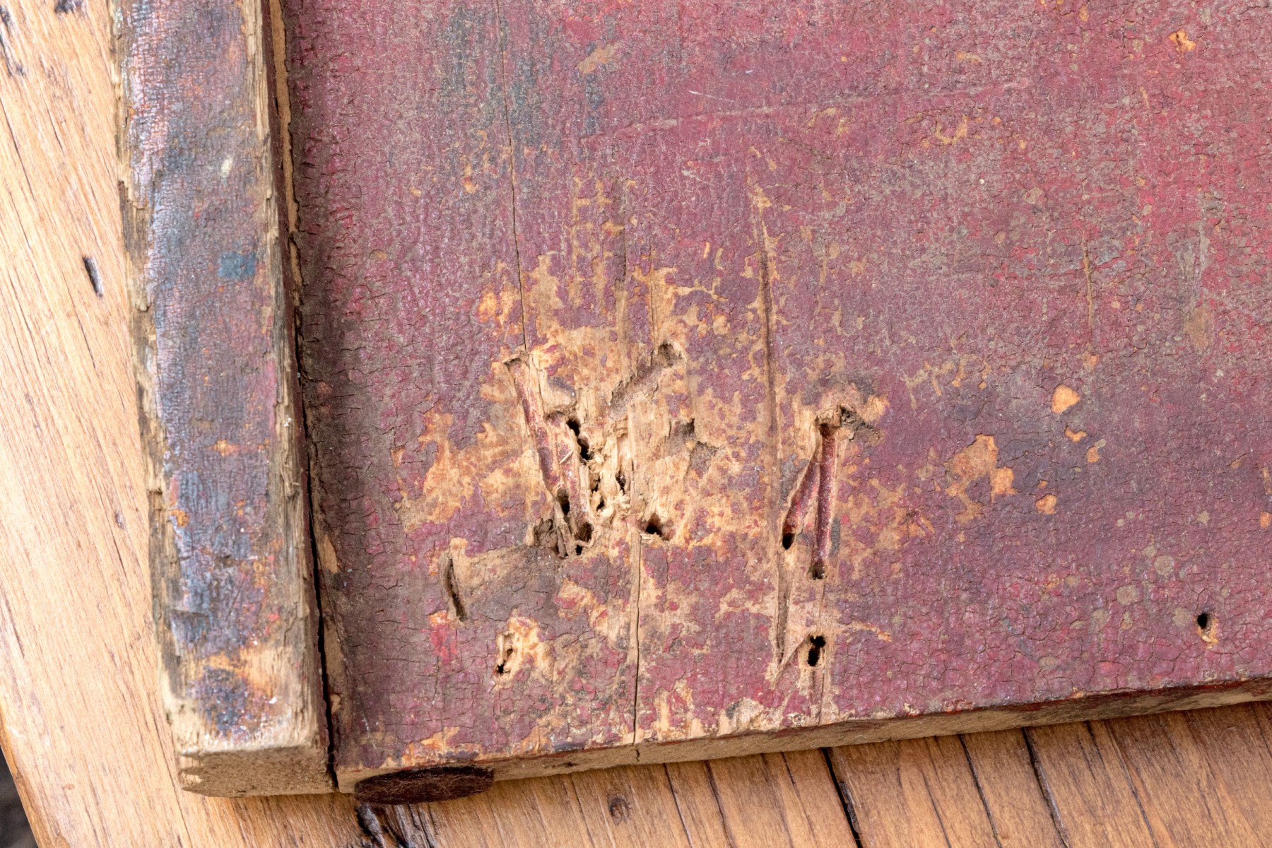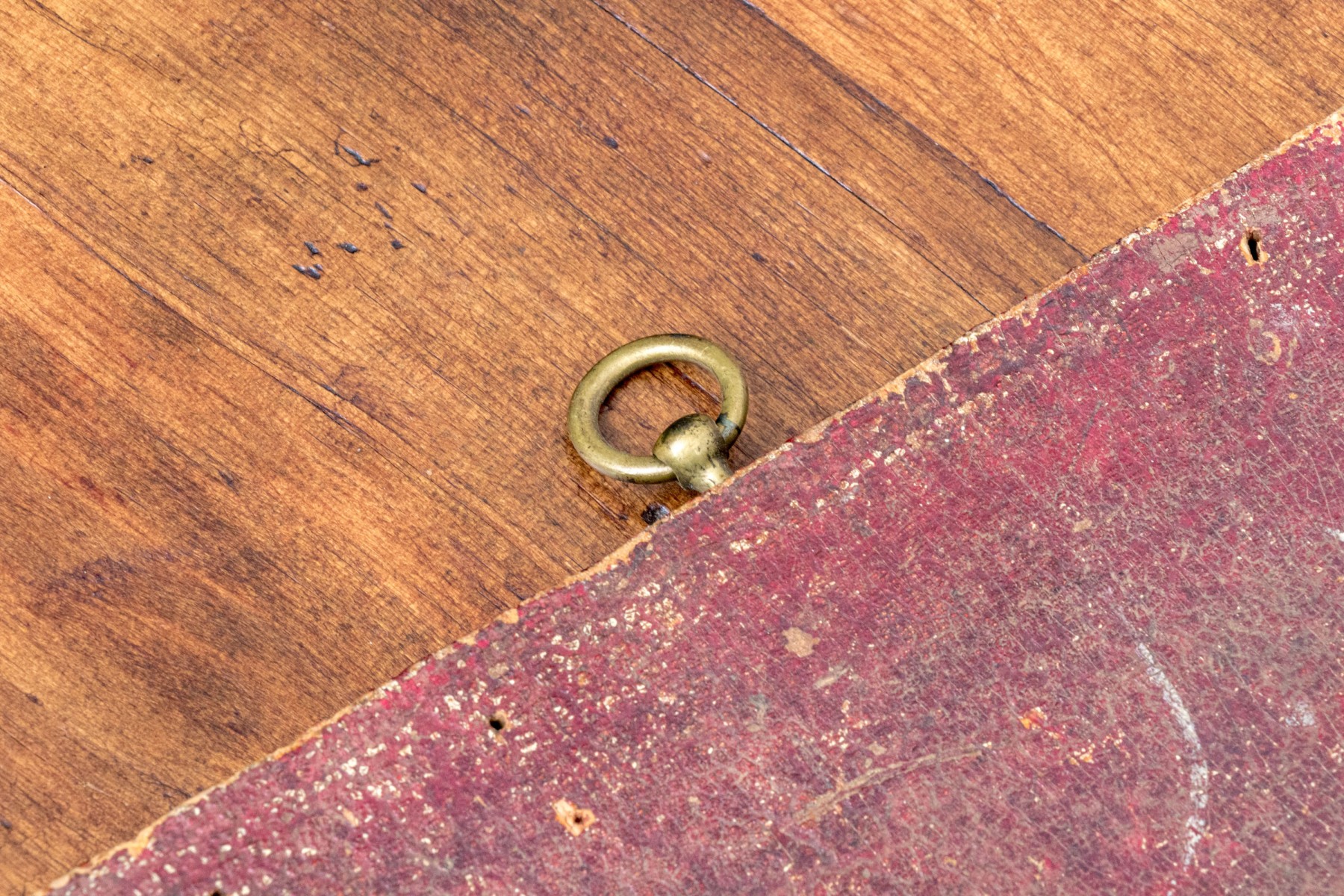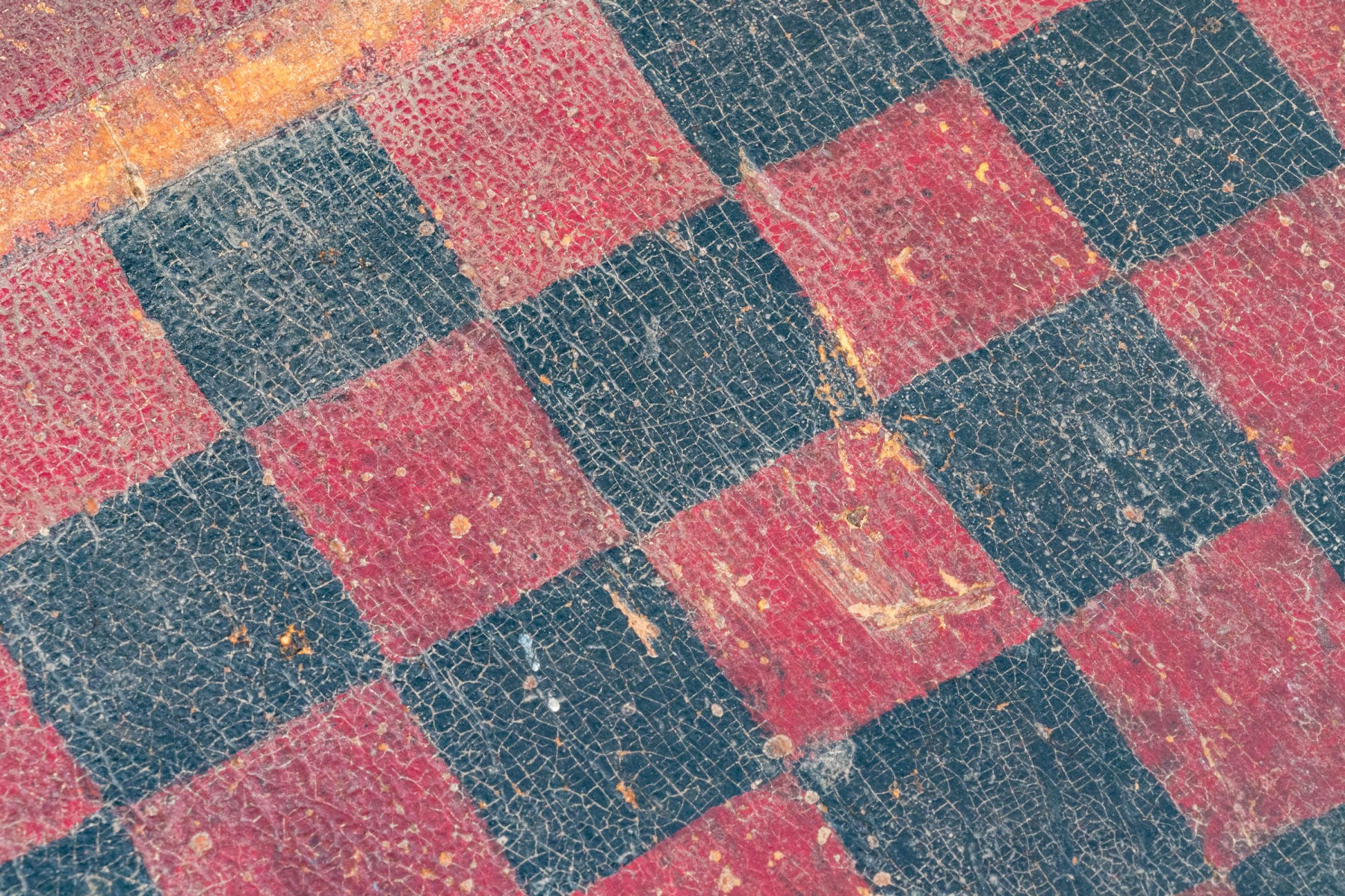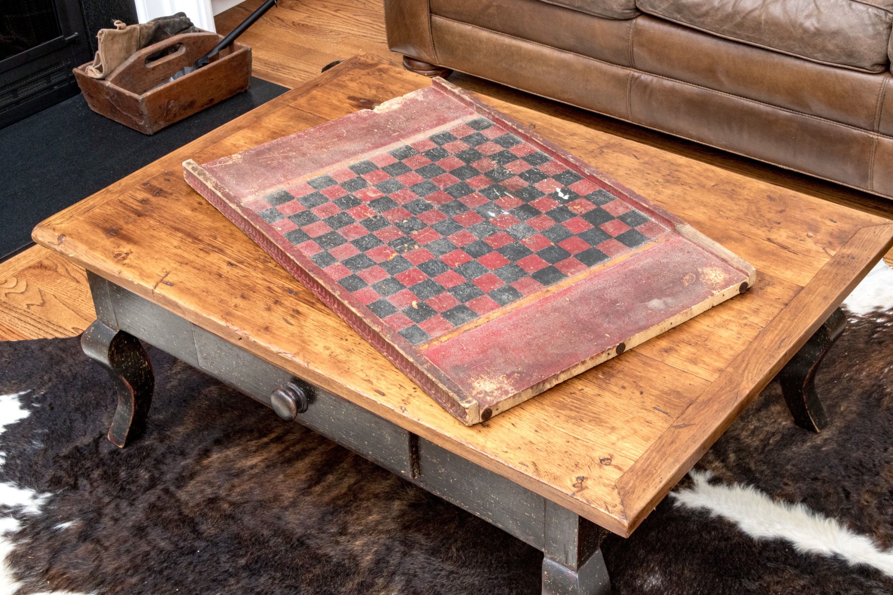 A wonderfully rustic antique game board featuring a rectangular wood panel flanked by gently raised sides, hand-painted on both sides. Features a brass loop for hanging and display.