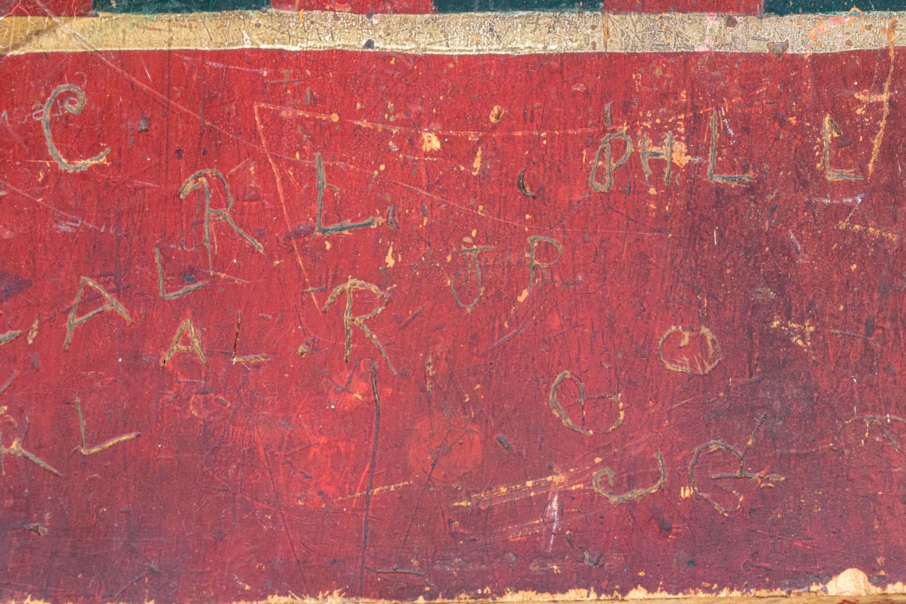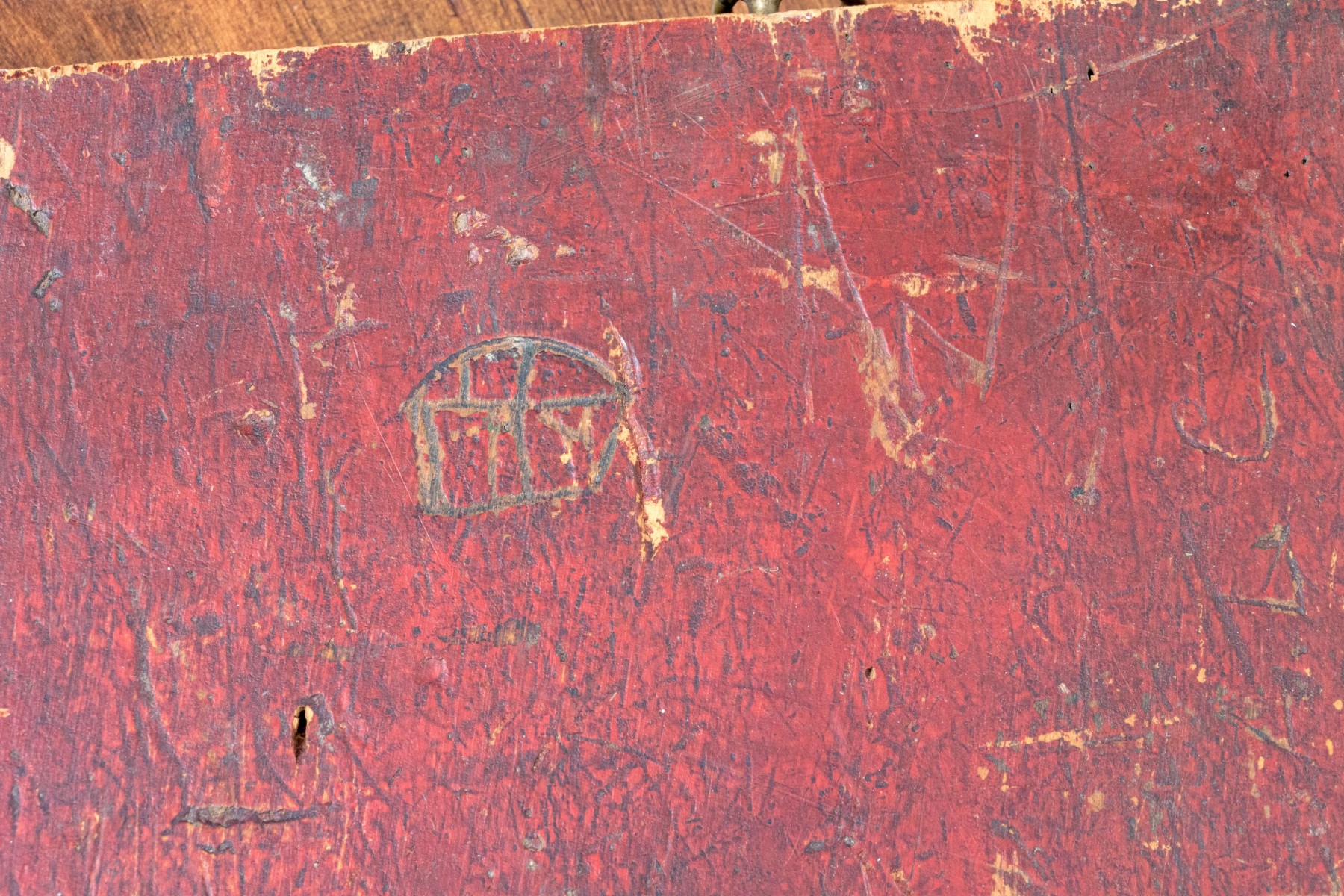 Presents well overall with wear commensurate with age and use adding to the rustic quality of the piece. With nicely worn chipped losses around the edges and some scratched writing on one side. Please review the pictures as they are a part of the condition report.
