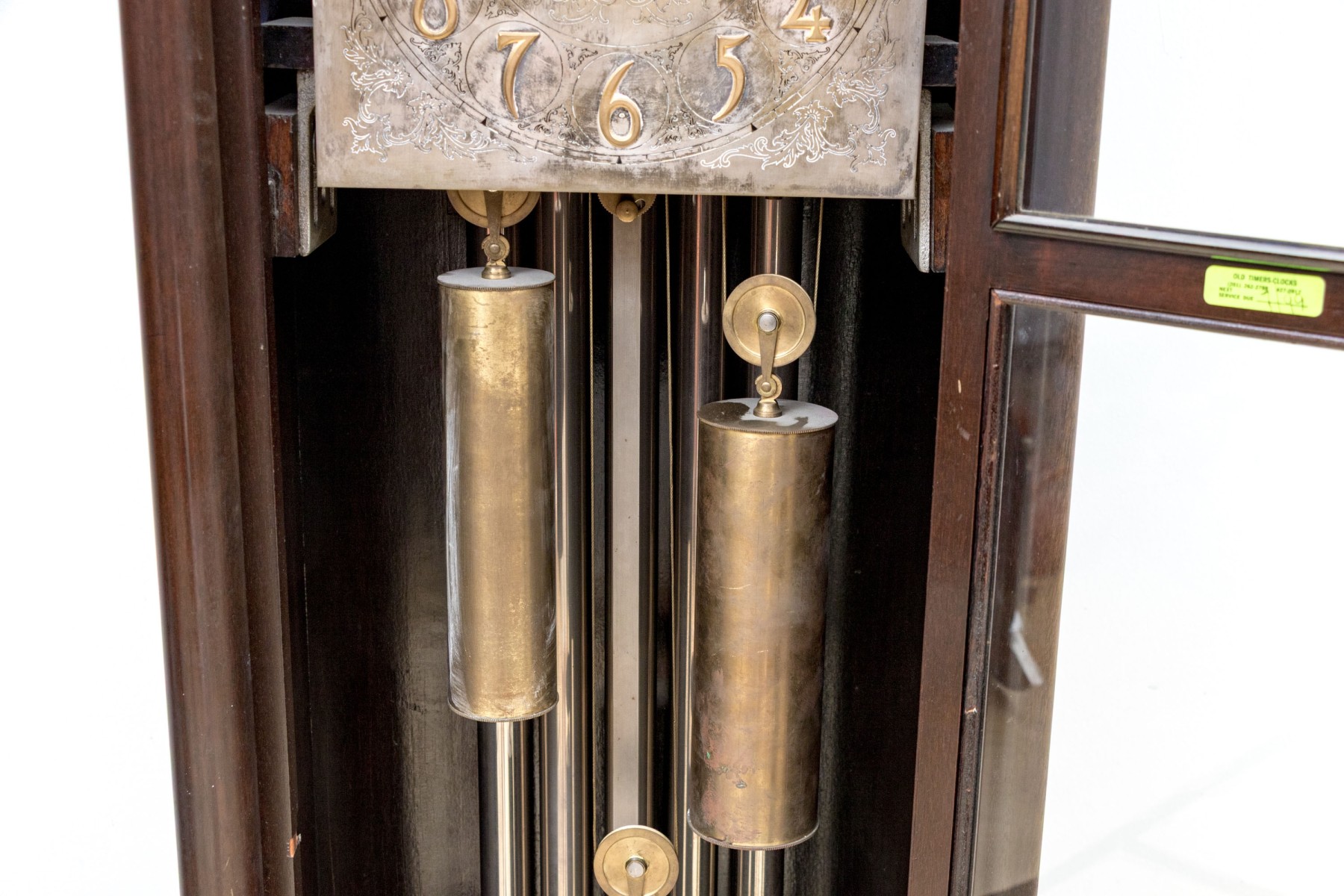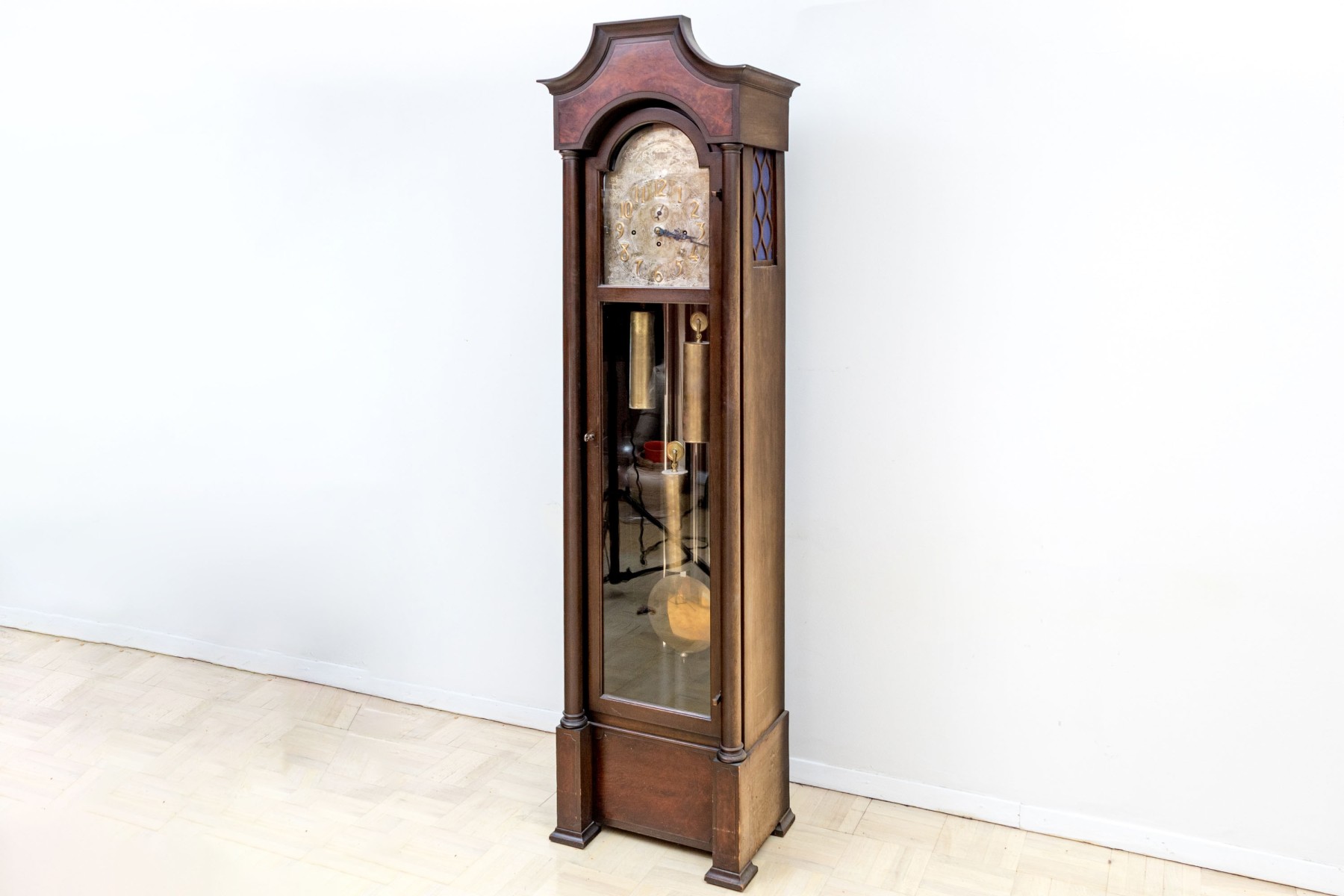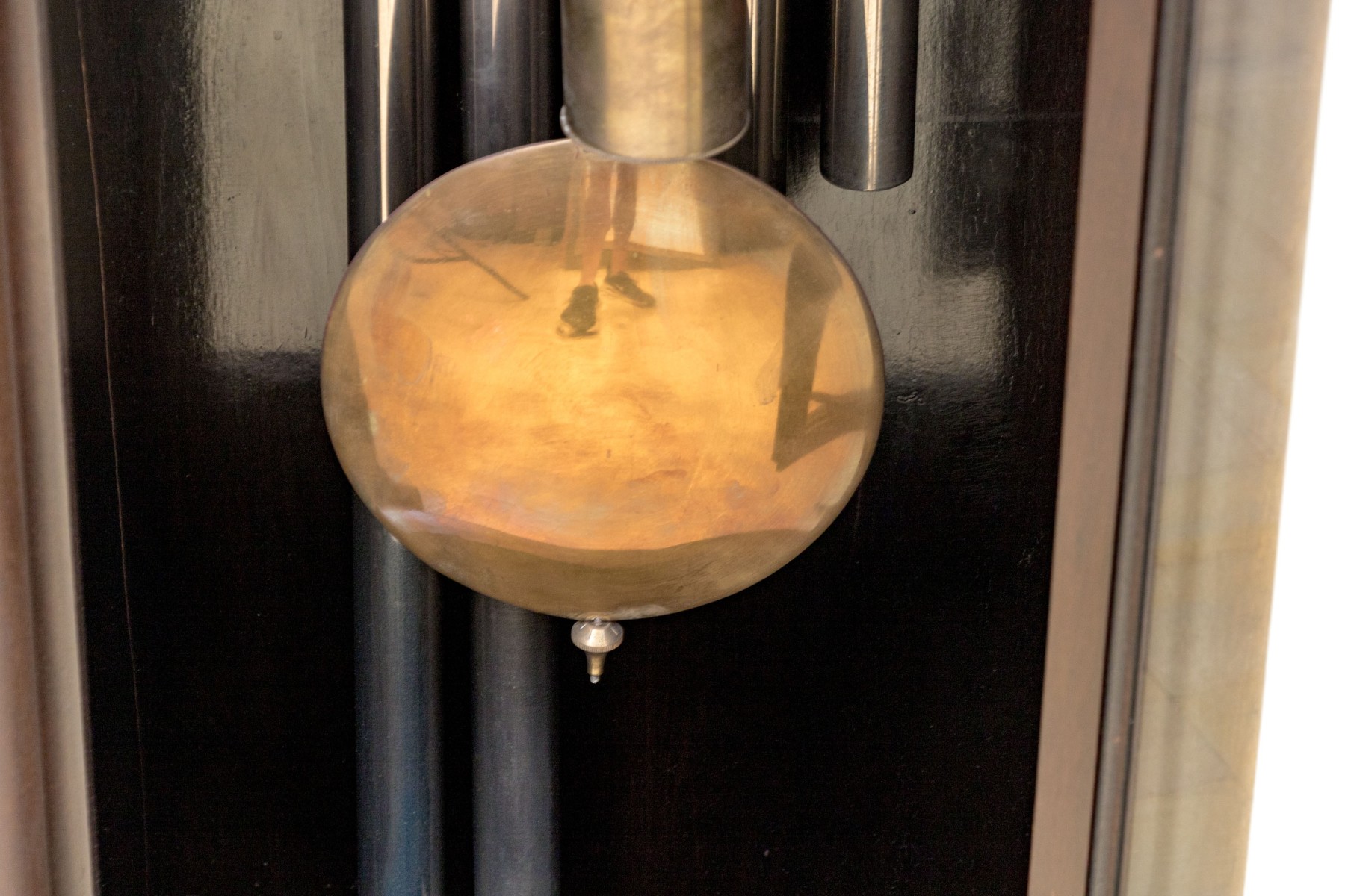 With winding key, five chimes, wight and pendulum. Key to wind and key to open glass door case.