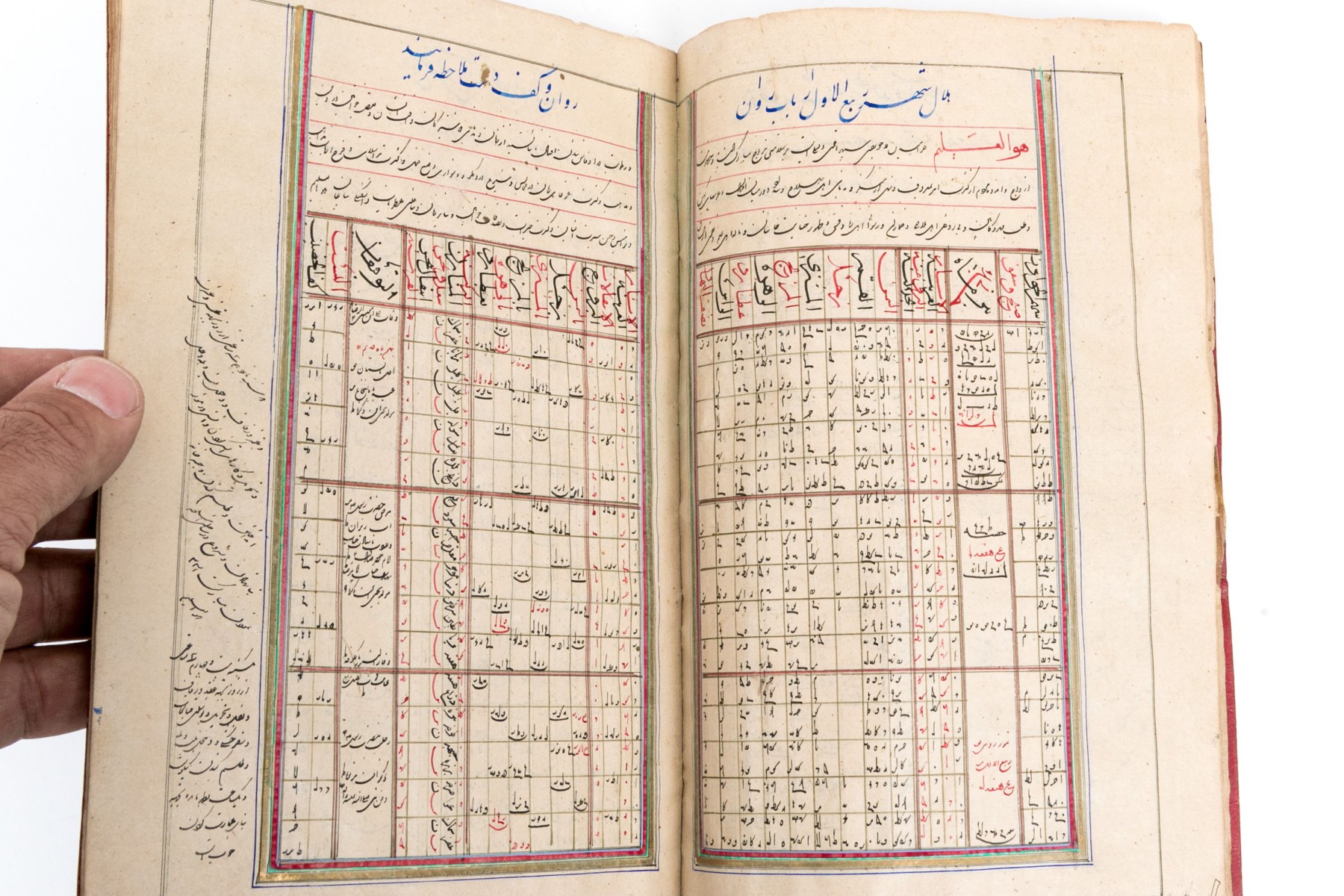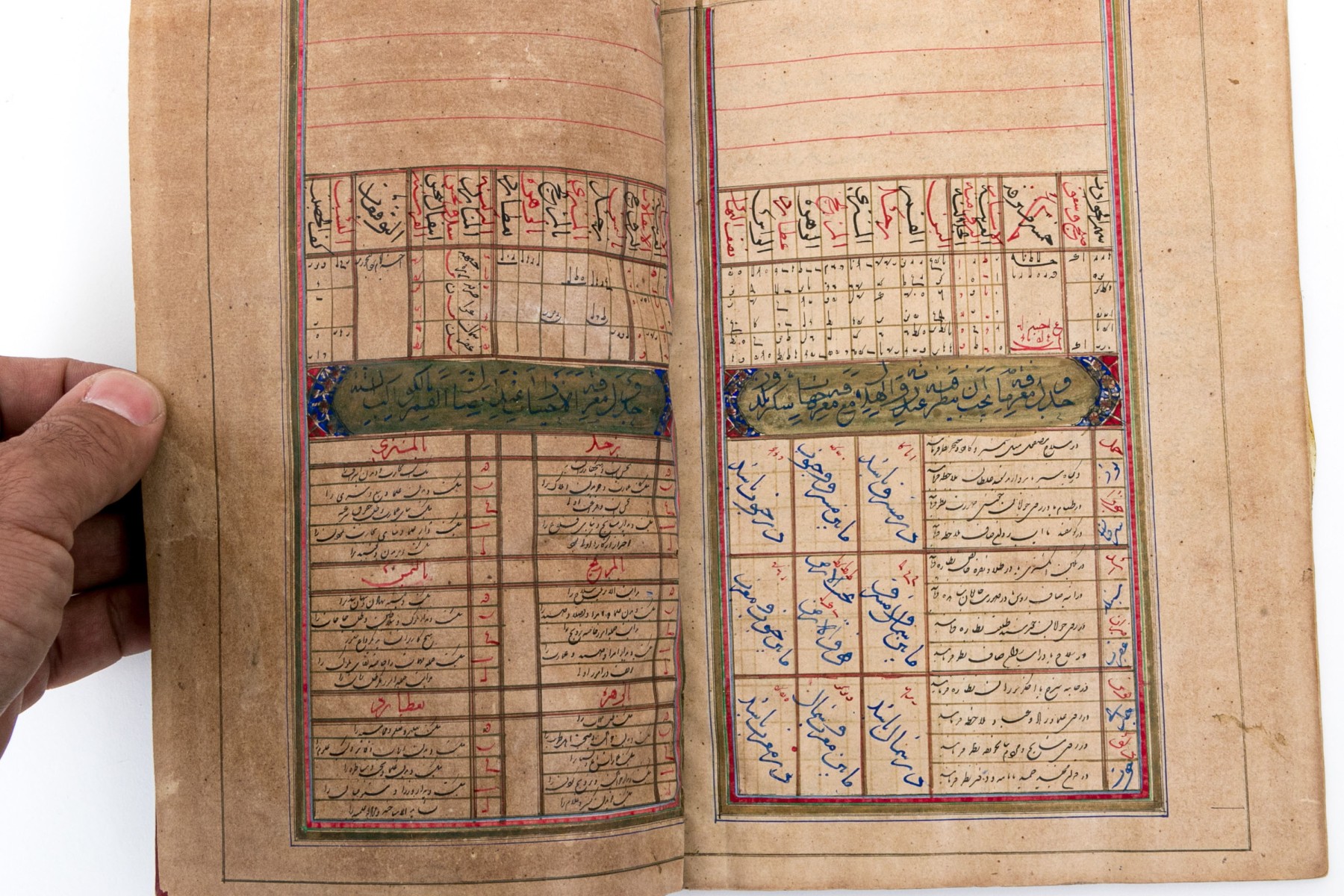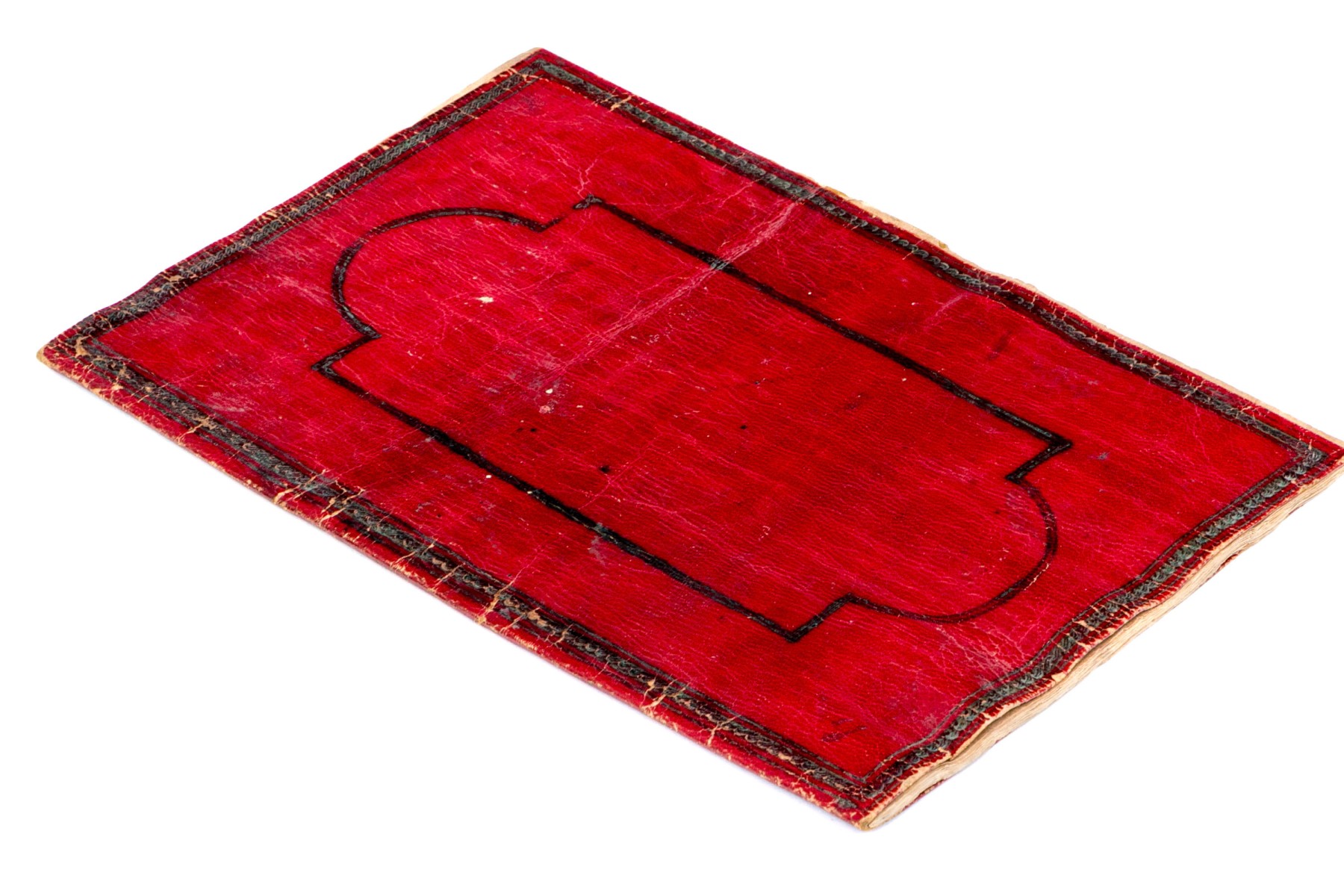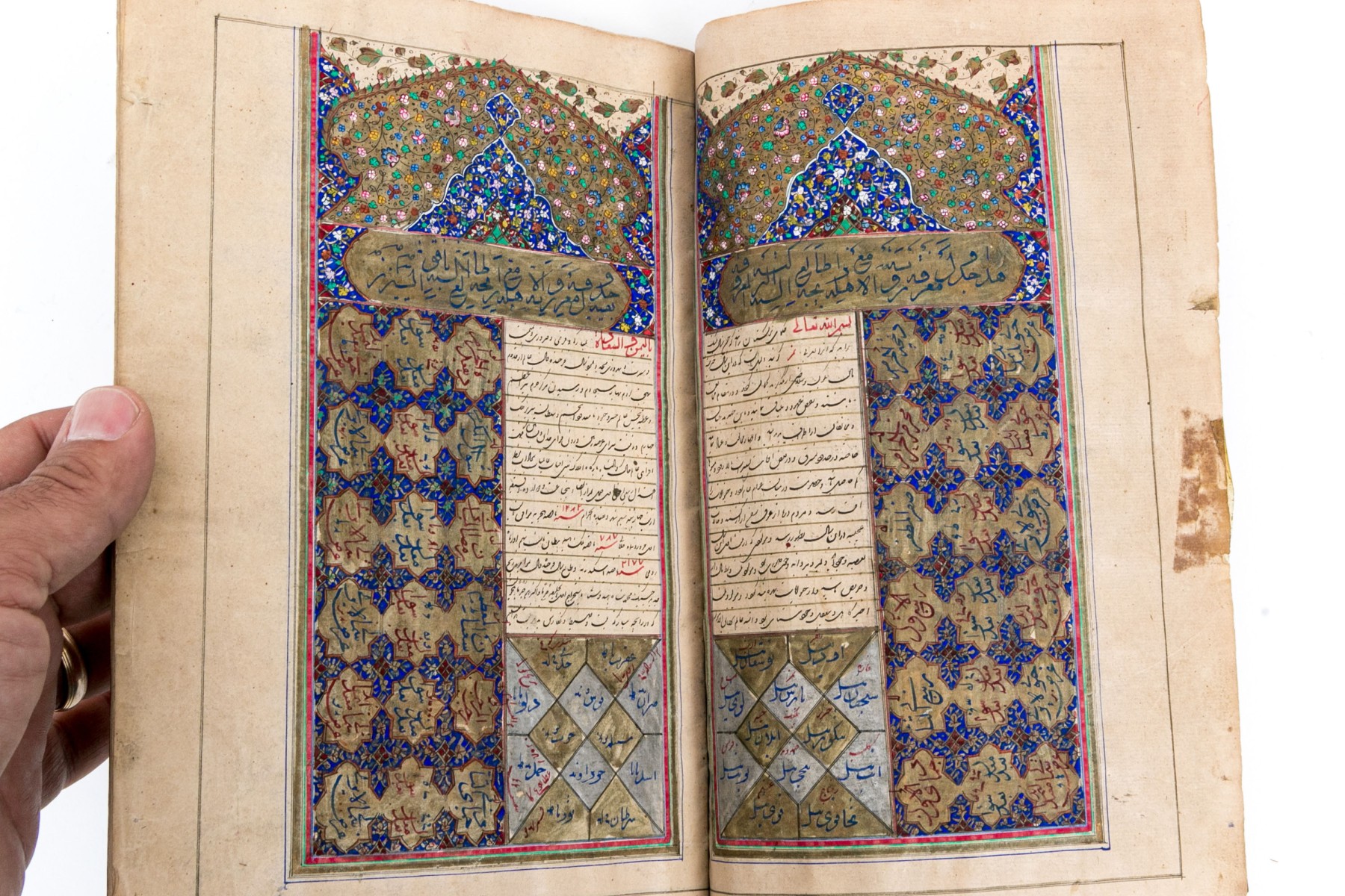 An antique Persian manuscript/ledger consisting of sixteen double-sided parchment pages within a red leather cover. Includes a beautifully illuminated spread with gilt, yellow, blue, pink, green, and red accents.