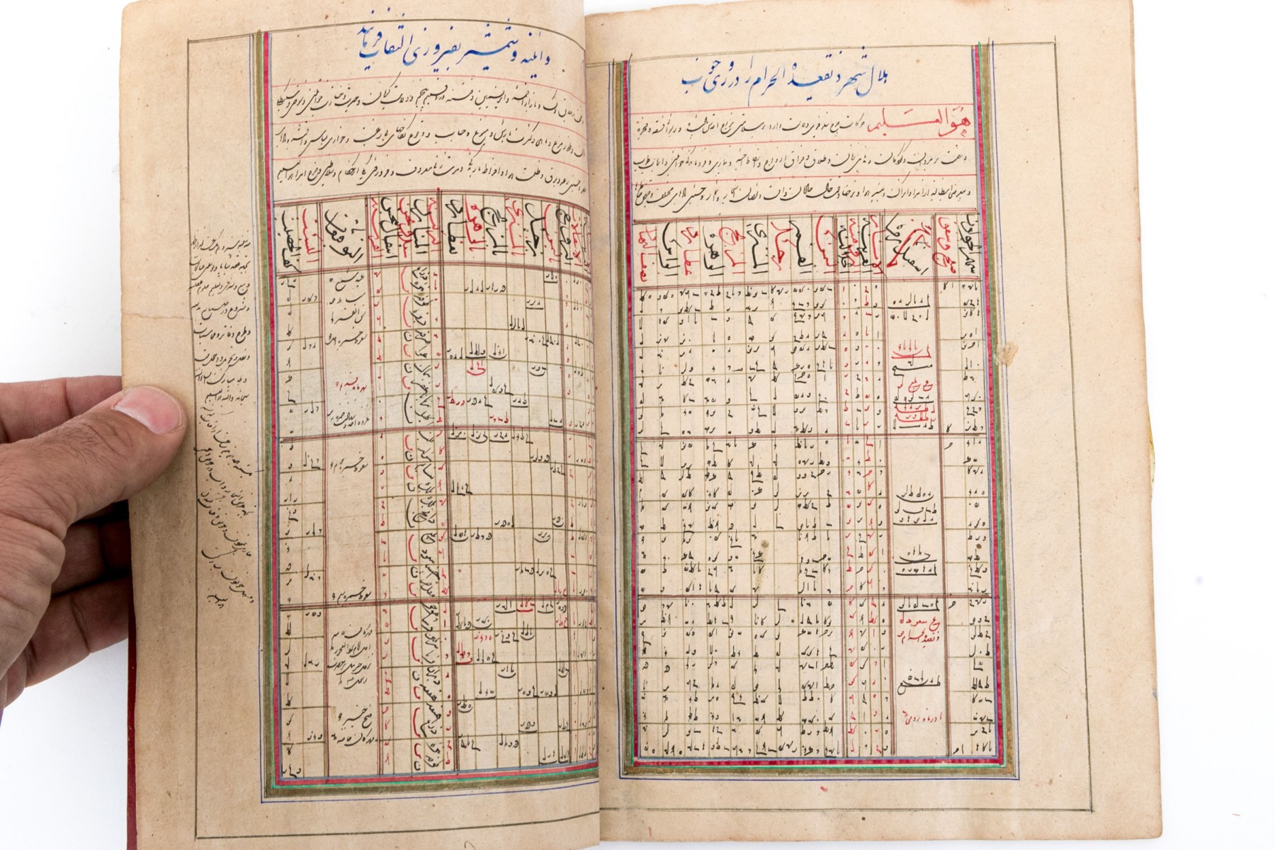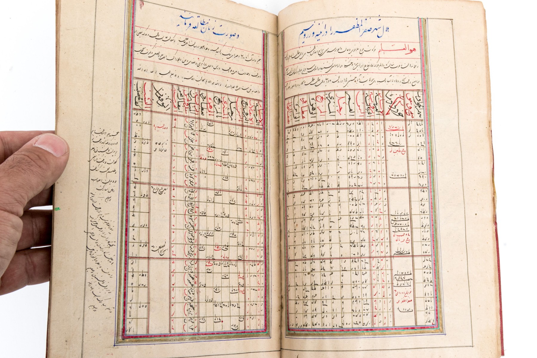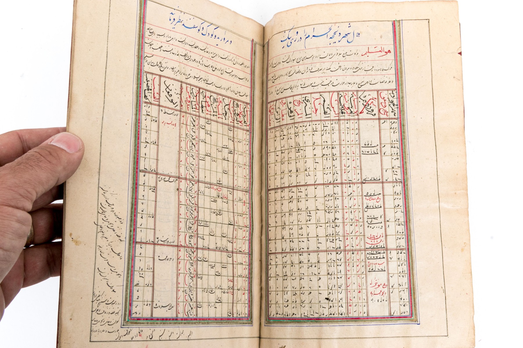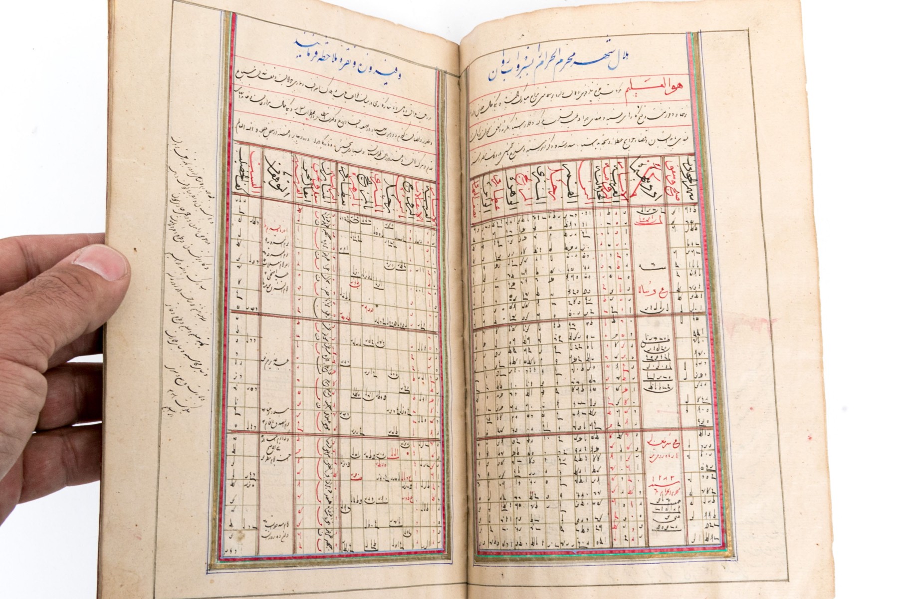 An antique Persian manuscript/ledger consisting of sixteen double-sided parchment pages within a red leather cover. Includes a beautifully illuminated spread with gilt, yellow, blue, pink, green, and red accents.