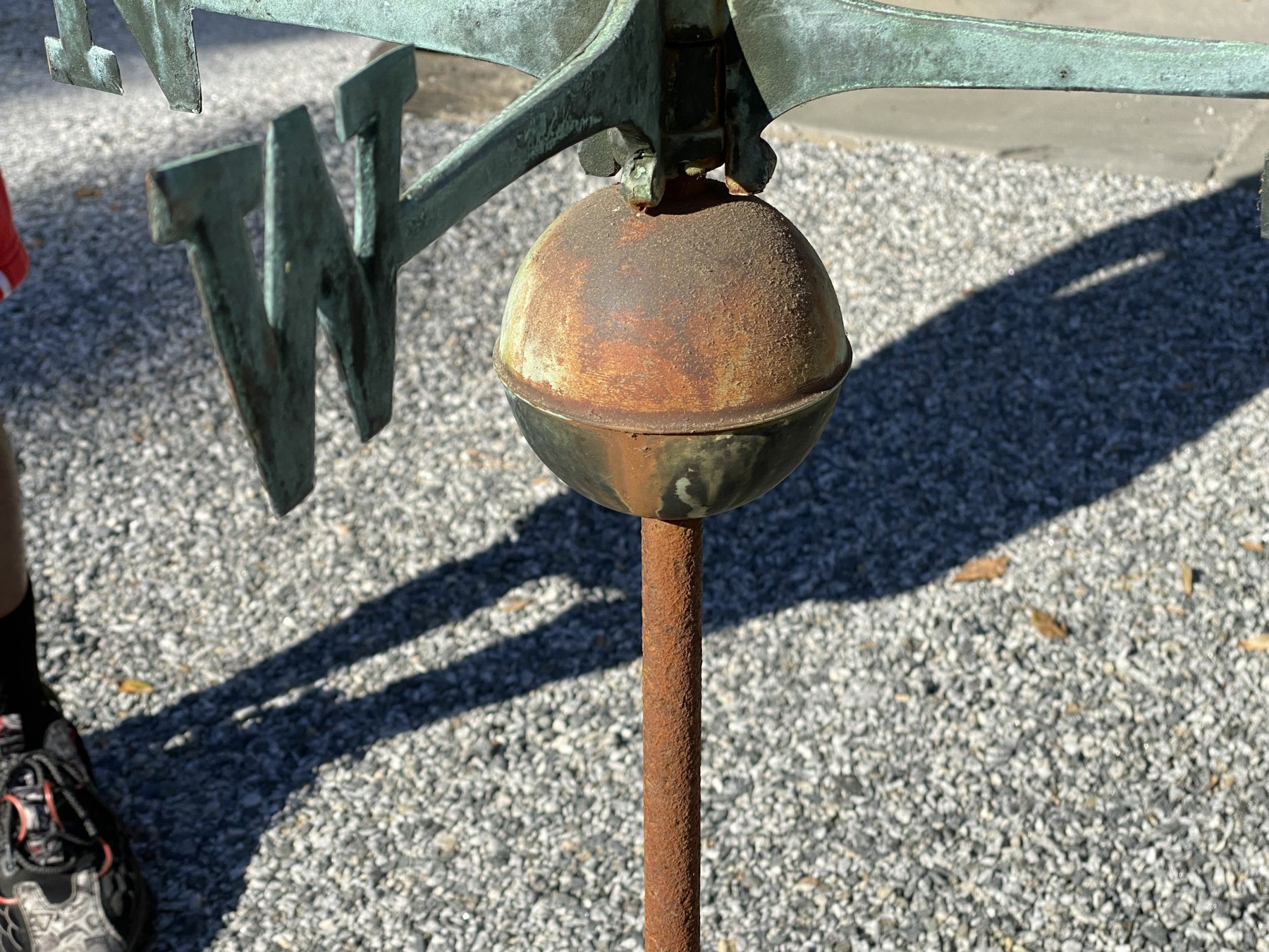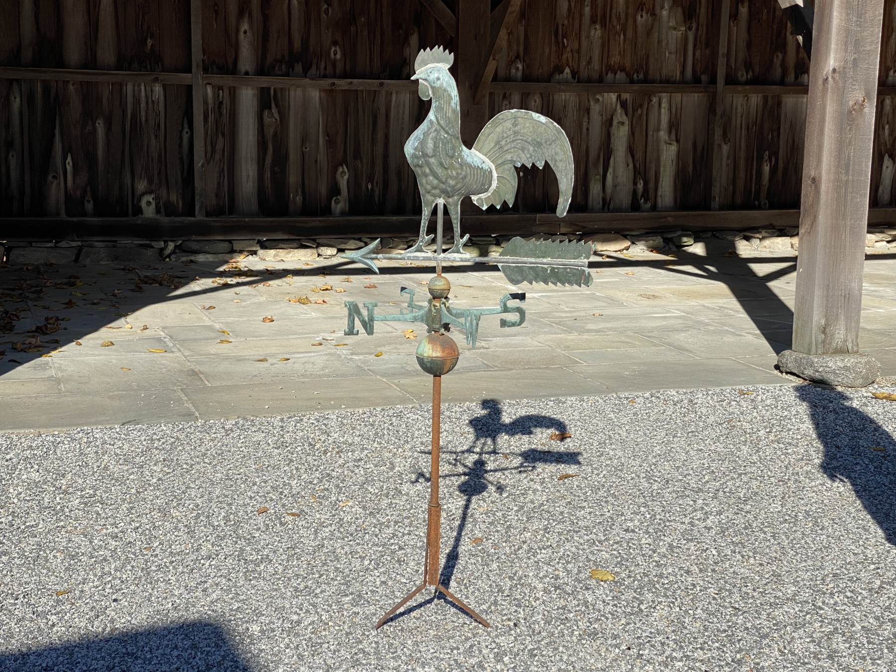 Rooster on an arrow top, above North and South directions on top of an iron pedestal.