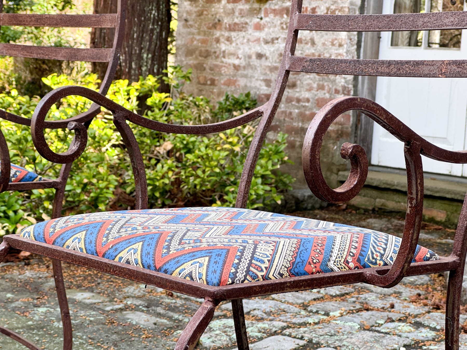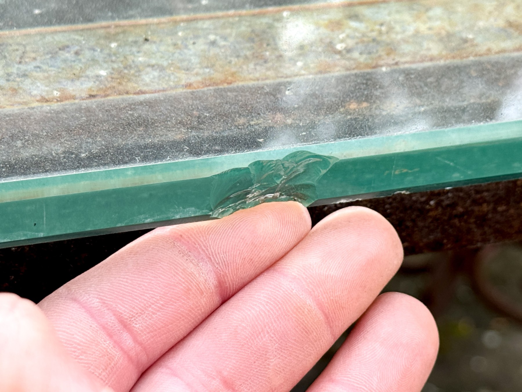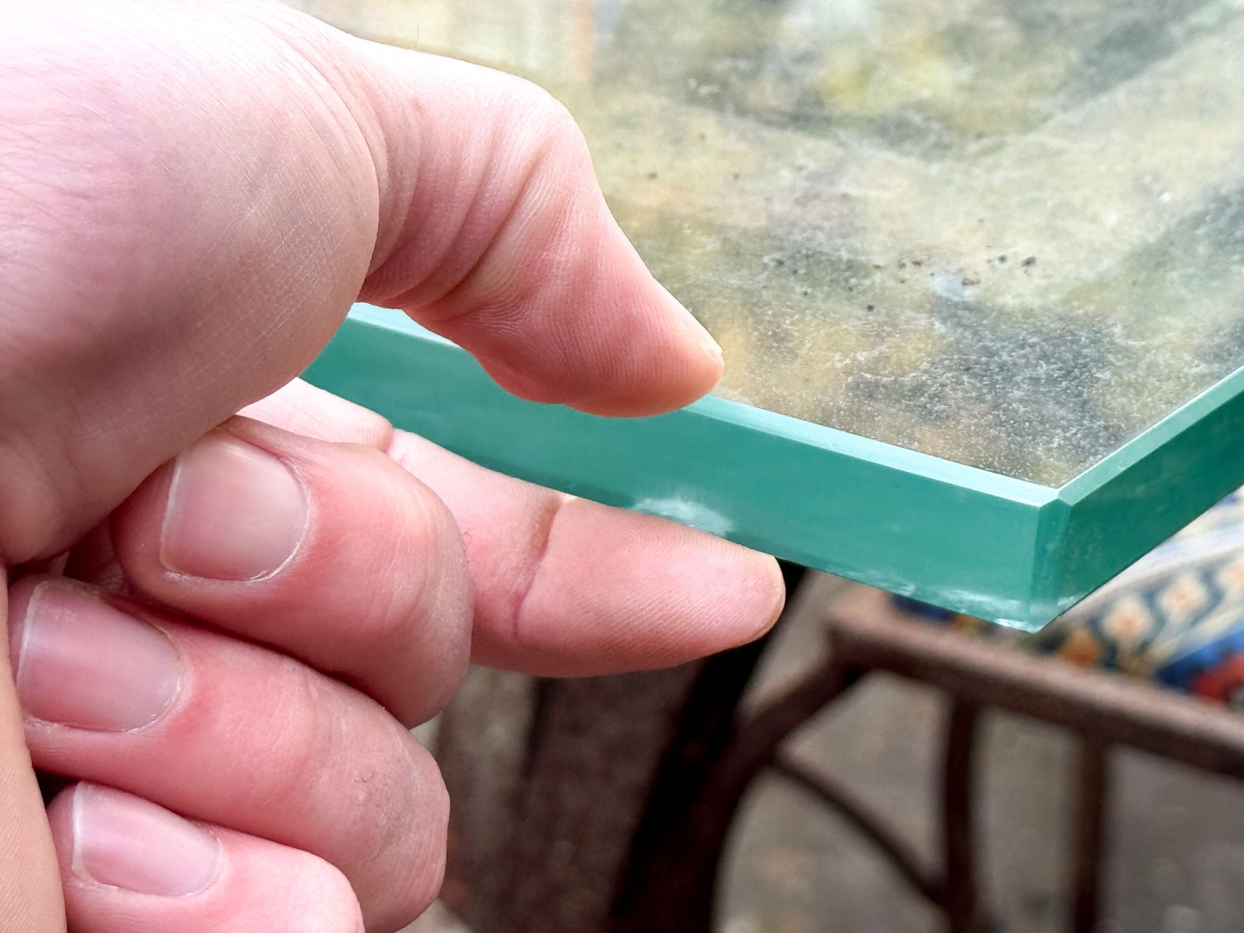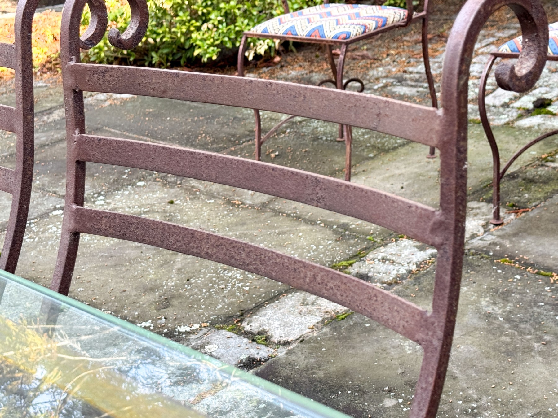 Oxidized and wear to the iron frame finish. The glass top with a large chip to one end.