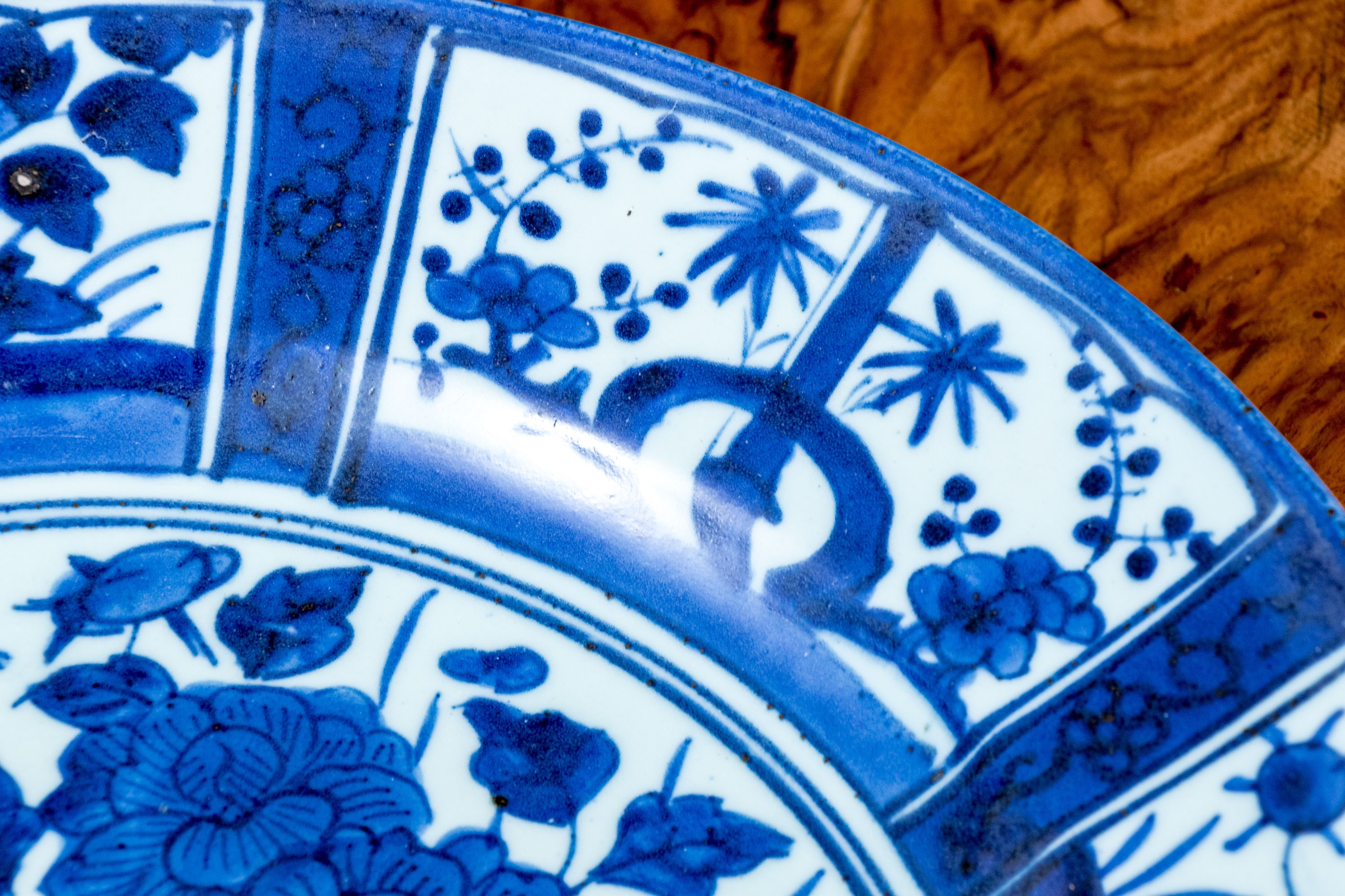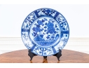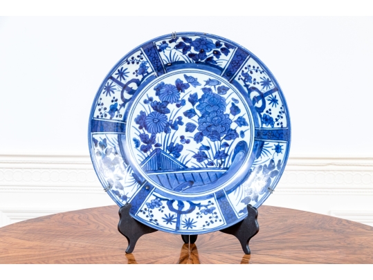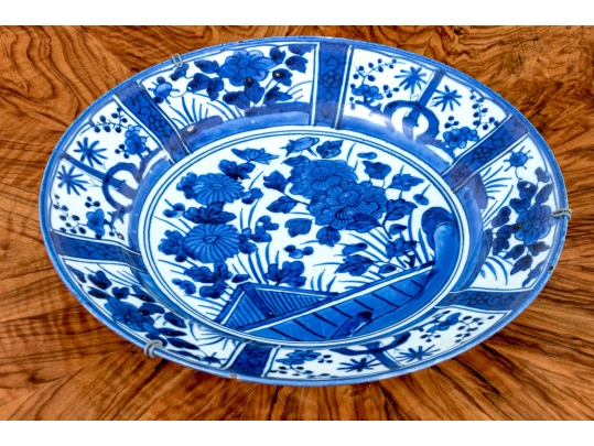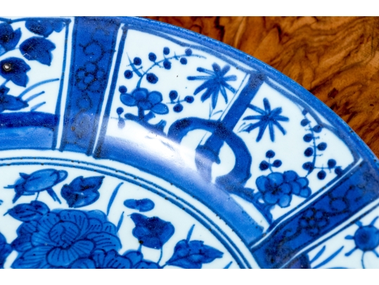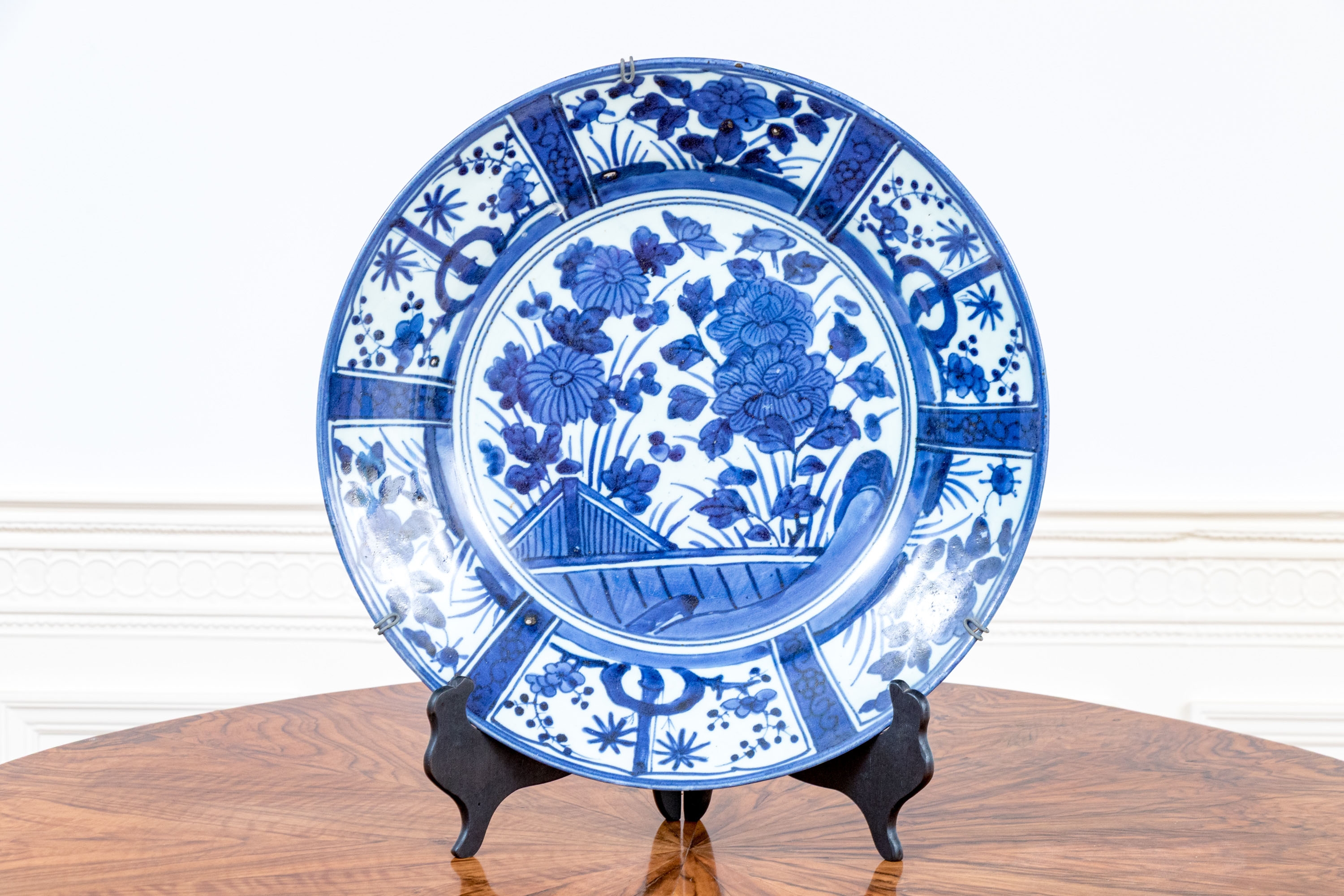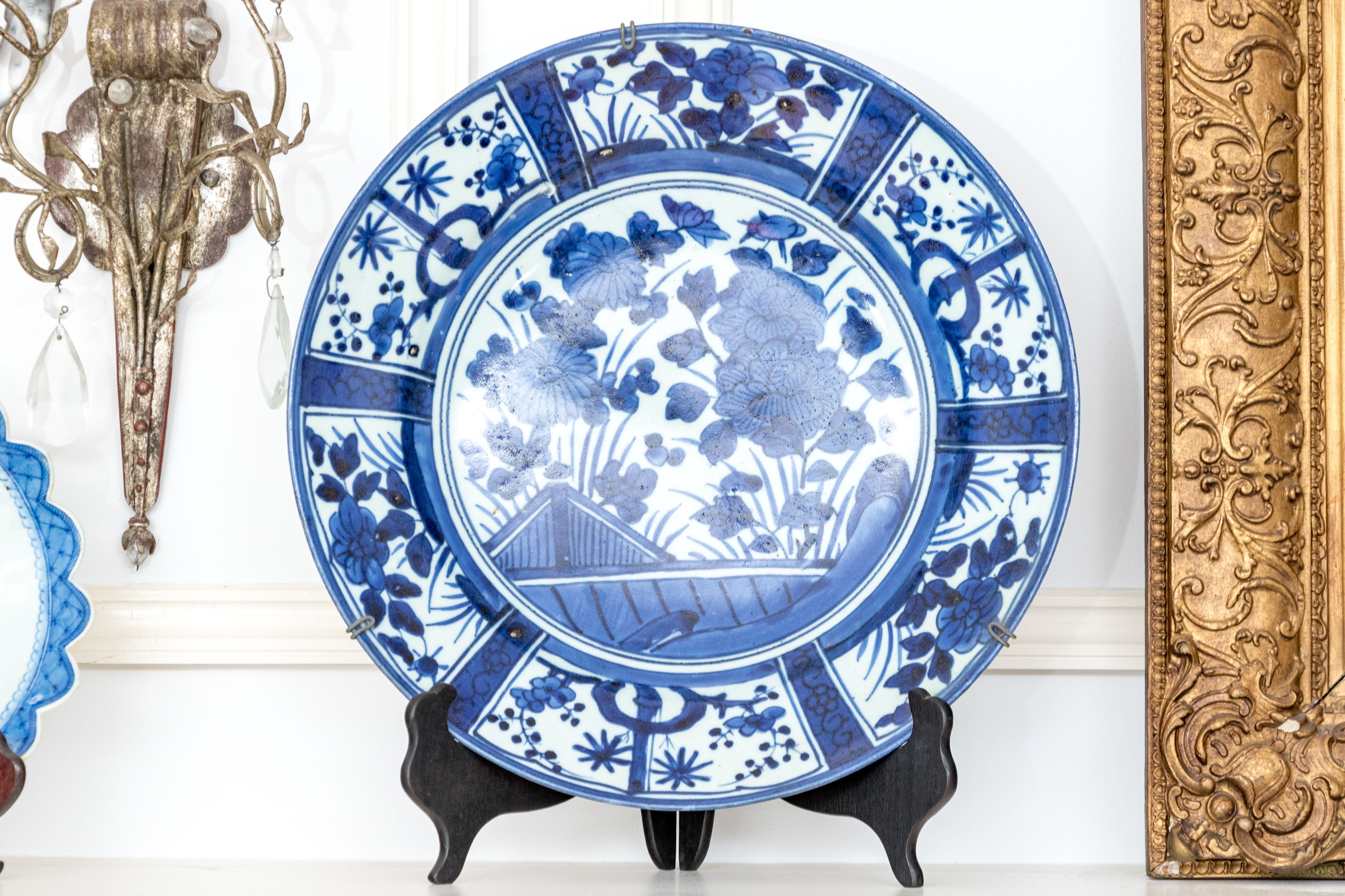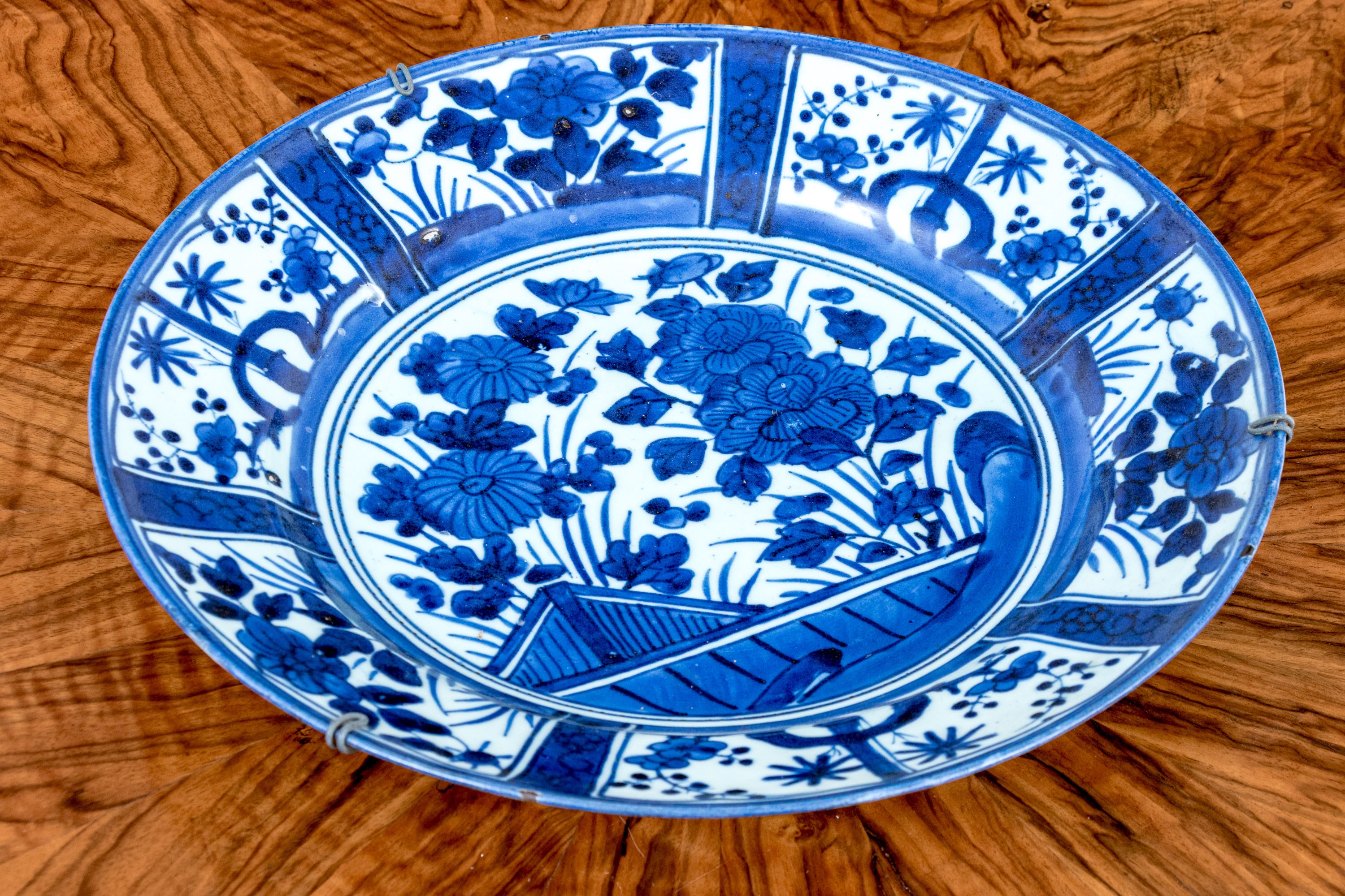 Antique Japanese export blue and white Kraak Arita charger. The rim divided into six alternating and repetitive panels containing peony with sprouting grasses or bamboo. The center with floral reserve.