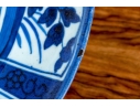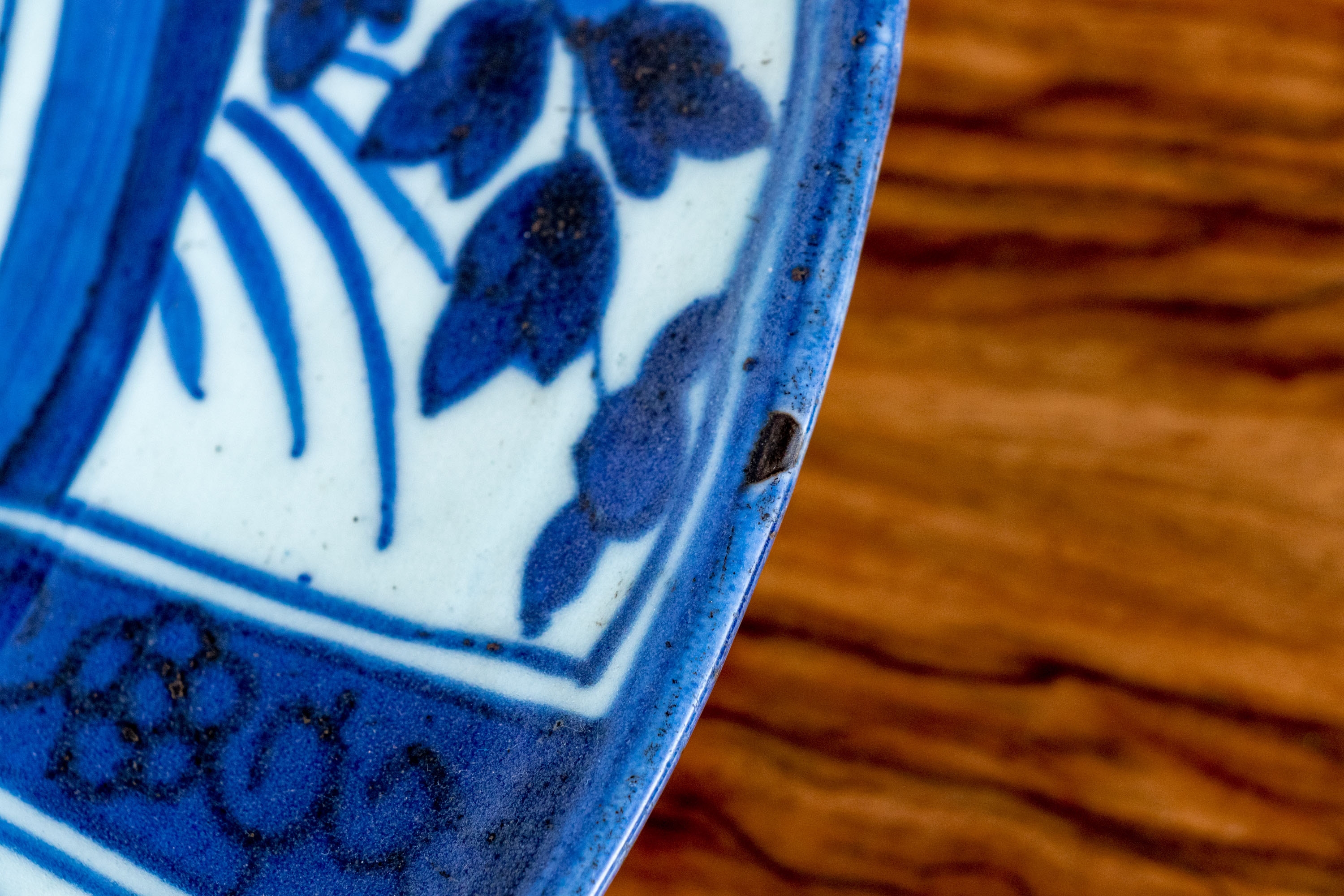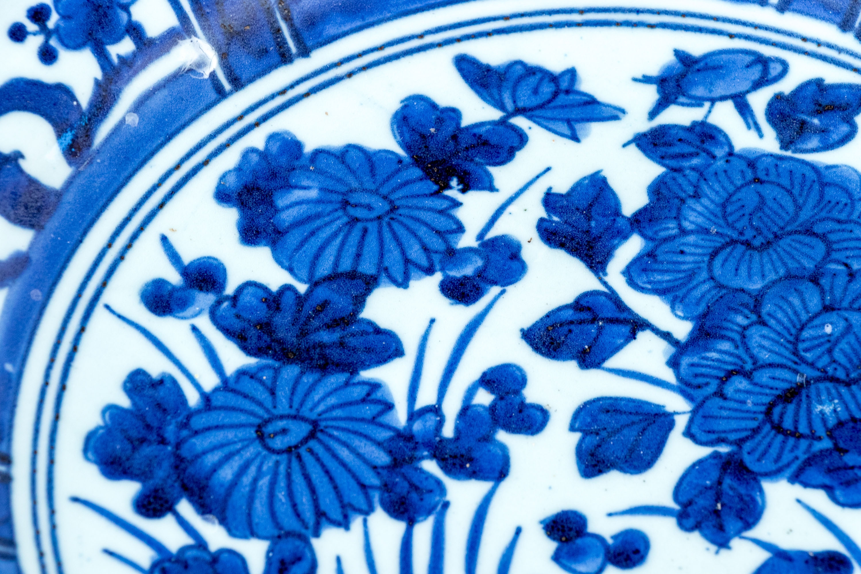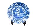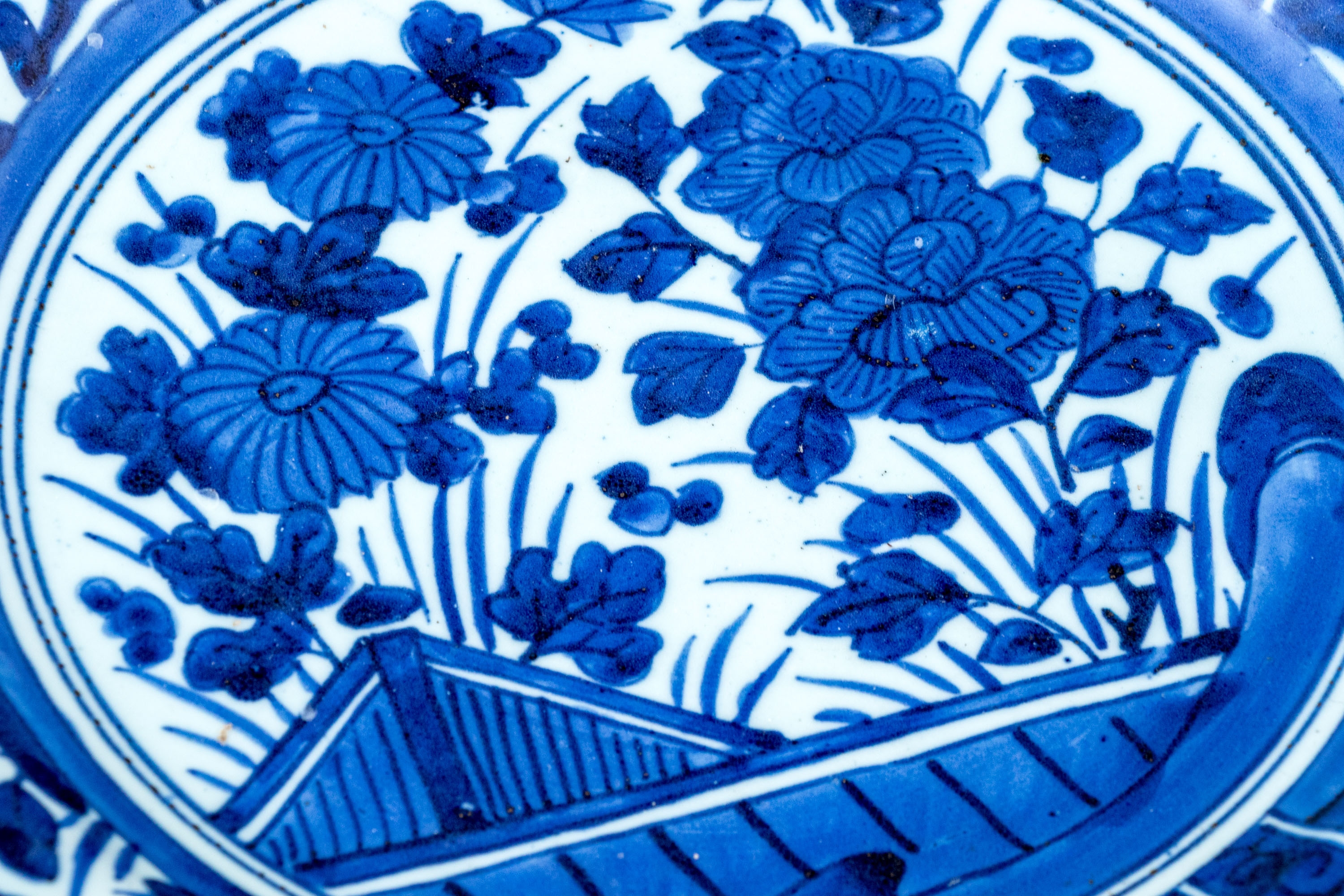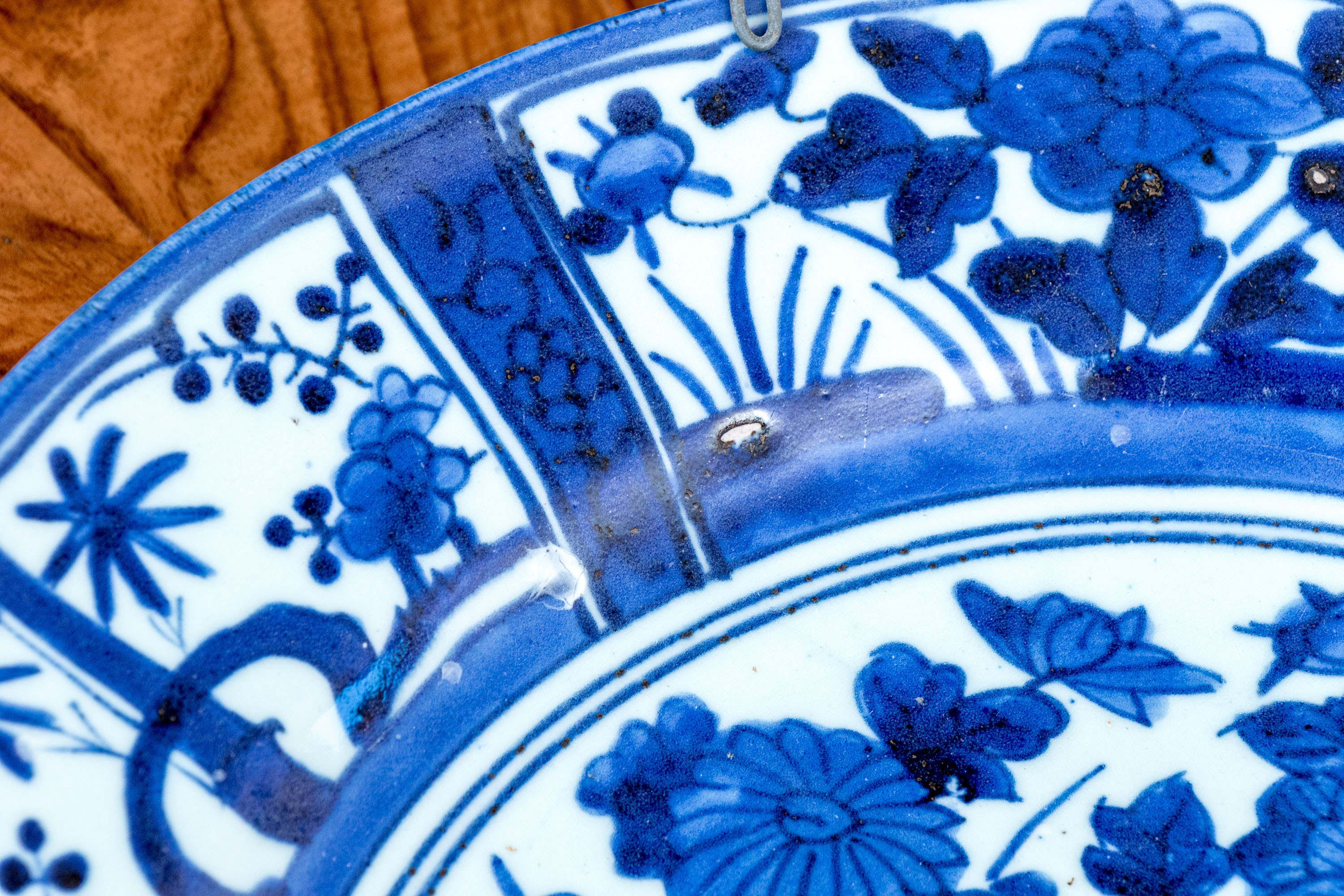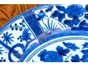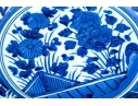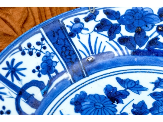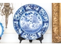 Antique Japanese export blue and white Kraak Arita charger. The rim divided into six alternating and repetitive panels containing peony with sprouting grasses or bamboo. The center with floral reserve.