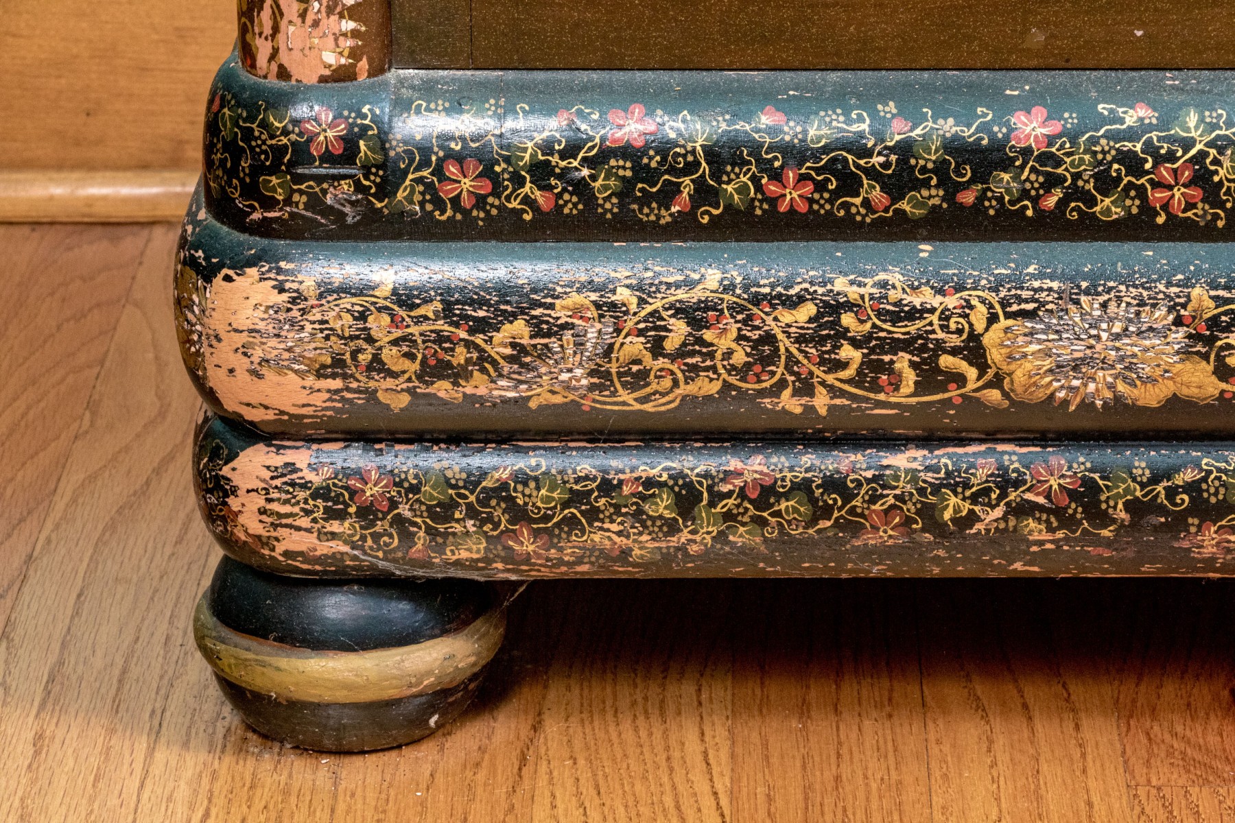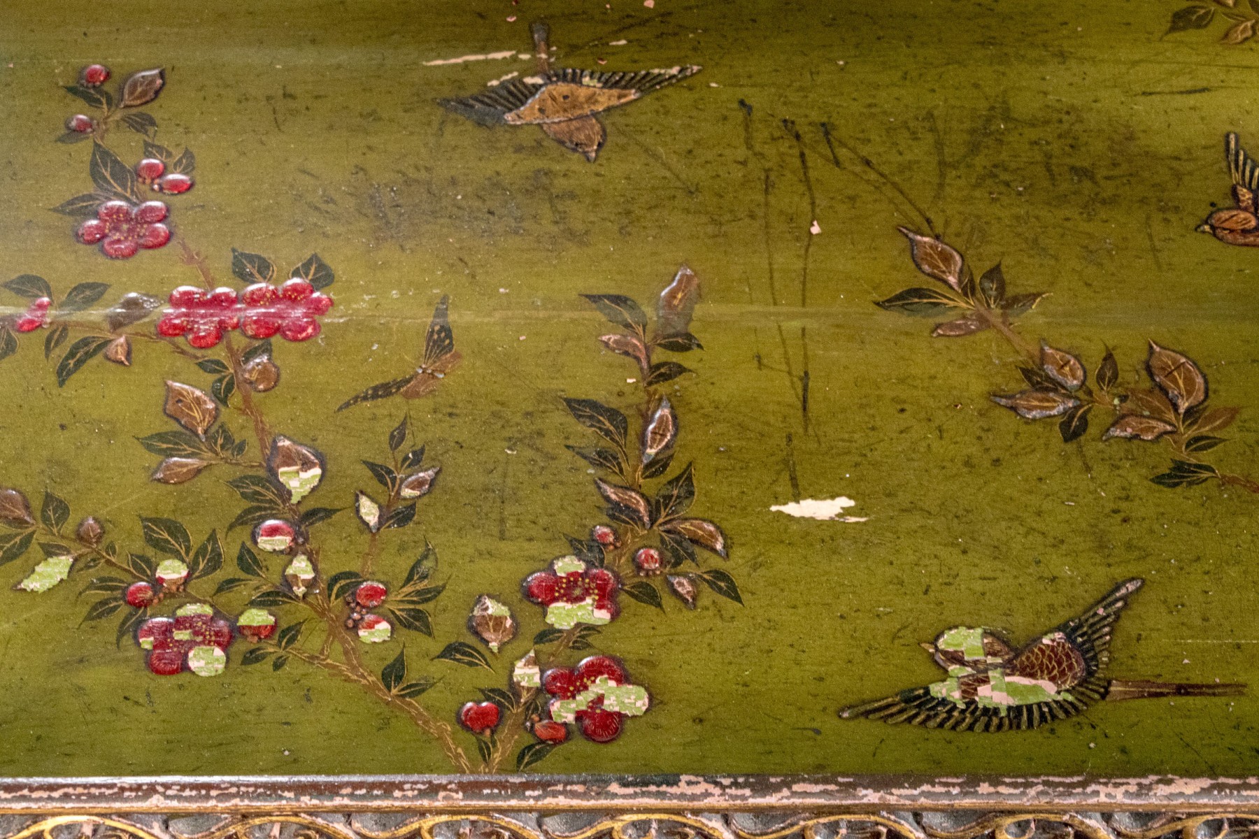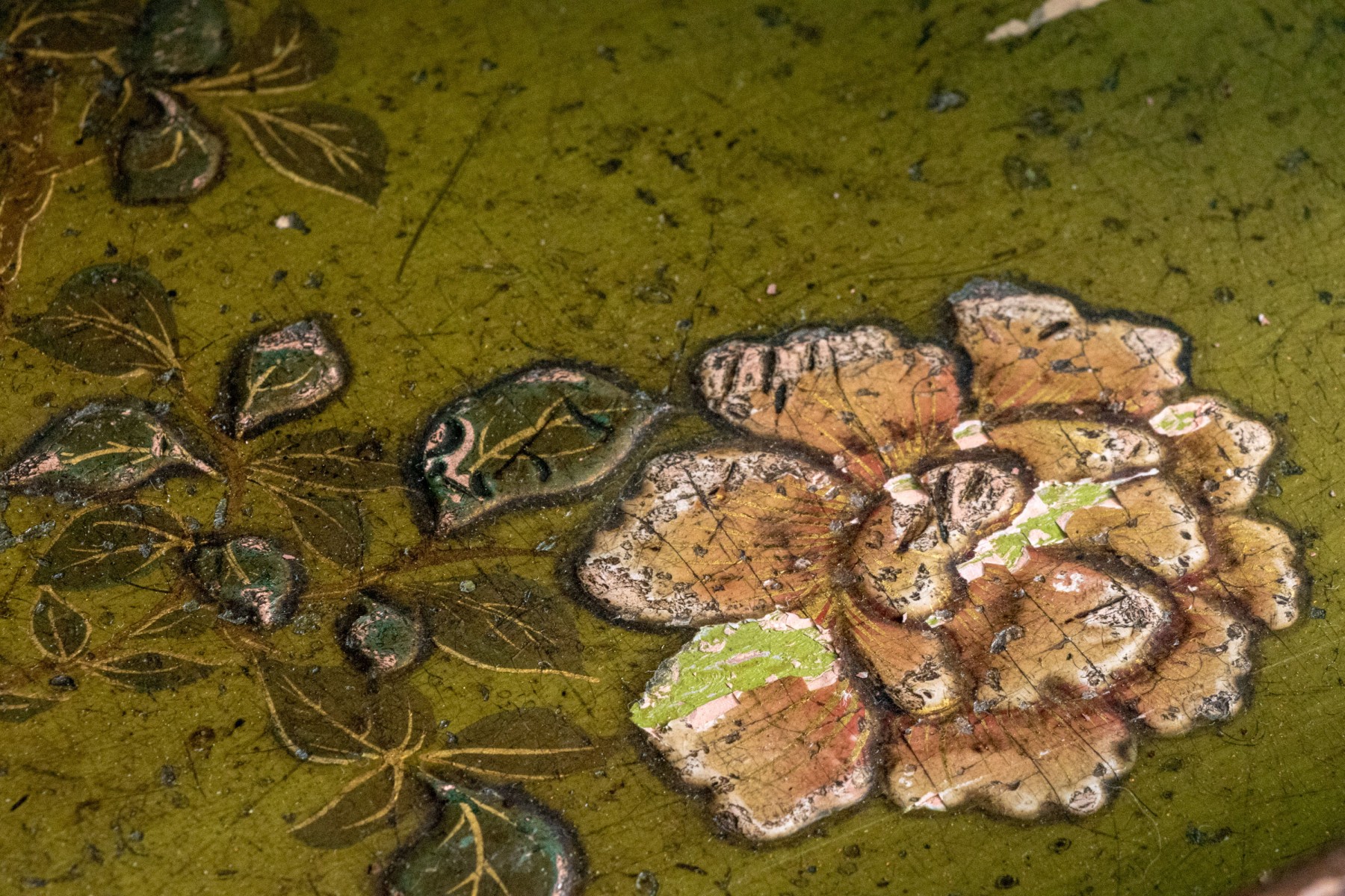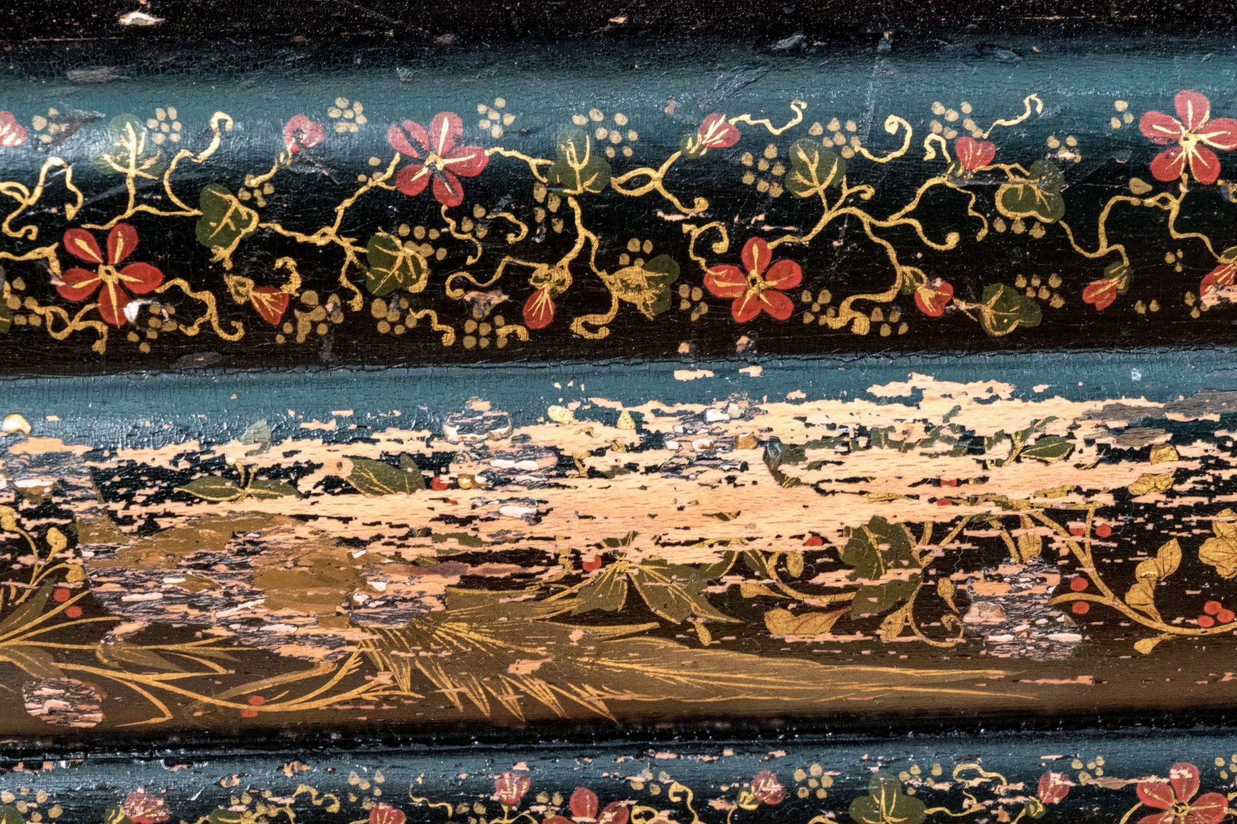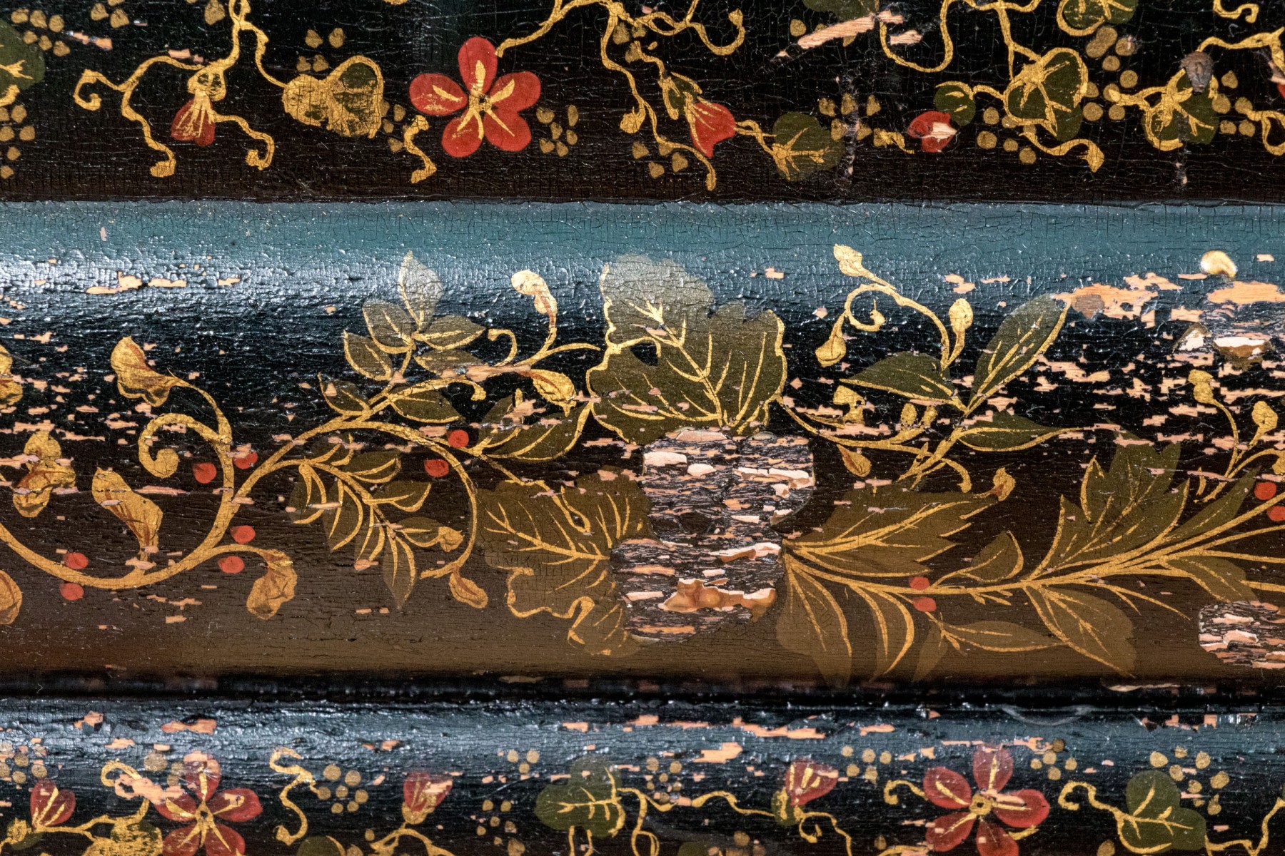 The frame is gently rounded, lacquered black and painted with floral motifs.