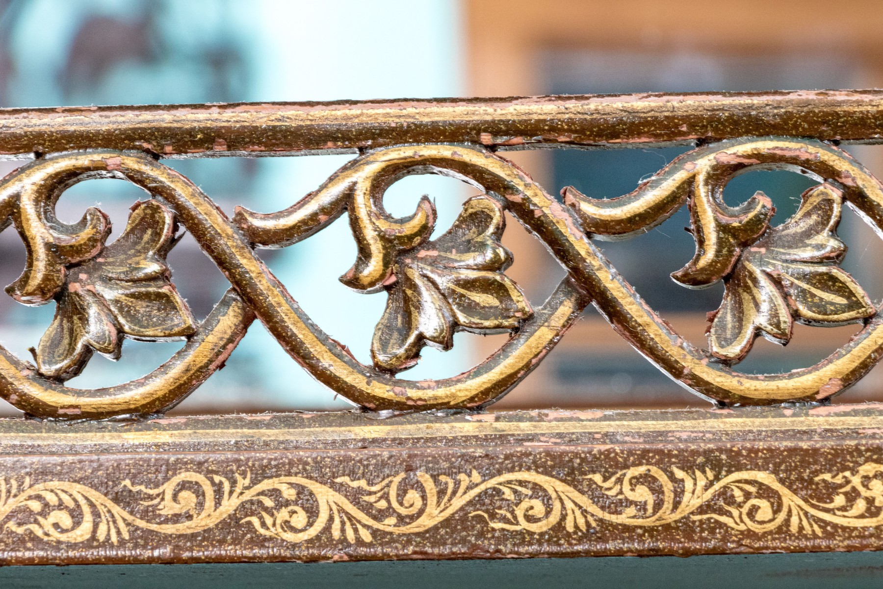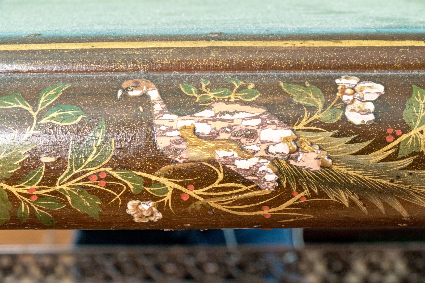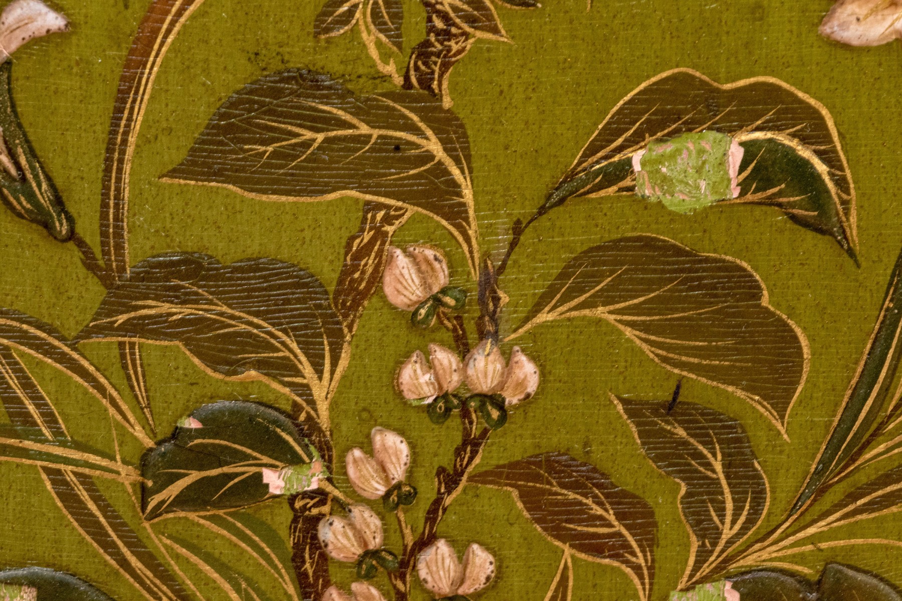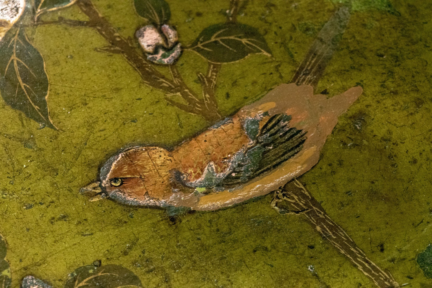 The frame is gently rounded, lacquered black and painted with floral motifs.