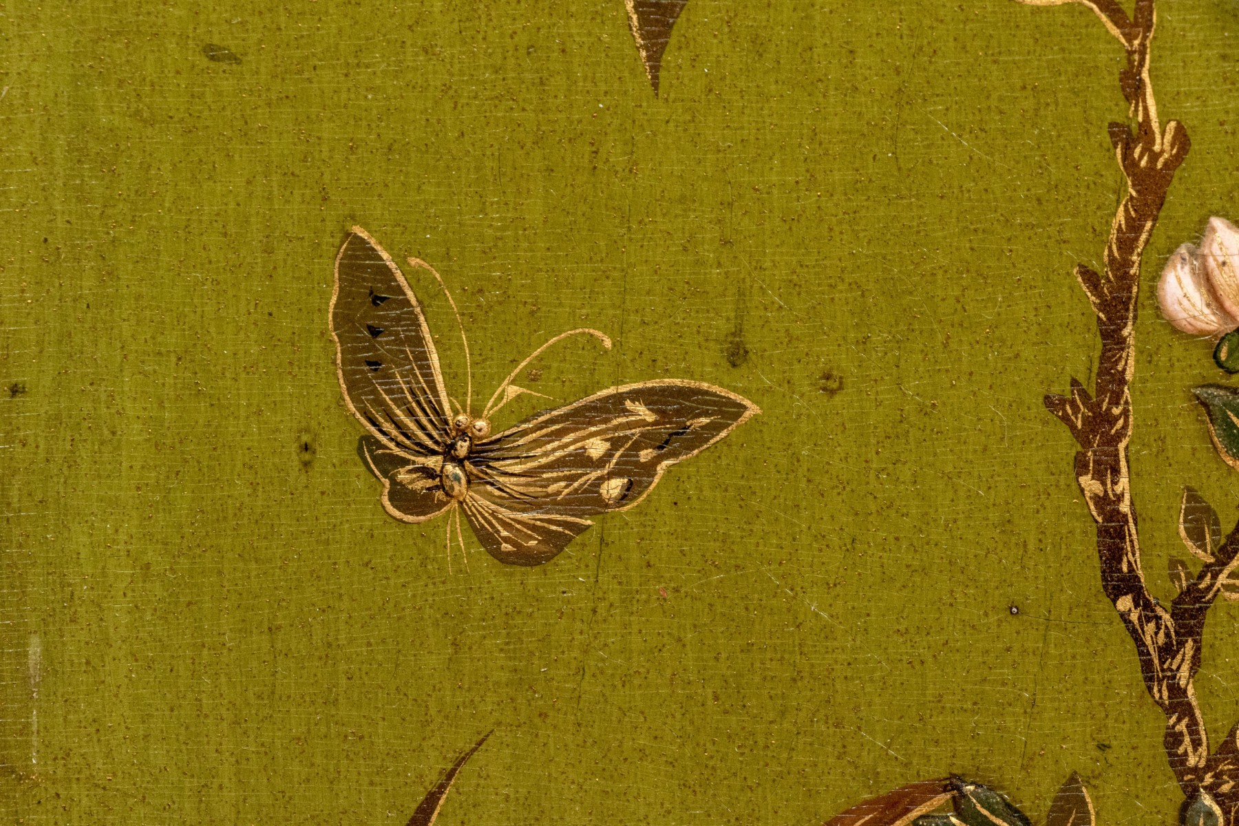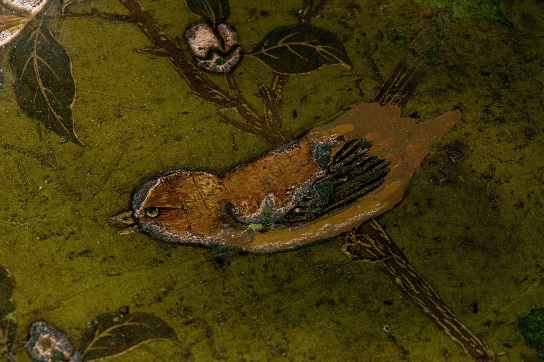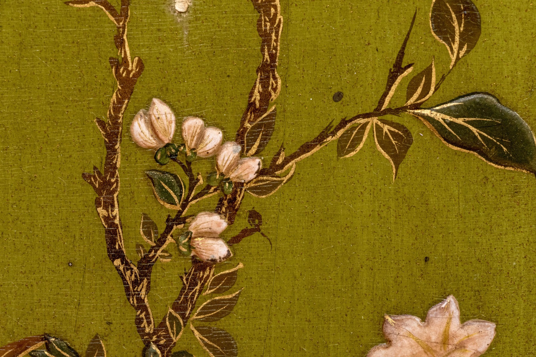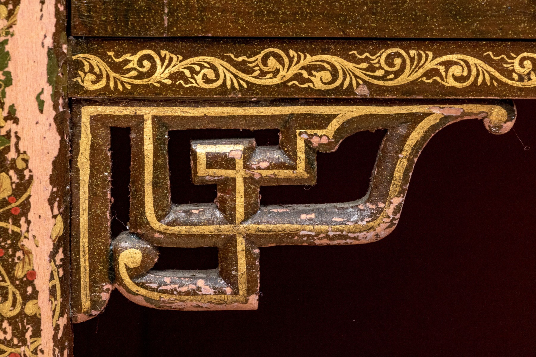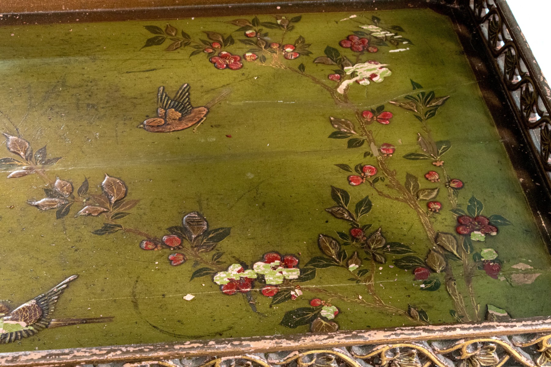 The frame is gently rounded, lacquered black and painted with floral motifs.