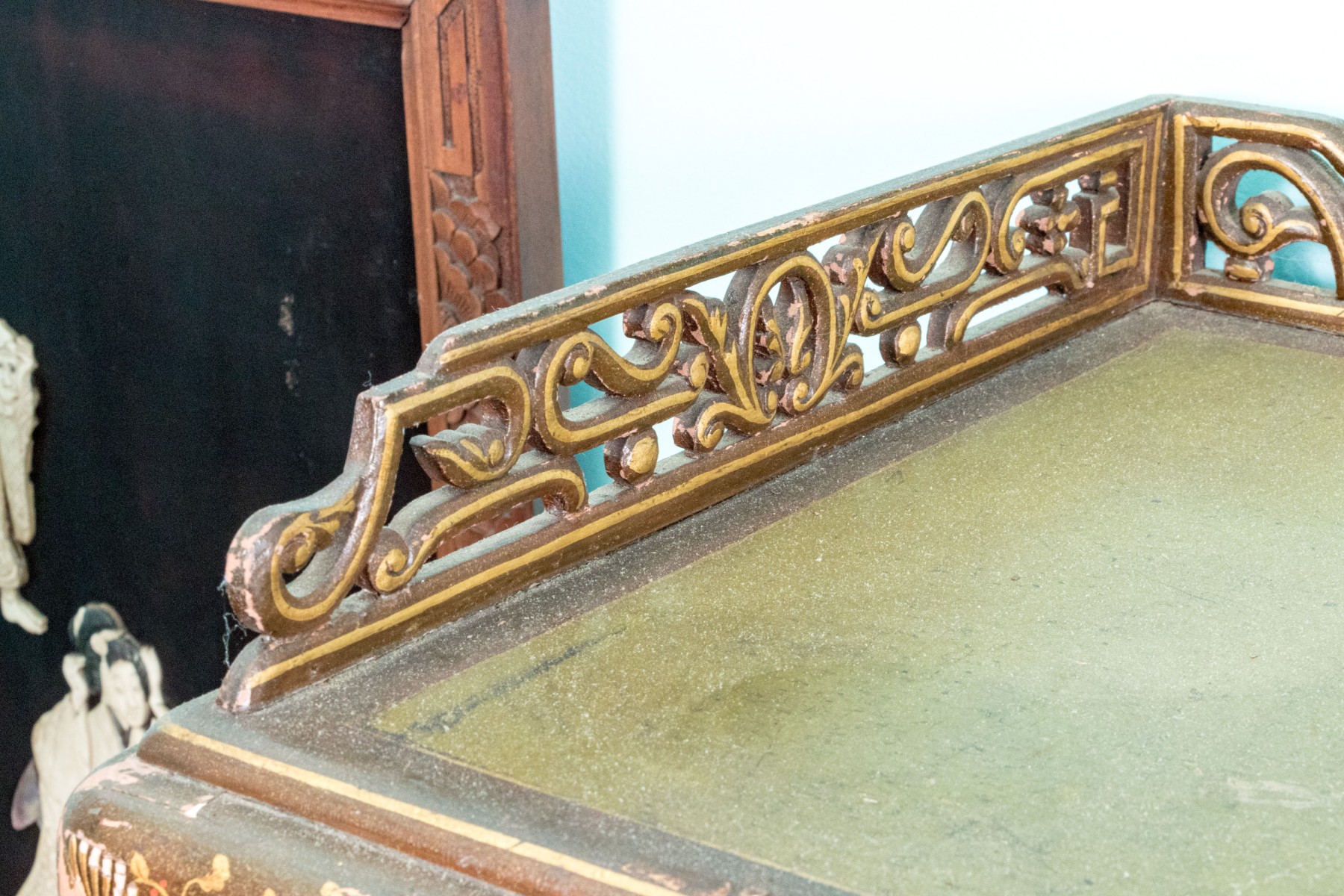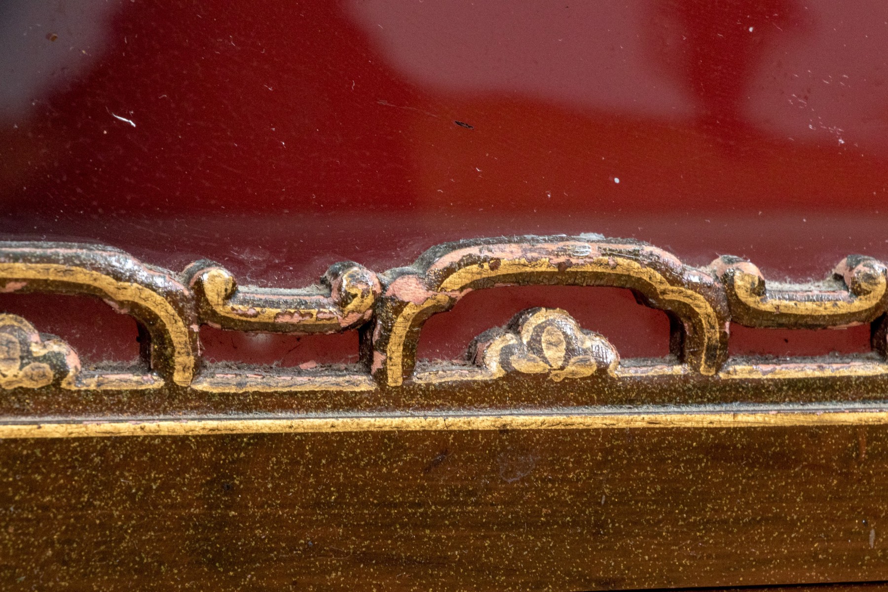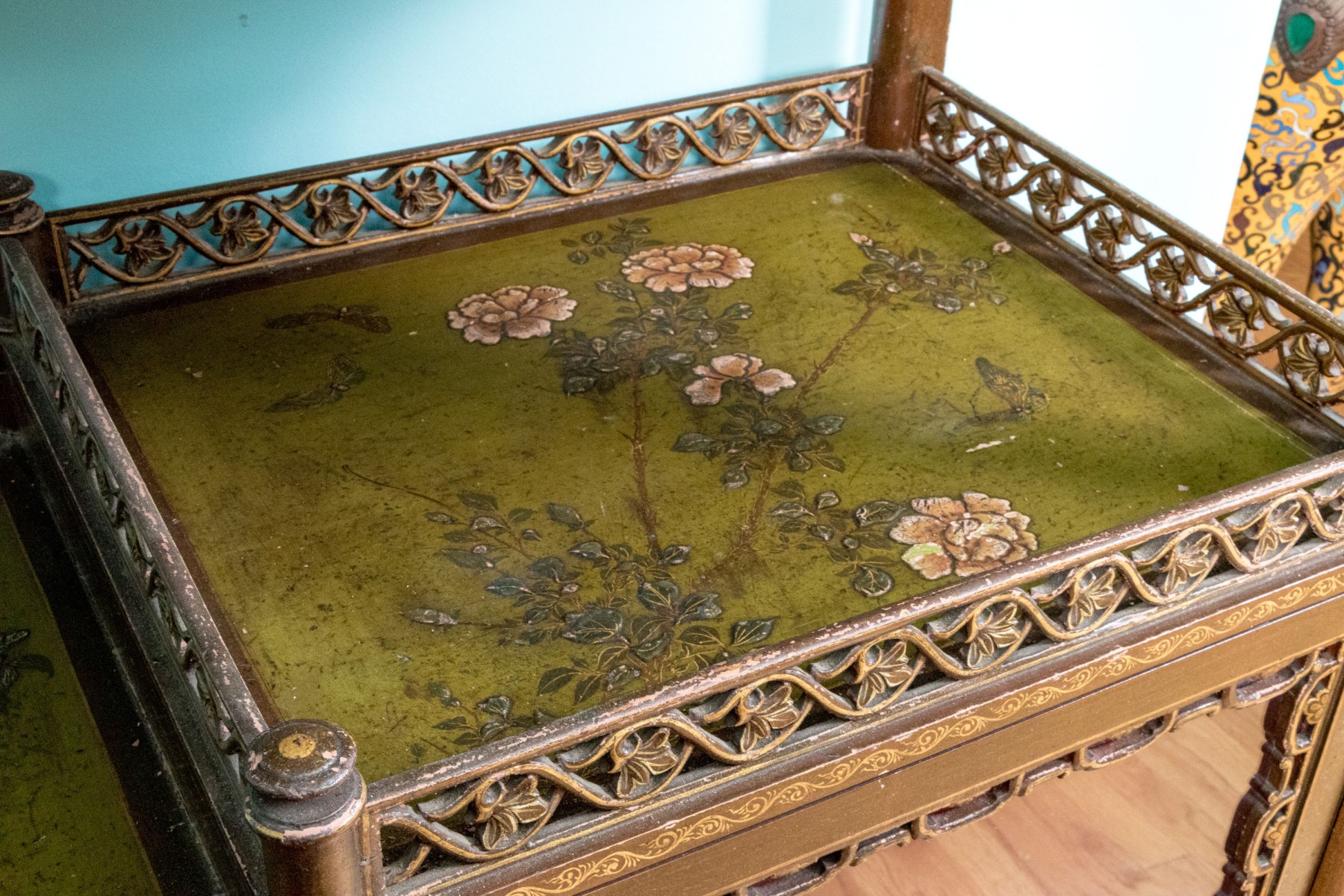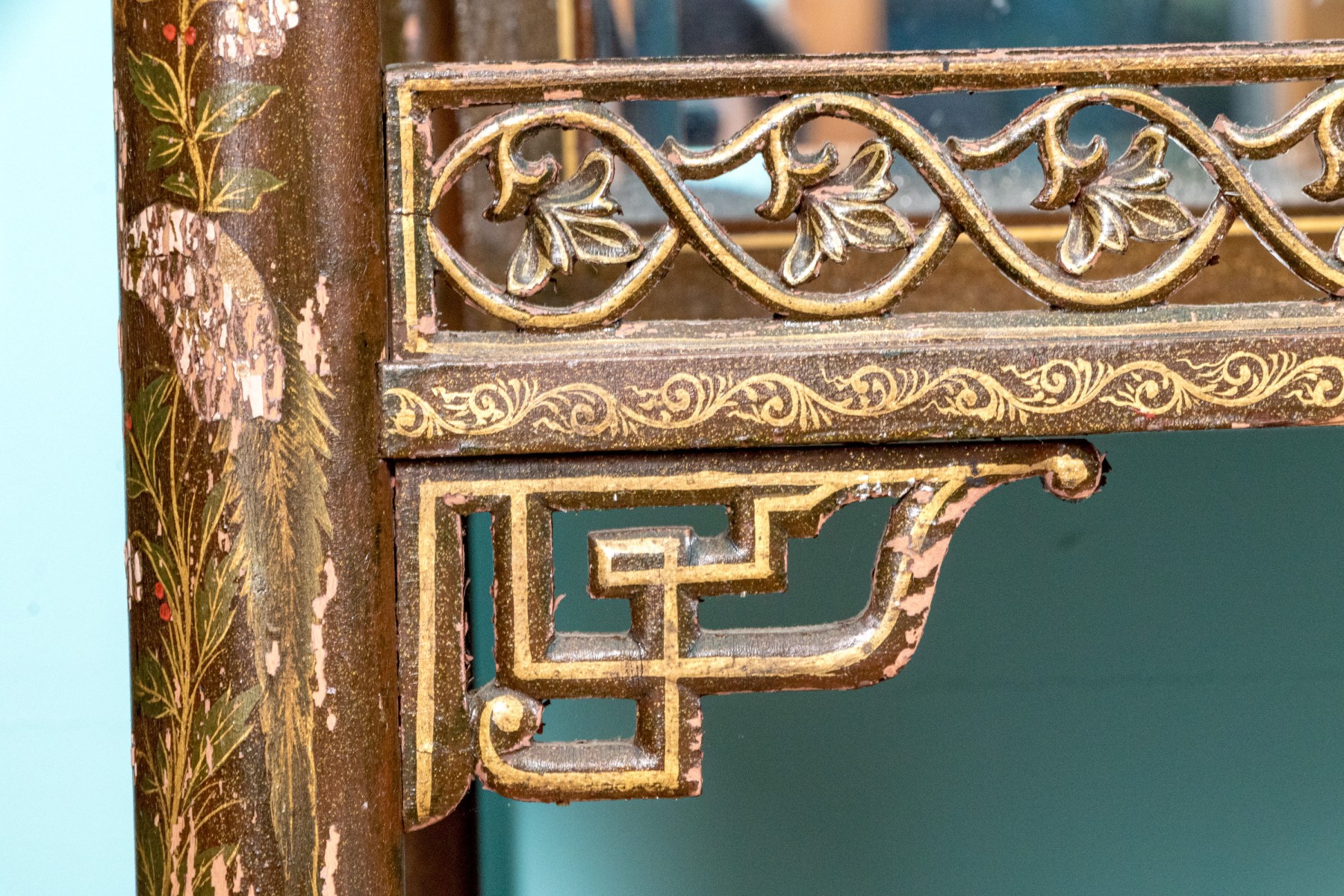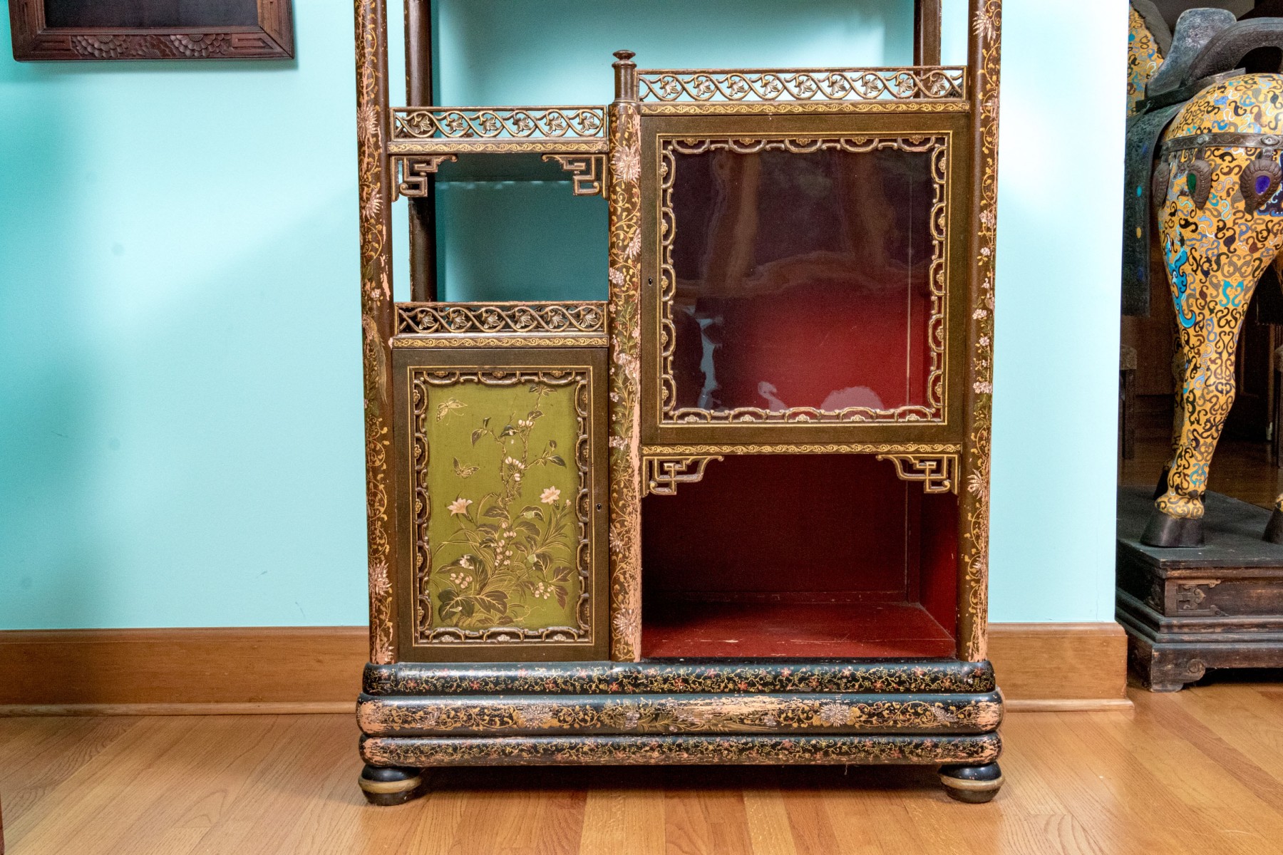 An impressive 19th century Japanese curio stand featuring a top shelf with a mirror backing along the top, and an attractive asymmetrical arrangement of tiered shelves and cabinets in red and chartreuse green with lacquered, pierced galleries. A cabinet along the center is enclosed with a glass door.