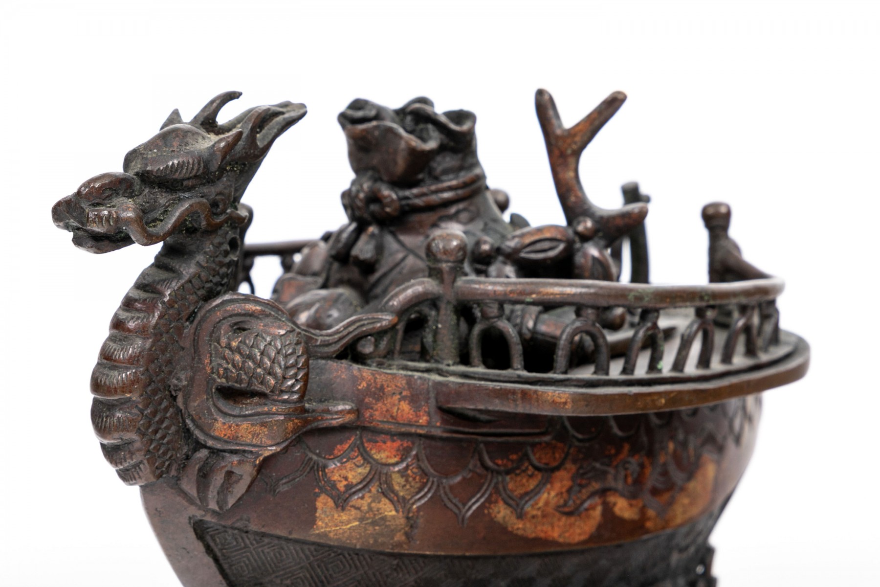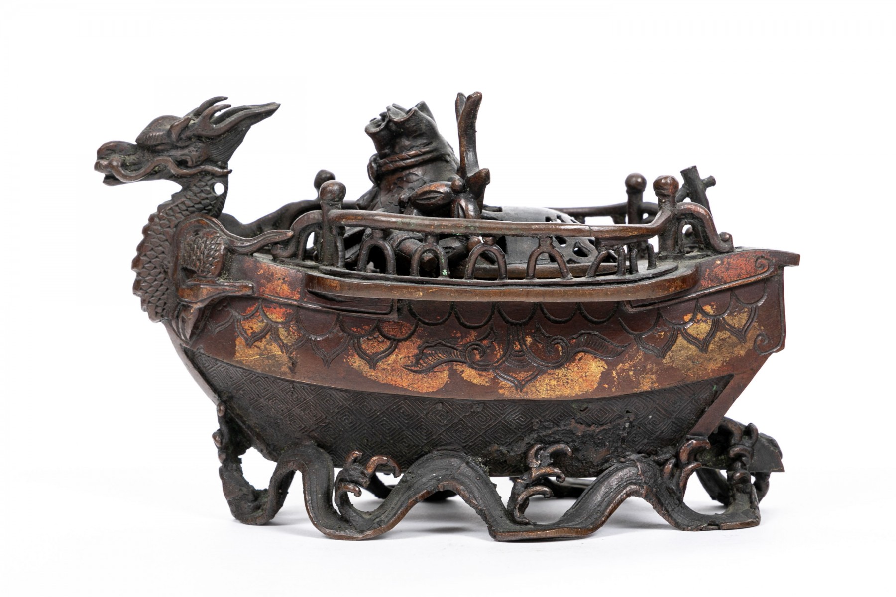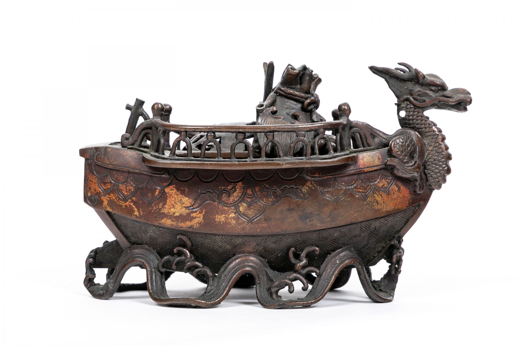 The censer is in the form of a treasure ship with fabulously cast dragon head off the bow of the ship. The ship in quatrefoil form and is elevated on wave form foot.