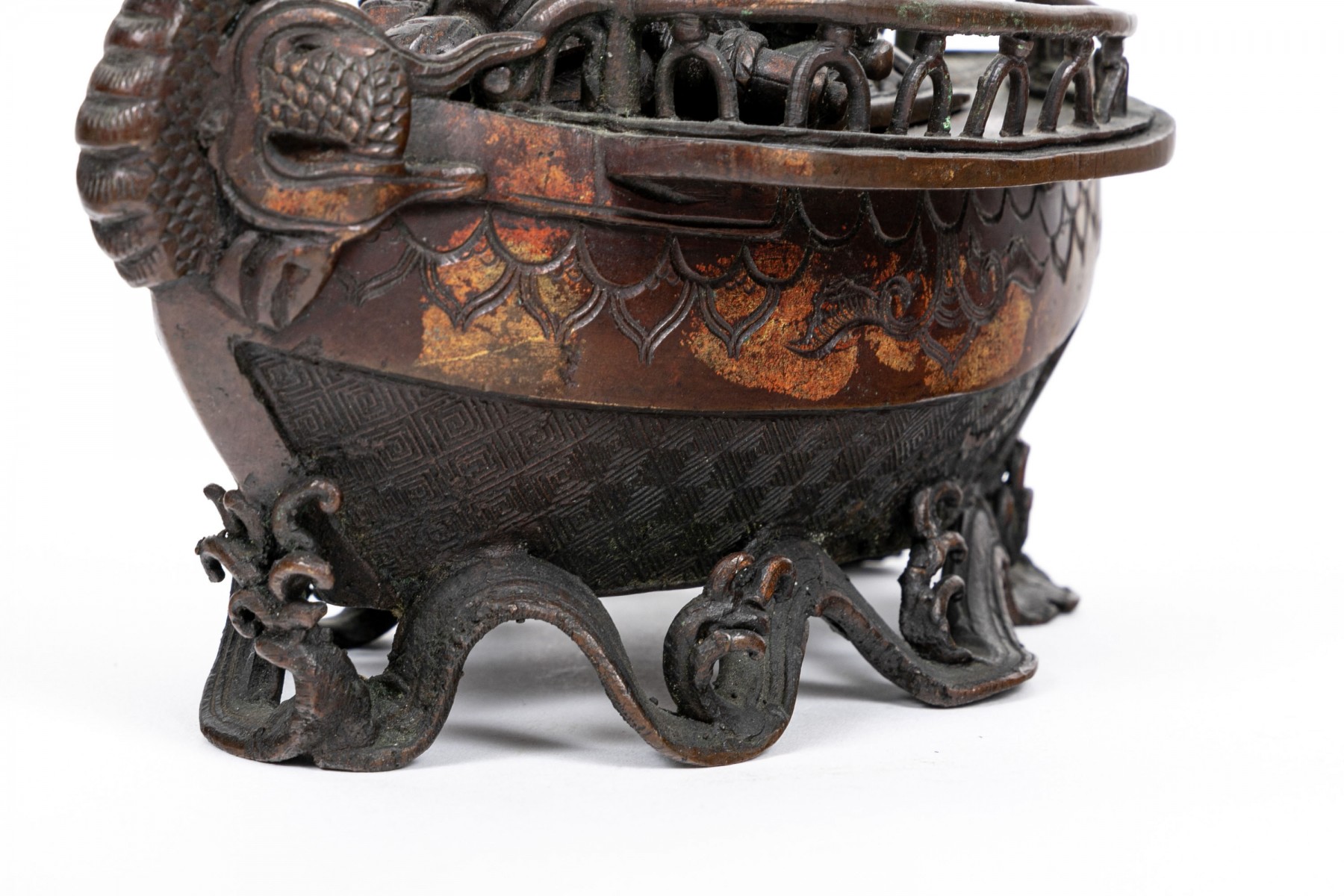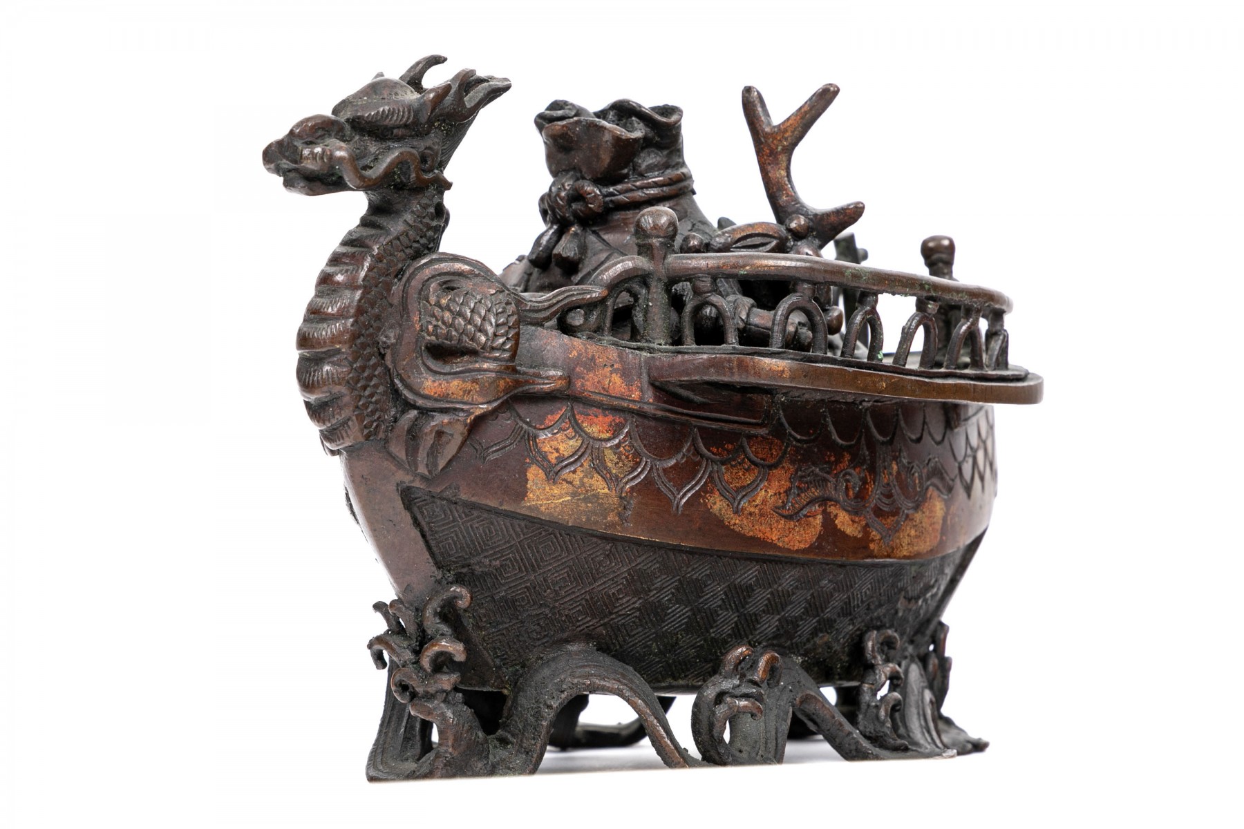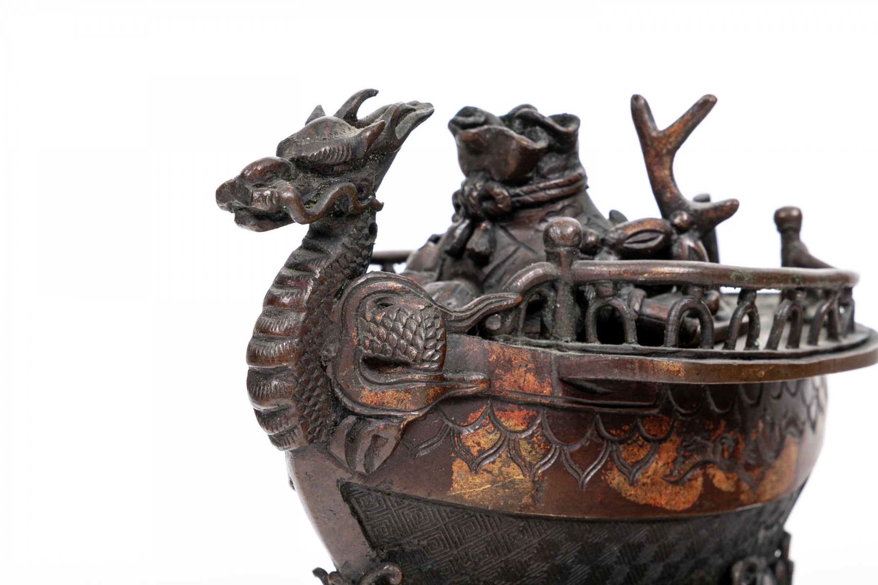The censer is in the form of a treasure ship with fabulously cast dragon head off the bow of the ship. The ship in quatrefoil form and is elevated on wave form foot.