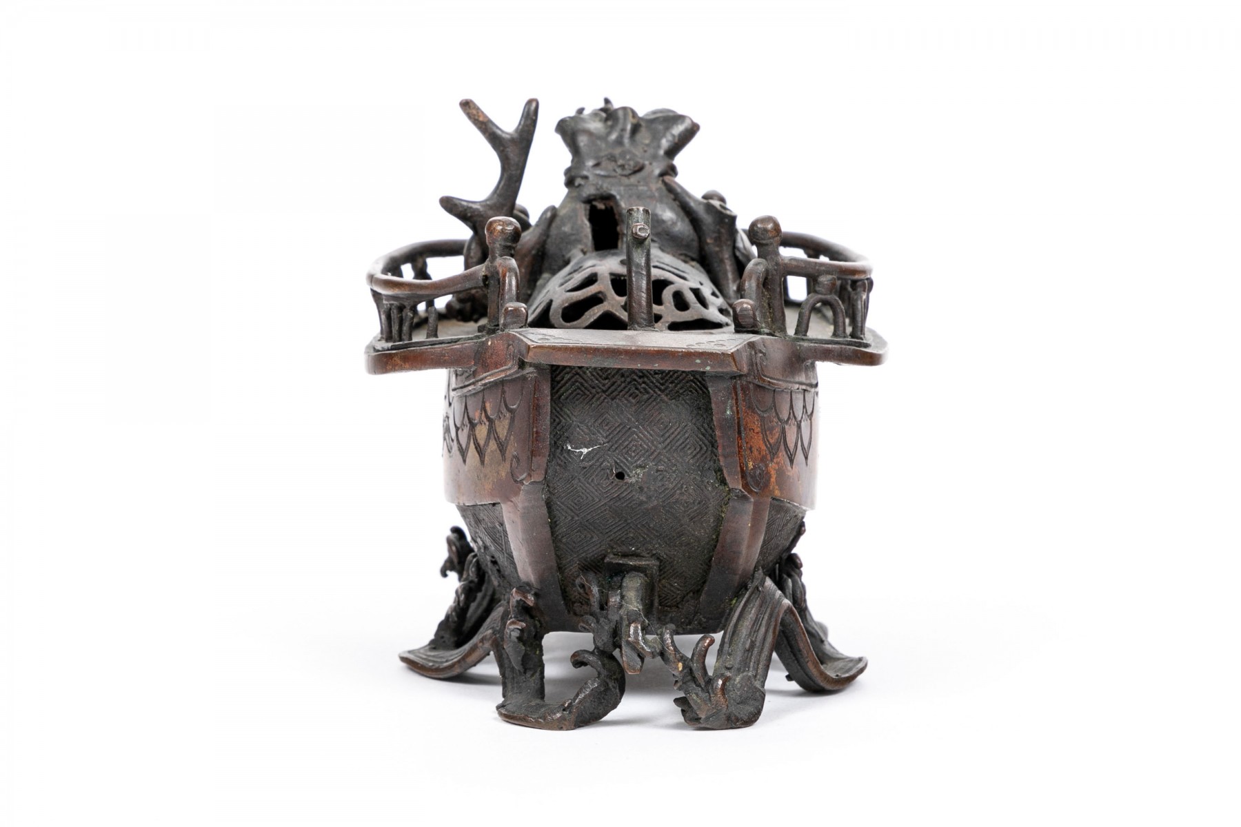 A lovely antique Japanese Takarabube, also known as a treasure ship, form bronze censer, with pierced openwork lid.