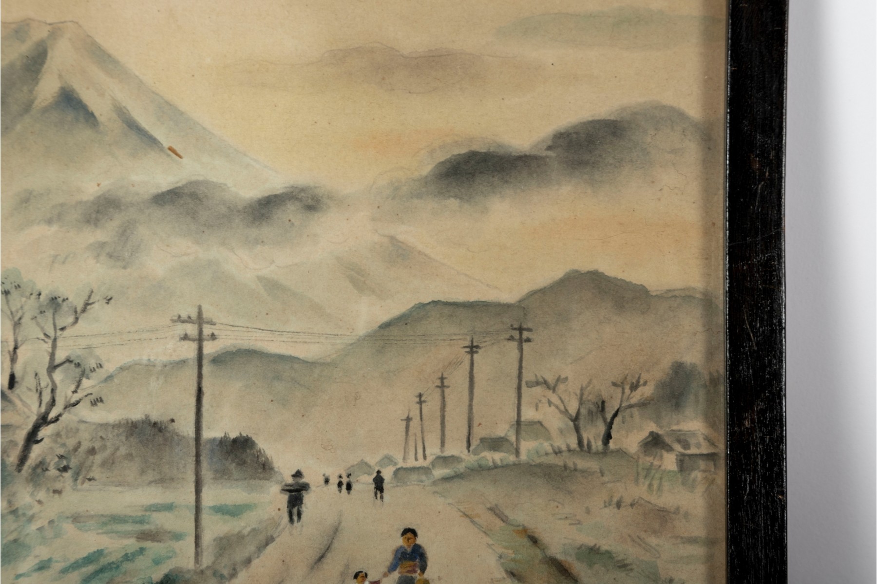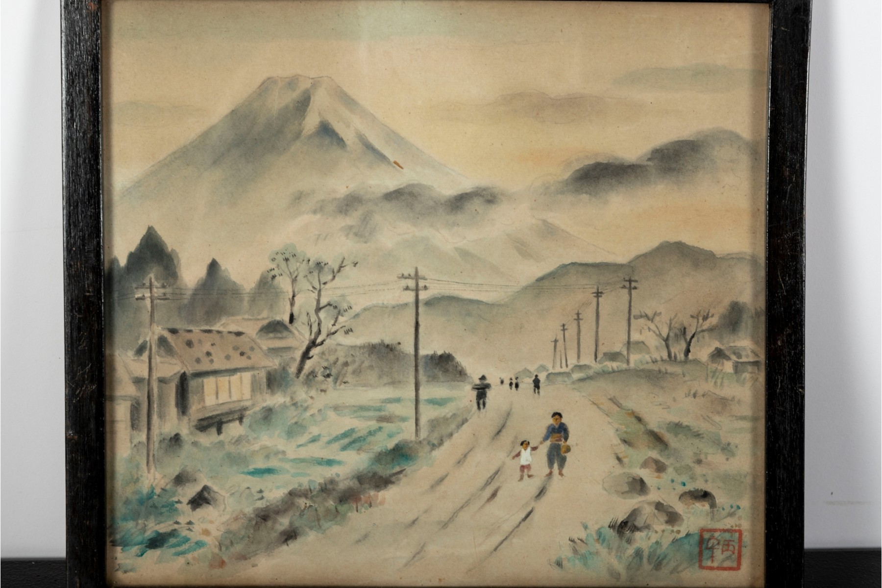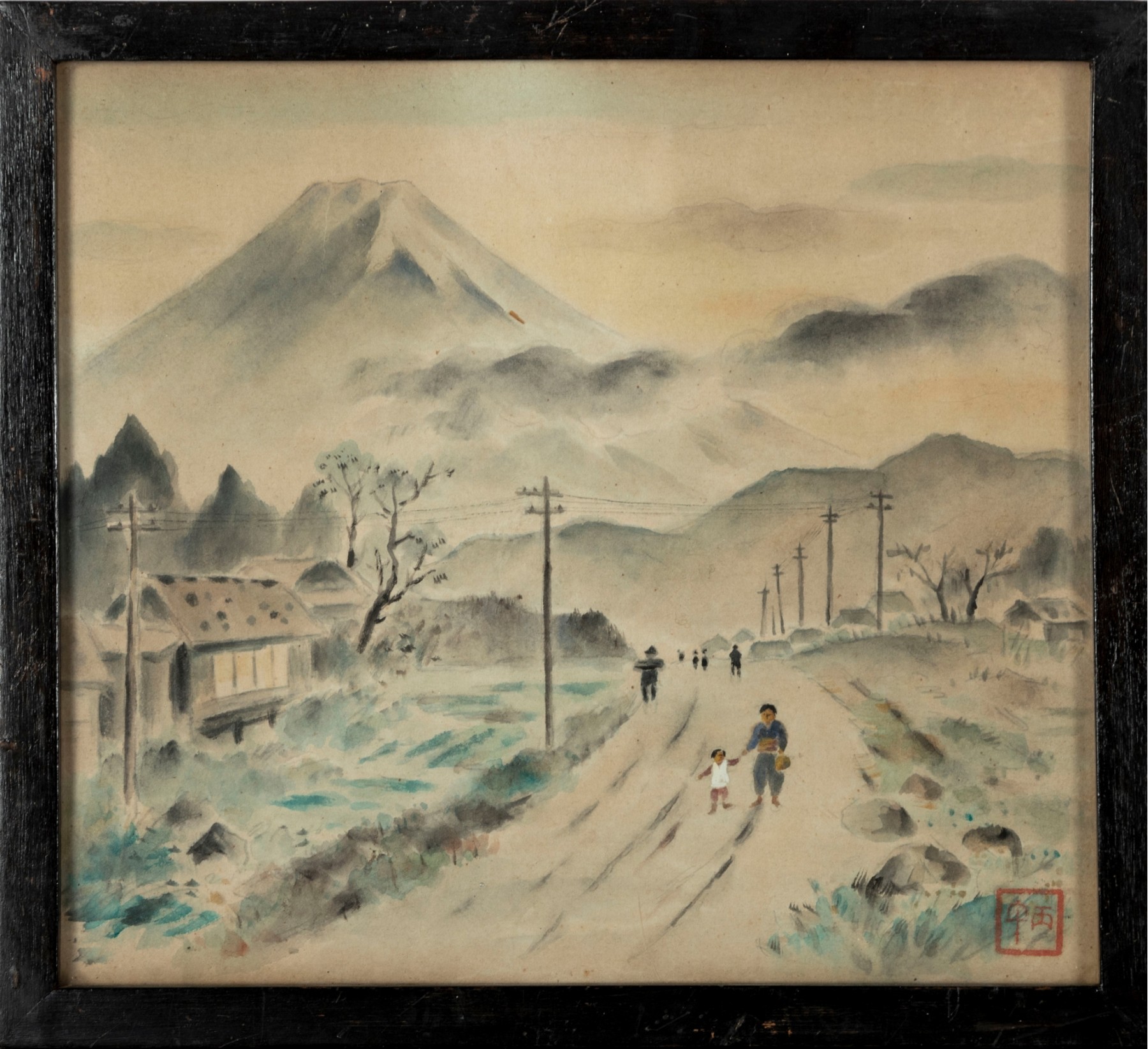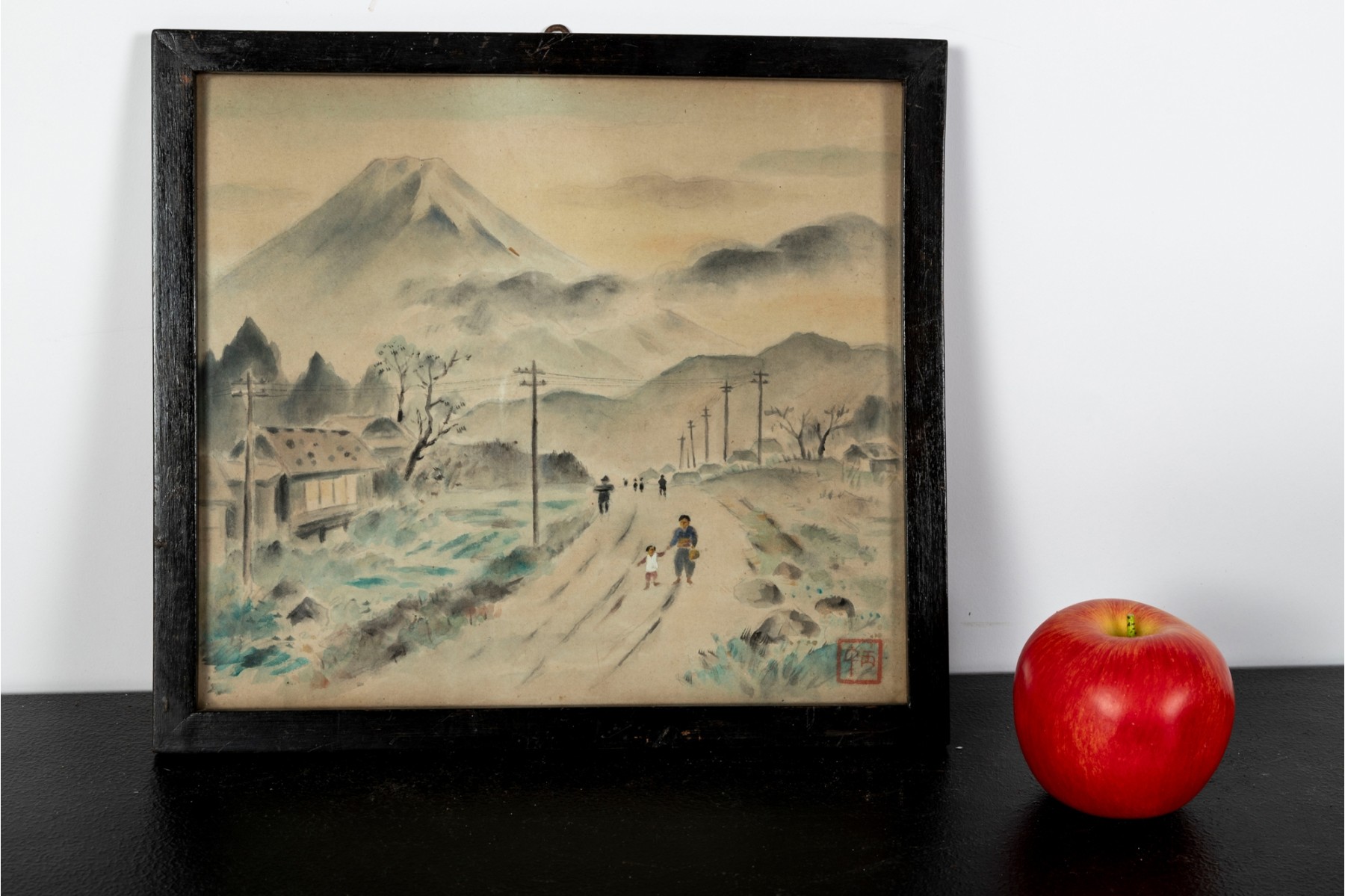 A framed watercolor painting depicting a serene rural landscape with a mountain in the background, possibly Mount Fuji. The scene includes a dirt road lined with utility poles, modest houses, and figures walking, evoking a peaceful, everyday moment illustrated in soft pastel colors. The artwork is presented in a plain black frame, and faced with glass.