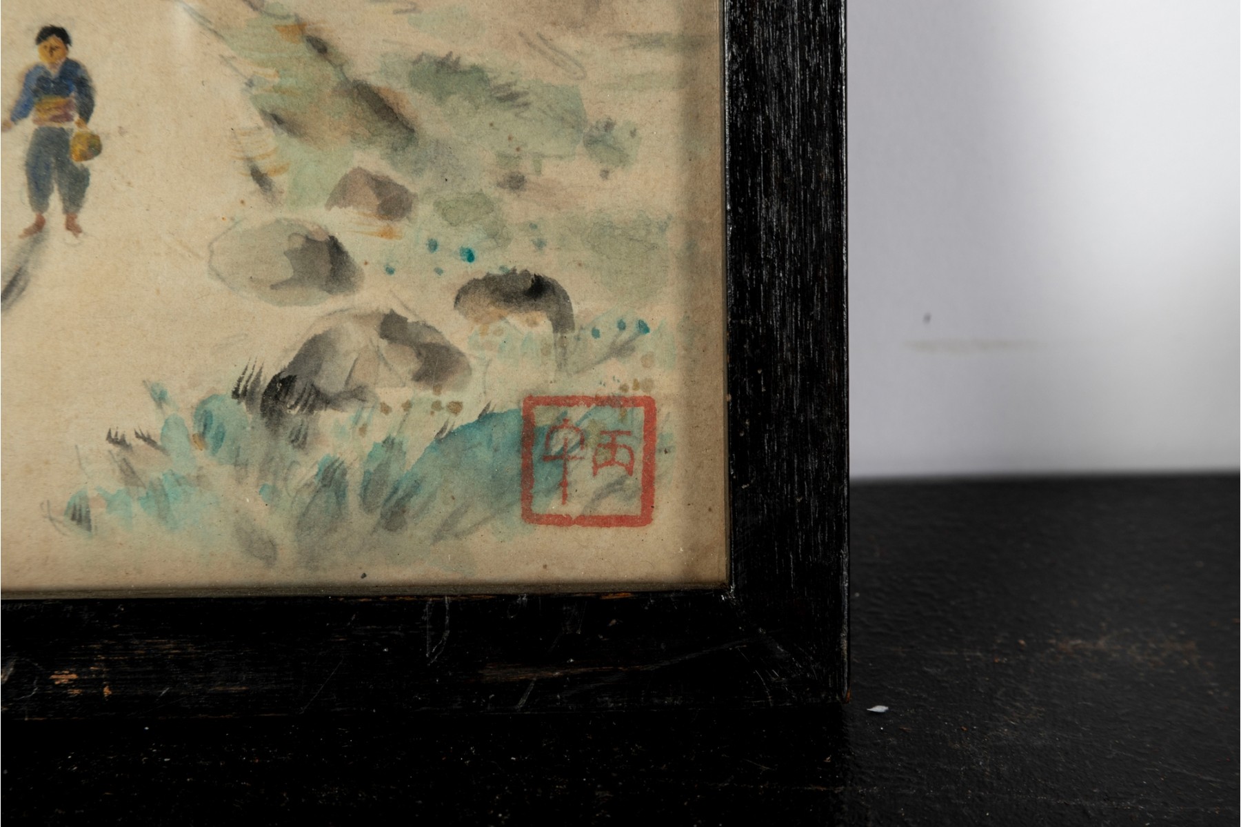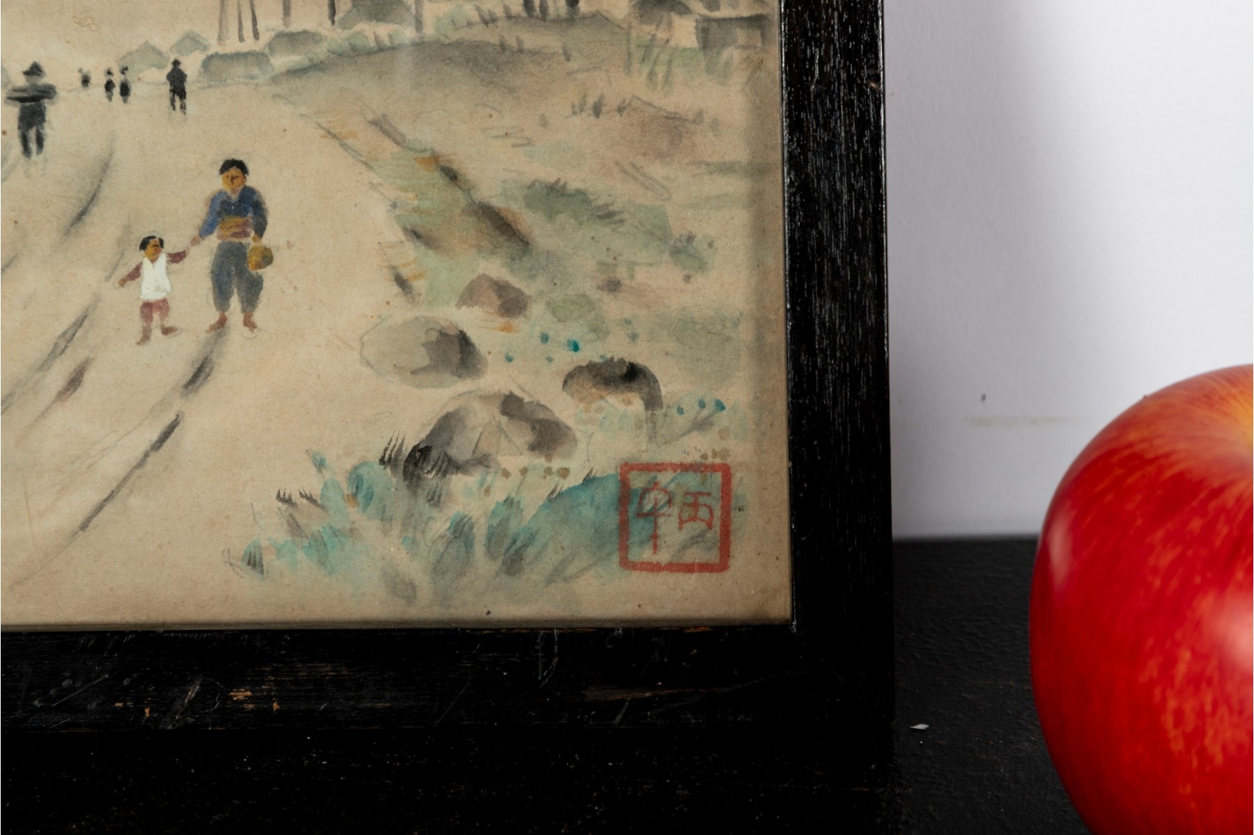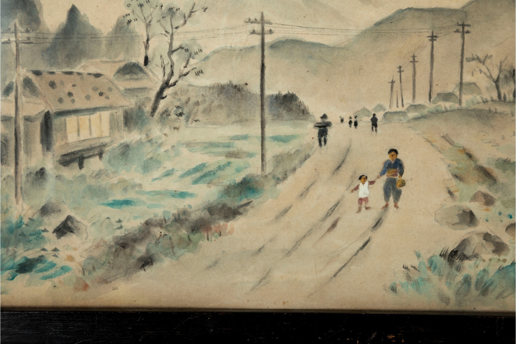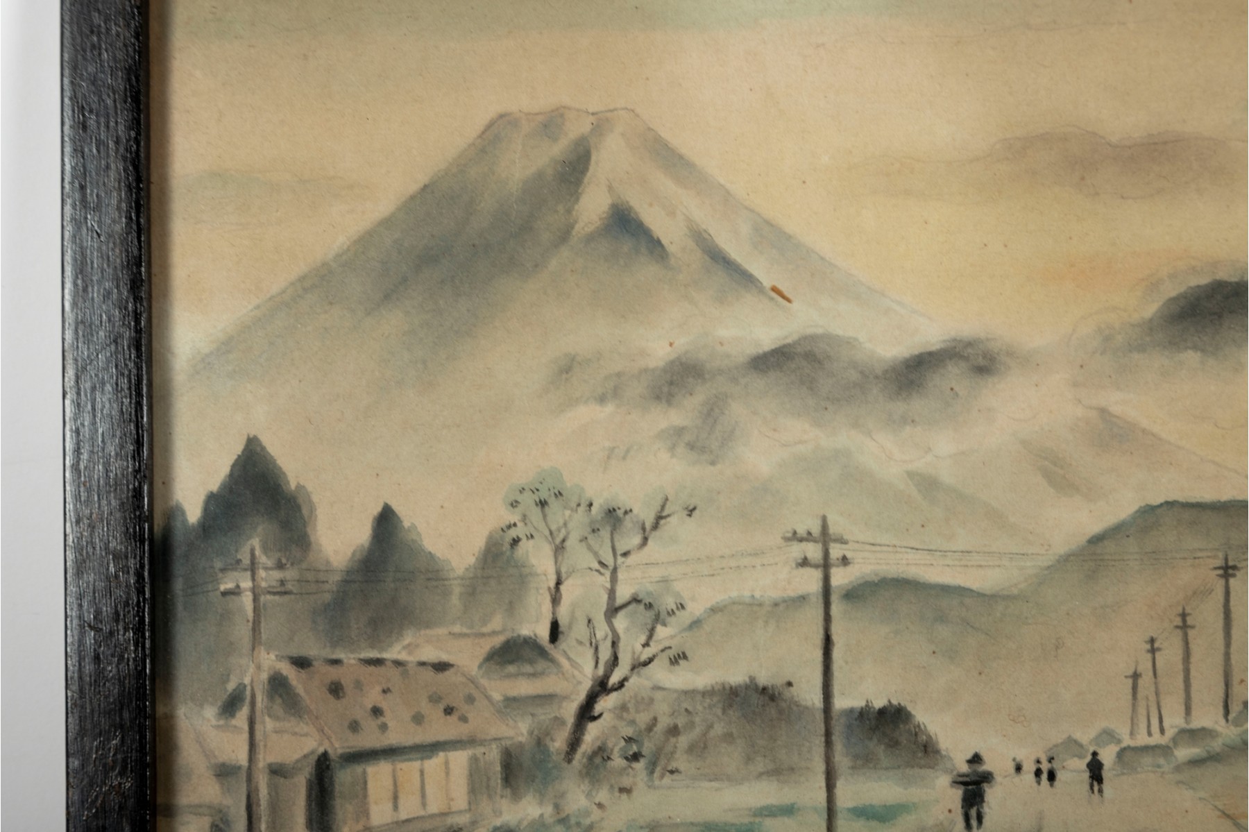 A framed watercolor painting depicting a serene rural landscape with a mountain in the background, possibly Mount Fuji. The scene includes a dirt road lined with utility poles, modest houses, and figures walking, evoking a peaceful, everyday moment illustrated in soft pastel colors. The artwork is presented in a plain black frame, and faced with glass.