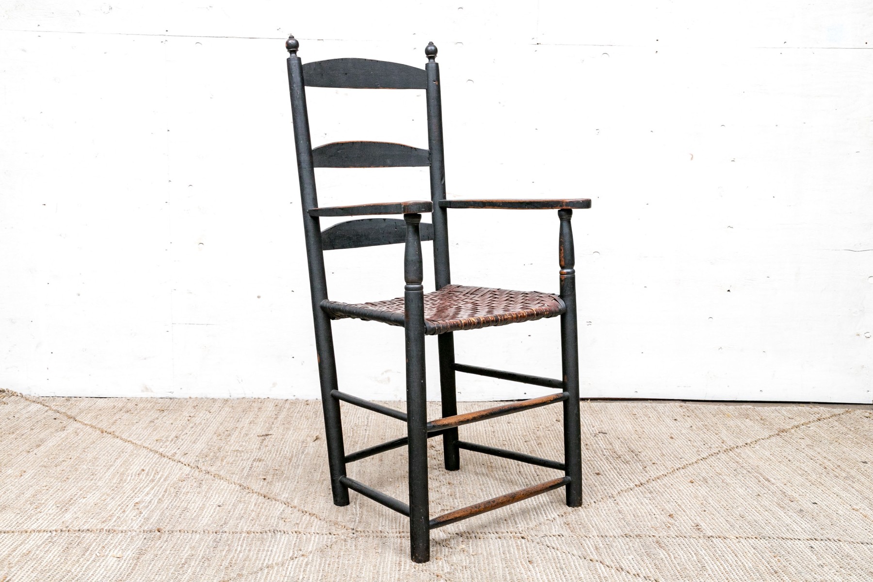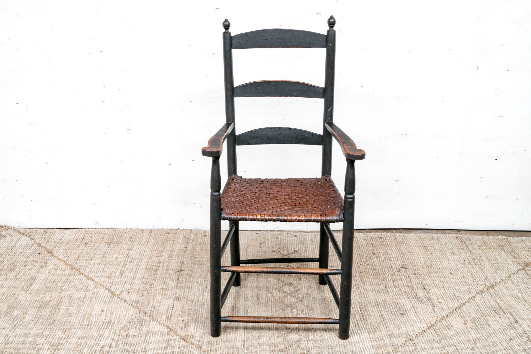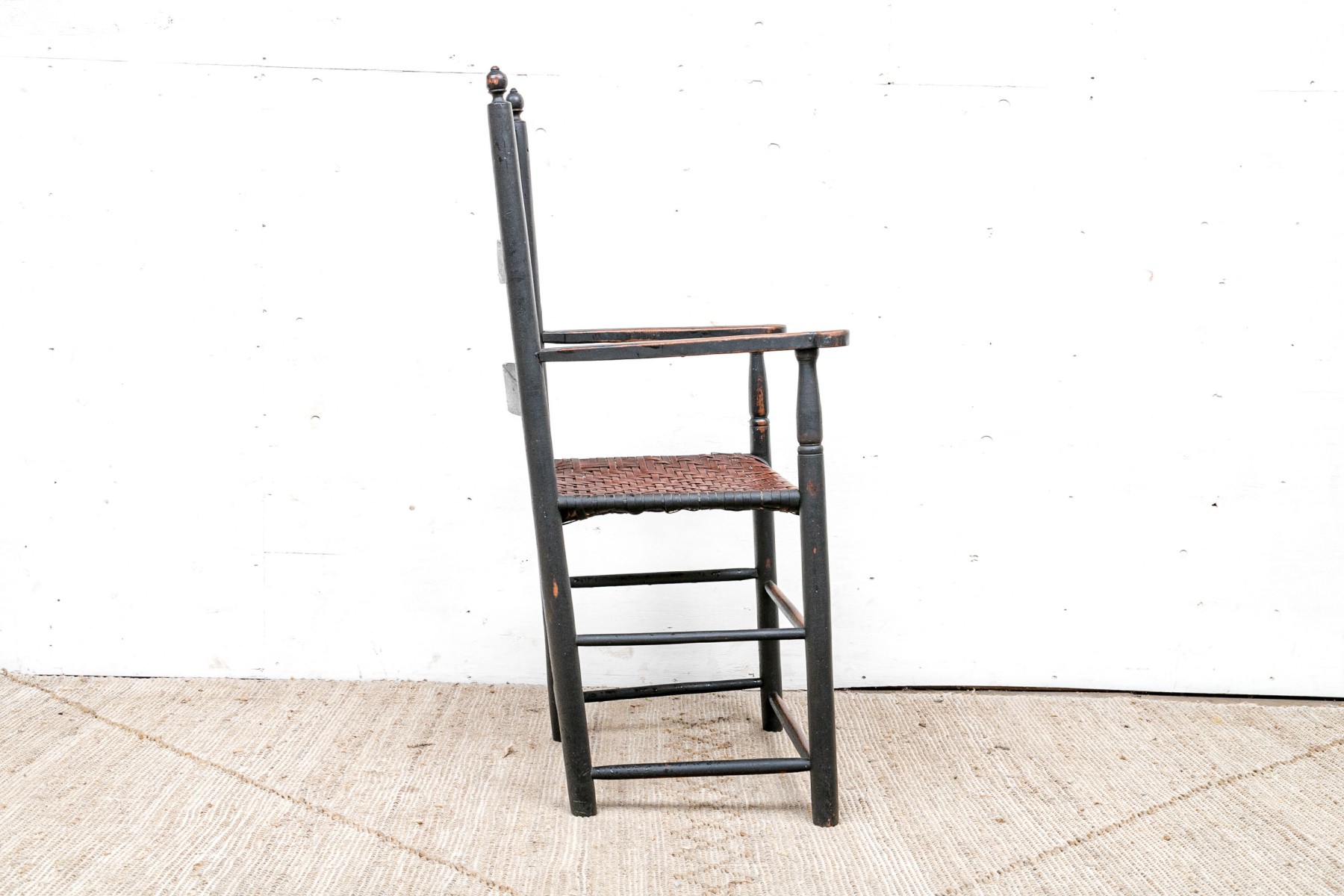 The fine antique painted armchair with turned finials and double front and side stretchers. With a woven brown stained leather seat.
