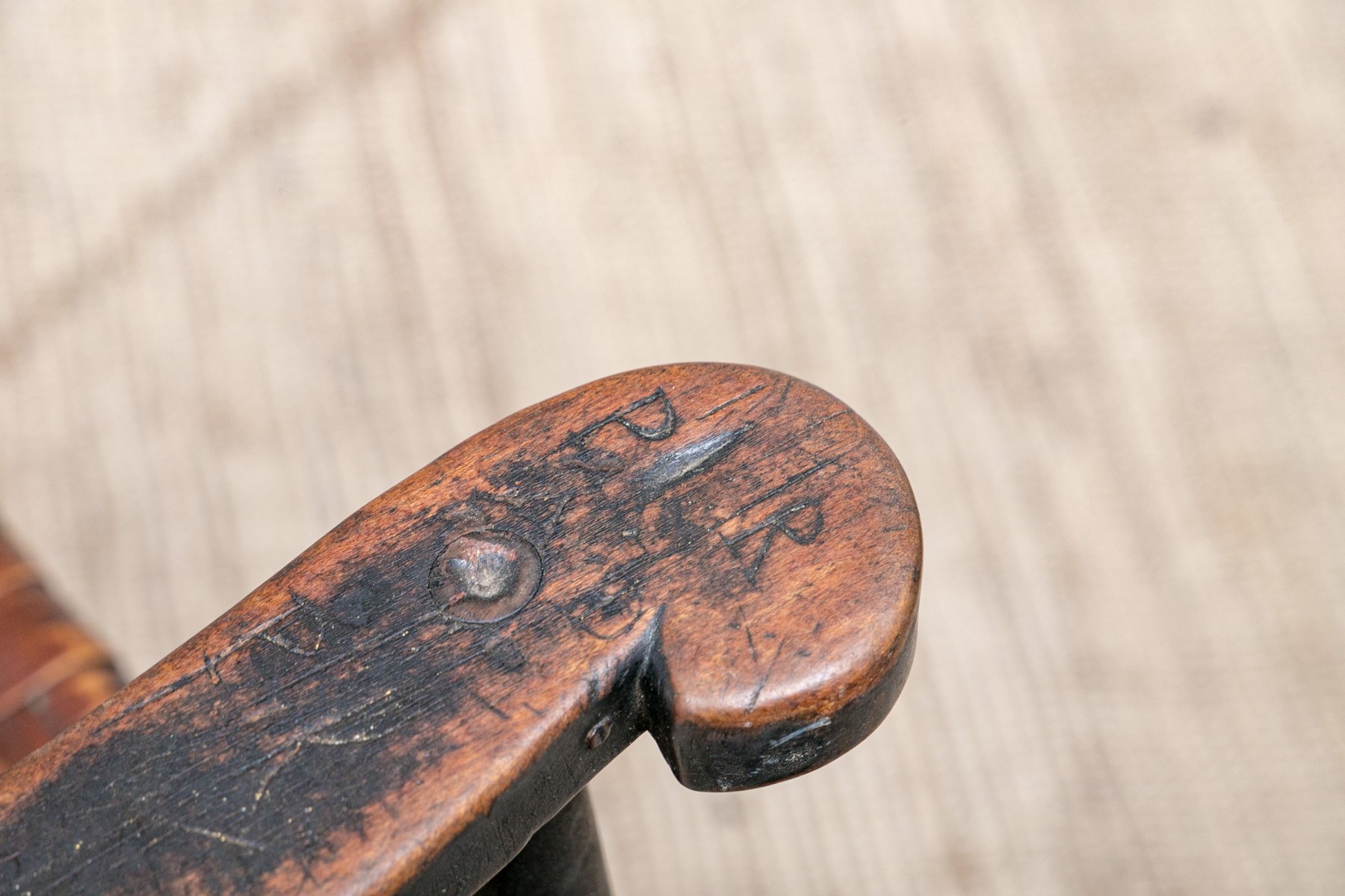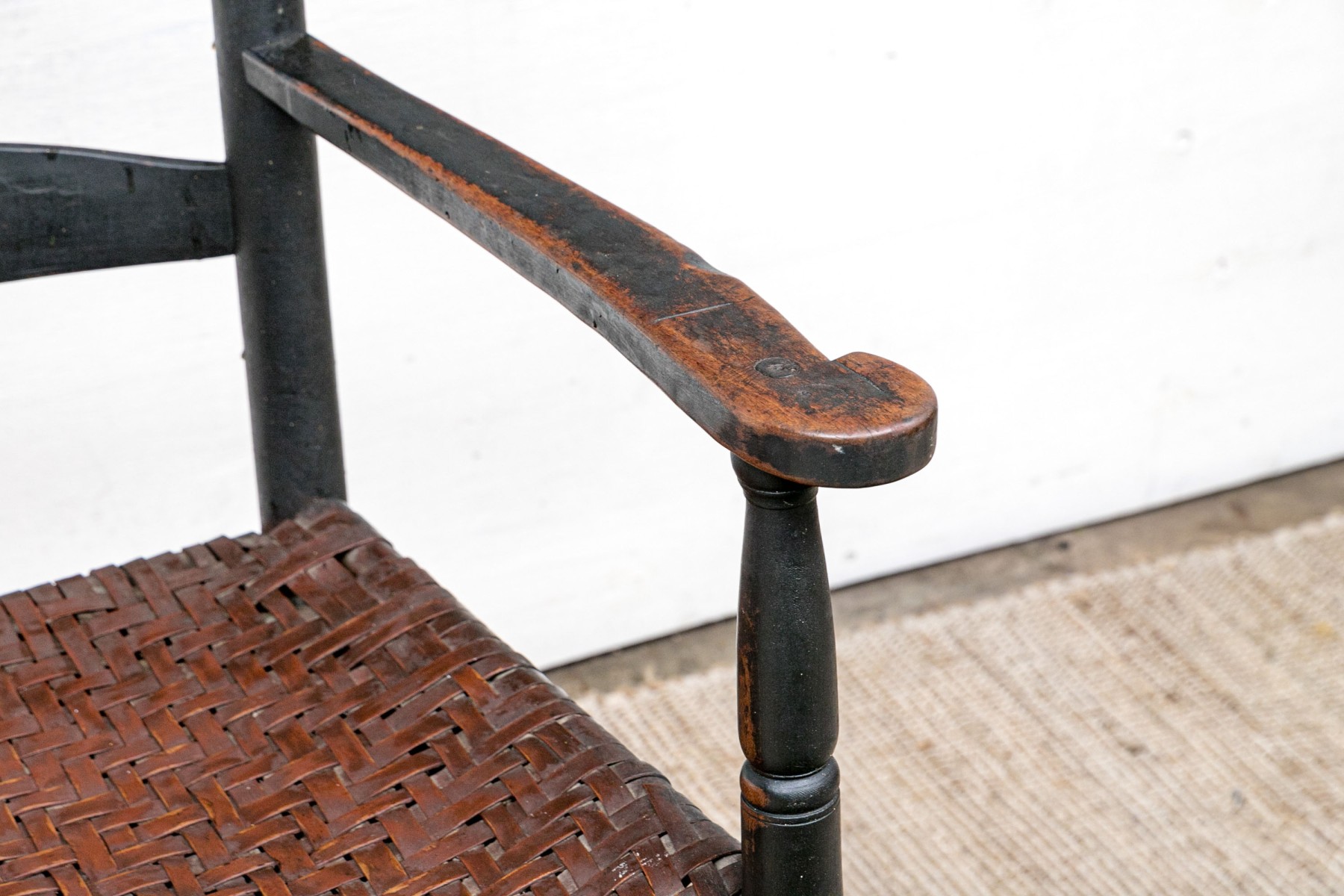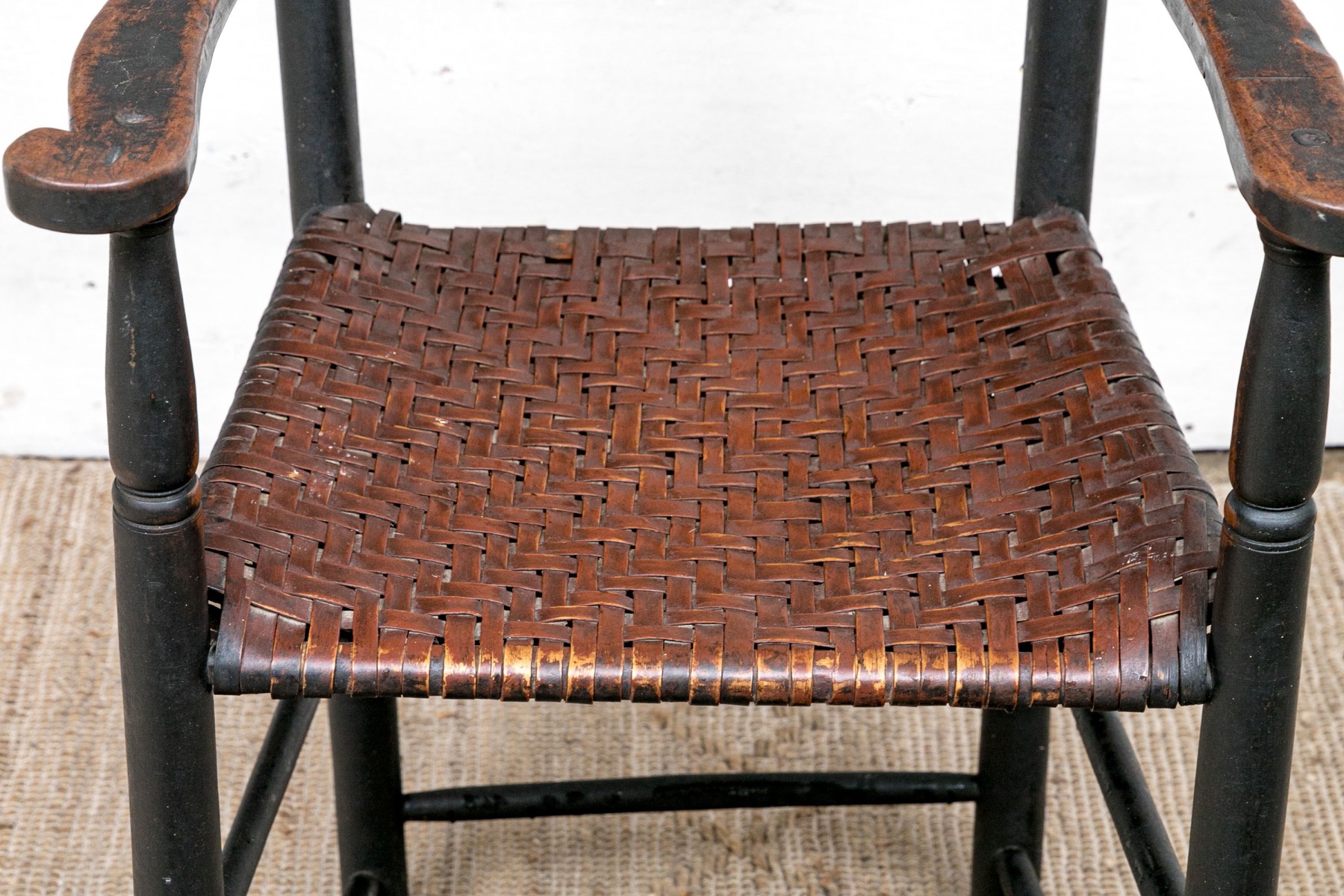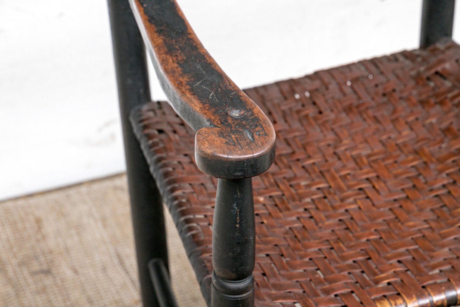 The fine antique painted armchair with turned finials and double front and side stretchers. With a woven brown stained leather seat.