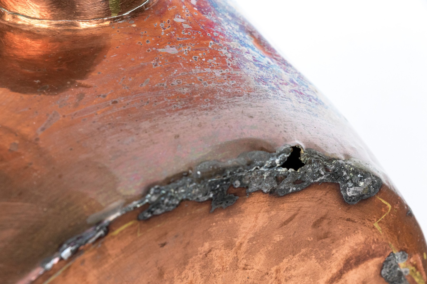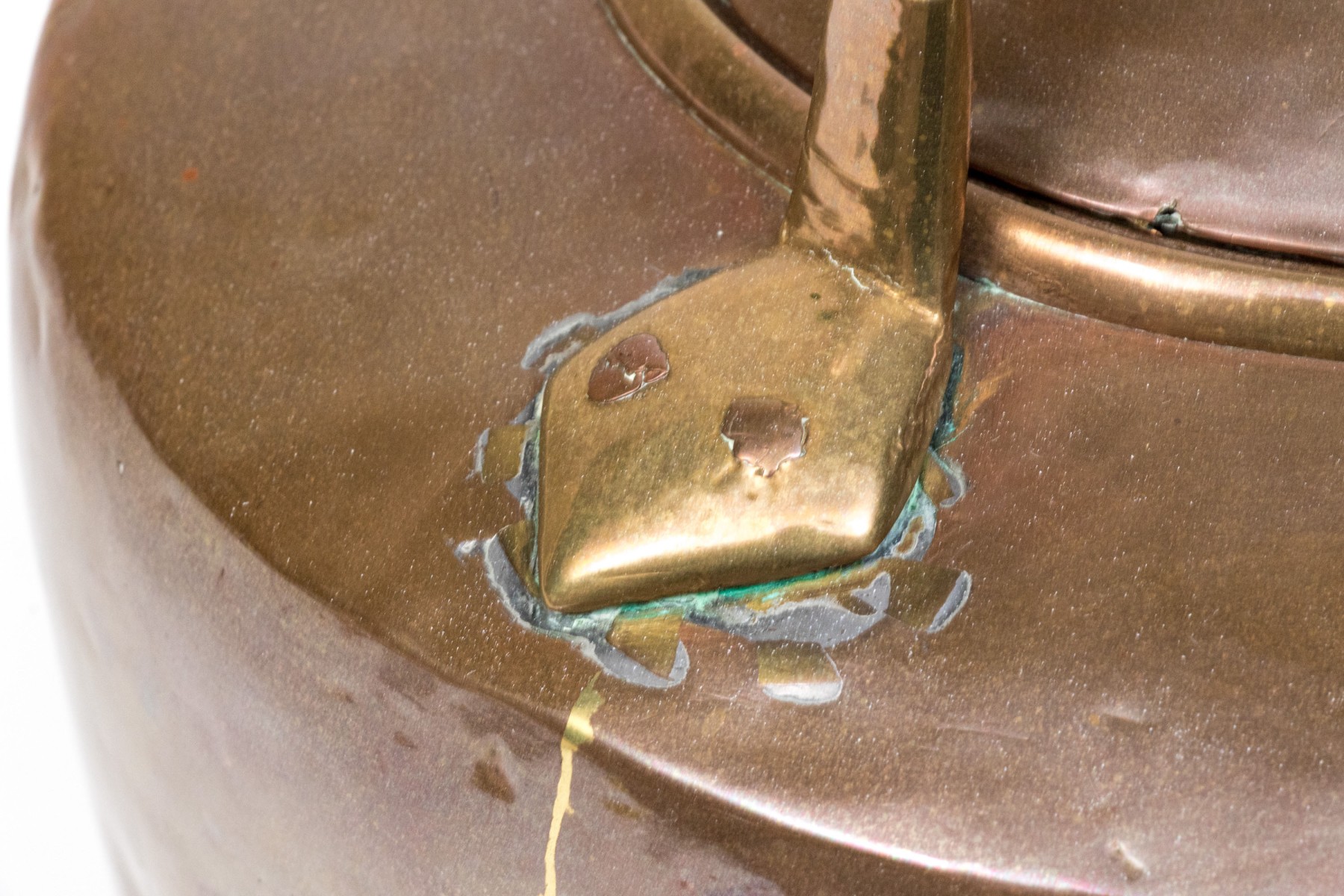 Condition: worn along the base edge with a small hole, expected dings, wear to the tin lining, but nice overall dark patina. Please review the photos as they are part of the condition report.