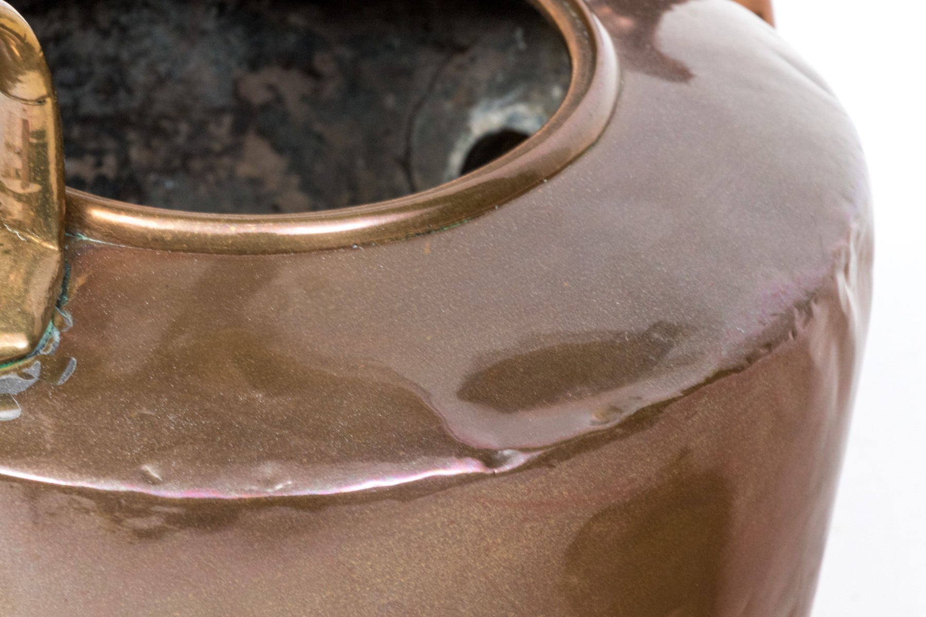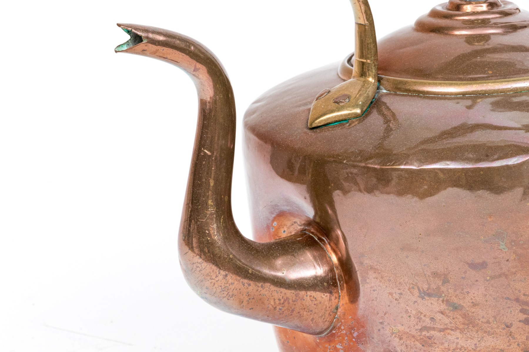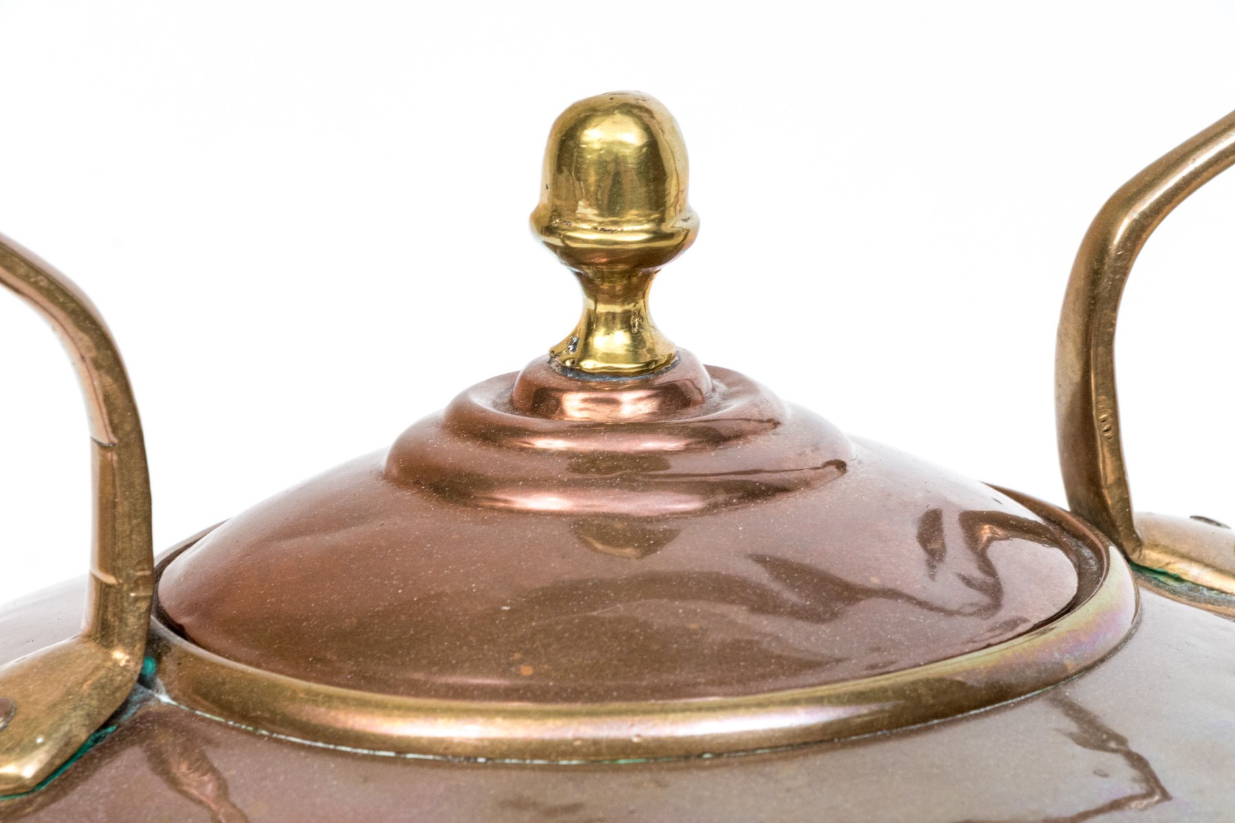 A classic tea kettle with curved spout, twin curved brass and copper handles and a brass lid finial. Tin lined.