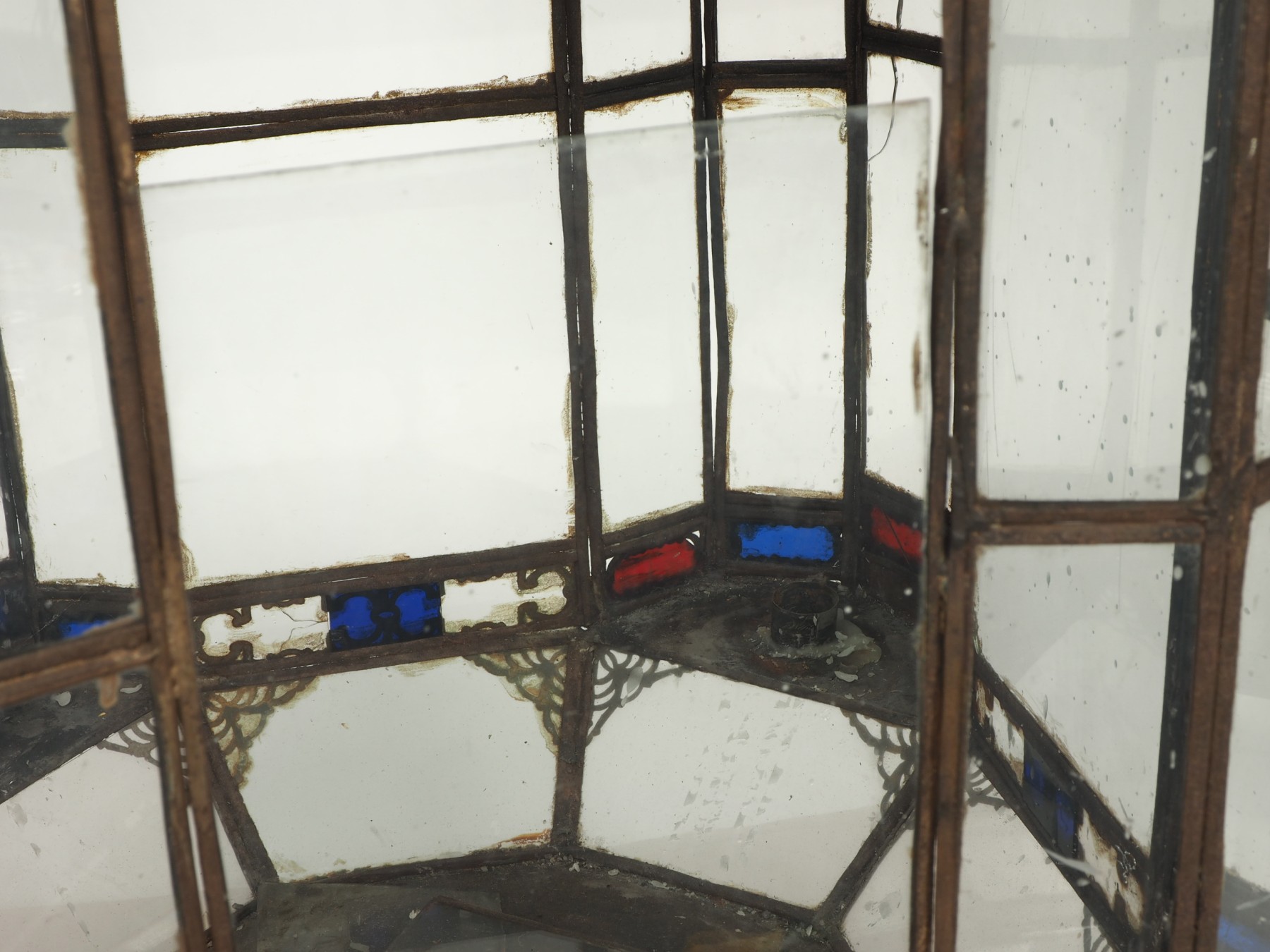 Condition: 3 cracked side panels, 2 cracked/broken lower panels from the octagonal base; one octagonal glass is out of frame and included; one large side panel is also missing and included. Some restoration work is necessary for the panels that are missing but included. Two of the multi-colored panels are also cracked. Additionally, the lantern shows expected tarnish and wear.