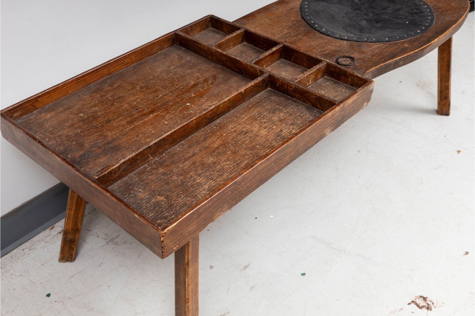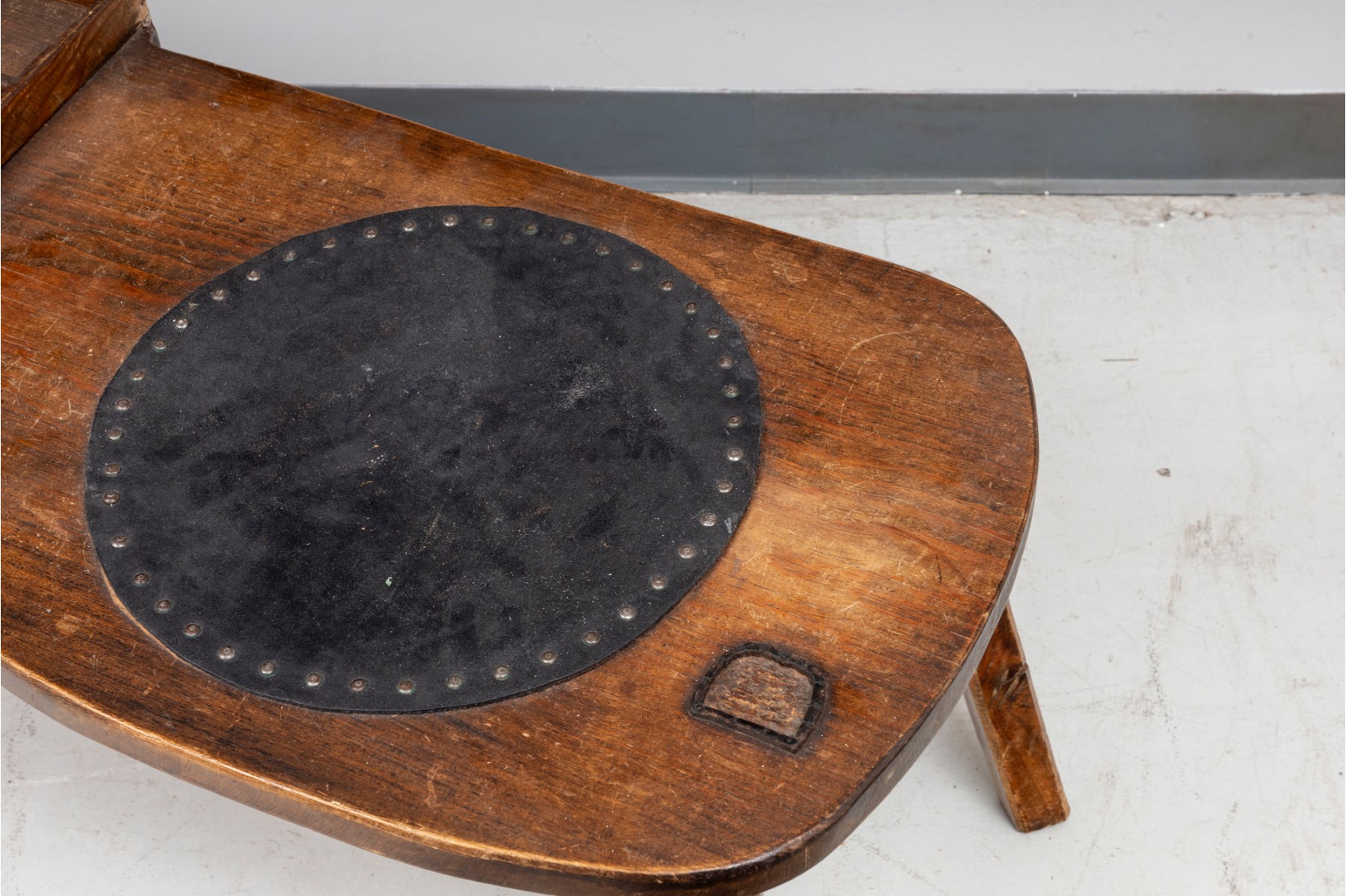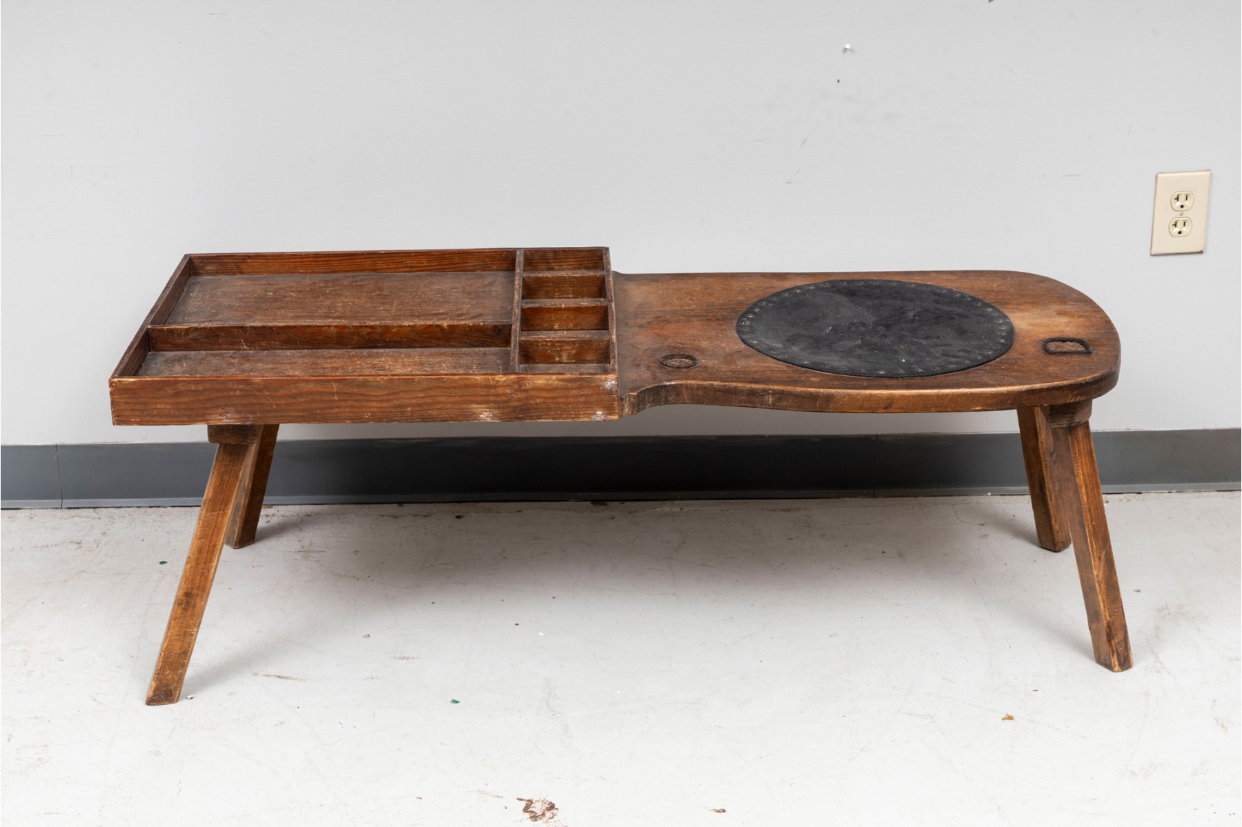 A 19th century wooden cobbler's bench -- a low, four-legged bench used to manufacture and repair shoes. This example comes complete with a leather seat, and divided compartments for tools and supplies.