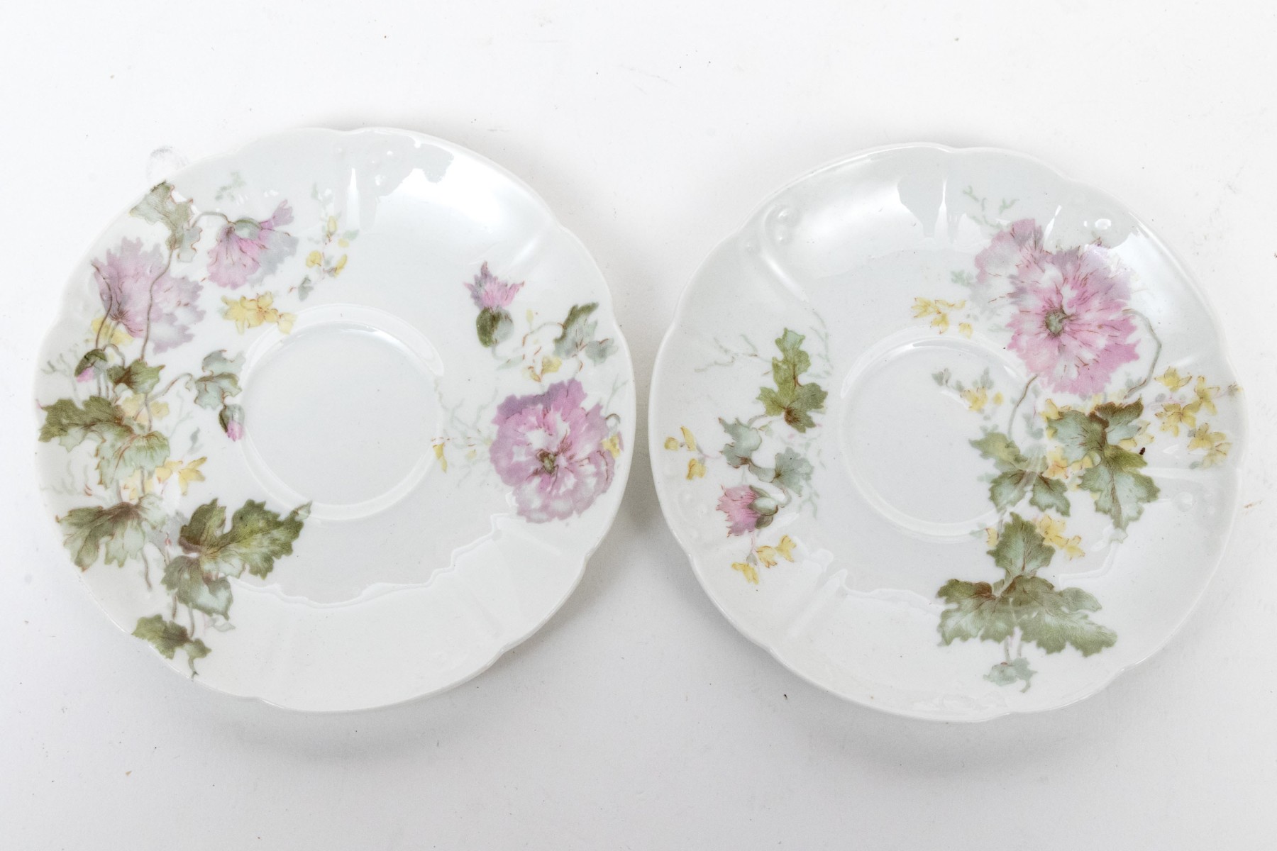 In a lovely pastel tone floral pattern on white with gold accents on the handles. Including: