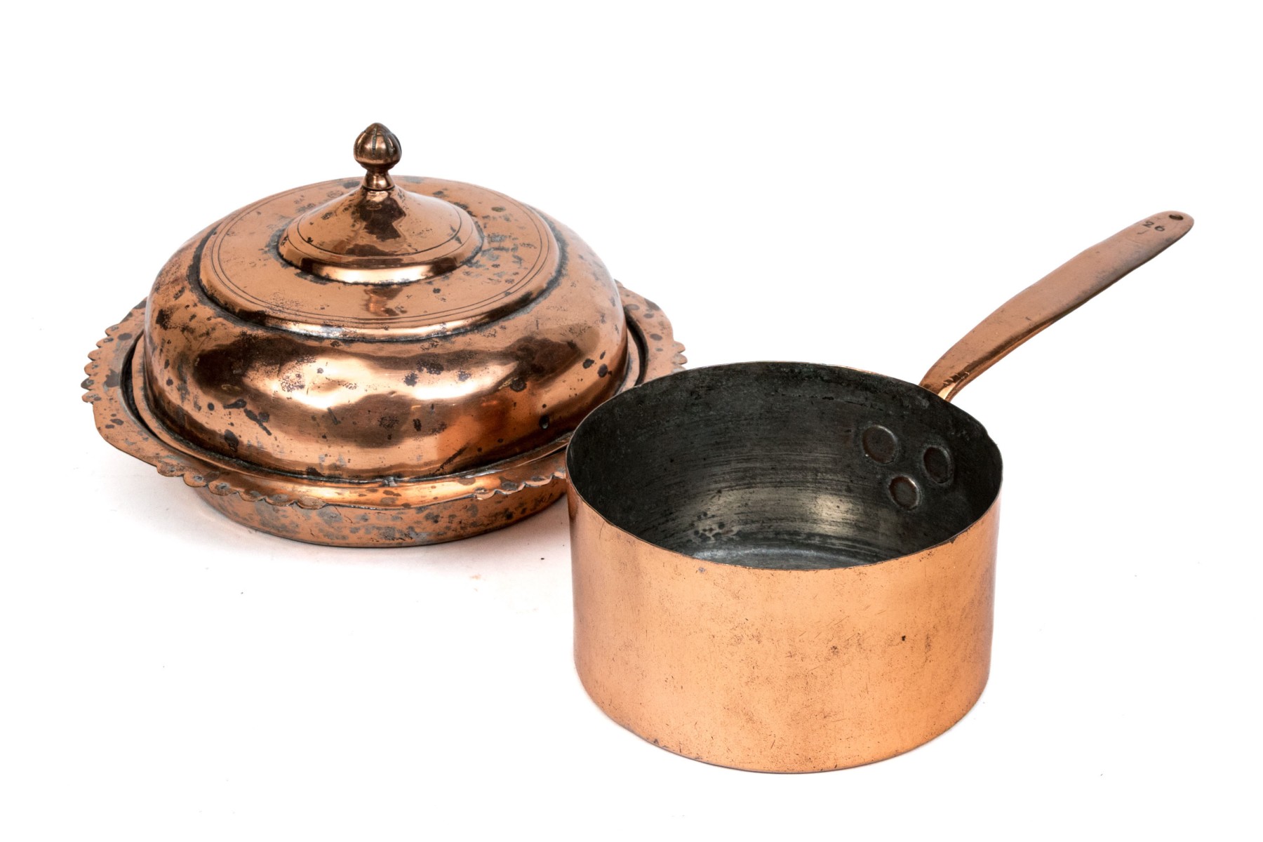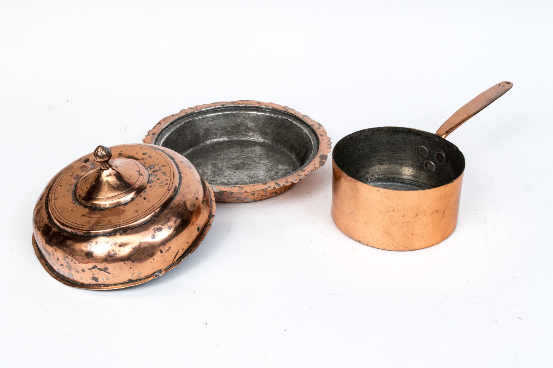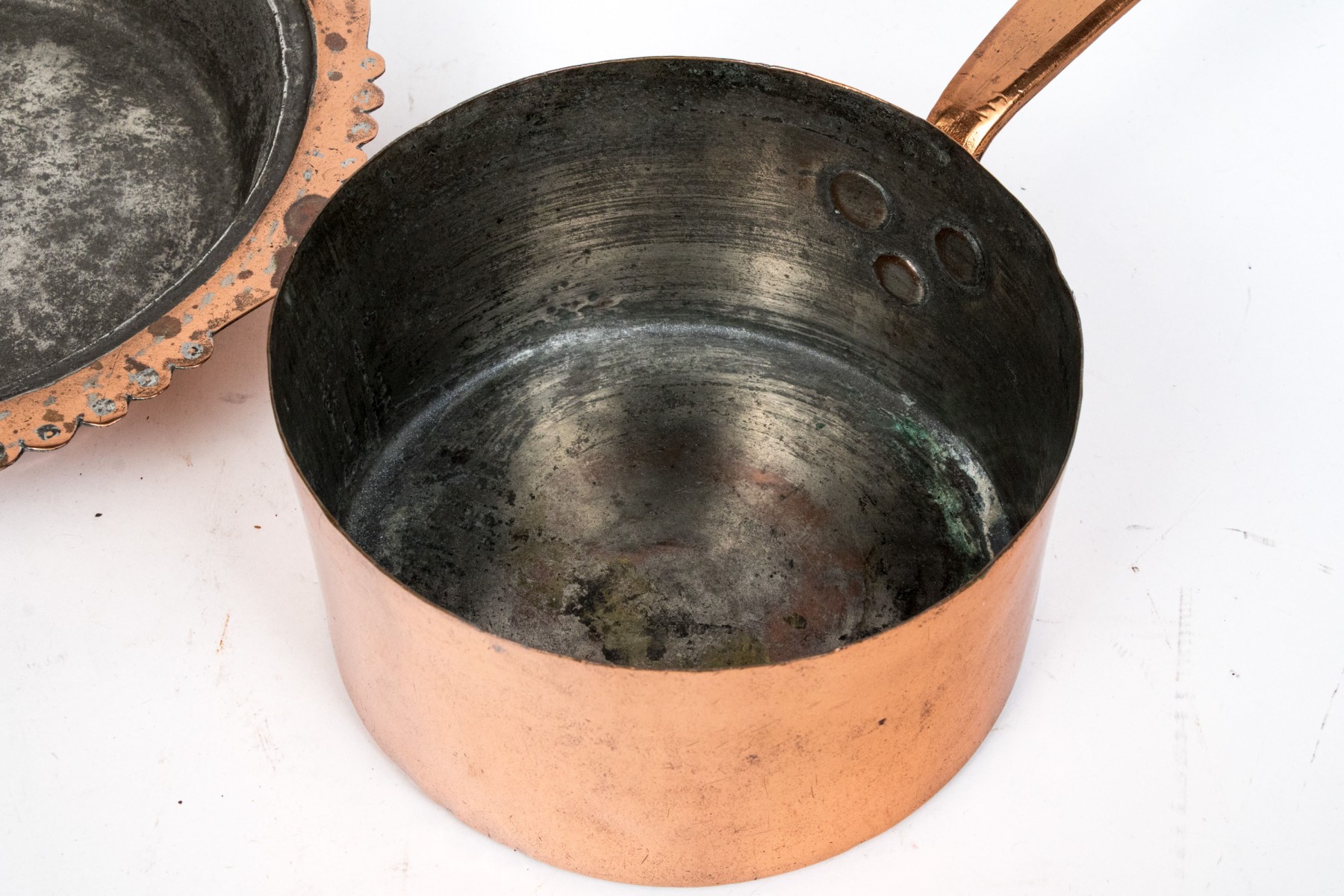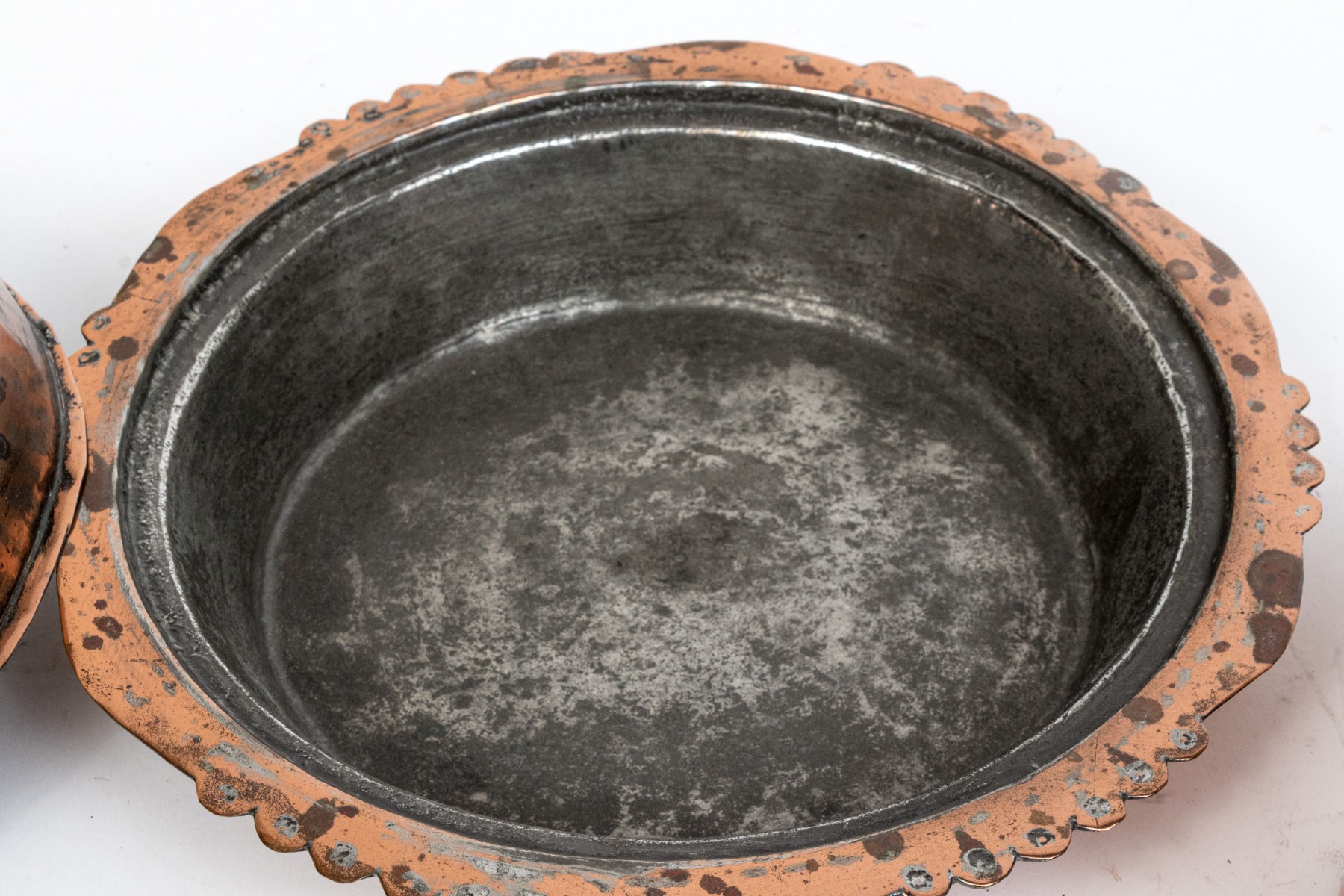 Comprised of a tin lined sauce pan and a tin lined lidded pan with scalloped trim.