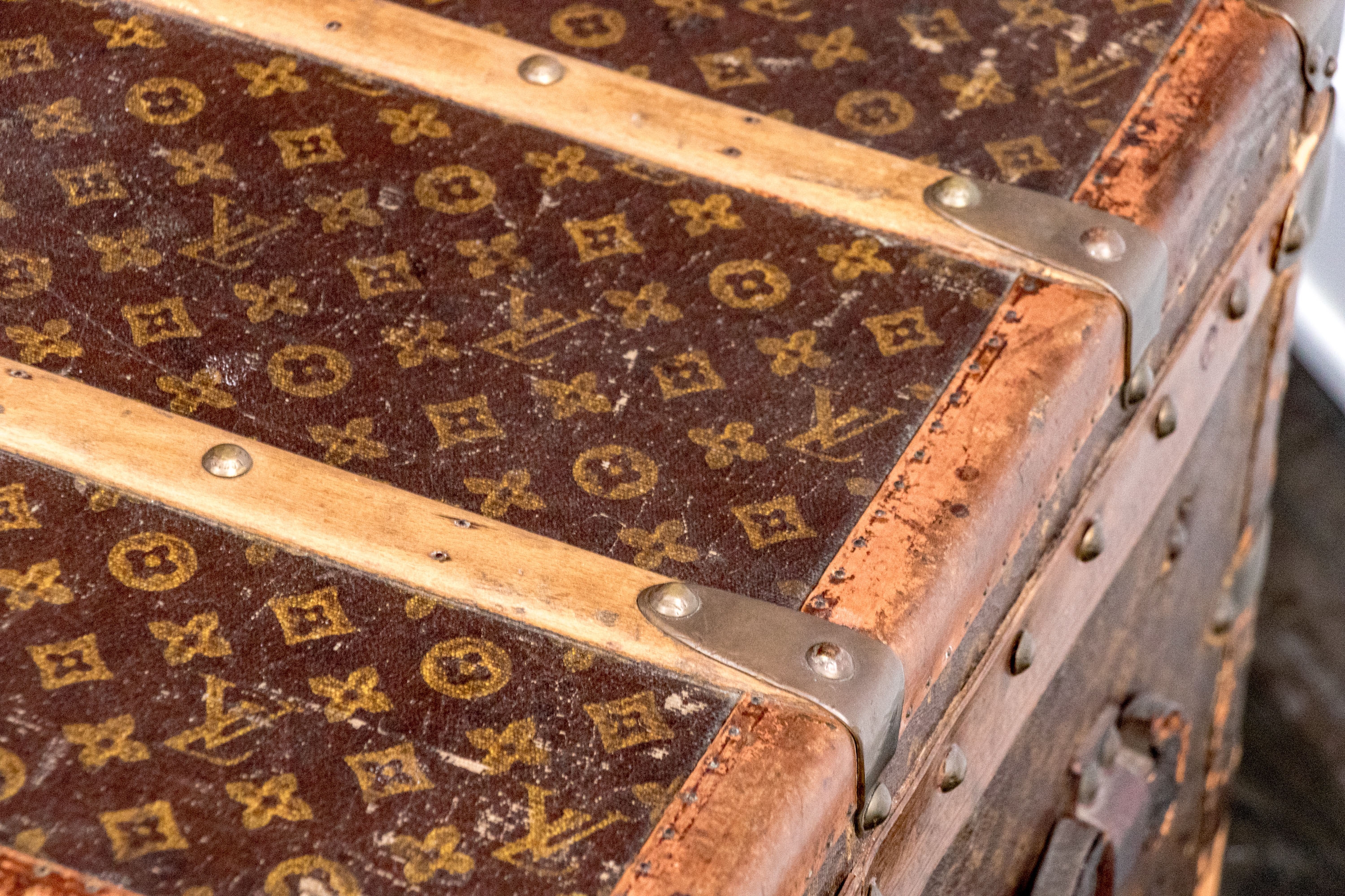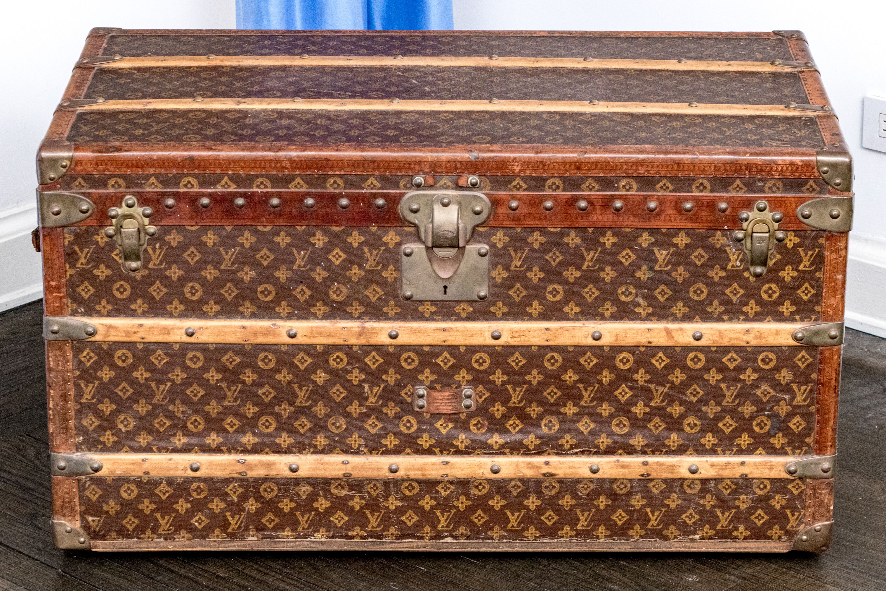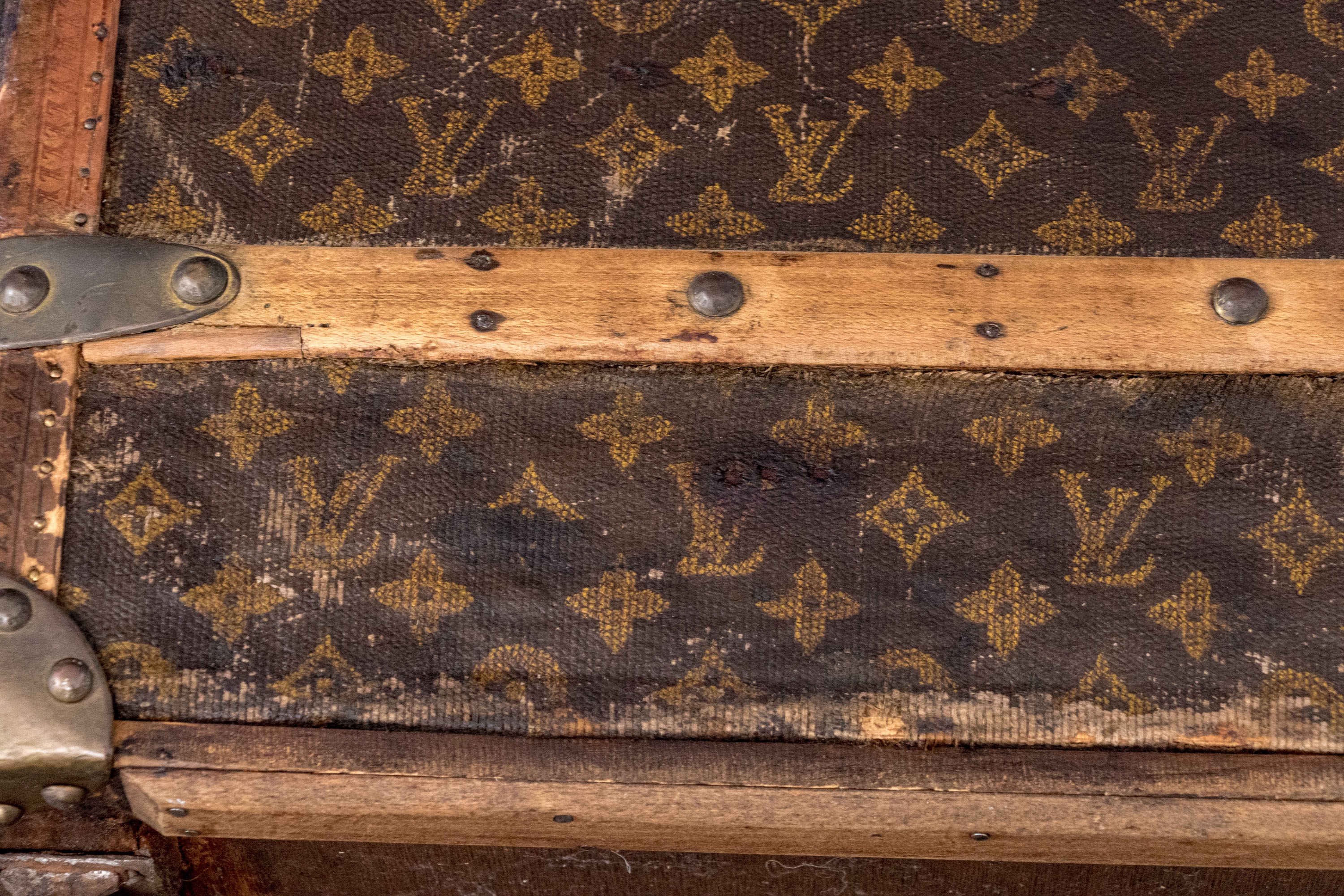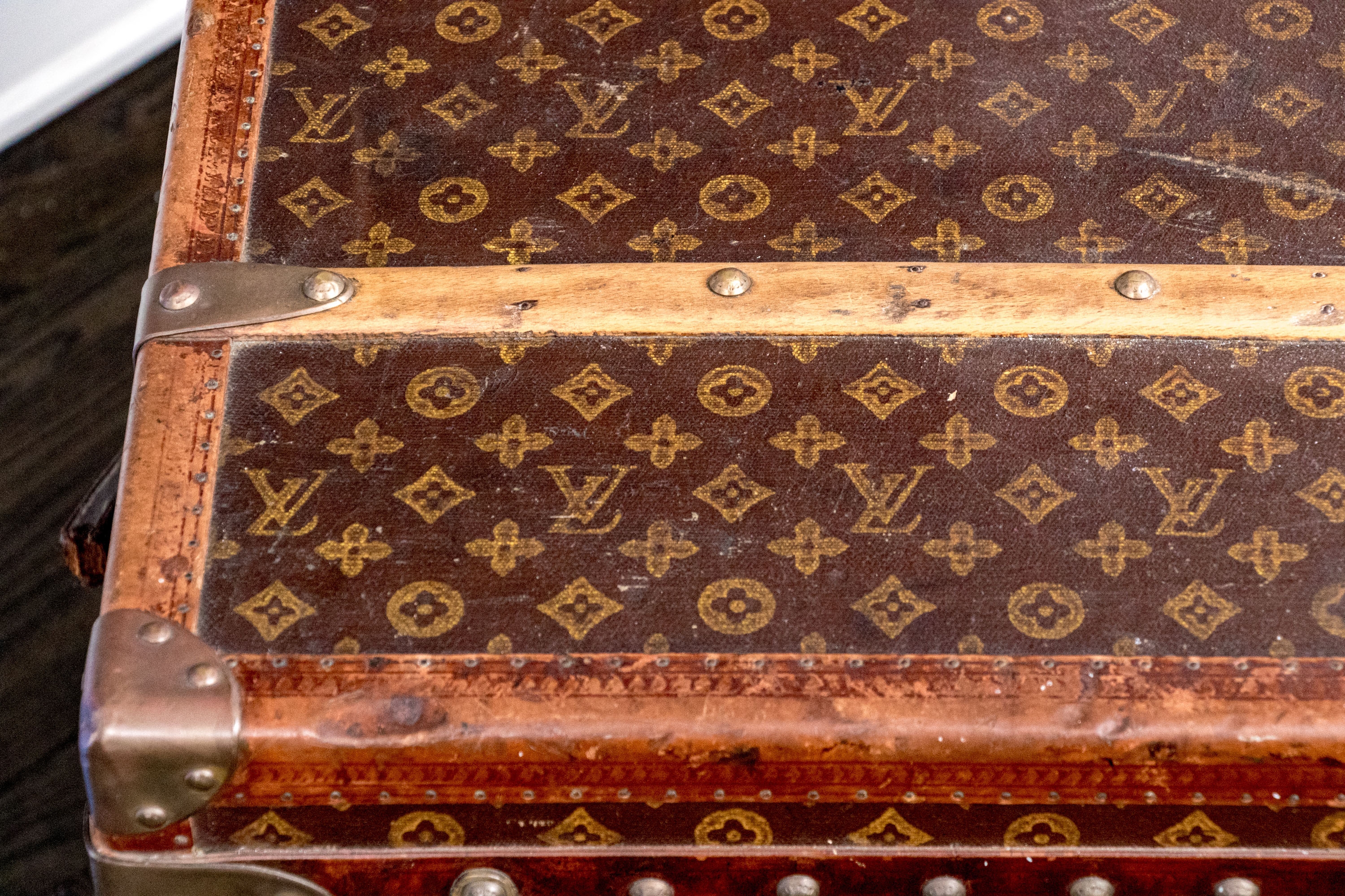 An antique Louis Vuitton steamer trunk in rectangular form with wooden supports with brass tack nailhead trim with brass mounts and leather handles, on either side. Hinged top with brass central close clasp and two adjacent flanking clasps.