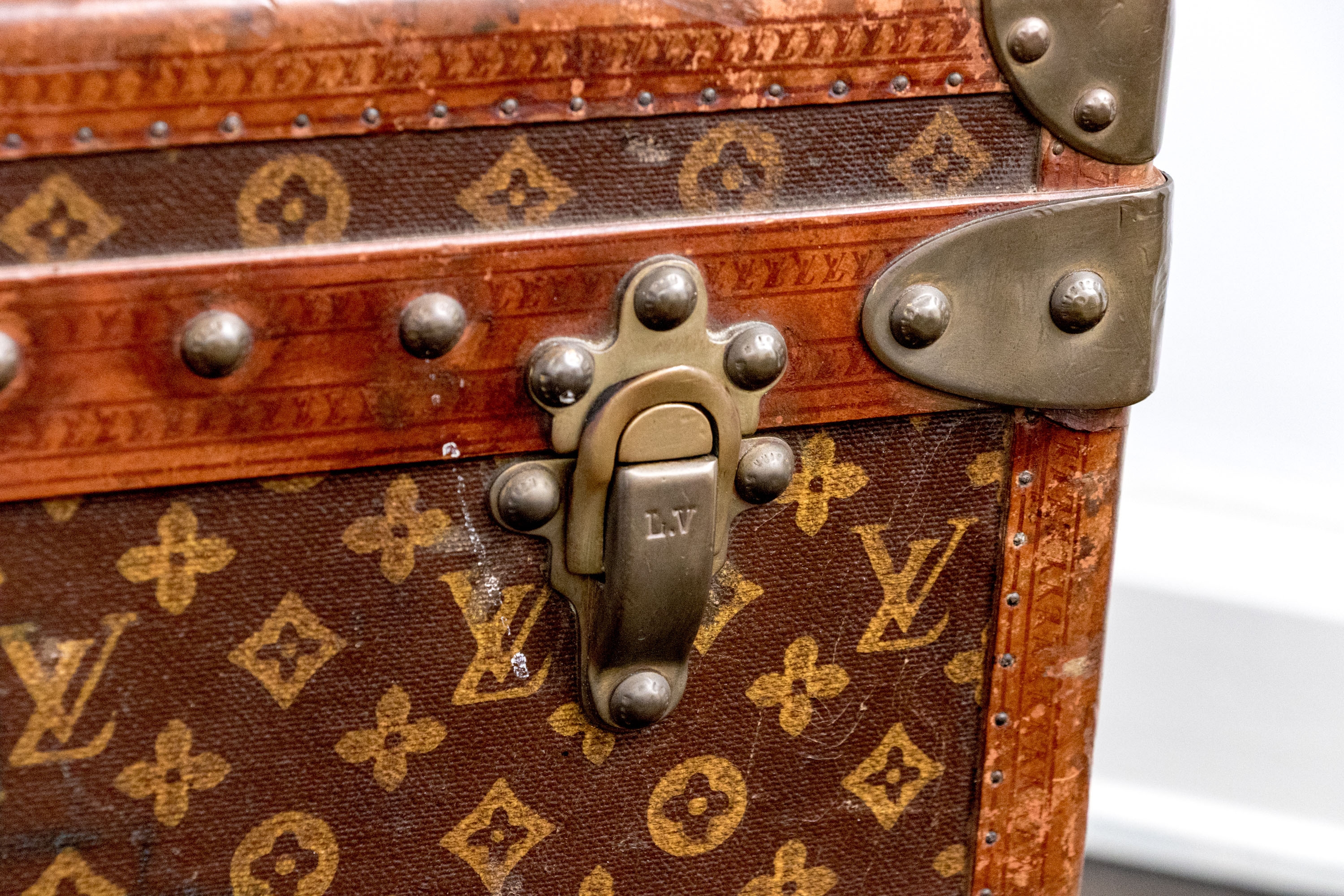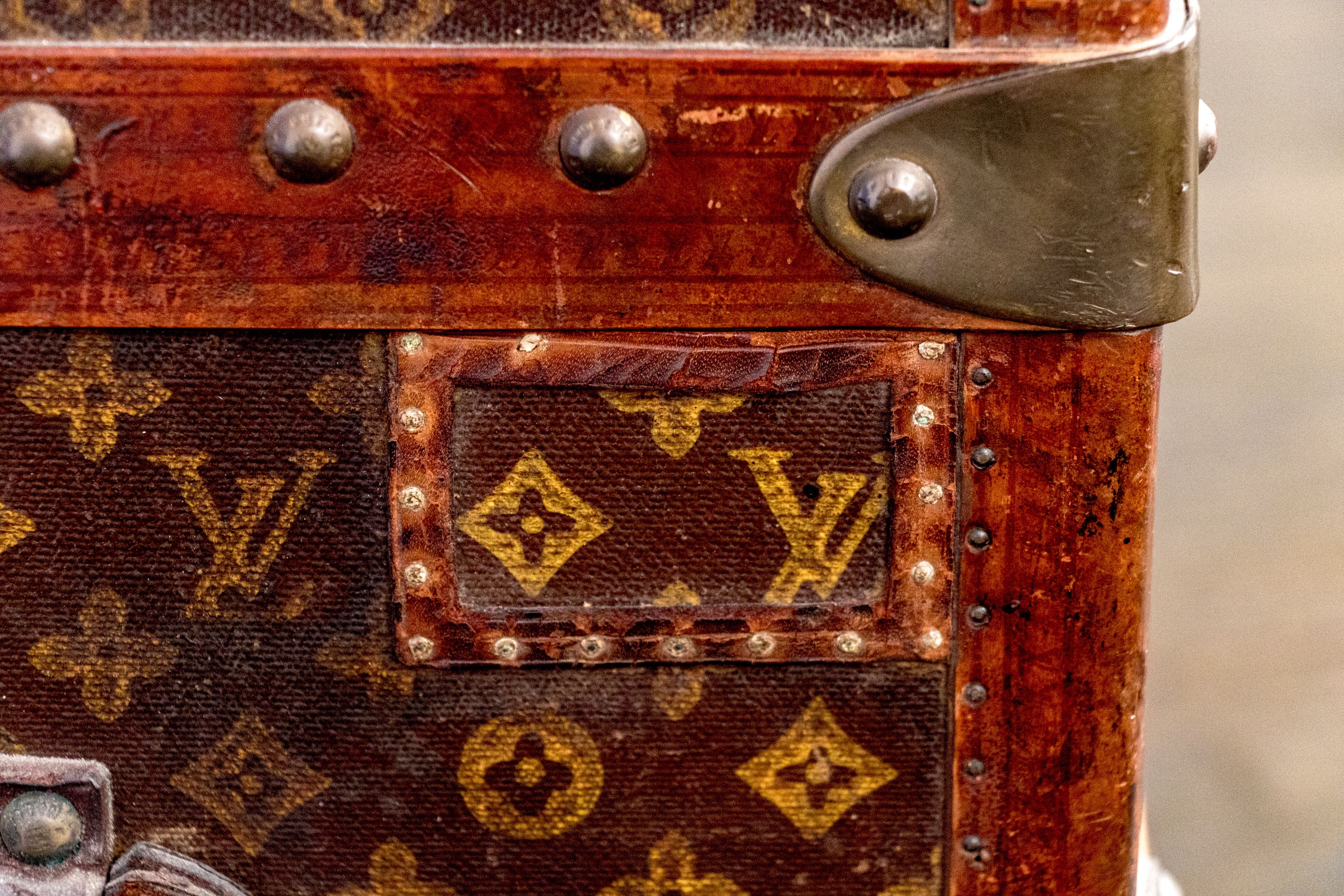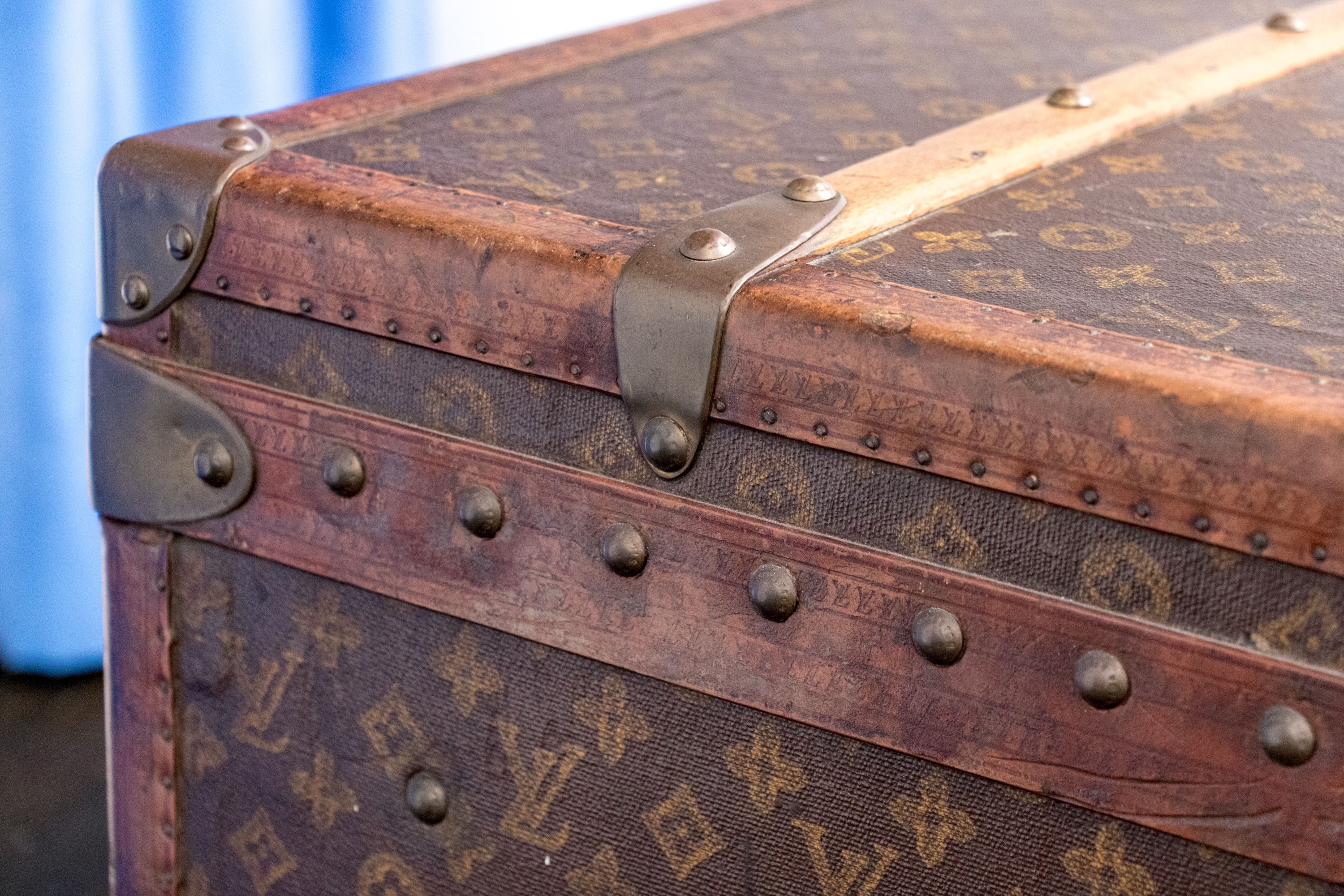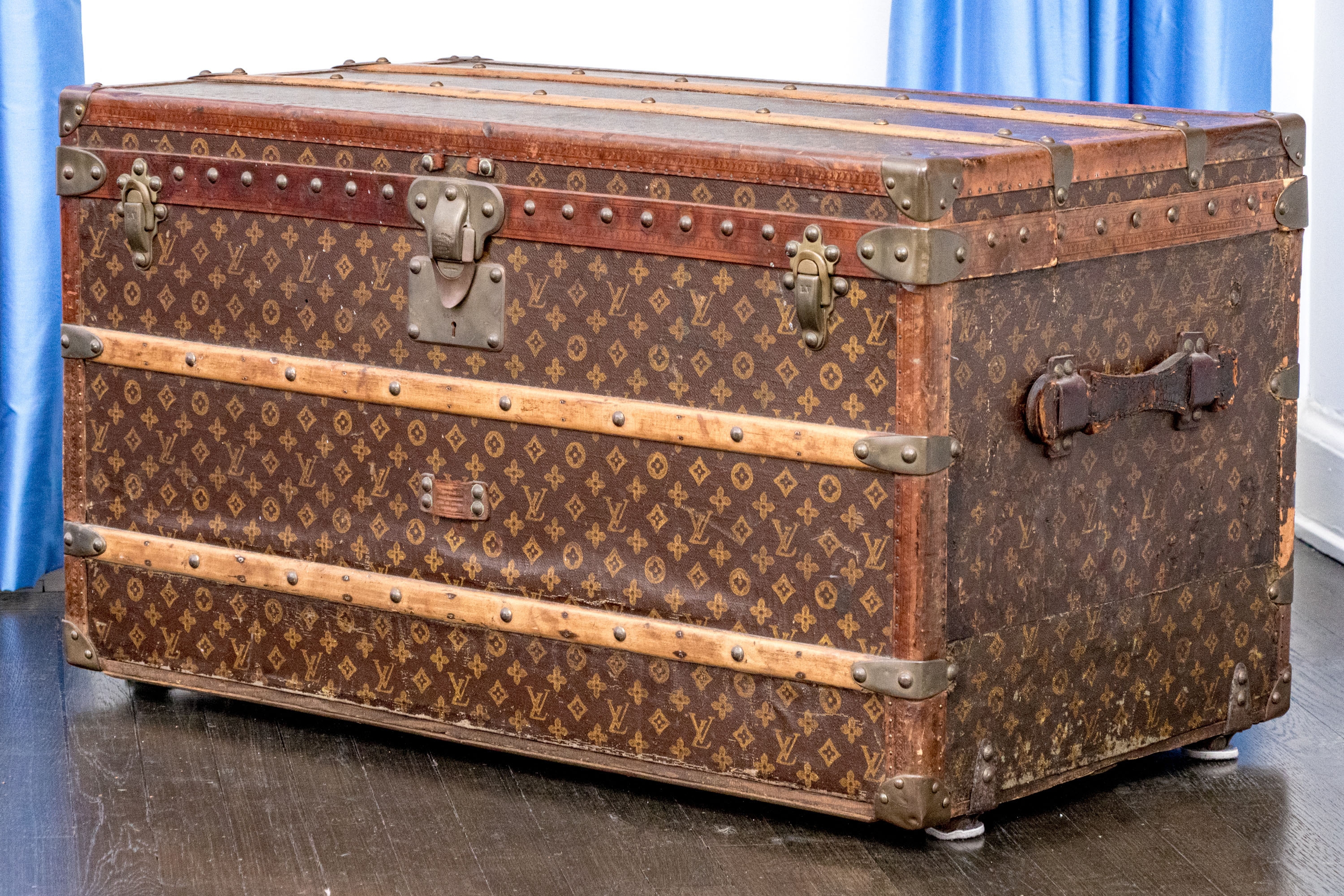 An antique Louis Vuitton steamer trunk in rectangular form with wooden supports with brass tack nailhead trim with brass mounts and leather handles, on either side. Hinged top with brass central close clasp and two adjacent flanking clasps.