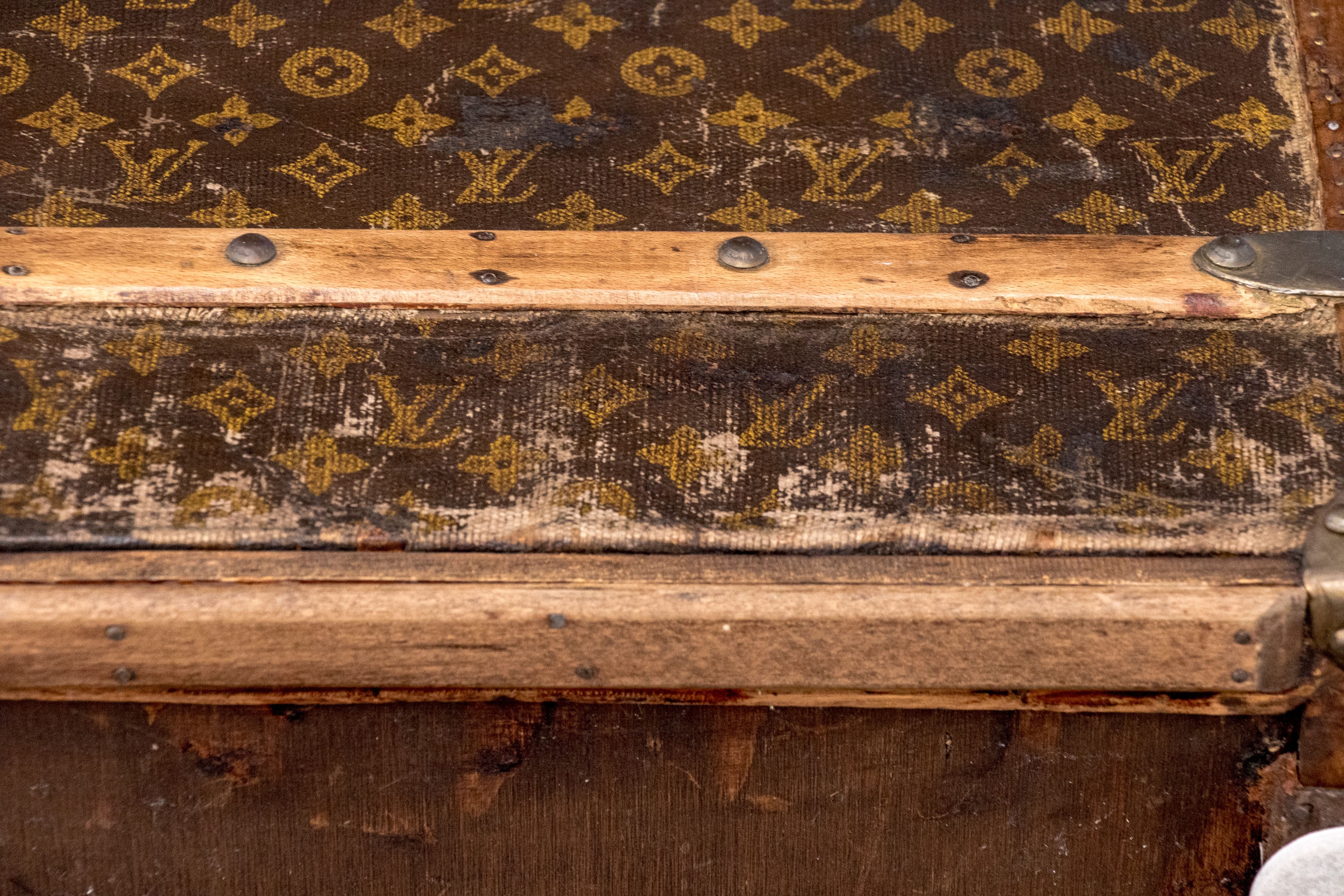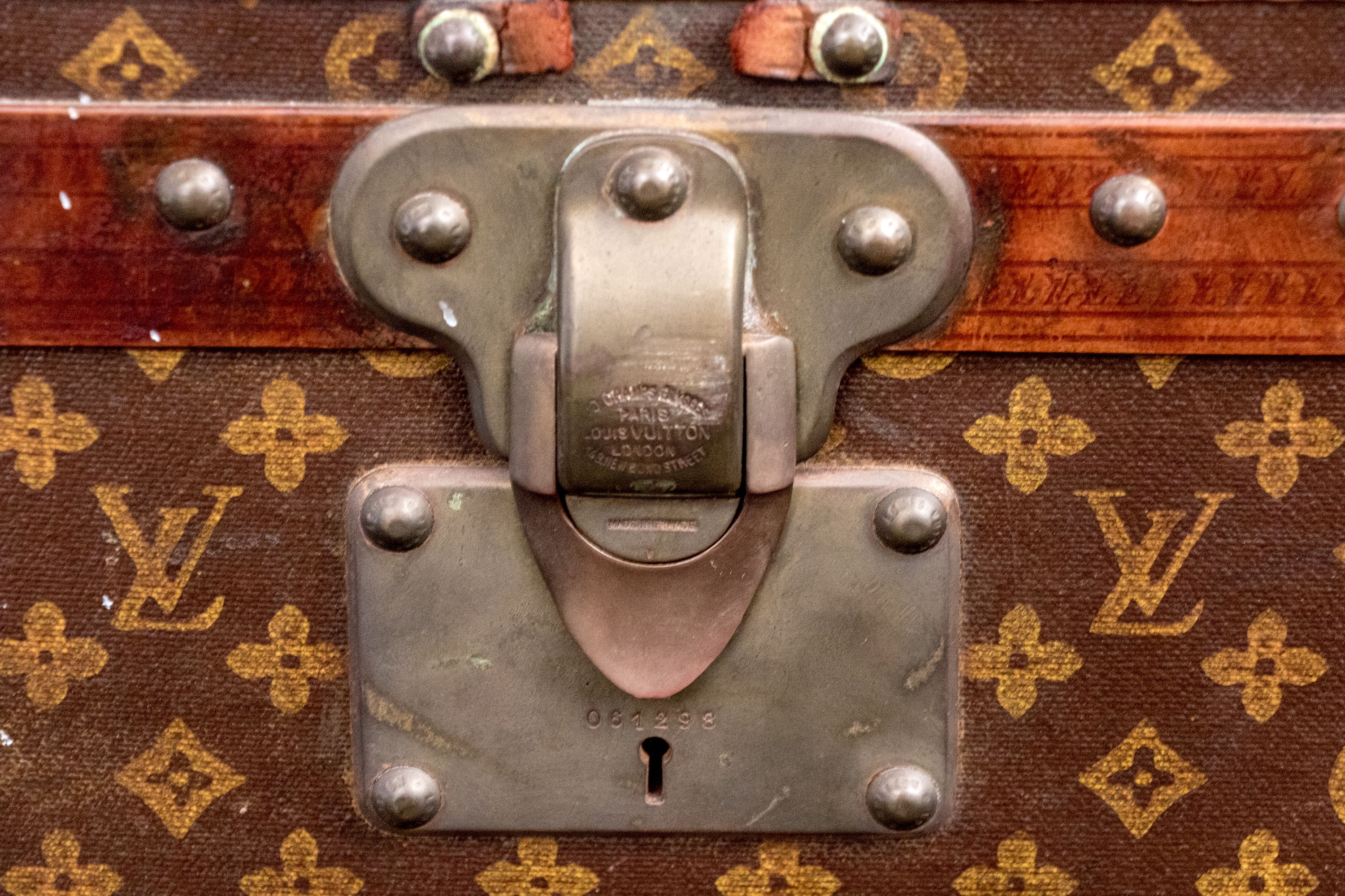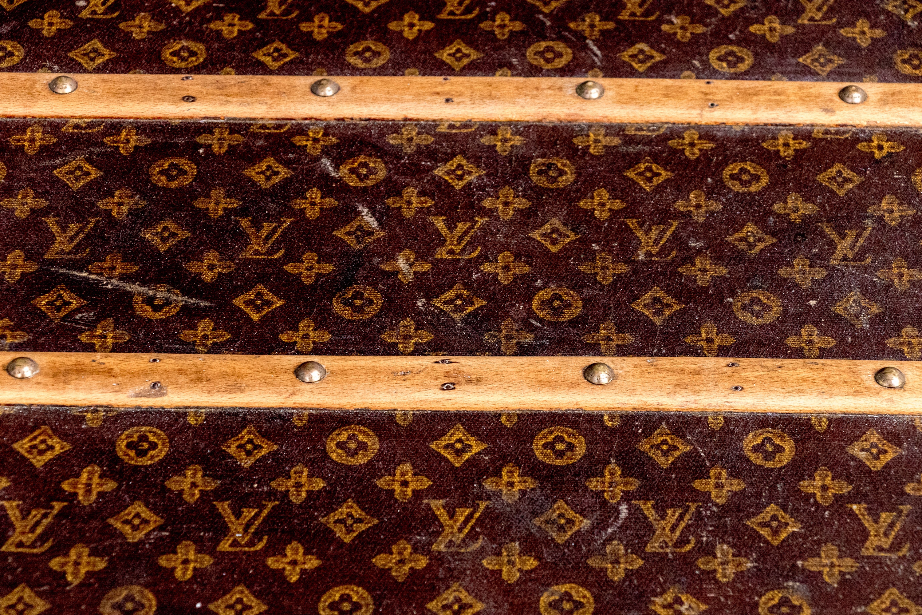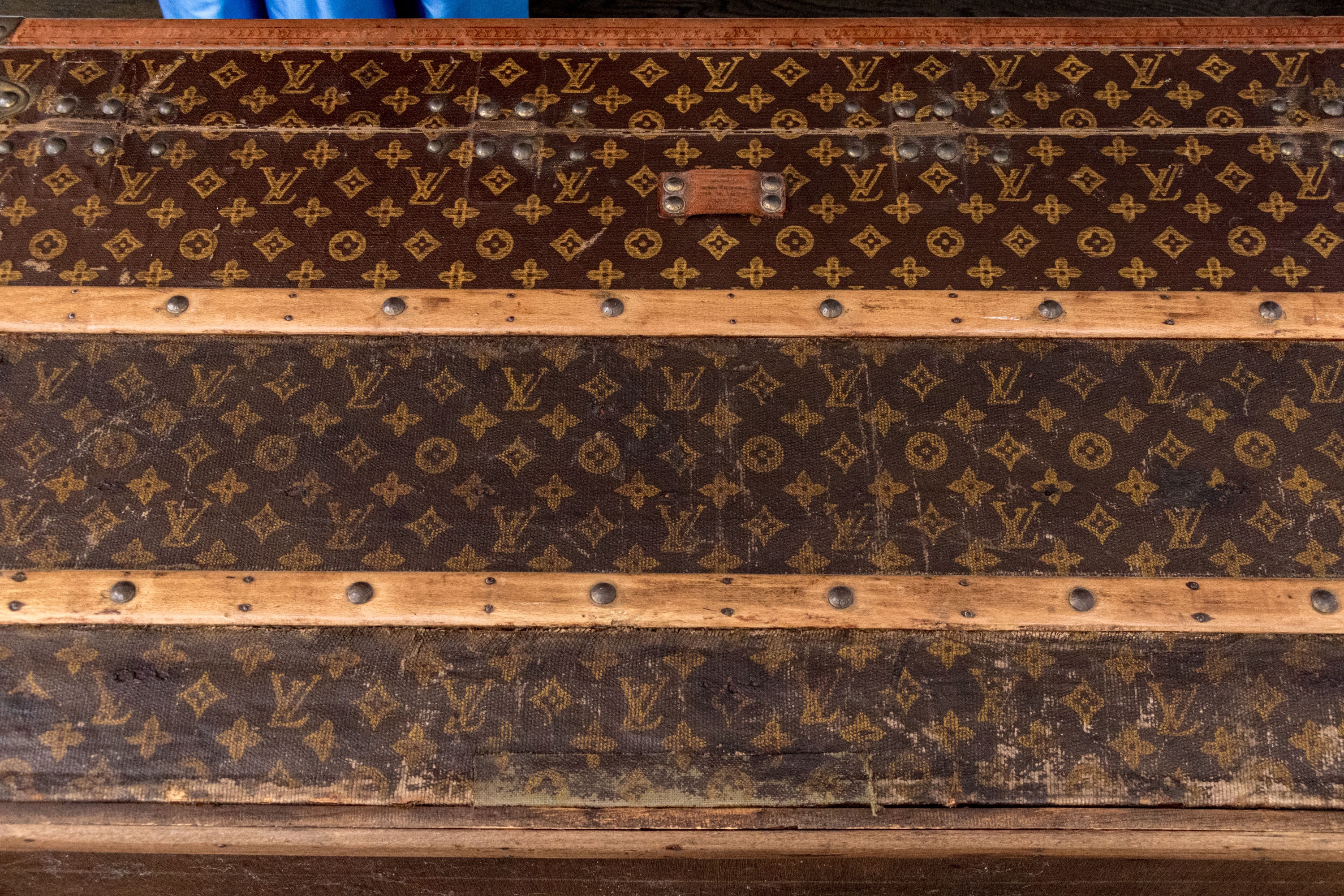 An antique Louis Vuitton steamer trunk in rectangular form with wooden supports with brass tack nailhead trim with brass mounts and leather handles, on either side. Hinged top with brass central close clasp and two adjacent flanking clasps.