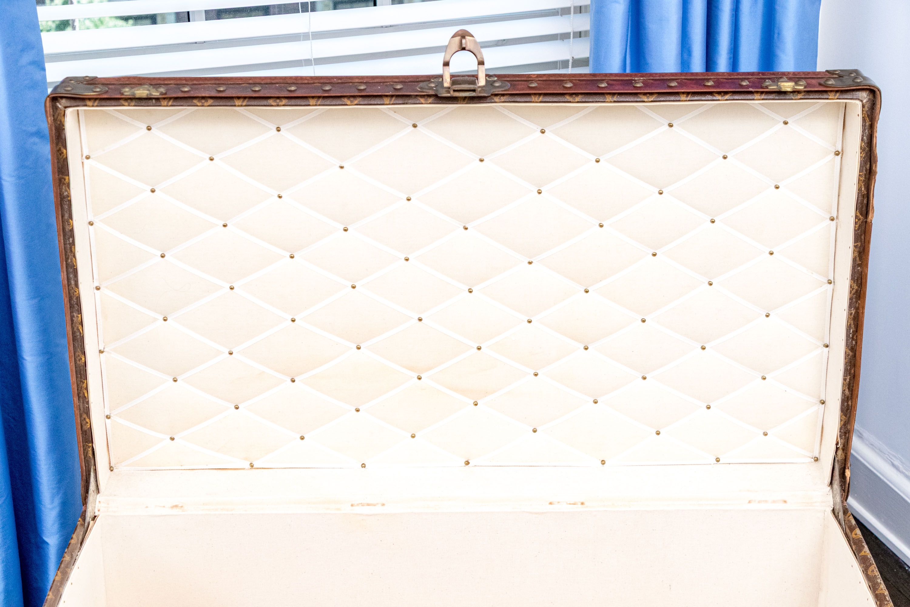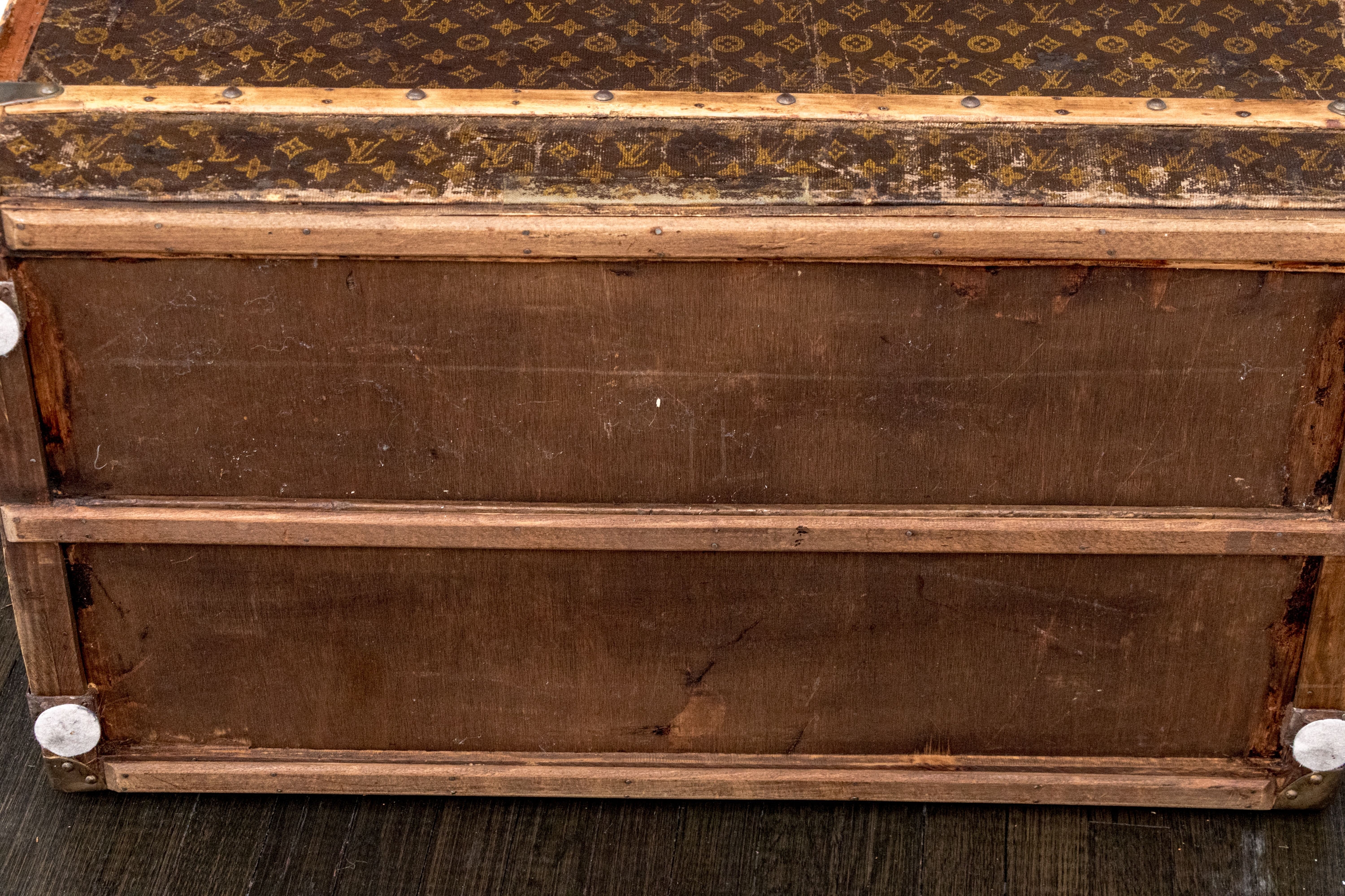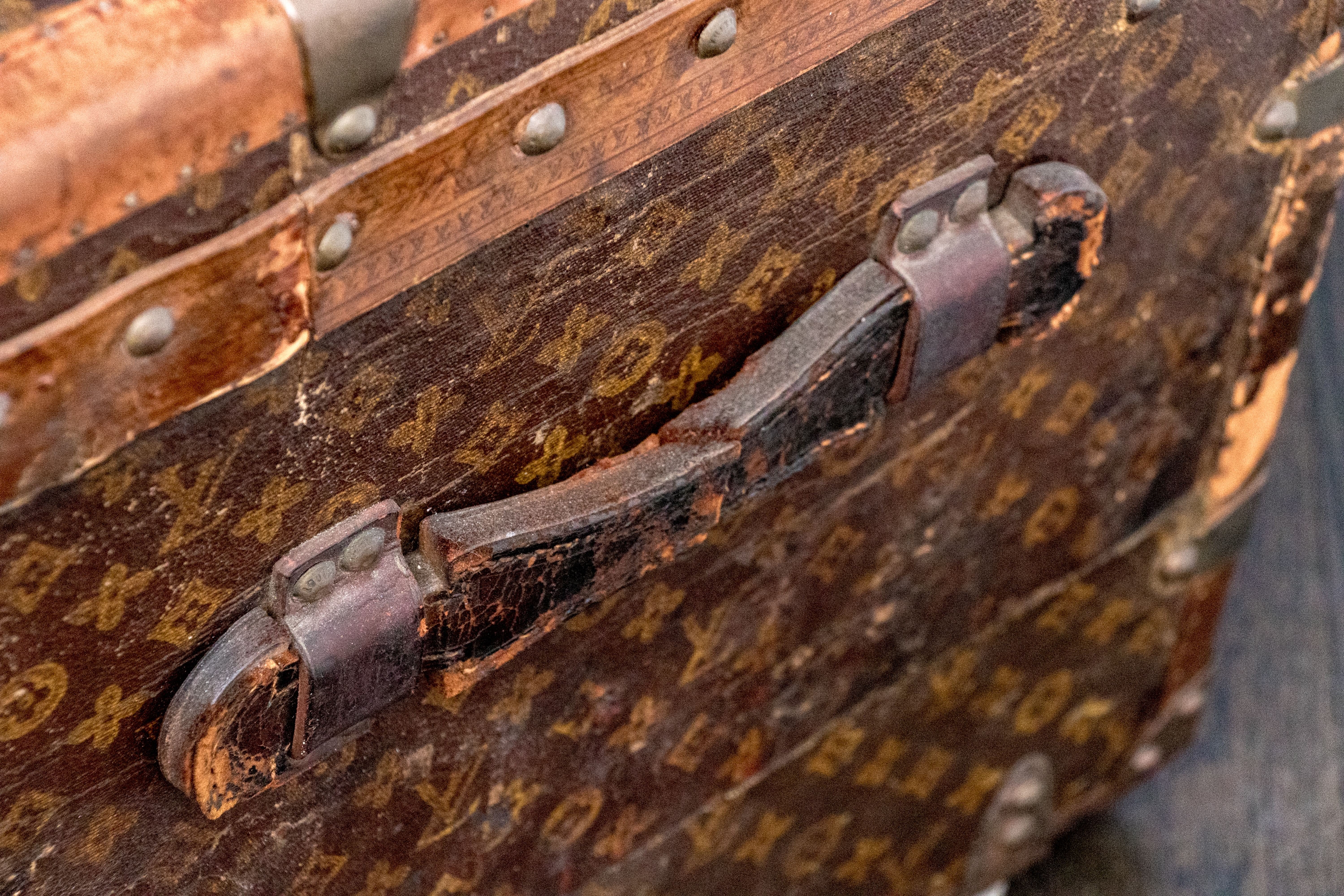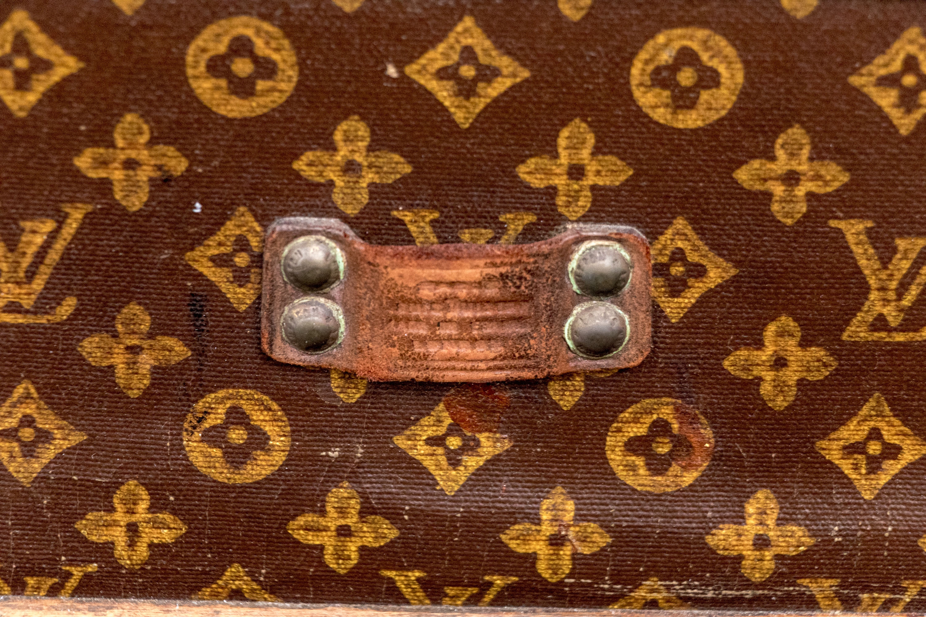 An antique Louis Vuitton steamer trunk in rectangular form with wooden supports with brass tack nailhead trim with brass mounts and leather handles, on either side. Hinged top with brass central close clasp and two adjacent flanking clasps.