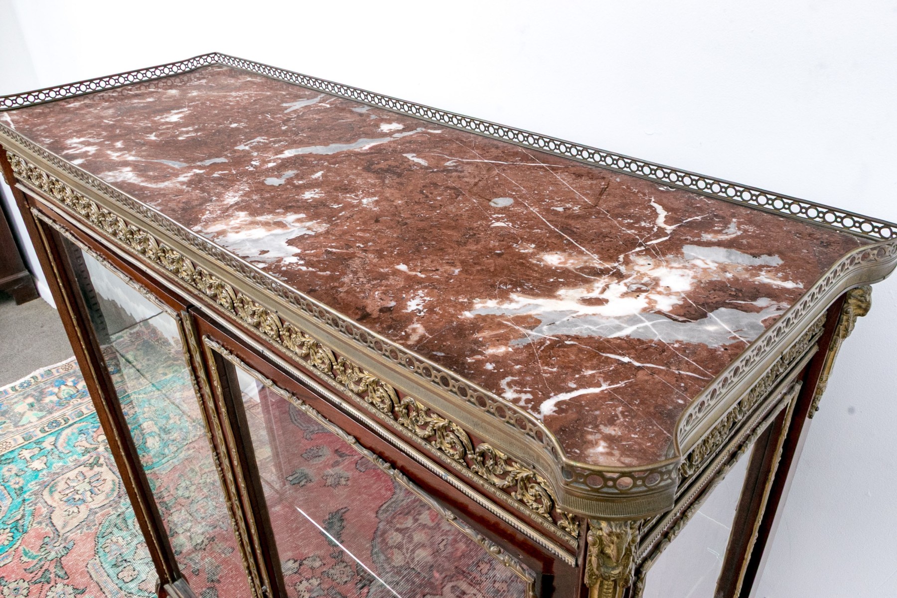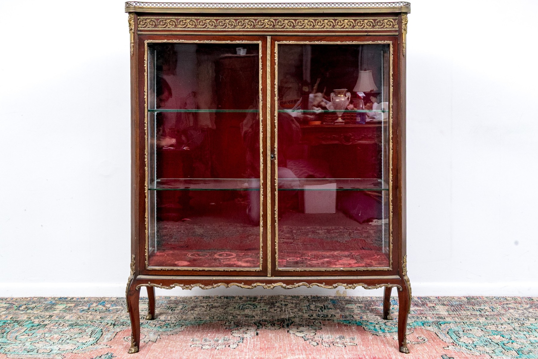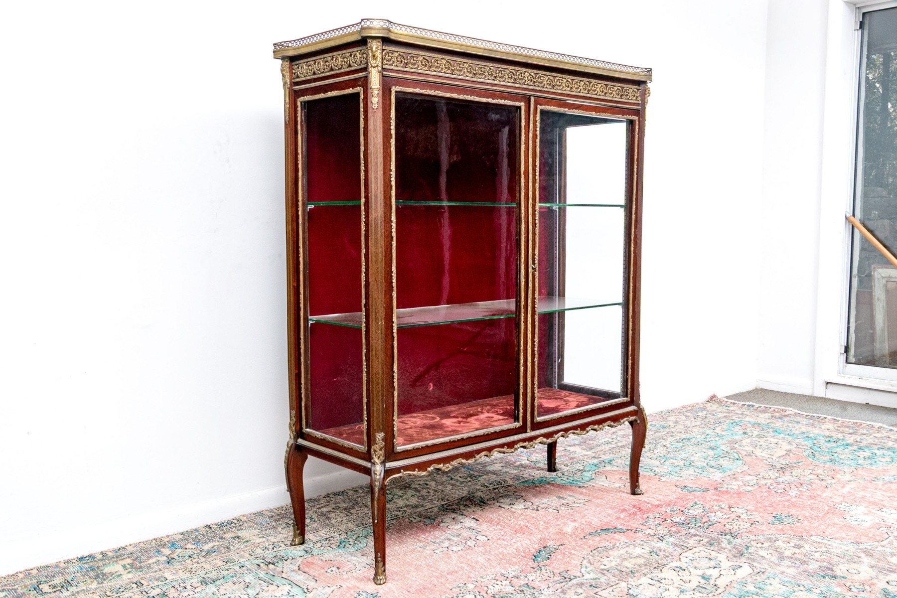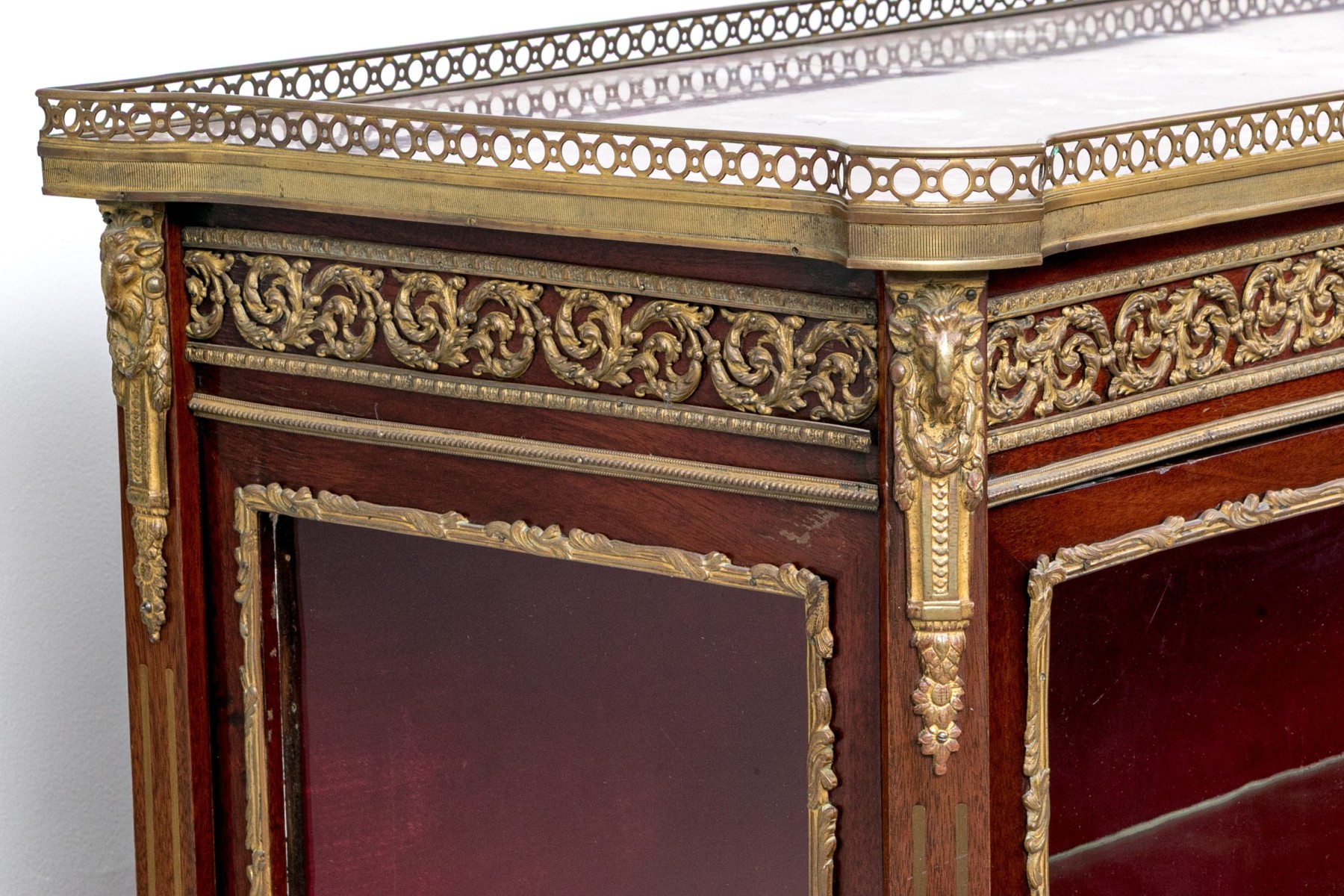 A beautiful antique Louis XV style vitrine cabinet designed with a dore bronze gallery around a mottled red marble top over a border of elegantly scrolled foliate relief. Glass paned double doors and glass sides allow all-around views of two spacious glass shelves within, finished with a red velvet backing and base that compliments the rich, warm-toned finish of the wood perfectly. Decorated with dore relief throughout a serpentine apron, cabriole legs, and capped toes.