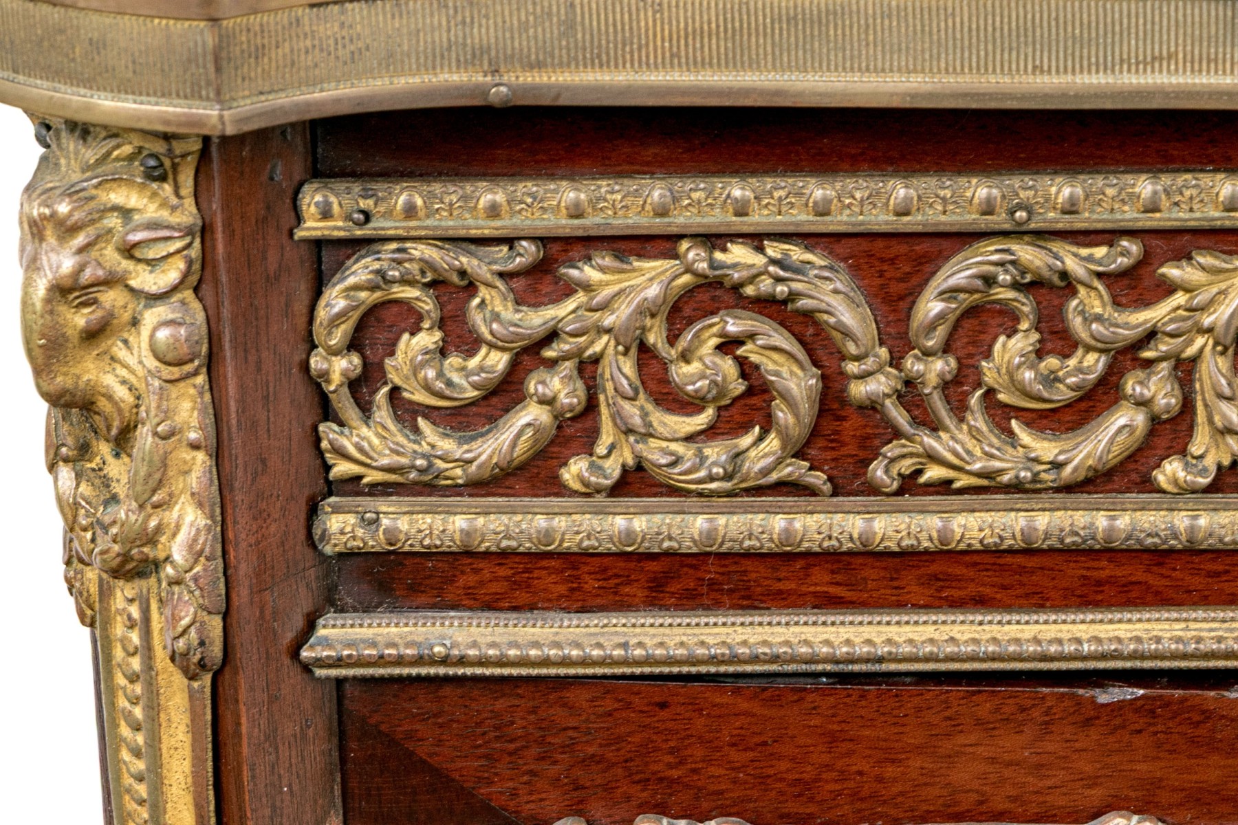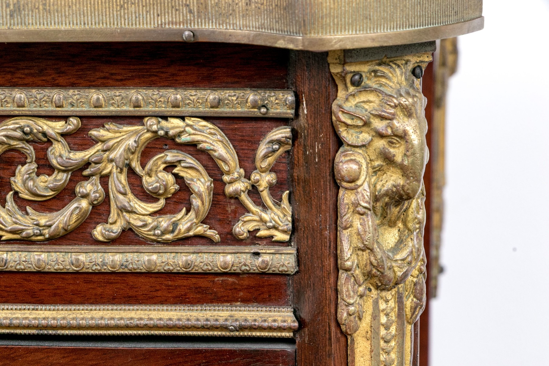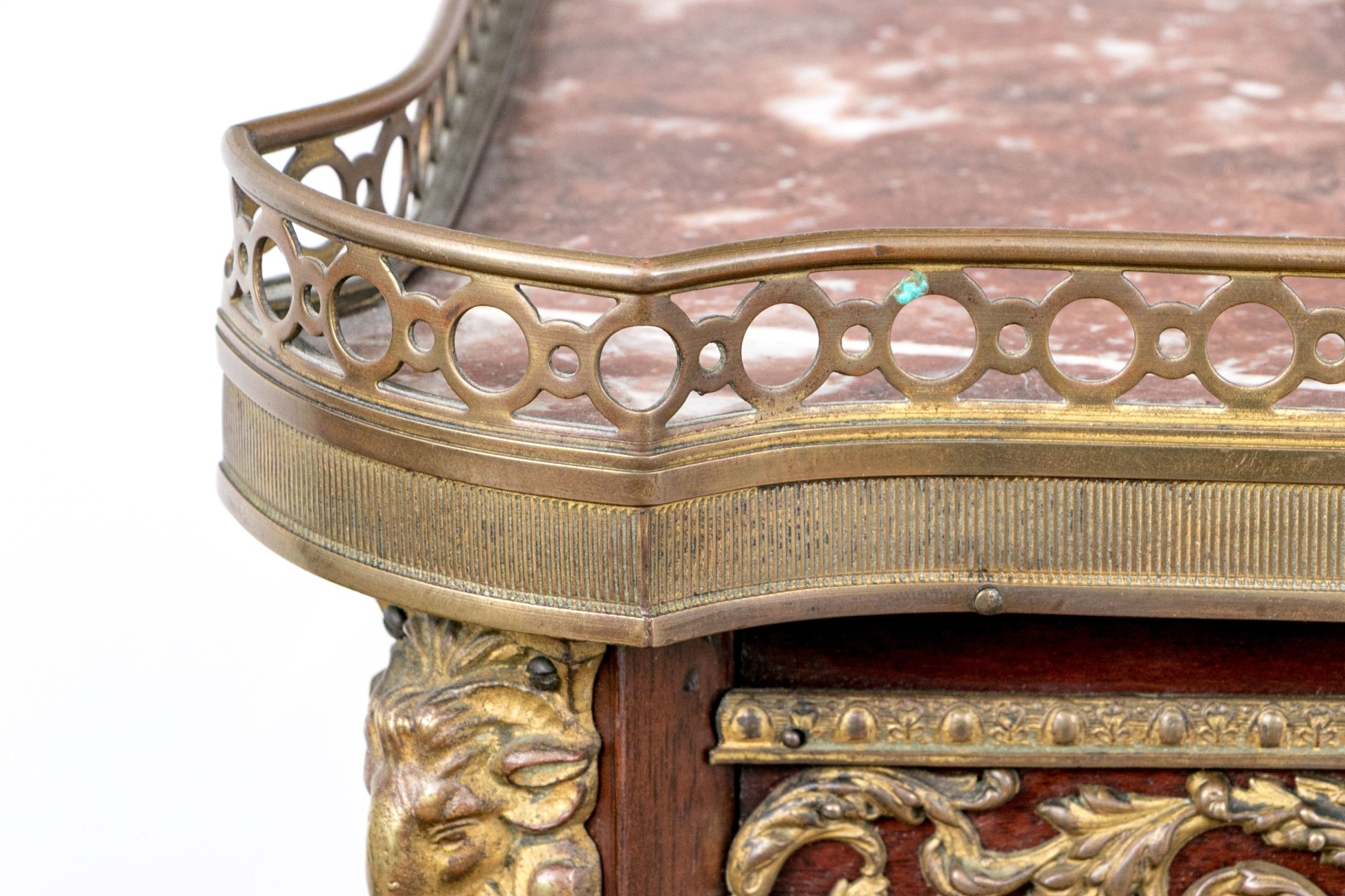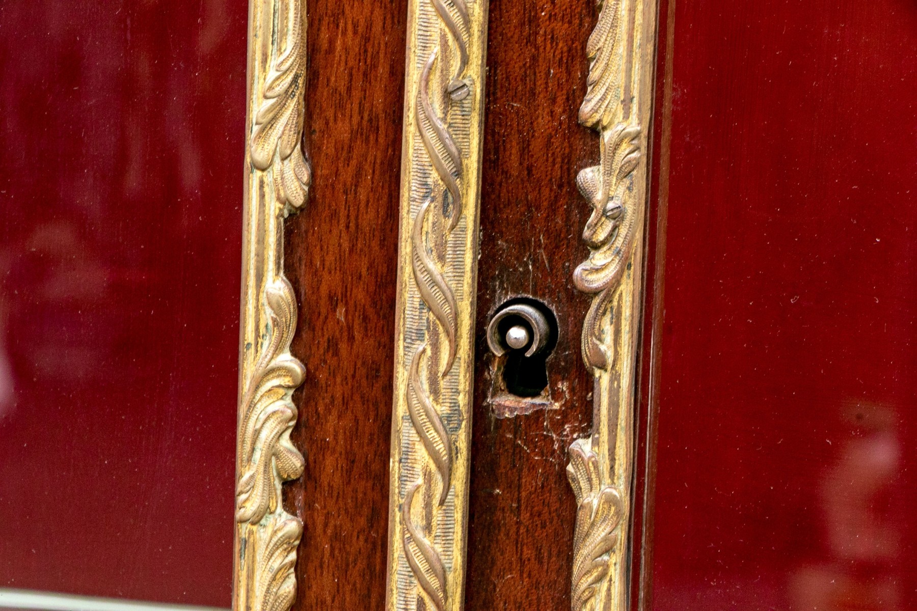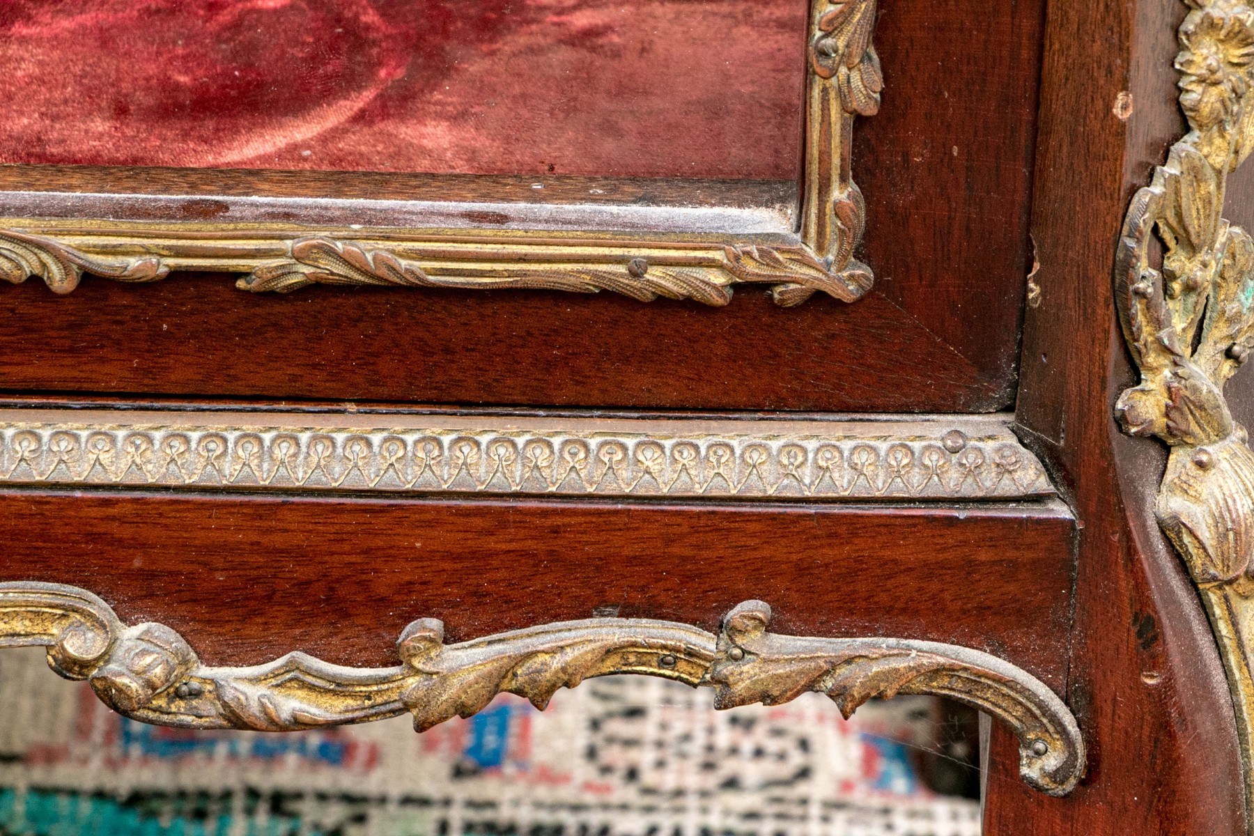 A beautiful antique Louis XV style vitrine cabinet designed with a dore bronze gallery around a mottled red marble top over a border of elegantly scrolled foliate relief. Glass paned double doors and glass sides allow all-around views of two spacious glass shelves within, finished with a red velvet backing and base that compliments the rich, warm-toned finish of the wood perfectly. Decorated with dore relief throughout a serpentine apron, cabriole legs, and capped toes.
