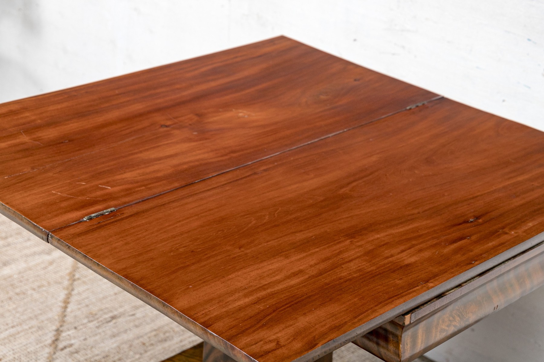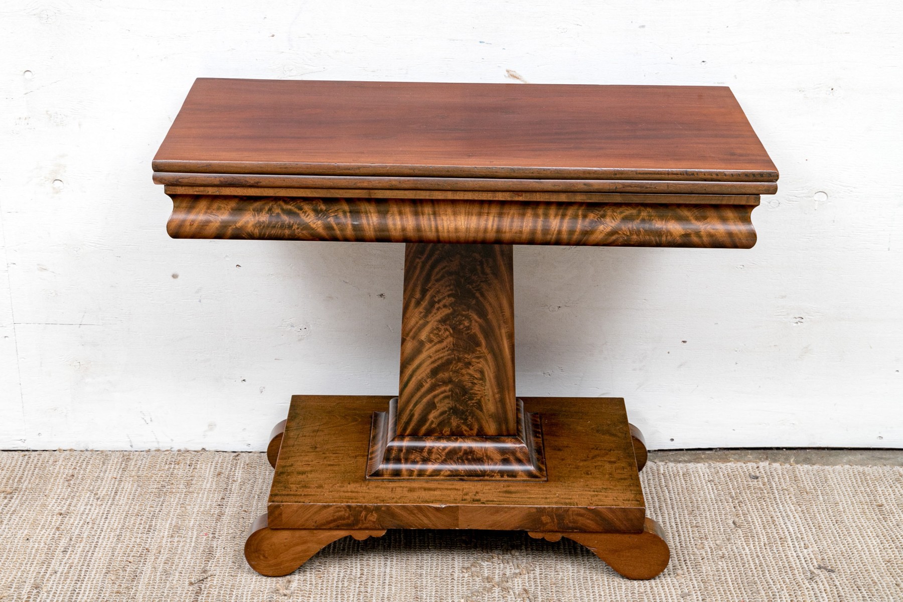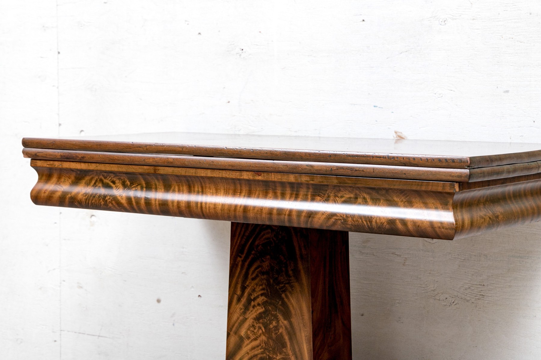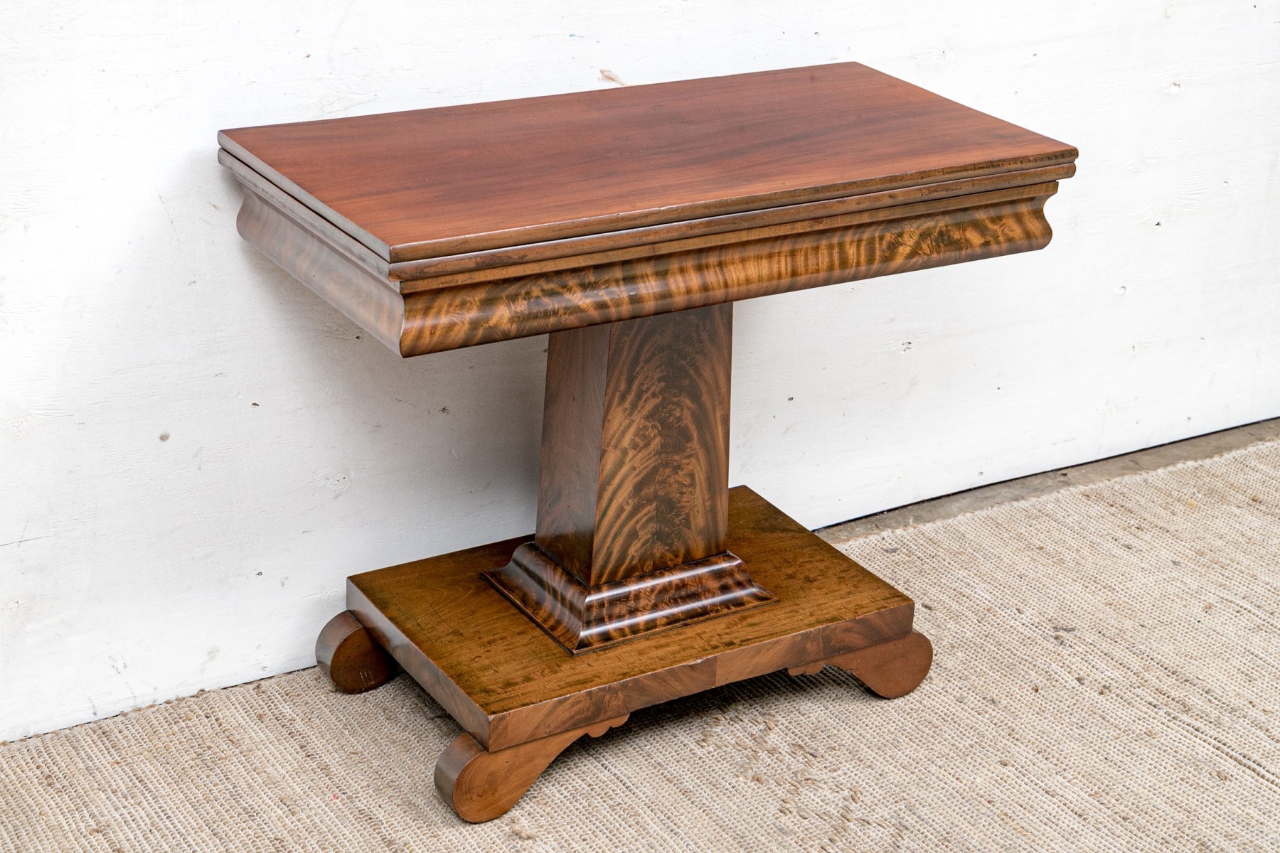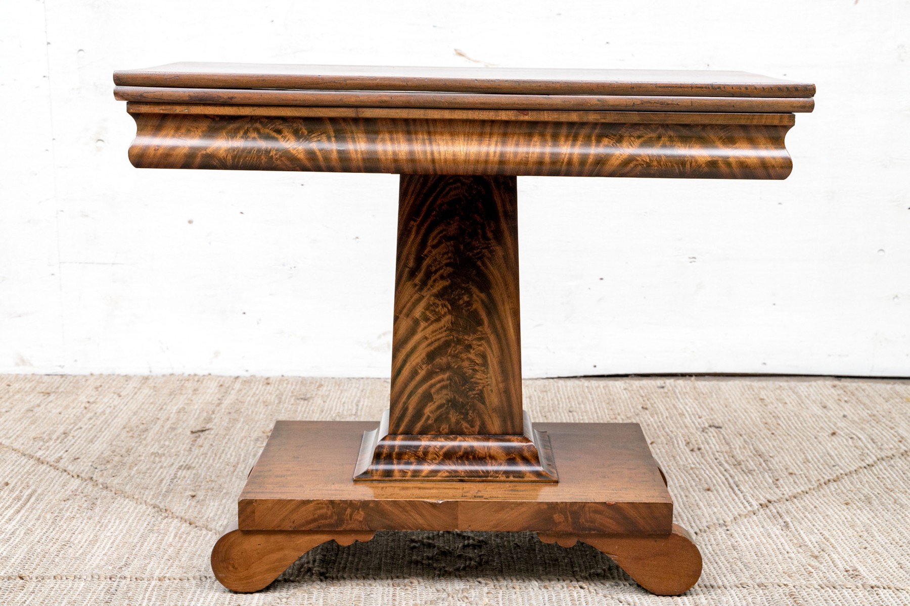 A fine games table in a classic form with a swivel mahogany top on the table. Raised on a figured wood frieze, support and base. With heavy scrolled feet.