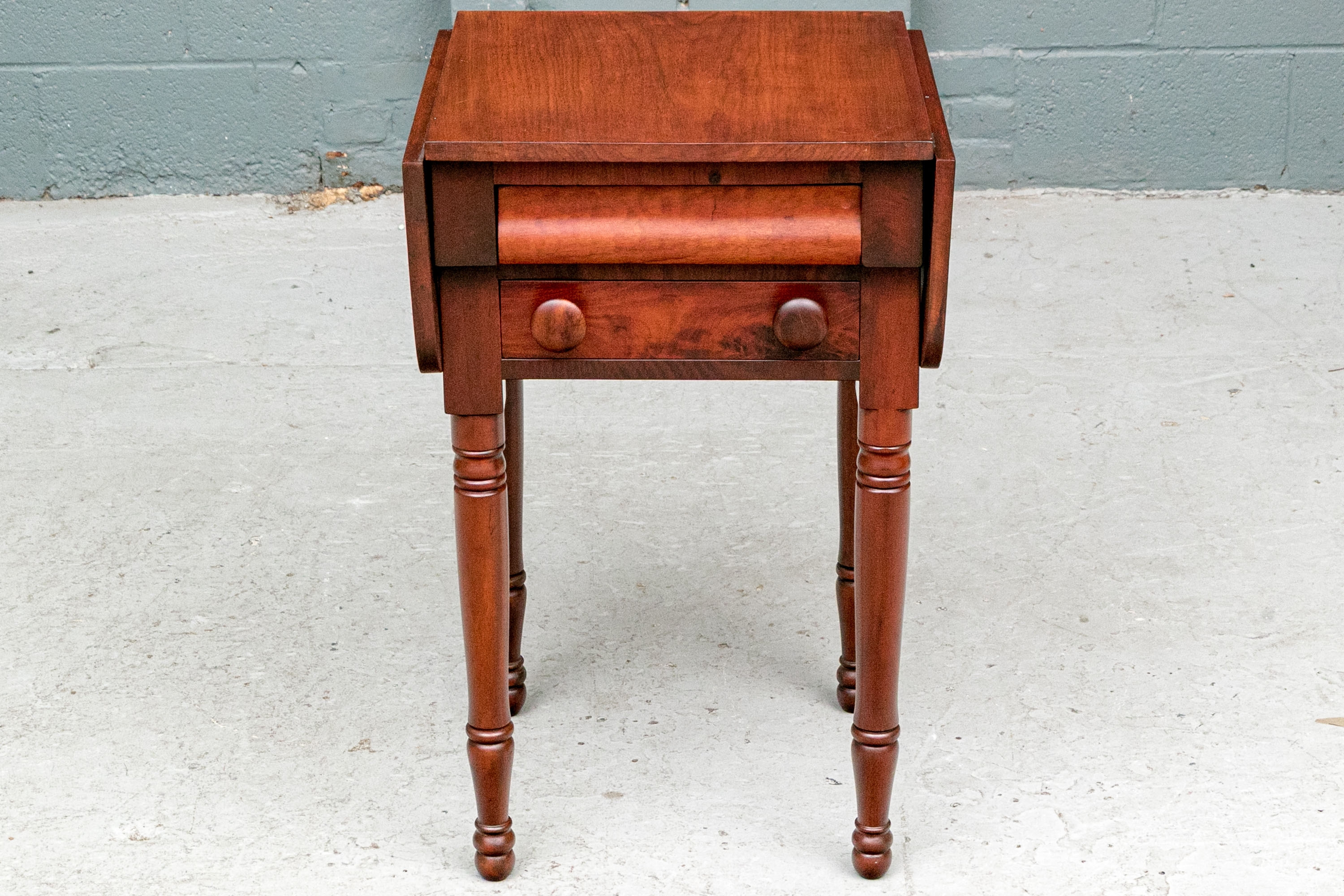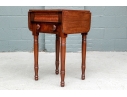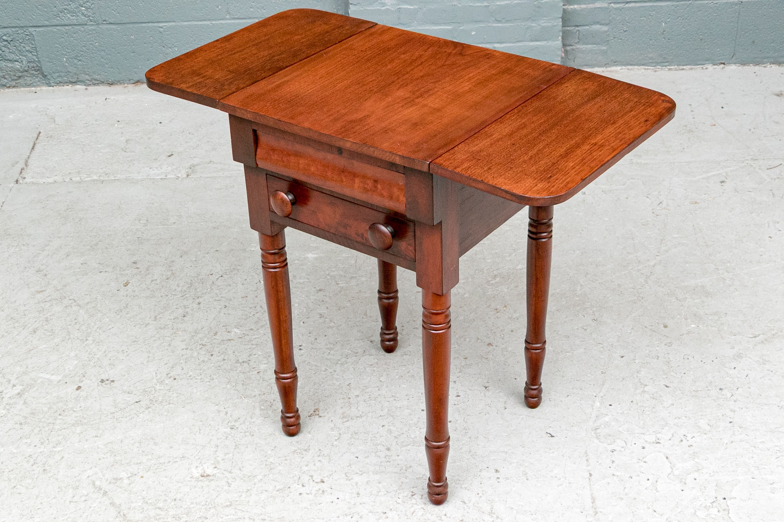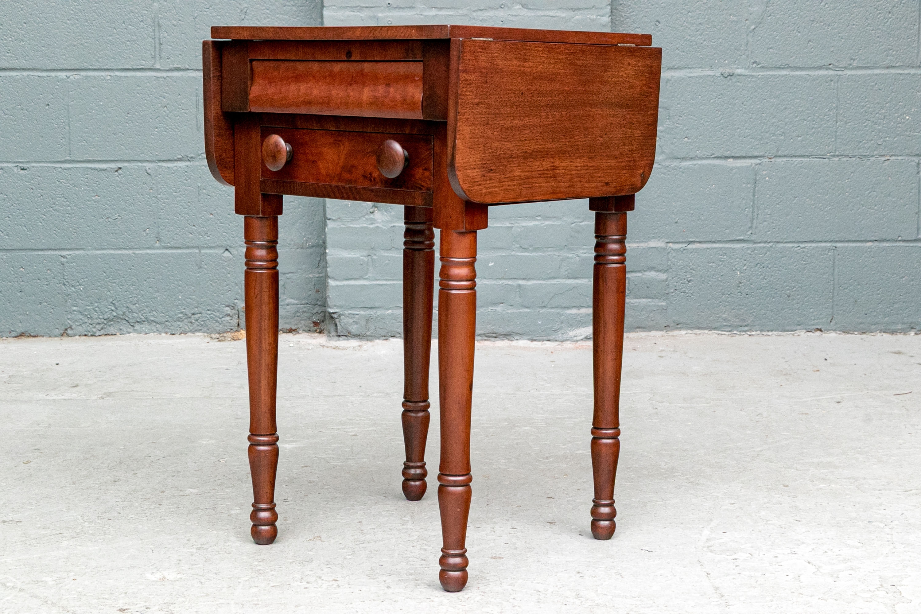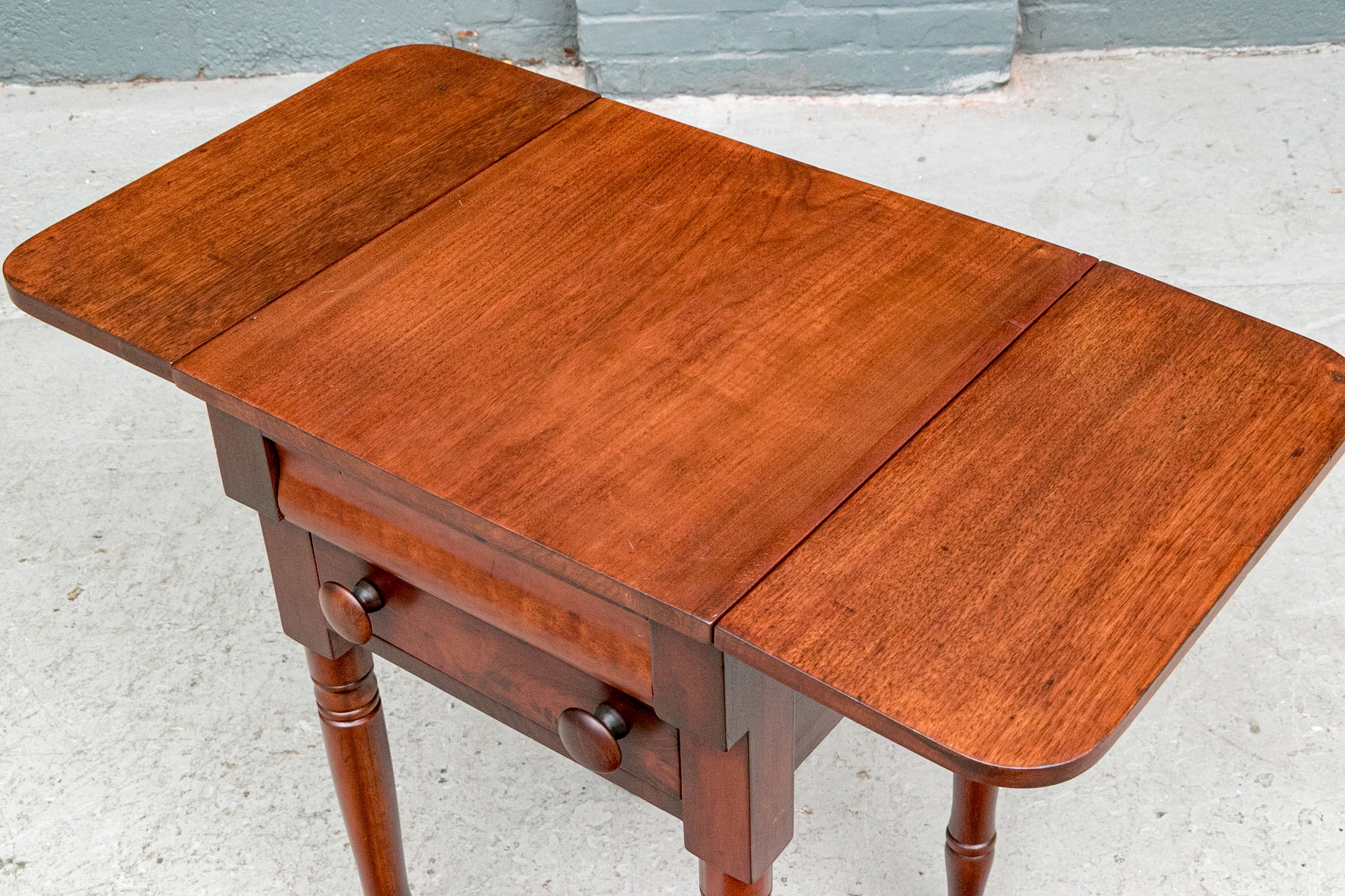 A finely constructed antique mahogany stand with drop leaves. With a curved flush frieze drawer over a drawer with knob pulls. Raised on tall ring turned legs,