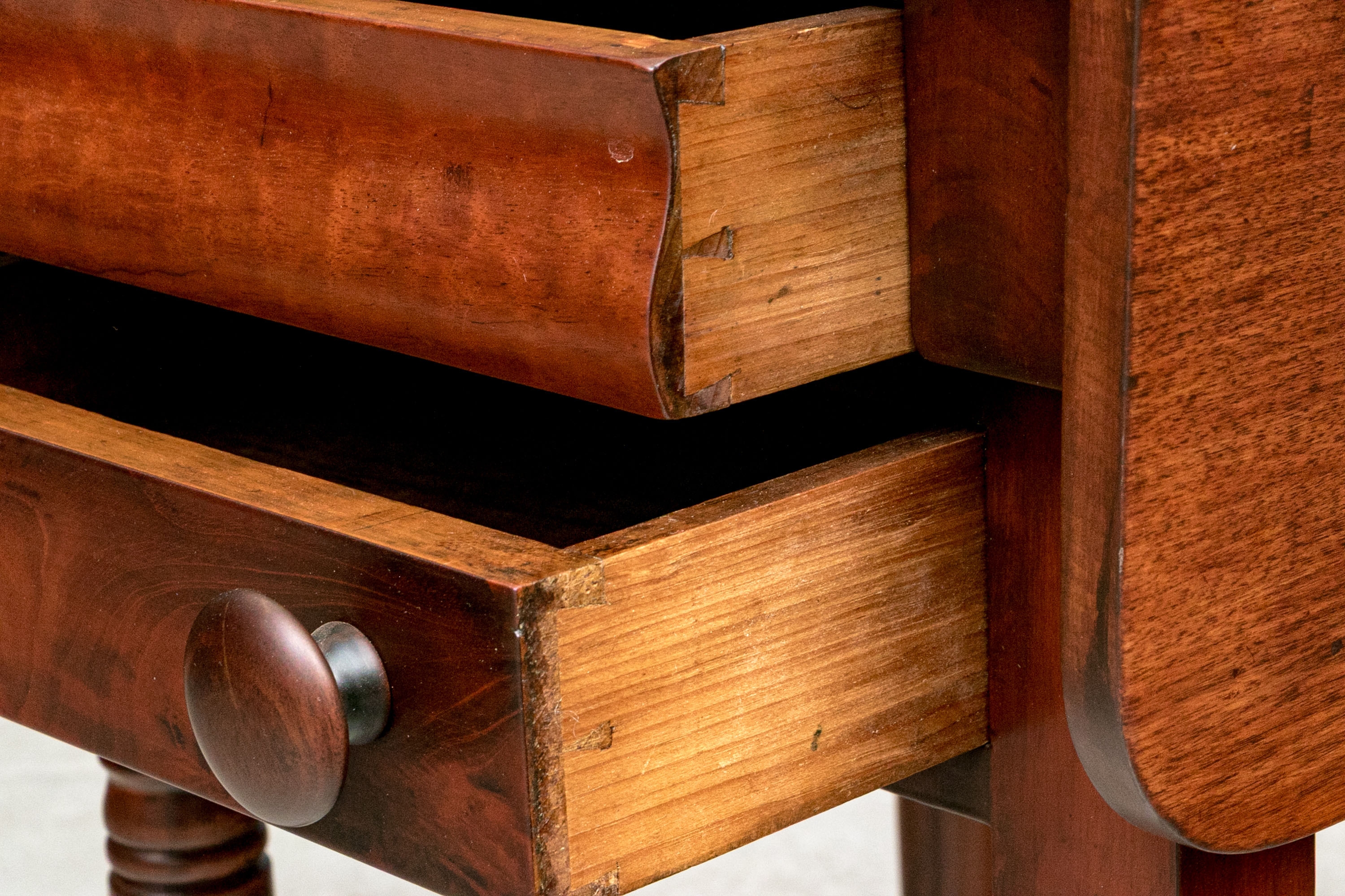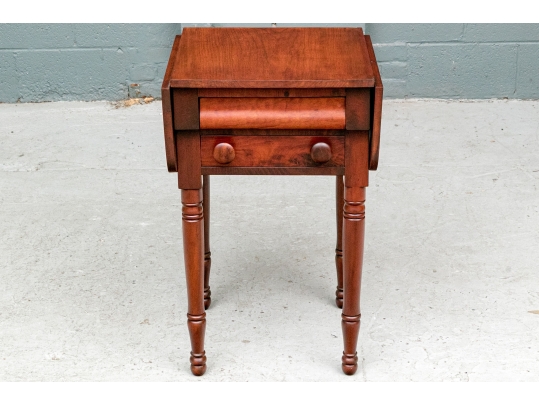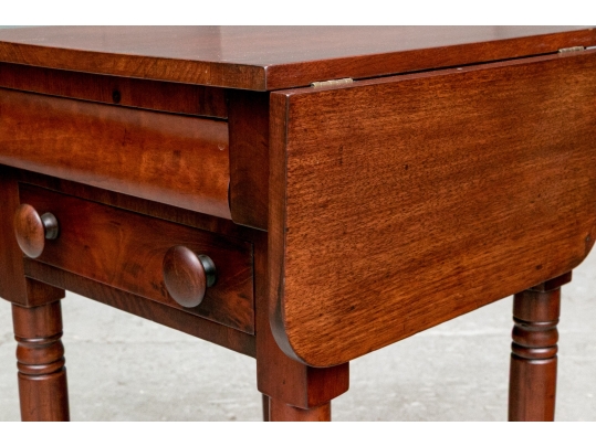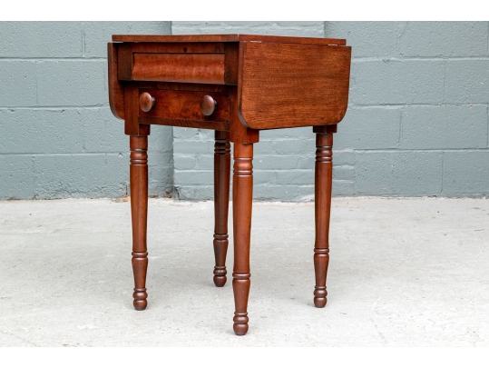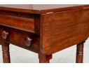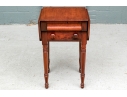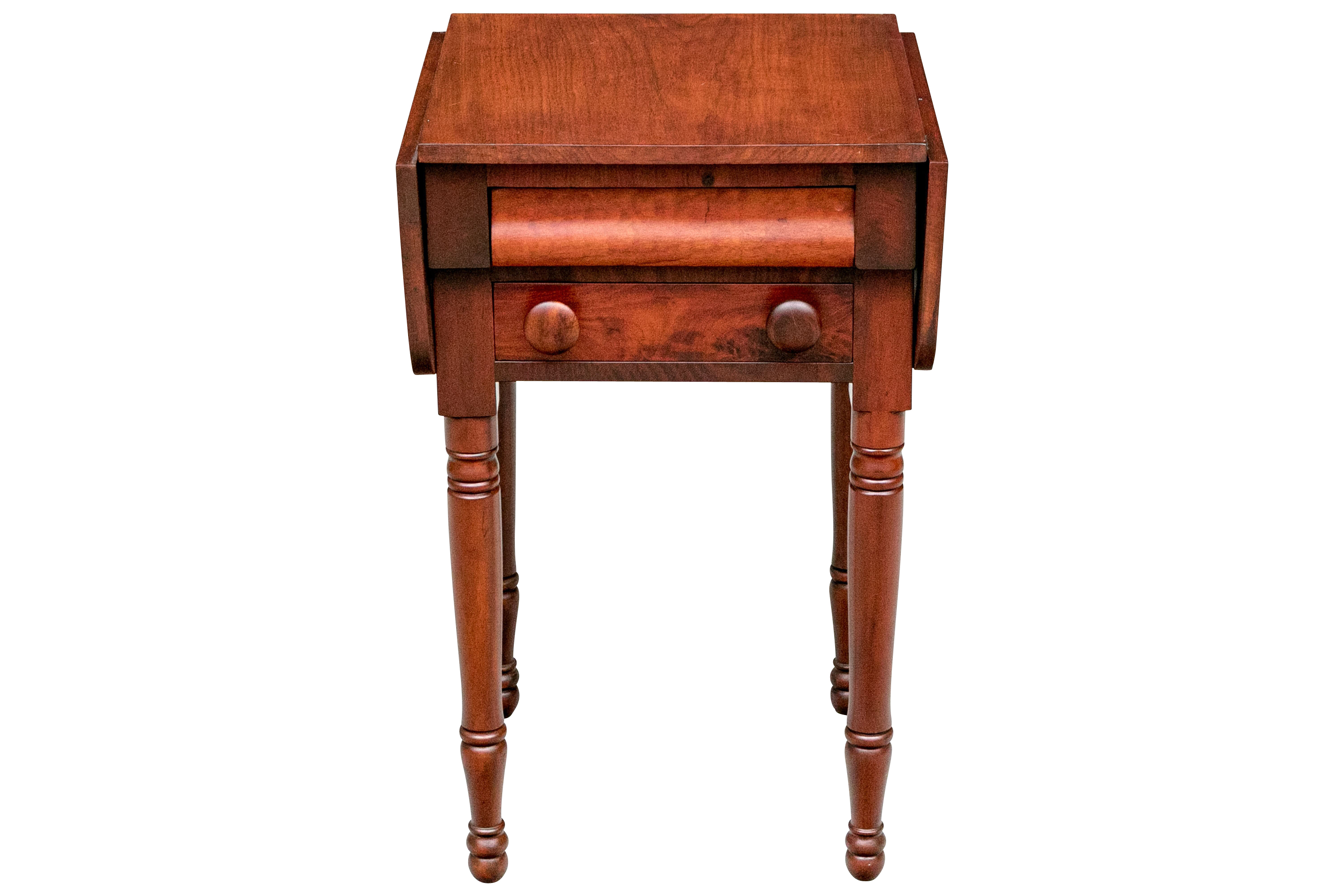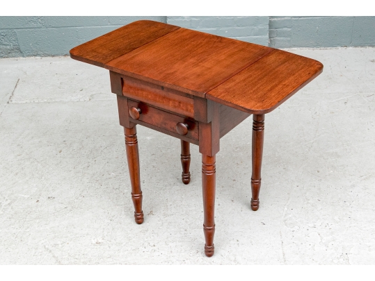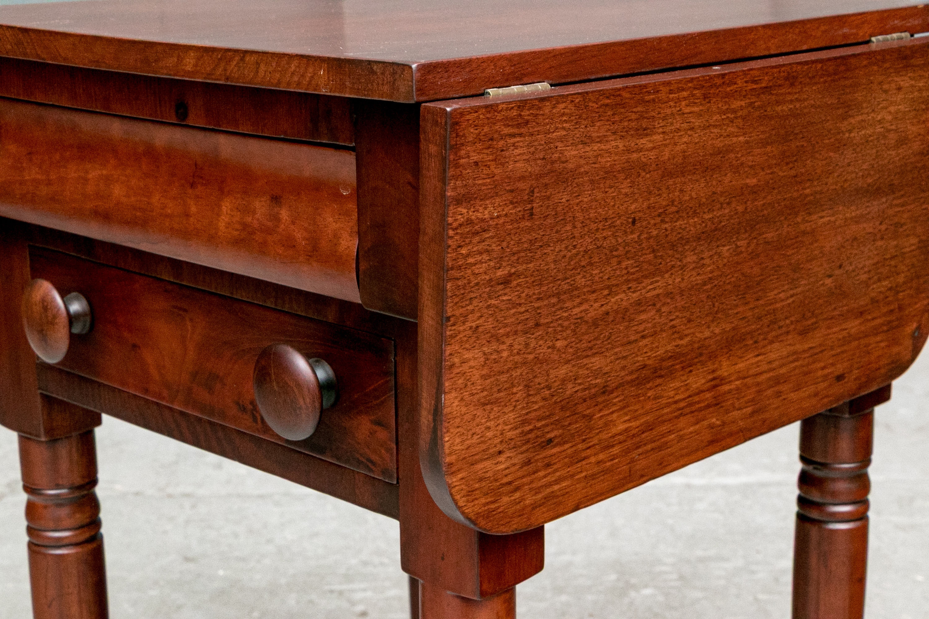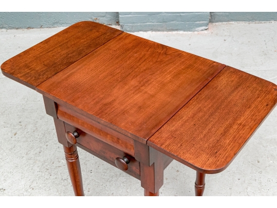 A finely constructed antique mahogany stand with drop leaves. With a curved flush frieze drawer over a drawer with knob pulls. Raised on tall ring turned legs,